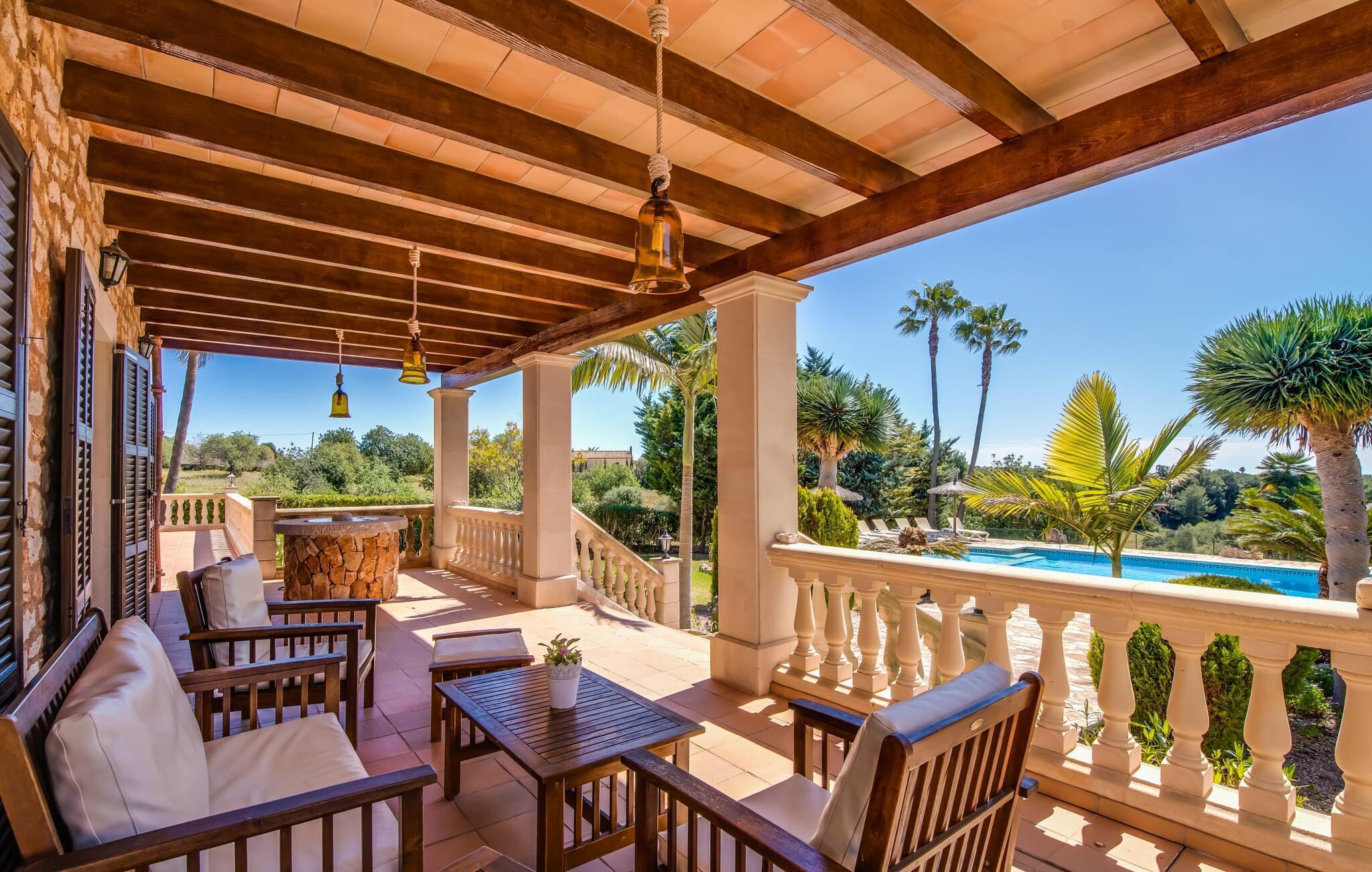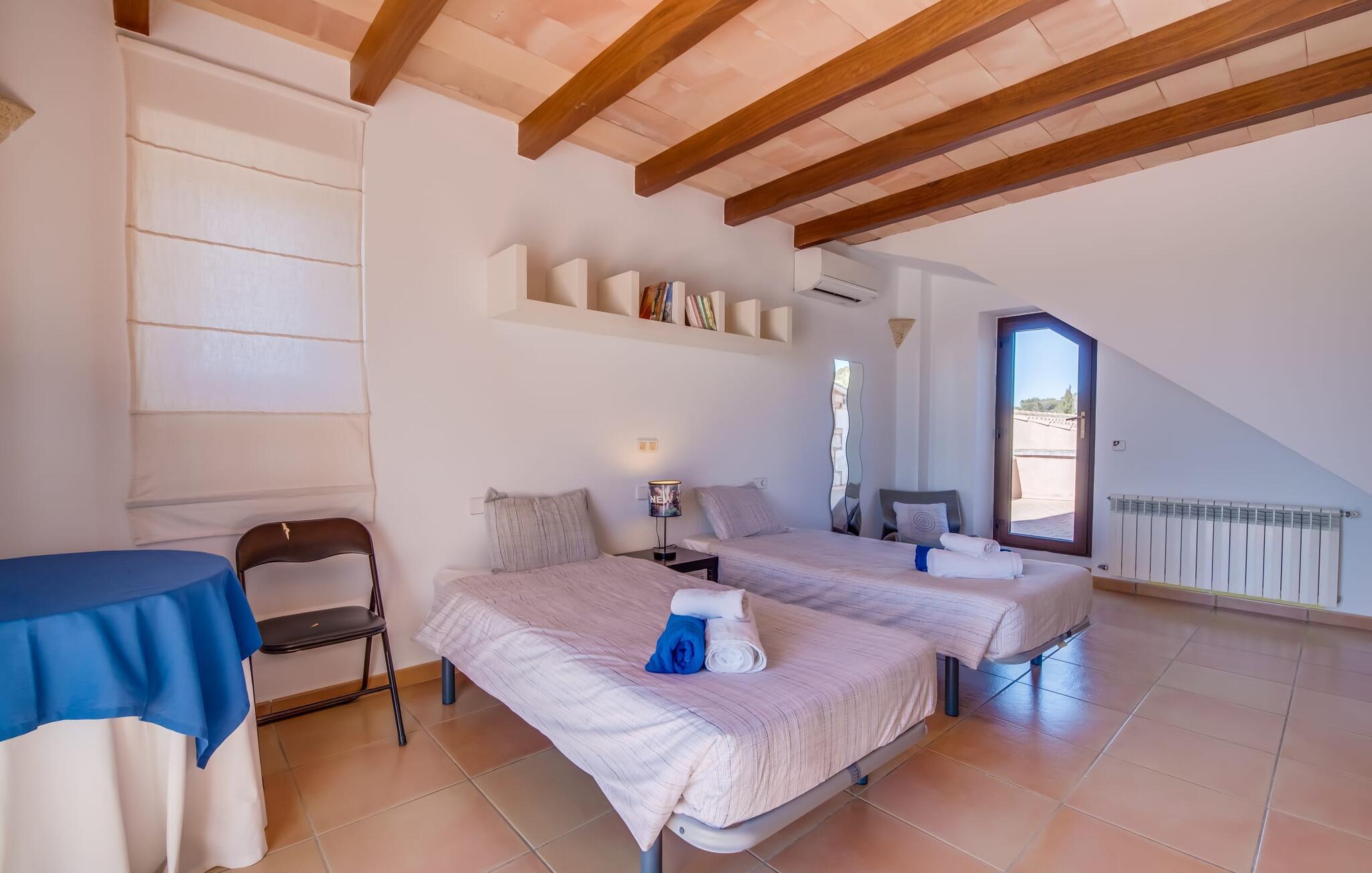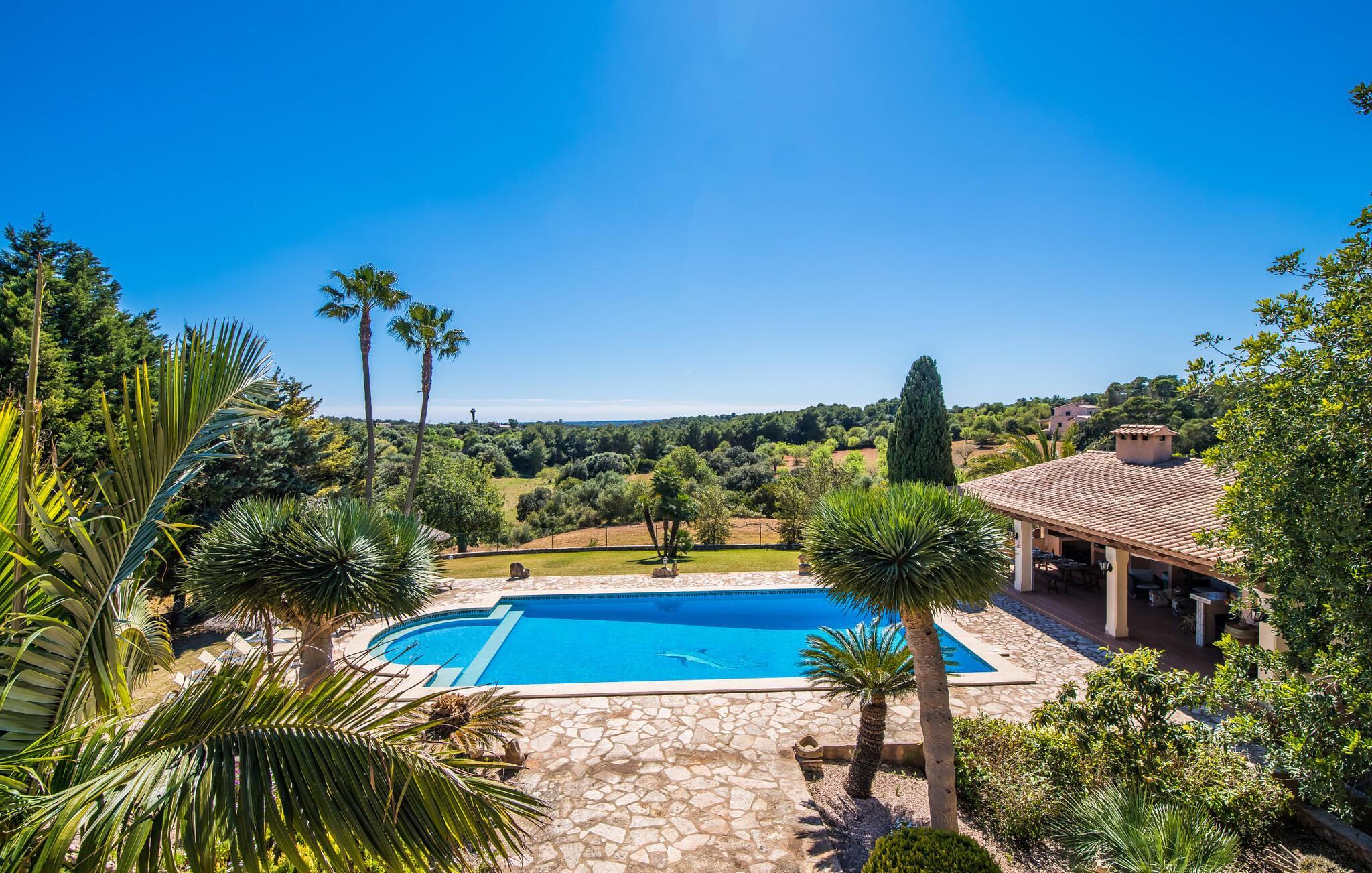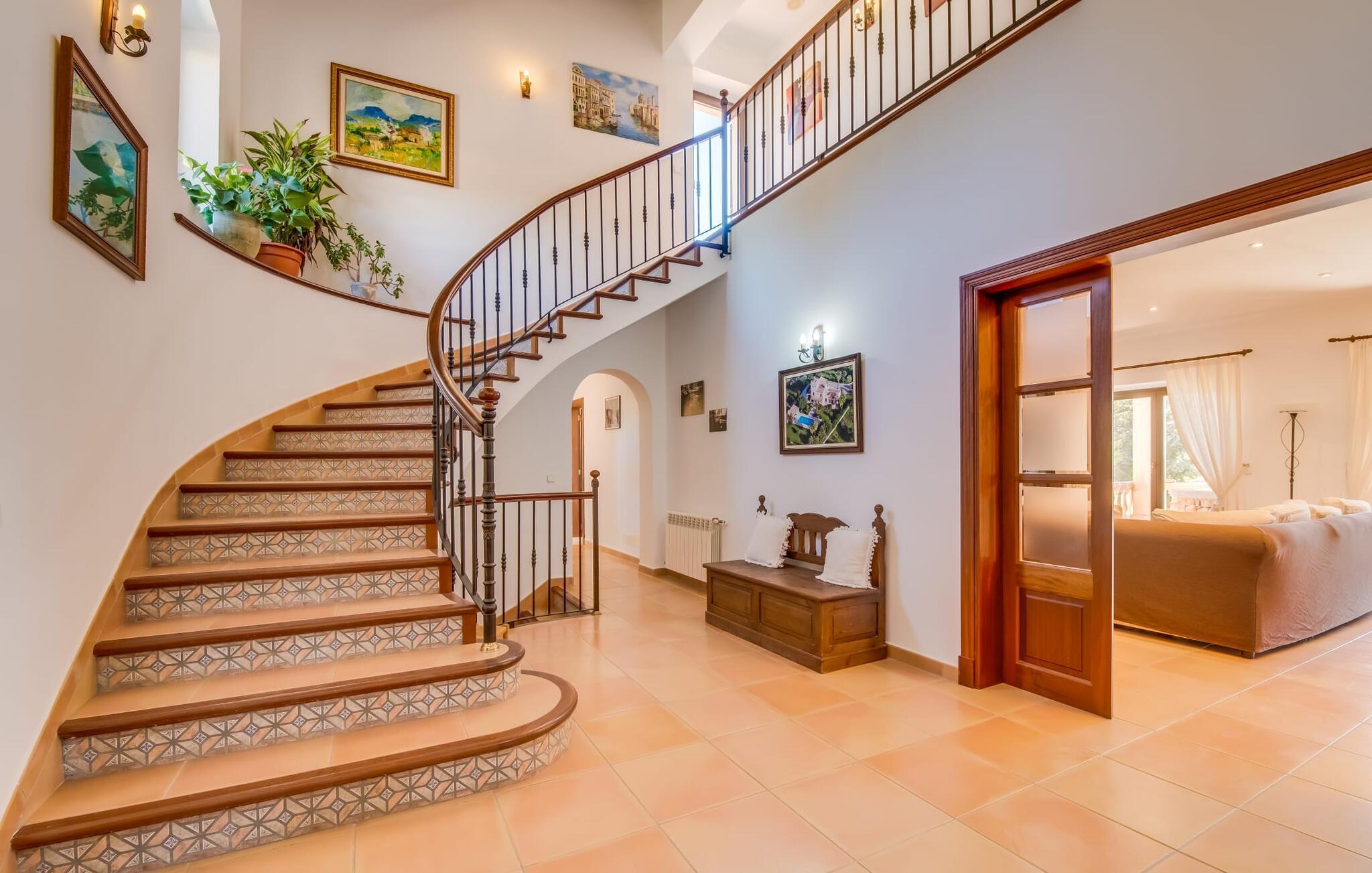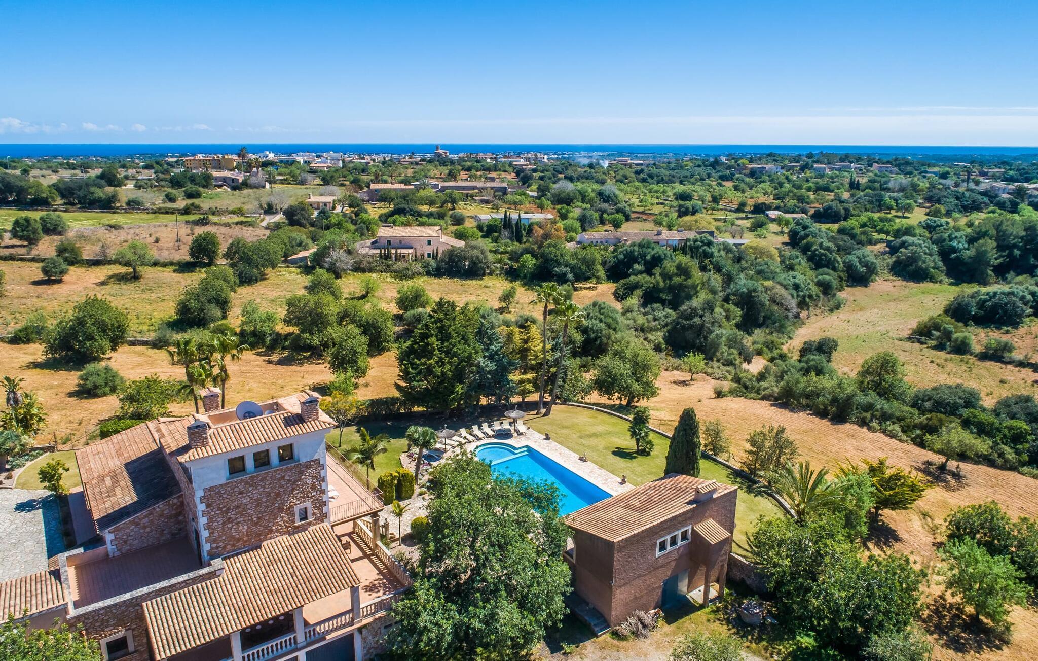 "Villa Can Palleta Nou" er et fantastisk naturstenshus med et imponerende tårn og store terrasseområder, der tilbyder både solrige og skyggefulde steder med udsigt over haven. Dette er et Fincallorca feriehus. Slap af ved den store pool på den brolagte terrasse under en parasol eller nyd dine måltider i det udendørs køkken med spisebord og komfortabelt siddeområde, mens du ser på det smukke grønne område. Den let skrånende pool er ideel til børn, som også har plads nok til at lege på græsplænen eller nyde et spil bordtennis. Denne rummelige villa har et varmt og indbydende interiør domineret af brunt træ og naturlige toner. I stueplan er der et veludstyret køkken, som løber ud i en mindre spiseplads med en charmerende muret pejs. En større spisestue har en stor lysekrone og et slående sort klaver. Stuen byder på en behagelig sofa til afslappende aftener ved pejsen eller foran fjernsynet. Stueetagen har tre soveværelser og fire moderne badeværelser, mens der ovenpå er yderligere to soveværelser og et badeværelse, hvoraf det ene har jacuzzi til ultimativ afslapning efter træning i fitnesscenteret i tårnrummet. Villaen “Can Palleta Nou” nær S'Horta, i den smukke sydlige del af øen, ligger ca. 1 km fra den idylliske landsby Calonge med butikker og restauranter. Den lille by S'Horta med dens supermarkeder, en café og den imponerende kirke Esglesia Sant Isidre ligger 2,6 km derfra. Den nærmeste strand ligger kun ca. 5 km væk. Aircondition i ejendommen er inkluderet i prisen, men dets brug er begrænset til kl. 21.00 til 07.00. Gebyret afregnes herefter kontant på stedet.