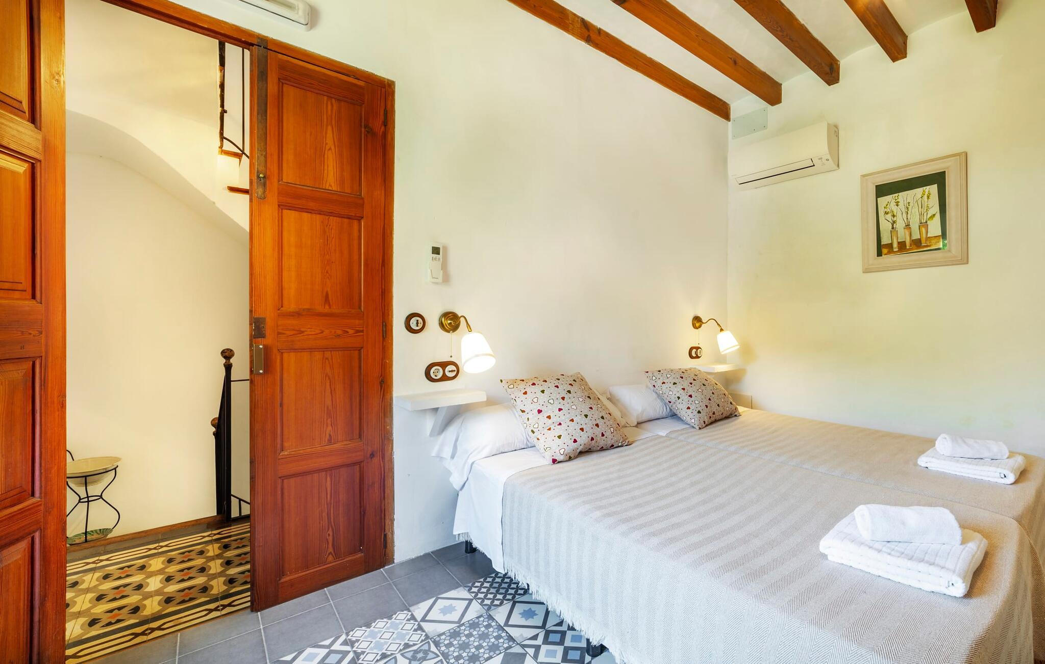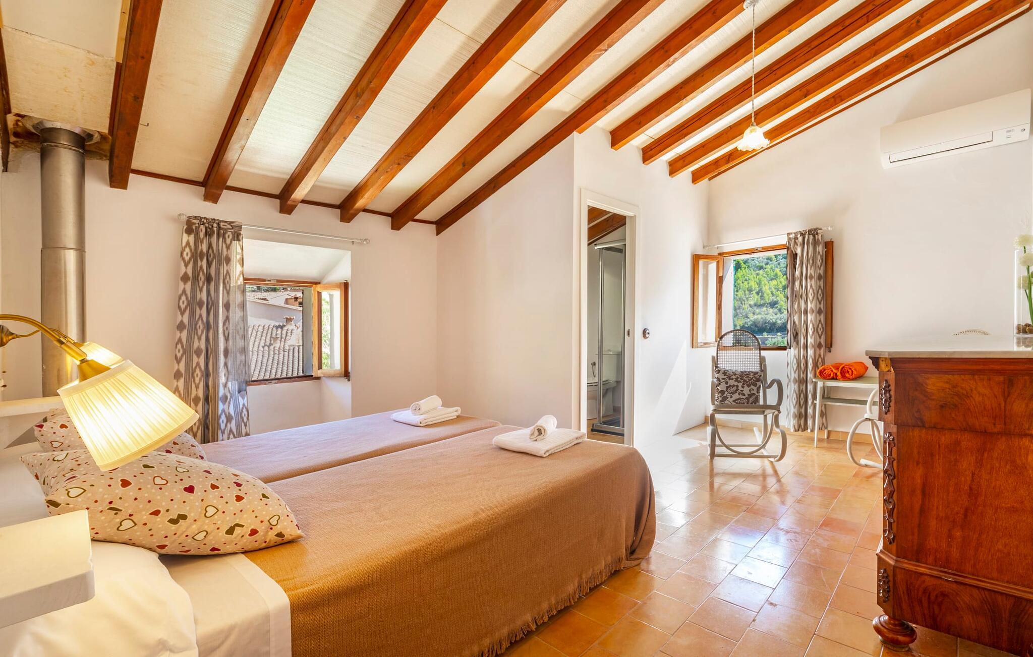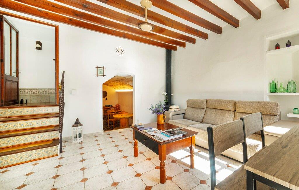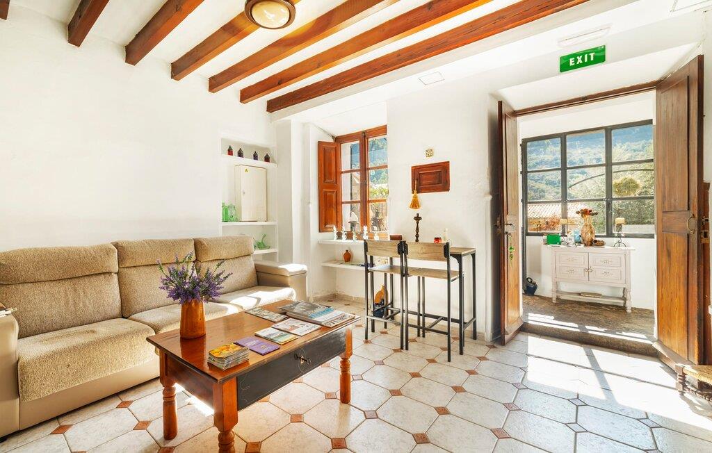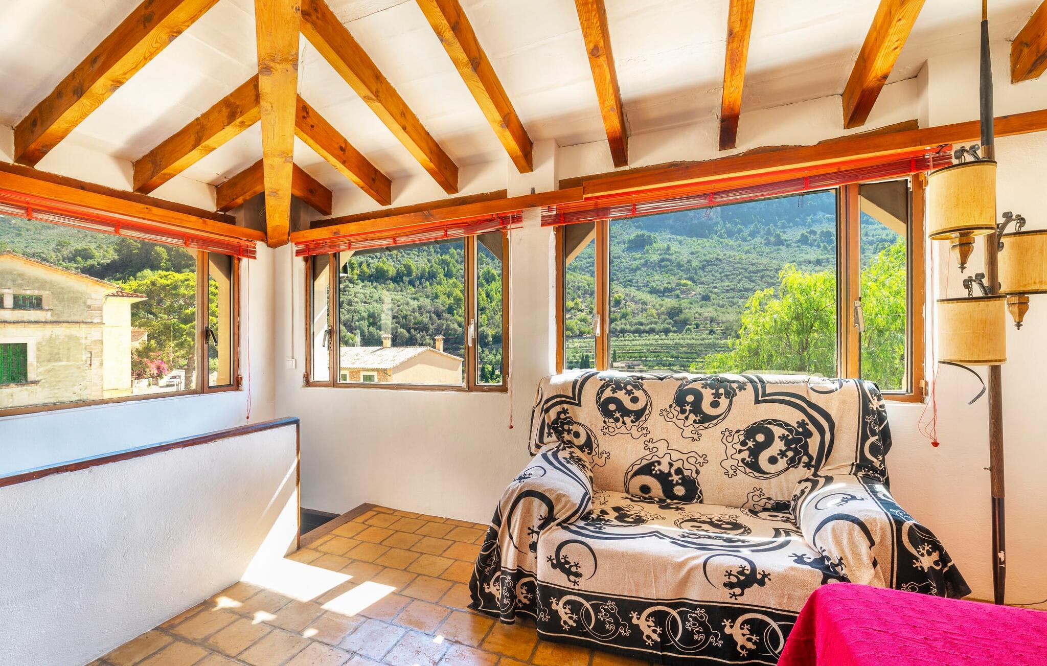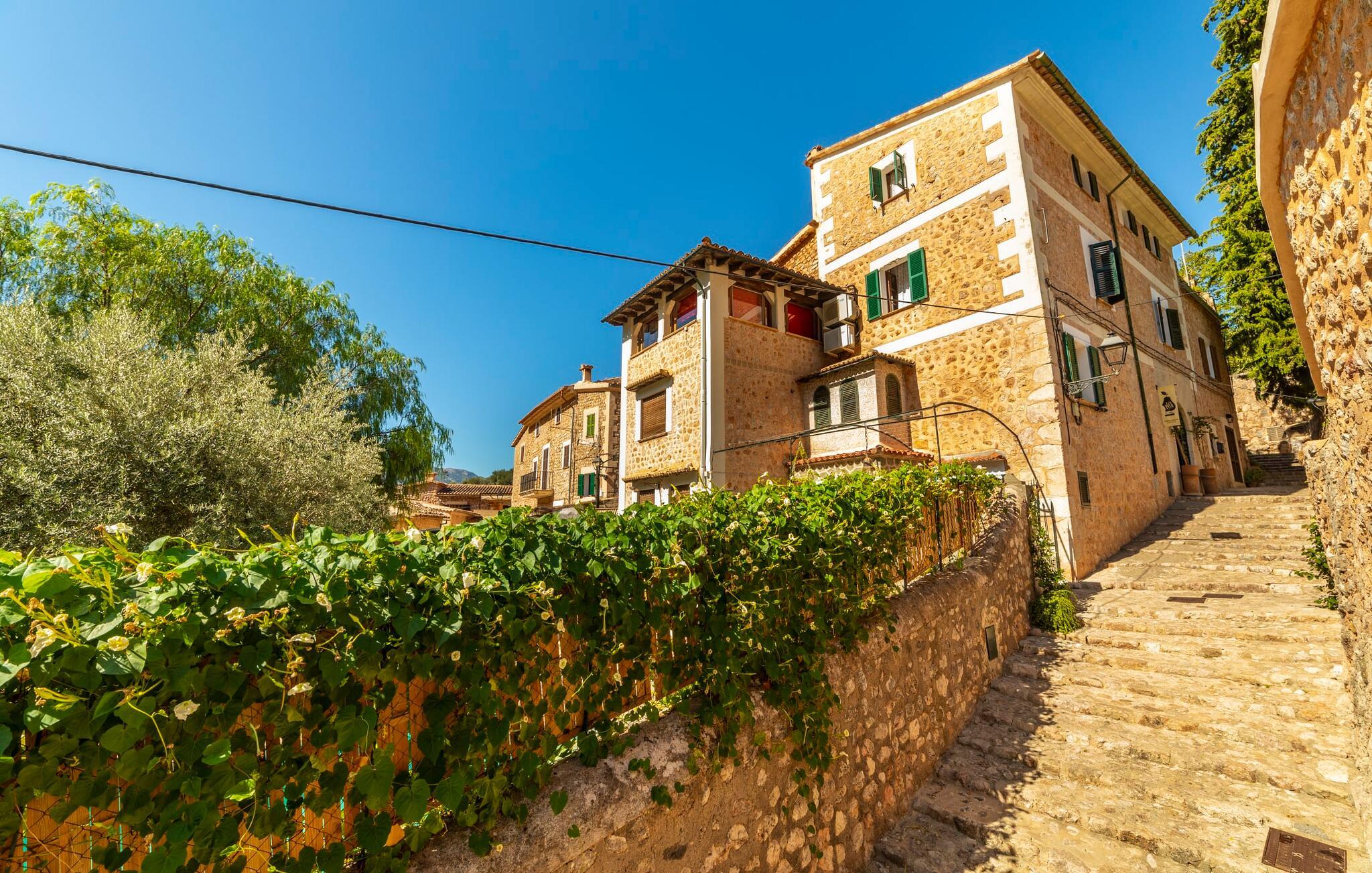 Elsker I at lære landet og dets folk at kende, mens I er på ferie og fordyber jer i deres kultur? Elsker I at være tæt på naturen, nyde stilfuldt liv og værdsætte komfort? Så er rækkehuset “Can Pera de Fornalutx”, fordelt på fire etager, nok den helt rigtige bolig for jer. Det smukke naturstenshus med grønne skodder er bygget på en vidunderlig sydvendt skråning i den maleriske, romantiske landsby Fornalutx. Selvom det ligger midt i en af byens typiske villagader med få direkte naboer, inviterer en velholdt lille have med brolagt terrasse, græsplæne, gamle knudrede træer og en privat pool til at slappe af og nyde privatlivets fred. Mens I sidder fortabt i tankerne i solen på en af de indbydende havestole og nyder en lækker drink, kan I nyde en fantastisk udsigt over de imponerende grønne bjerge, der omgiver jer. Rustikke stengulve, hvælvede lofter, mørkebrune bjælker, talrige gamle træmøbler og smukt dekorerede fliser overalt, der perfekt understreger husets landlige karakter: "Can Pera de Fornalutx" er et autentisk mallorcansk, smagfuldt, rustikt opholdsrum. Værelserne er fordelt på kælder, stueetage og to øverste etager. I stueetagen, på have- og terrasseniveau, finder I det hyggelige køkken med bord til morgenmad eller små snacks samt opholds- og spiseafdeling. På køligere aftener kan I sætte fødderne op i den stilfulde sofa og nyde den varmende ild, mens kun to trin adskiller jer fra en behageligt oplyst hvælving med et loft lavet af groft udhuggede natursten. Murstensbænke med behagelige hynder og flere rustikke træborde lavet af gamle tønder inviterer jer til at mødes, spise sammen, spille brætspil eller have en privat vinsmagning. I stueetagen er der et soveværelse med dobbeltseng med eget badeværelse, mens de yderligere soveværelser, som også har originale og moderne en-suite badeværelser, der matcher husets stil, er placeret på de to øverste etager. Fornalutx betragtes som en af de bedst bevarede traditionelle landsbyer i hele Spanien - og det med rette! Gå en tur gennem de smalle gader i den 600 indbyggere landsby, gå langs de gamle brostensbelagte gader og beundre de smukke, velbevarede facader på husene. Kig forbi en af de mange caféer, prøv de regionale delikatesser i en af de lokale restauranter eller i det veletablerede landsbybageri. Byens særlige flair vil hurtigt fange jer. Derudover er Fornalutx også et ideelt udgangspunkt for vandre- og cykelture gennem Tramuntana-bjergene. jeres sommerhus ligger lige ved foden af den populære Puig Major cykelrute. I krydser Puig Major i 818 meters højde. Ruten er 13,7 km lang og er særdeles velegnet til erfarne og erfarne cyklister. Vil I tilbringe en dag ved havet, bør I køre ad den 9 km lange vej, som er hørbar fra ejendommen, til Playa de Port Soller. Den bevogtede strand ligger i en idyllisk bugt og har en rigtig god infrastruktur, lige fra parasoludlejning, brusere og toiletter til en livlig strandpromenade med barer og restauranter. Et rækkehus tæt på naturen: "Can Pera de Fornalutx", bygget på en sydvendt bjergskråning i landsbyen Fornalutx, tilbyder netop denne vidunderlige feriekombination. Her er I højt oppe i Tramuntana-bjergene – og Fornalutx, ofte omtalt som "den smukkeste landsby i Spanien", byder på en storslået udsigt over Sollér-dalen. Butikker og restauranter er inden for nem gåafstand fra jeres hjem. I haven kan I tage en dukkert i poolen og slappe af under de gamle træer. Stranden Playa de Port de Sollé ligger kun 9 km derfra.