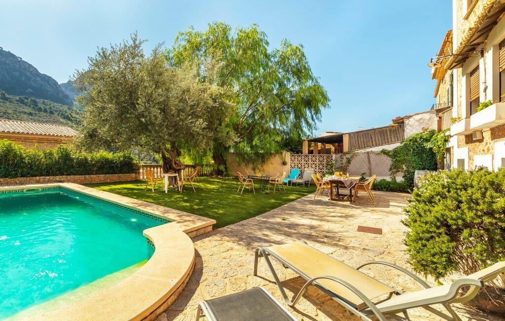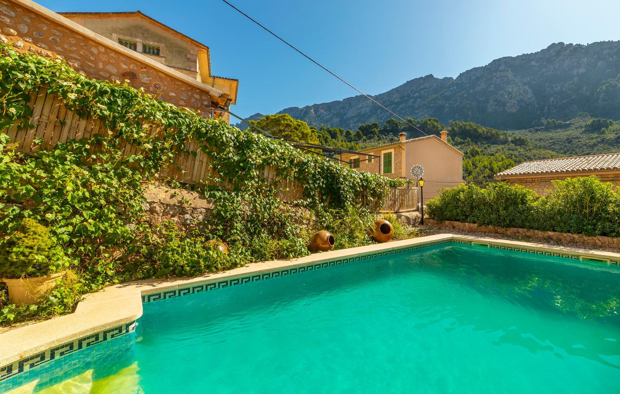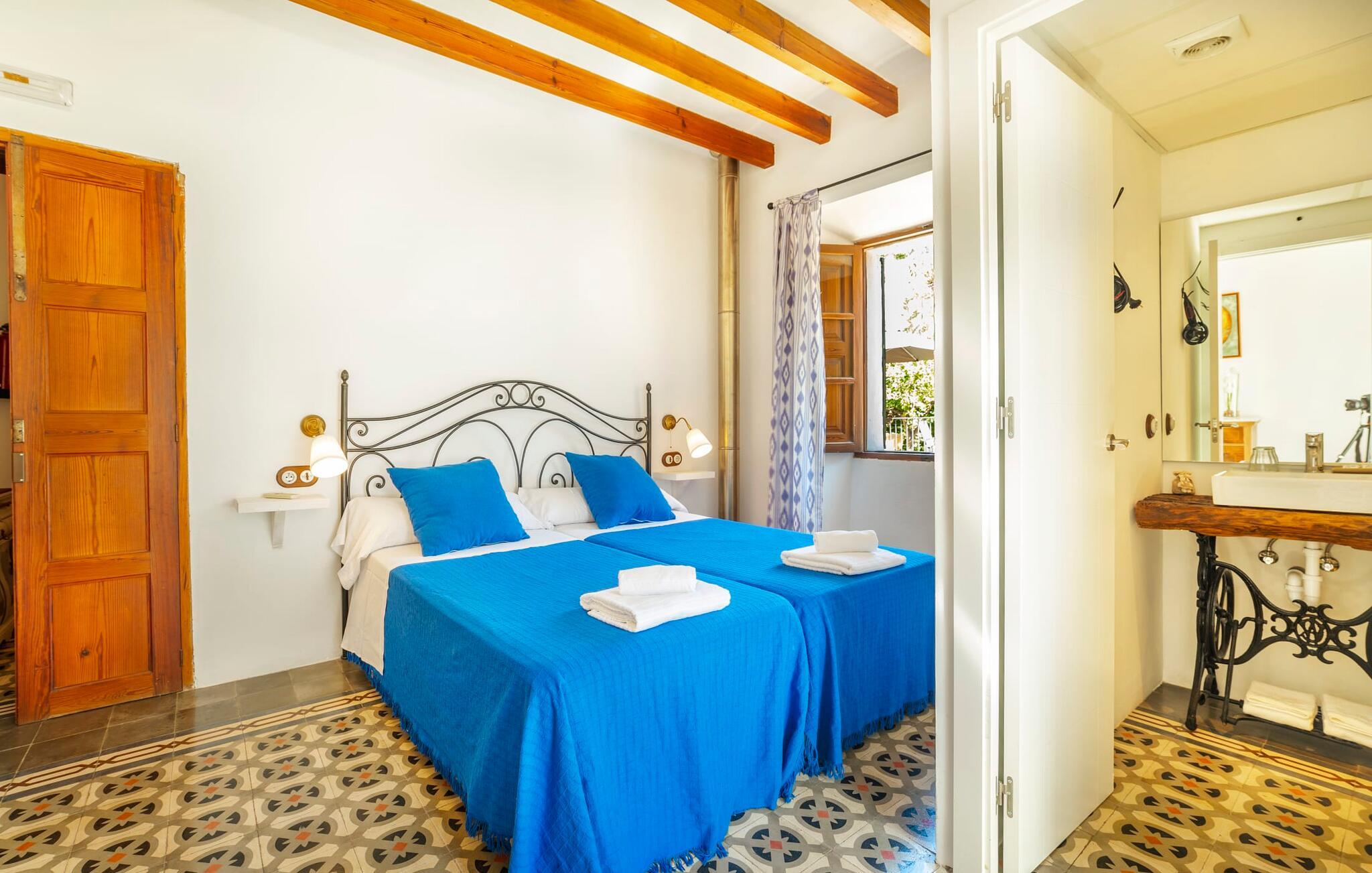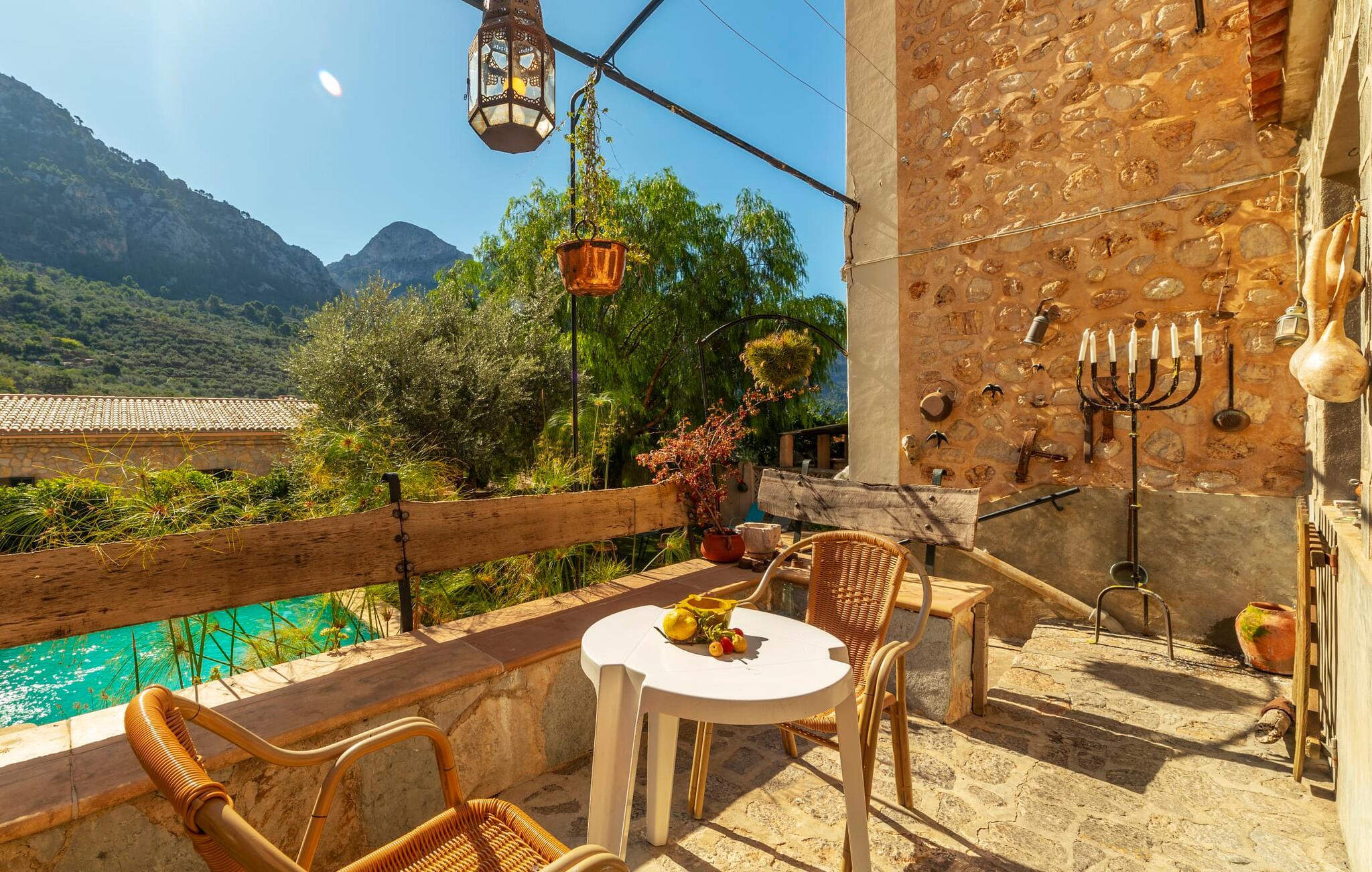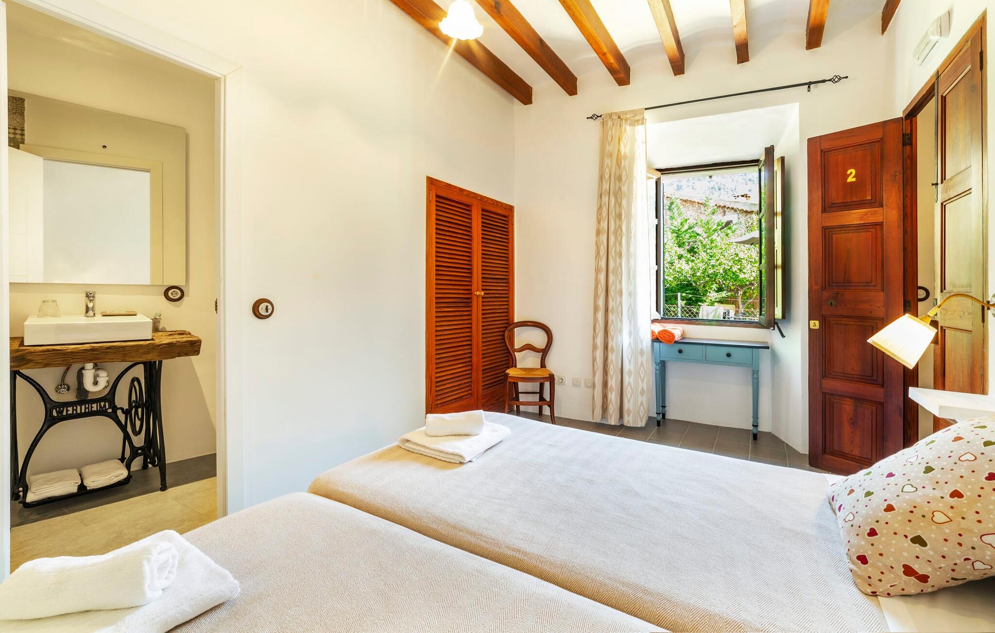 Elsker I at lære landet og dets folk at kende, mens I er på ferie og fordyber jer i deres kultur? Elsker I at være tæt på naturen, nyde stilfuldt liv og værdsætte komfort? Så er rækkehuset “Can Pera de Fornalutx”, fordelt på fire etager, nok den helt rigtige bolig for jer. Det smukke naturstenshus med grønne skodder er bygget på en vidunderlig sydvendt skråning i den maleriske, romantiske landsby Fornalutx. Selvom det ligger midt i en af byens typiske villagader med få direkte naboer, inviterer en velholdt lille have med brolagt terrasse, græsplæne, gamle knudrede træer og en privat pool til at slappe af og nyde privatlivets fred. Mens I sidder fortabt i tankerne i solen på en af de indbydende havestole og nyder en lækker drink, kan I nyde en fantastisk udsigt over de imponerende grønne bjerge, der omgiver jer. Rustikke stengulve, hvælvede lofter, mørkebrune bjælker, talrige gamle træmøbler og smukt dekorerede fliser overalt, der perfekt understreger husets landlige karakter: "Can Pera de Fornalutx" er et autentisk mallorcansk, smagfuldt, rustikt opholdsrum. Værelserne er fordelt på kælder, stueetage og to øverste etager. I stueetagen, på have- og terrasseniveau, finder I det hyggelige køkken med bord til morgenmad eller små snacks samt opholds- og spiseafdeling. På køligere aftener kan I sætte fødderne op i den stilfulde sofa og nyde den varmende ild, mens kun to trin adskiller jer fra en behageligt oplyst hvælving med et loft lavet af groft udhuggede natursten. Murstensbænke med behagelige hynder og flere rustikke træborde lavet af gamle tønder inviterer jer til at mødes, spise sammen, spille brætspil eller have en privat vinsmagning. I stueetagen er der et soveværelse med dobbeltseng med eget badeværelse, mens de yderligere soveværelser, som også har originale og moderne en-suite badeværelser, der matcher husets stil, er placeret på de to øverste etager. Fornalutx betragtes som en af de bedst bevarede traditionelle landsbyer i hele Spanien - og det med rette! Gå en tur gennem de smalle gader i den 600 indbyggere landsby, gå langs de gamle brostensbelagte gader og beundre de smukke, velbevarede facader på husene. Kig forbi en af de mange caféer, prøv de regionale delikatesser i en af de lokale restauranter eller i det veletablerede landsbybageri. Byens særlige flair vil hurtigt fange jer. Derudover er Fornalutx også et ideelt udgangspunkt for vandre- og cykelture gennem Tramuntana-bjergene. jeres sommerhus ligger lige ved foden af den populære Puig Major cykelrute. I krydser Puig Major i 818 meters højde. Ruten er 13,7 km lang og er særdeles velegnet til erfarne og erfarne cyklister. Vil I tilbringe en dag ved havet, bør I køre ad den 9 km lange vej, som er hørbar fra ejendommen, til Playa de Port Soller. Den bevogtede strand ligger i en idyllisk bugt og har en rigtig god infrastruktur, lige fra parasoludlejning, brusere og toiletter til en livlig strandpromenade med barer og restauranter. Et rækkehus tæt på naturen: "Can Pera de Fornalutx", bygget på en sydvendt bjergskråning i landsbyen Fornalutx, tilbyder netop denne vidunderlige feriekombination. Her er I højt oppe i Tramuntana-bjergene – og Fornalutx, ofte omtalt som "den smukkeste landsby i Spanien", byder på en storslået udsigt over Sollér-dalen. Butikker og restauranter er inden for nem gåafstand fra jeres hjem. I haven kan I tage en dukkert i poolen og slappe af under de gamle træer. Stranden Playa de Port de Sollé ligger kun 9 km derfra.