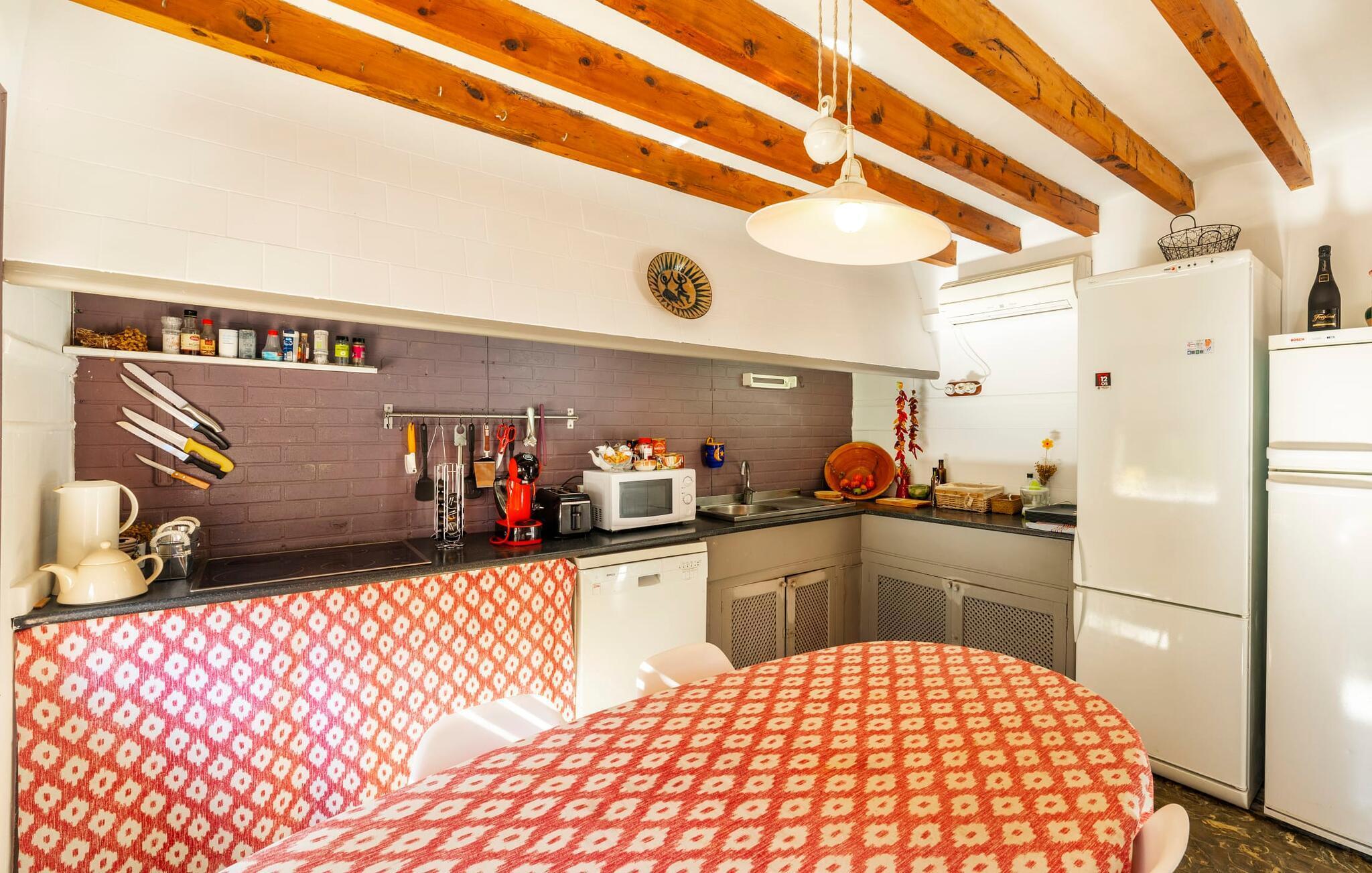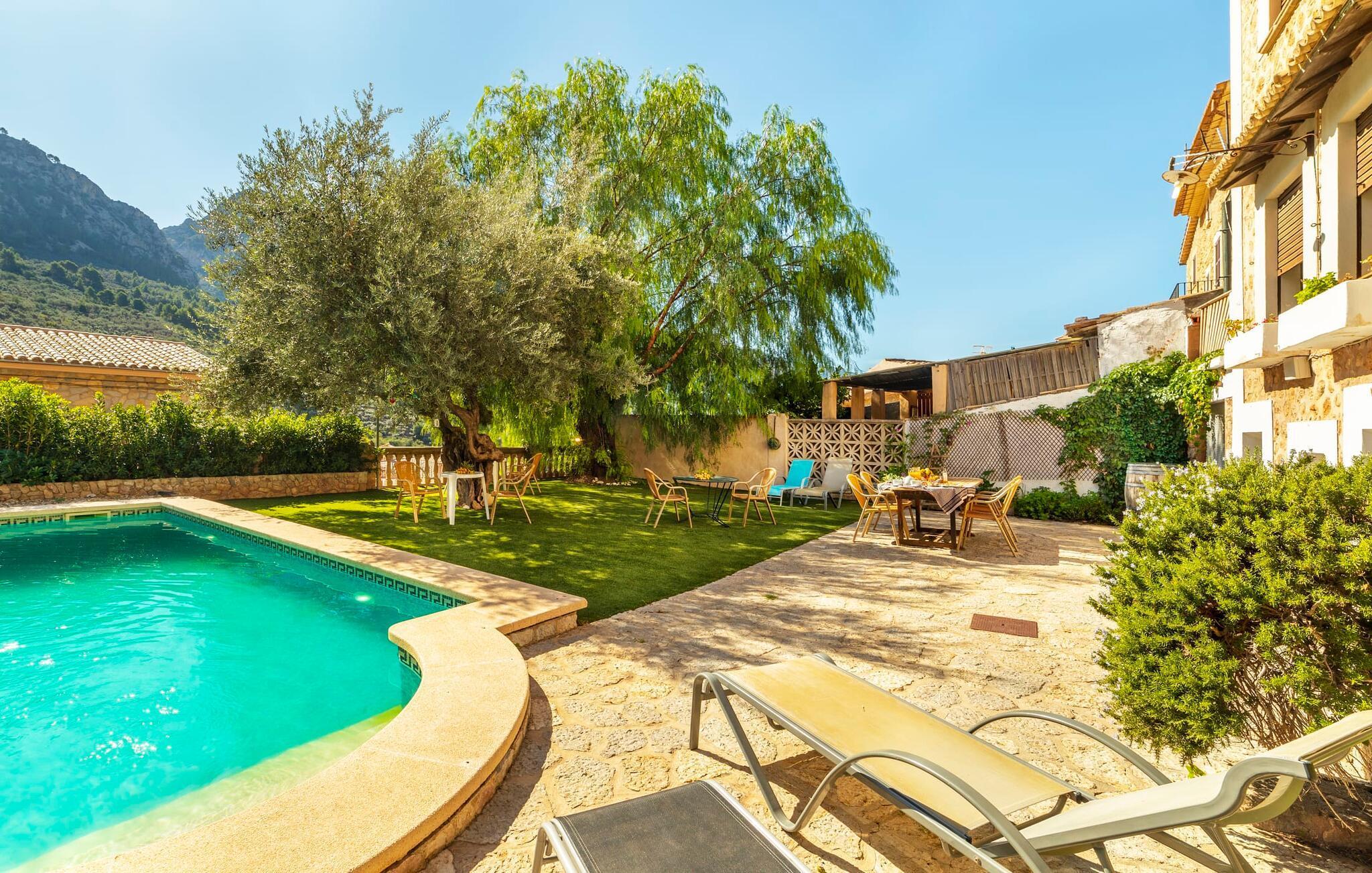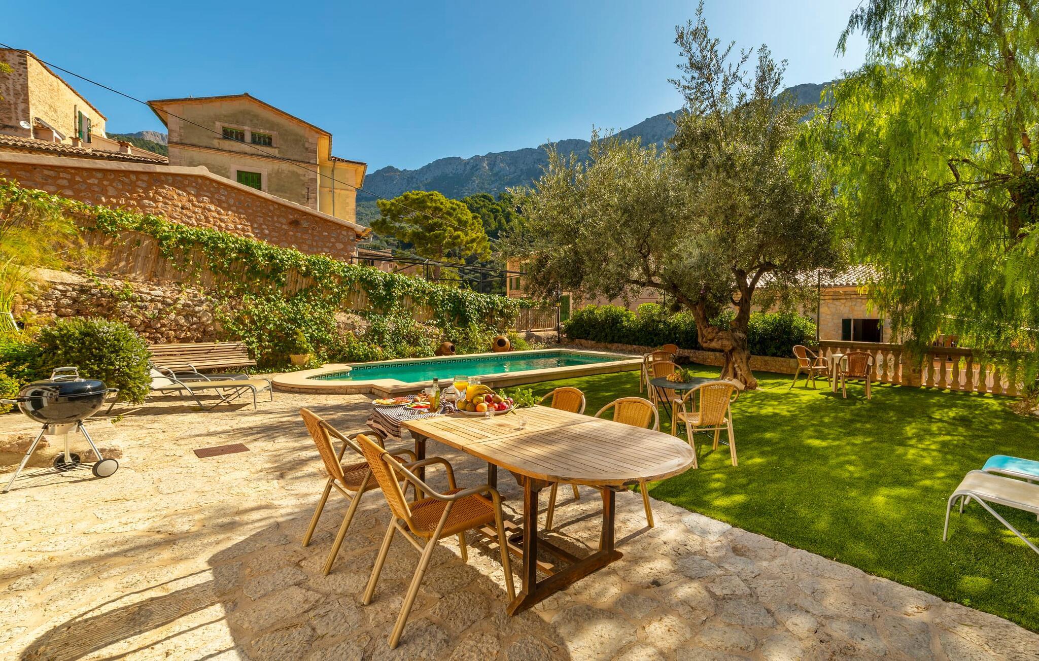 Elsker du at lære landet og dets folk at kende, mens du er på ferie og fordyber dig i deres kultur? Elsker du at være tæt på naturen, nyde stilfuldt liv og værdsætte komfort? Så er rækkehuset “Can Pera de Fornalutx”, fordelt på fire etager, nok den helt rigtige bolig for dig. Det smukke naturstenshus med grønne skodder er bygget på en vidunderlig sydvendt skråning i den maleriske, romantiske landsby Fornalutx. Selvom det ligger midt i en af byens typiske villagader med få direkte naboer, inviterer en velholdt lille have med brolagt terrasse, græsplæne, gamle knudrede træer og en privat pool til at slappe af og nyde privatlivets fred. Mens du sidder fortabt i tankerne i solen på en af de indbydende havestole og nyder en lækker drink, kan du nyde en fantastisk udsigt over de imponerende grønne bjerge, der omgiver dig. Rustikke stengulve, hvælvede lofter, mørkebrune bjælker, talrige gamle træmøbler og smukt dekorerede fliser overalt, der perfekt understreger husets landlige karakter: "Can Pera de Fornalutx" er et autentisk mallorcansk, smagfuldt, rustikt opholdsrum. Værelserne er fordelt på kælder, stueetage og to øverste etager. I stueetagen, på have- og terrasseniveau, finder du det hyggelige køkken med bord til morgenmad eller små snacks samt opholds- og spiseafdeling. På køligere aftener kan du sætte fødderne op i den stilfulde sofa og nyde den varmende ild, mens kun to trin adskiller dig fra en behageligt oplyst hvælving med et loft lavet af groft udhuggede natursten. Murstensbænke med behagelige hynder og flere rustikke træborde lavet af gamle tønder inviterer jer til at mødes, spise sammen, spille brætspil eller have en privat vinsmagning. I stueetagen er der et soveværelse med dobbeltseng med eget badeværelse, mens de yderligere soveværelser, som også har originale og moderne en-suite badeværelser, der matcher husets stil, er placeret på de to øverste etager. Fornalutx betragtes som en af de bedst bevarede traditionelle landsbyer i hele Spanien - og det med rette! Gå en tur gennem de smalle gader i den 600 indbyggere landsby, gå langs de gamle brostensbelagte gader og beundre de smukke, velbevarede facader på husene. Kig forbi en af de mange caféer, prøv de regionale delikatesser i en af de lokale restauranter eller i det veletablerede landsbybageri. Byens særlige flair vil hurtigt fange dig. Derudover er Fornalutx også et ideelt udgangspunkt for vandre- og cykelture gennem Tramuntana-bjergene. Dit sommerhus ligger lige ved foden af den populære Puig Major cykelrute. Du krydser Puig Major i 818 meters højde. Ruten er 13,7 km lang og er særdeles velegnet til erfarne og erfarne cyklister. Vil du tilbringe en dag ved havet, bør du køre ad den 9 km lange vej, som er hørbar fra ejendommen, til Playa de Port Soller. Den bevogtede strand ligger i en idyllisk bugt og har en rigtig god infrastruktur, lige fra parasoludlejning, brusere og toiletter til en livlig strandpromenade med barer og restauranter. Et rækkehus tæt på naturen: "Can Pera de Fornalutx", bygget på en sydvendt bjergskråning i landsbyen Fornalutx, tilbyder netop denne vidunderlige feriekombination. Her er du højt oppe i Tramuntana-bjergene – og Fornalutx, ofte omtalt som "den smukkeste landsby i Spanien", byder på en storslået udsigt over Sollér-dalen. Butikker og restauranter er inden for nem gåafstand fra dit hjem. I haven kan du tage en dukkert i poolen og slappe af under de gamle træer. Stranden Playa de Port de Sollé ligger kun 9 km derfra. Dette er et Fincallorca feriehus.