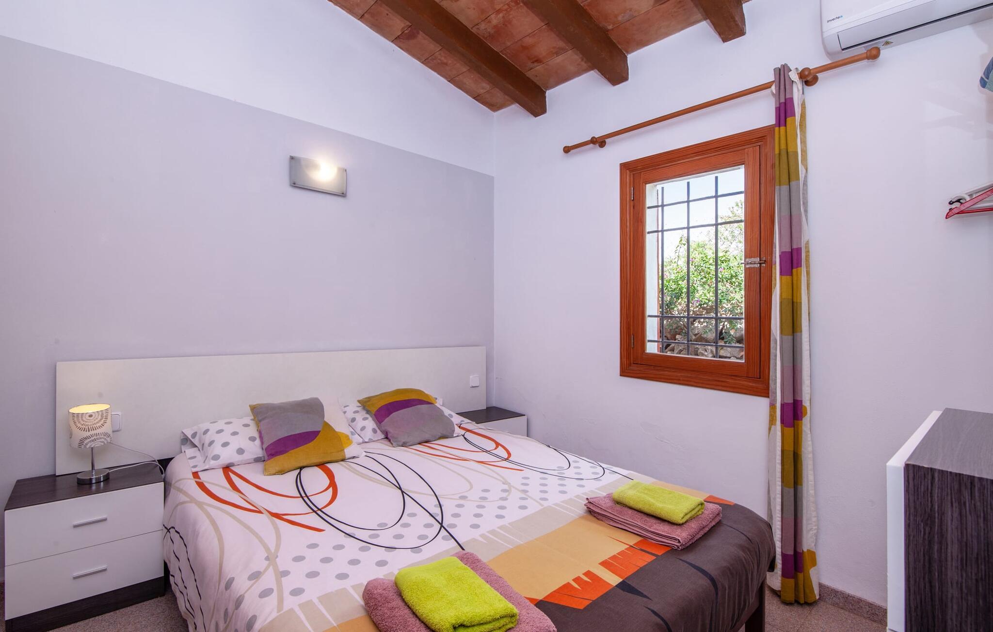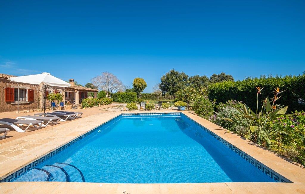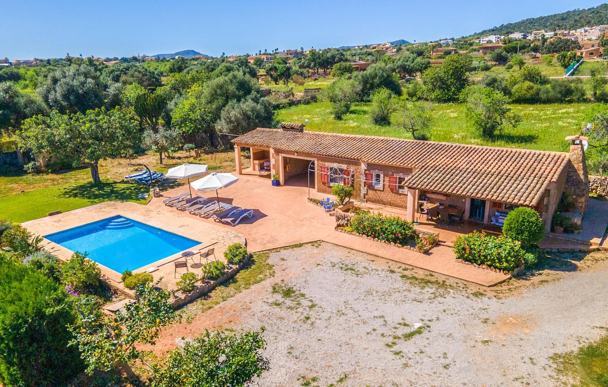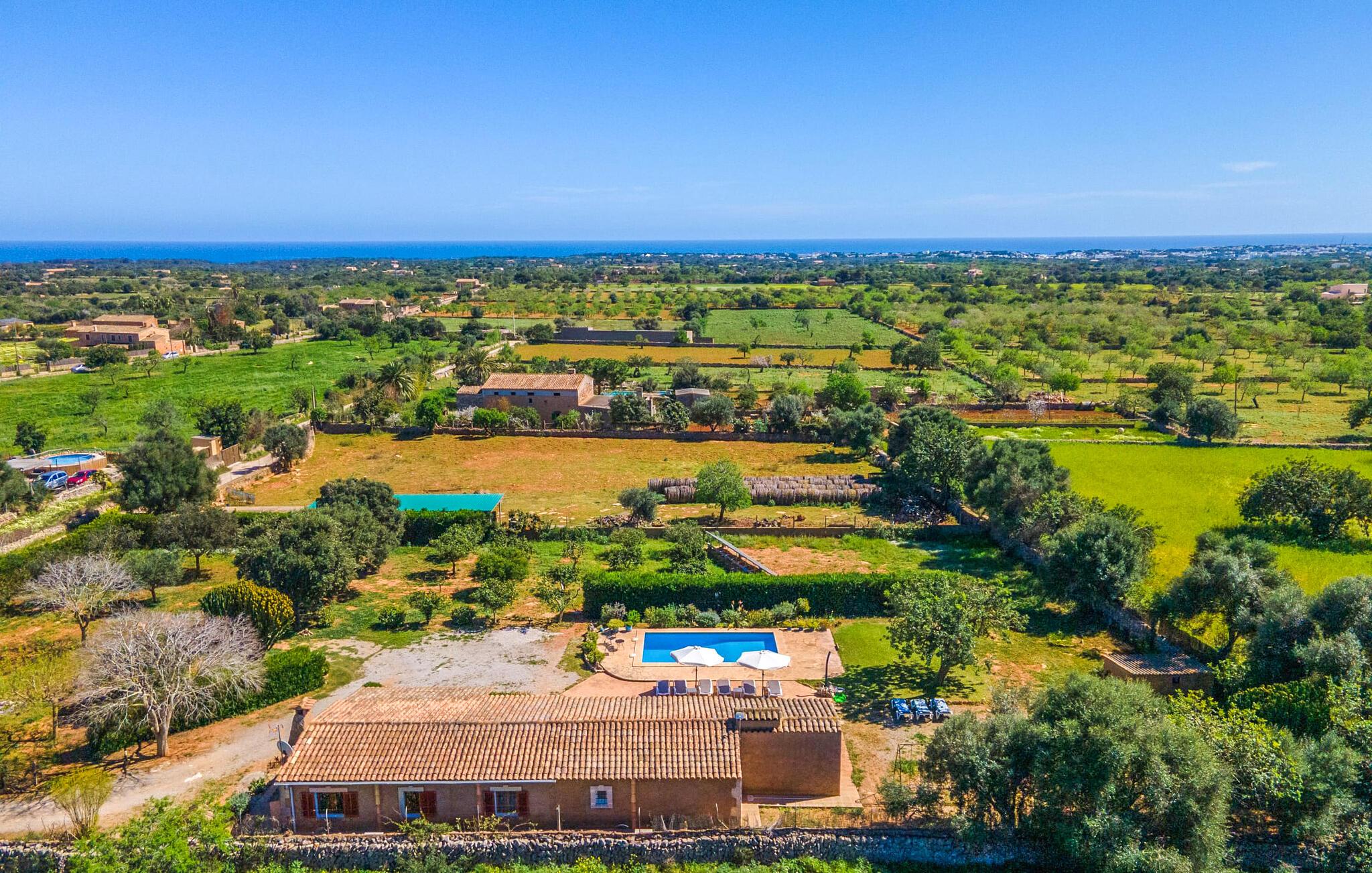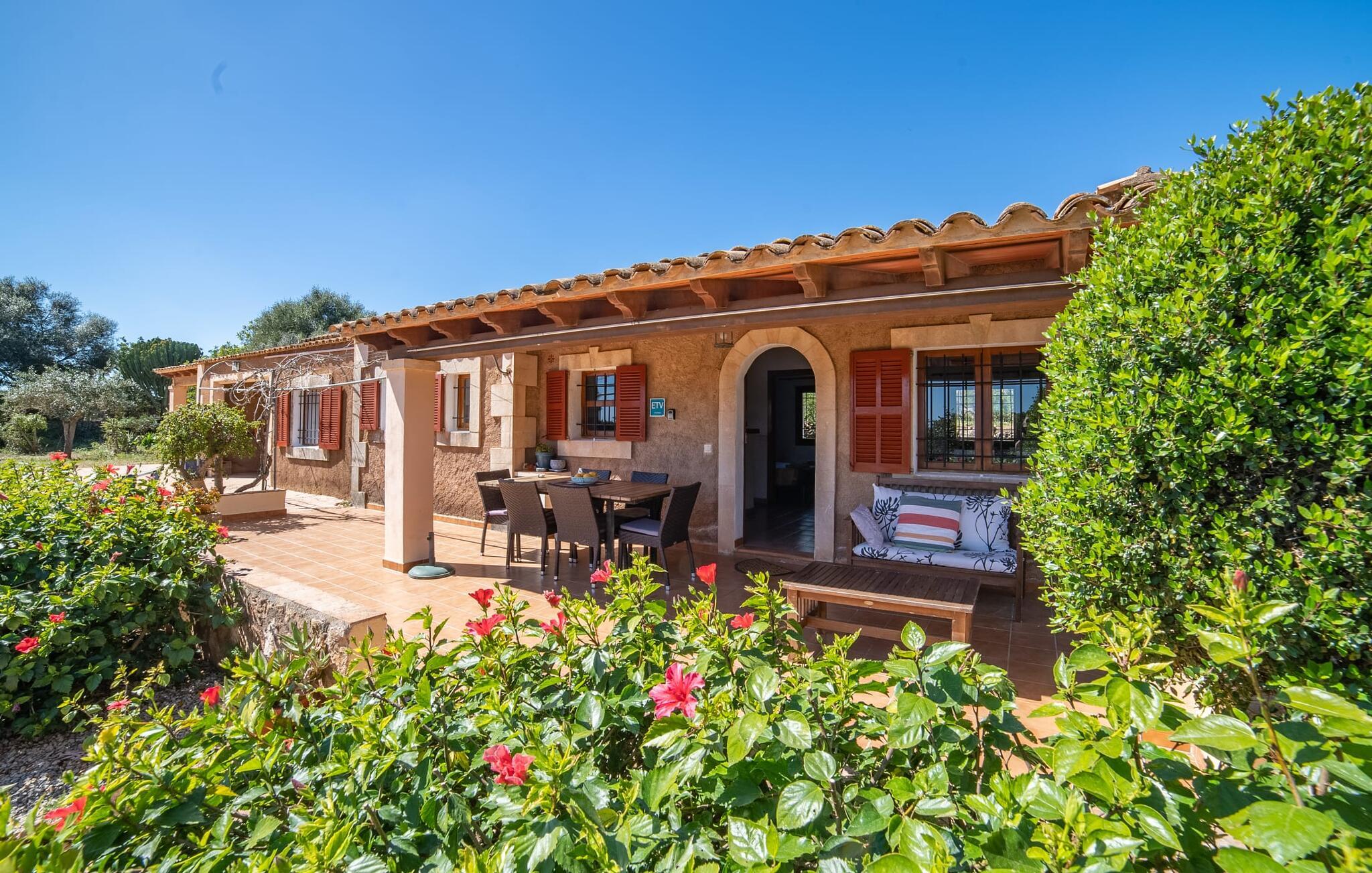 En bred vifte af middelhavsvegetation og forskellige åbne og overdækkede opholdsområder inviterer jer til at tilbringe afslappende timer under middelhavshimlen på det 3.500 m² store areal på denne Mallorca-gård. Den pæne spiseplads er bekvemt placeret lige ved indgangen til huset, og lige ved siden af er der en hyggelig siddeplads, for eksempel til en eftermiddagskaffe. I kan nyde aftengrill i det overdækkede udekøkken med en muret grill. Børn kan lege på græsplænerne, gynge og selvfølgelig plaske rundt i den behageligt lavvandede swimmingpool. En bruser med varmt vand fuldender den udendørs komfort, og det samme gør de komfortable liggestole til omfattende solbadning. Boligarealerne, der strækker sig over ét plan, udstråler en hyggelig, ret utraditionel flair. Den åbne stue-alrum med sofa, tv og spisebord er perfekt til afslapning indendørs. Det fuldt udstyrede, åbne, integrerede køkken med disk som gennemløb giver gode forudsætninger for selvforsynende selvforsørgelse. Tre individuelt indrettede dobbeltværelser med aircondition er tilgængelige til afslappende ferienætter. To bruserum, hvoraf det ene har eget bad, runder pladsen af i denne familievenlige bondegård på Mallorca. Dette charmerende landsted er beliggende nær S'Horta i en førsteklasses beliggenhed i den sydøstlige del af Mallorca. Stedet, der er skånet for masseturisme, byder på gode indkøbsmuligheder. Det er kun omkring 5 minutter i bil til havet. Der finder I drømmebugter som Cala Sa Nau (3,3 km) eller Cala d'Or (ca. 5 km).