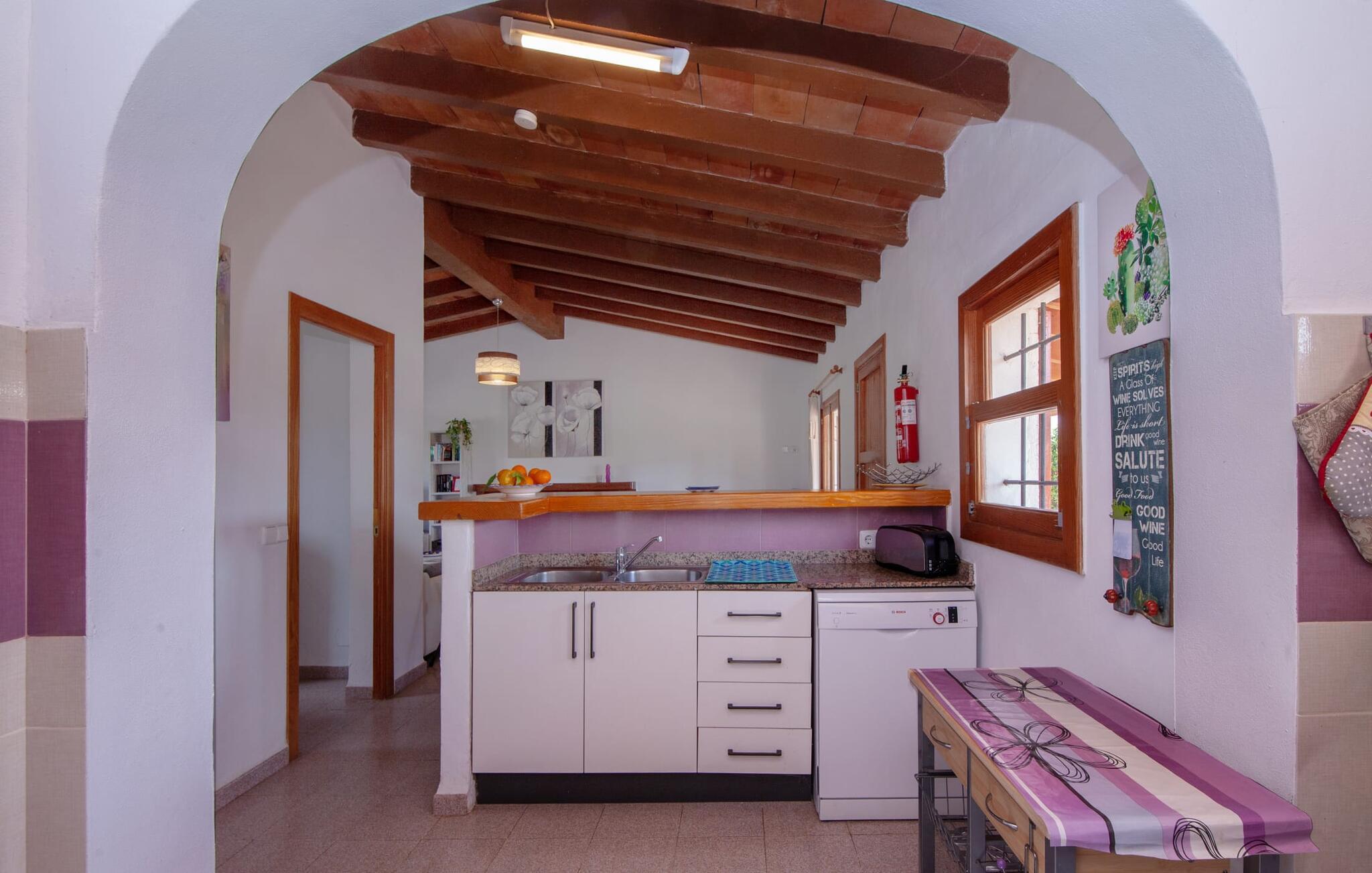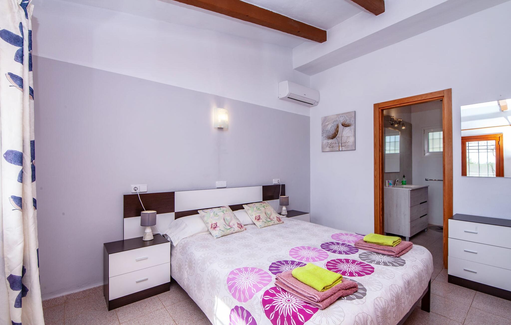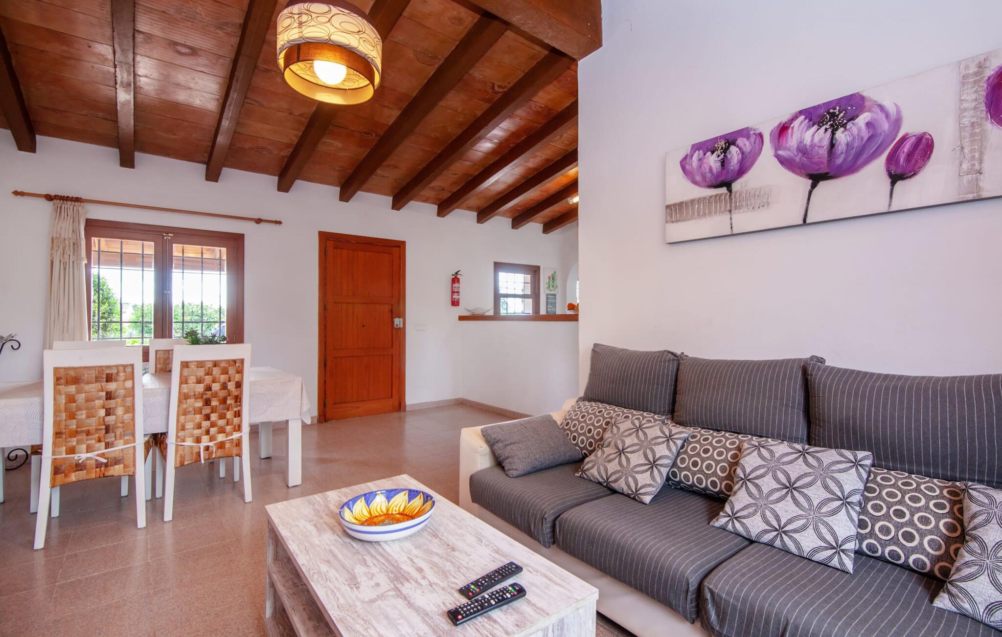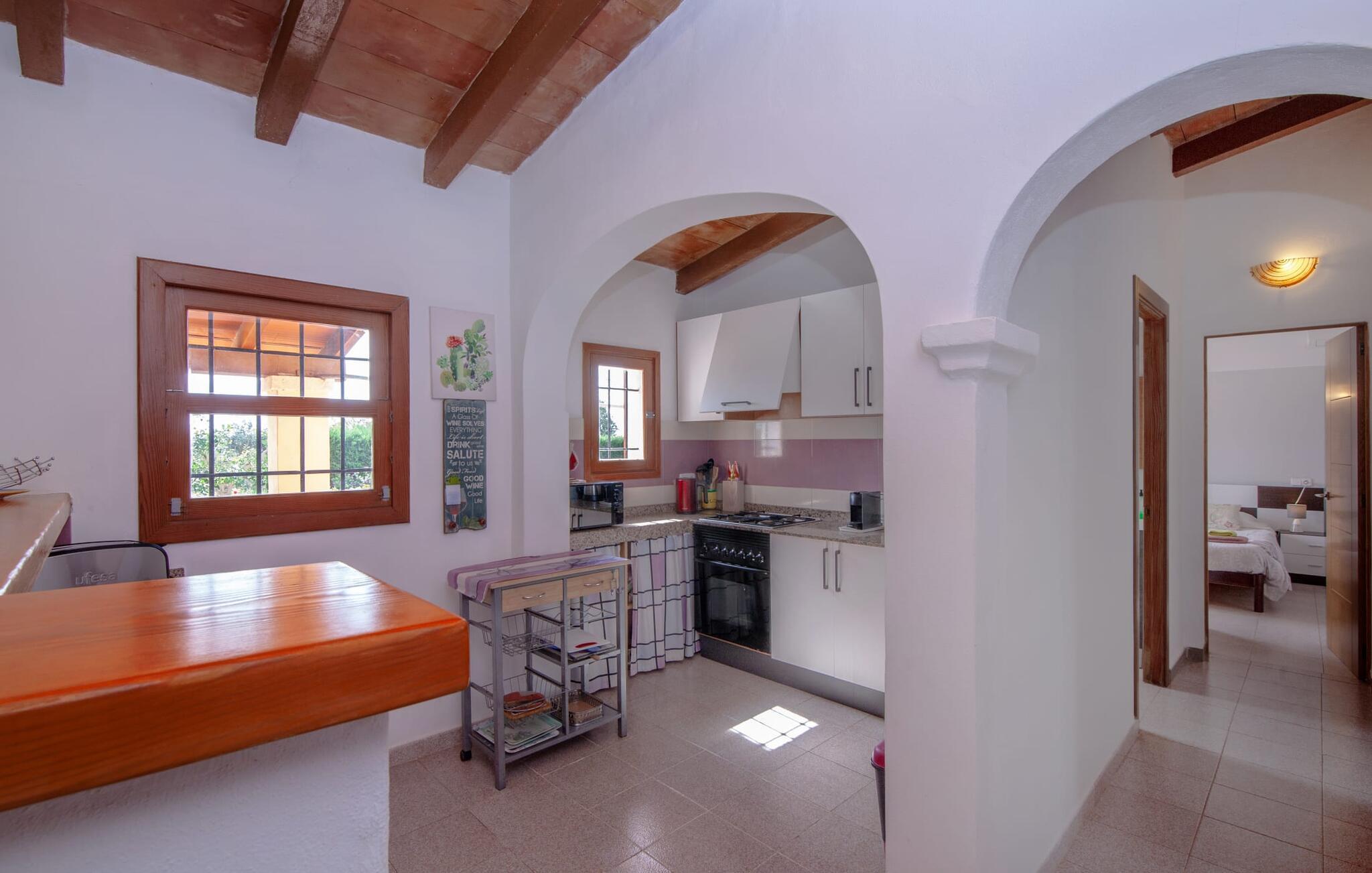 En bred vifte af middelhavsvegetation og forskellige åbne og overdækkede opholdsområder inviterer jer til at tilbringe afslappende timer under middelhavshimlen på det 3.500 m² store areal på denne Mallorca-gård. Den pæne spiseplads er bekvemt placeret lige ved indgangen til huset, og lige ved siden af er der en hyggelig siddeplads, for eksempel til en eftermiddagskaffe. I kan nyde aftengrill i det overdækkede udekøkken med en muret grill. Børn kan lege på græsplænerne, gynge og selvfølgelig plaske rundt i den behageligt lavvandede swimmingpool. En bruser med varmt vand fuldender den udendørs komfort, og det samme gør de komfortable liggestole til omfattende solbadning. Boligarealerne, der strækker sig over ét plan, udstråler en hyggelig, ret utraditionel flair. Den åbne stue-alrum med sofa, tv og spisebord er perfekt til afslapning indendørs. Det fuldt udstyrede, åbne, integrerede køkken med disk som gennemløb giver gode forudsætninger for selvforsynende selvforsørgelse. Tre individuelt indrettede dobbeltværelser med aircondition er tilgængelige til afslappende ferienætter. To bruserum, hvoraf det ene har eget bad, runder pladsen af i denne familievenlige bondegård på Mallorca. Dette charmerende landsted er beliggende nær S'Horta i en førsteklasses beliggenhed i den sydøstlige del af Mallorca. Stedet, der er skånet for masseturisme, byder på gode indkøbsmuligheder. Det er kun omkring 5 minutter i bil til havet. Der finder I drømmebugter som Cala Sa Nau (3,3 km) eller Cala d'Or (ca. 5 km).