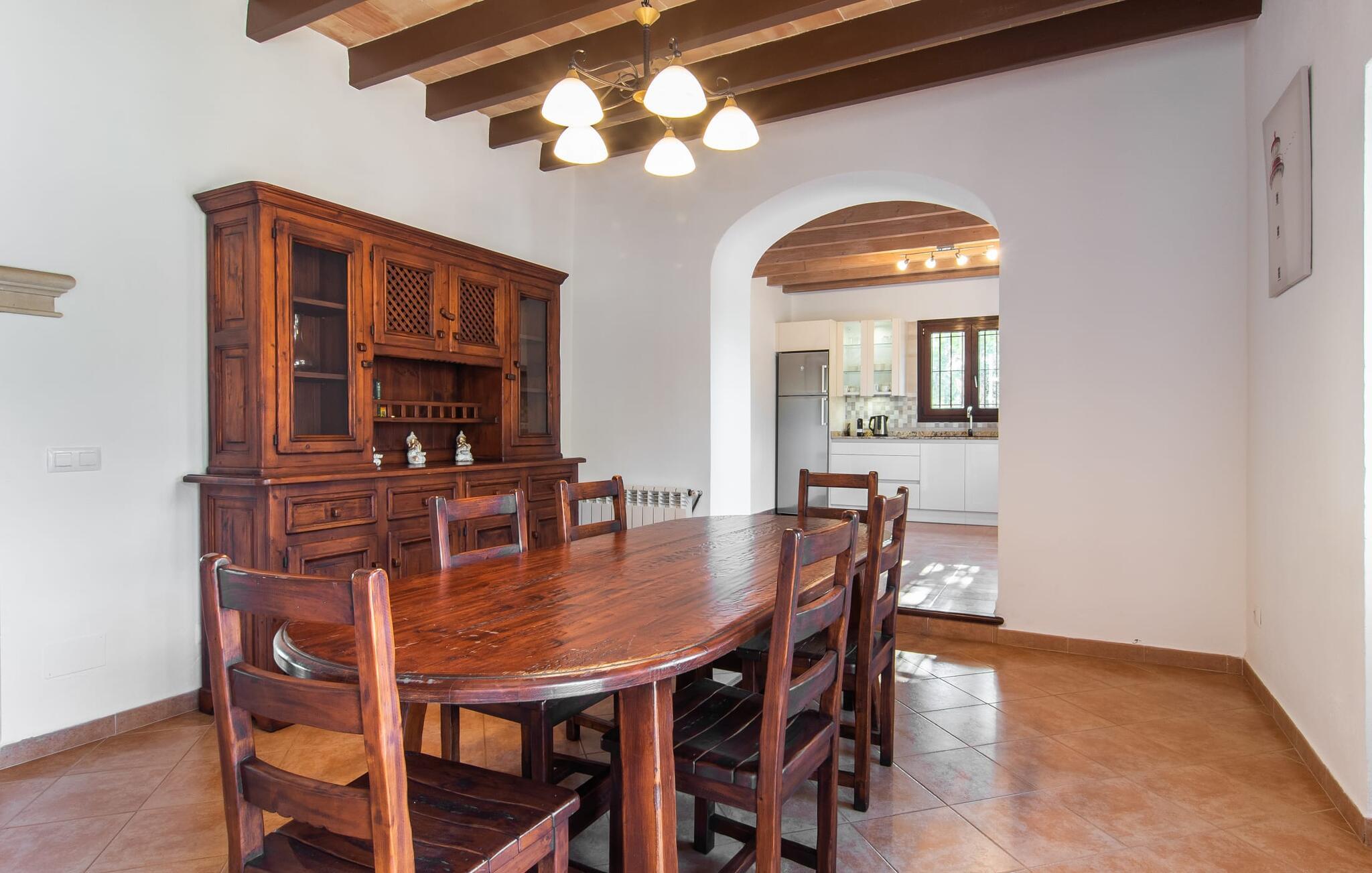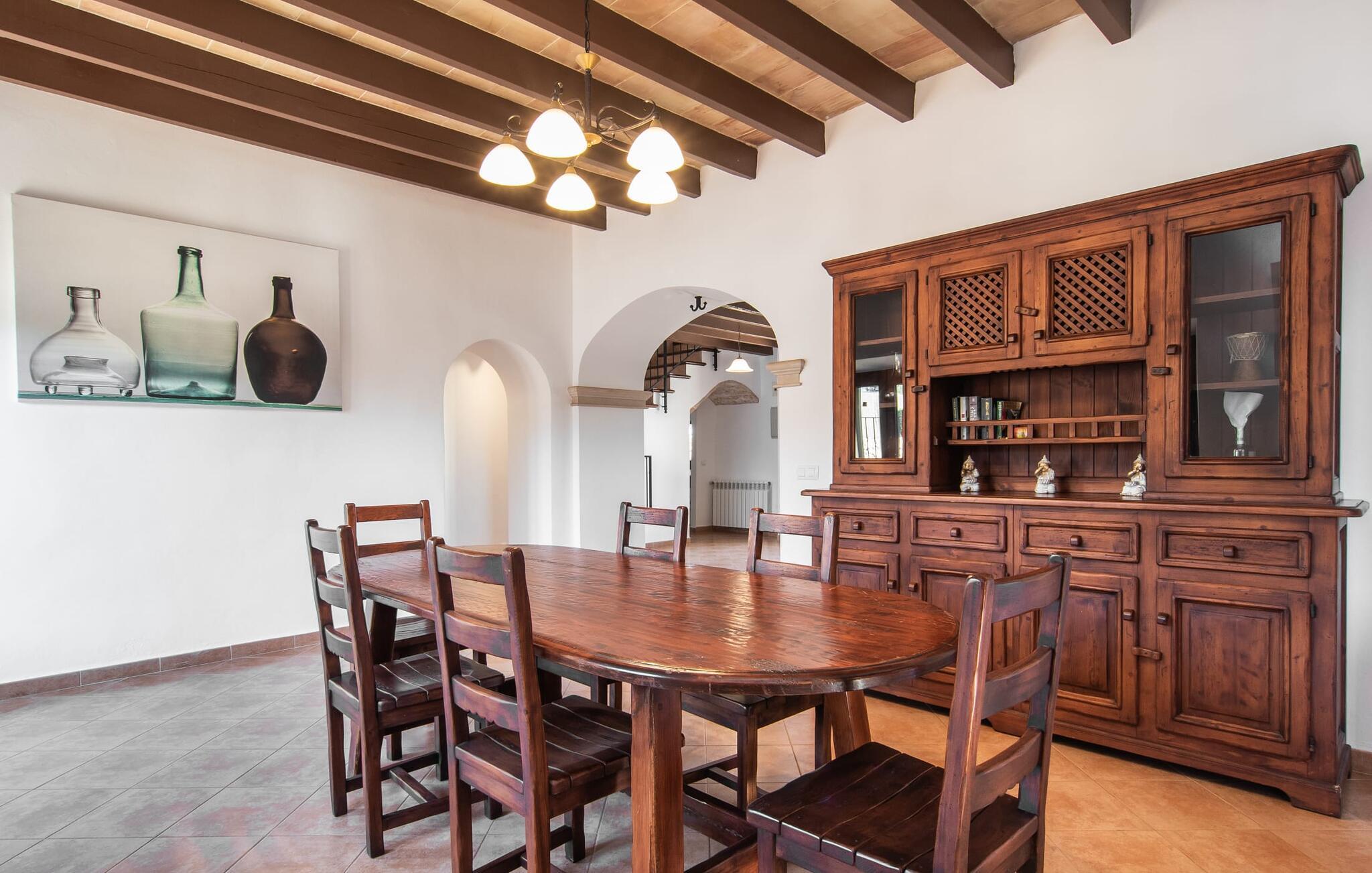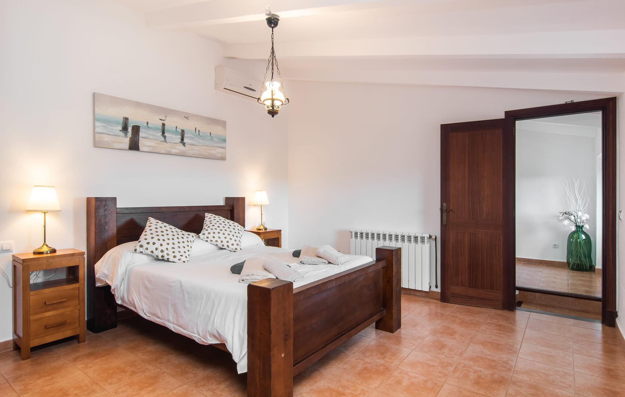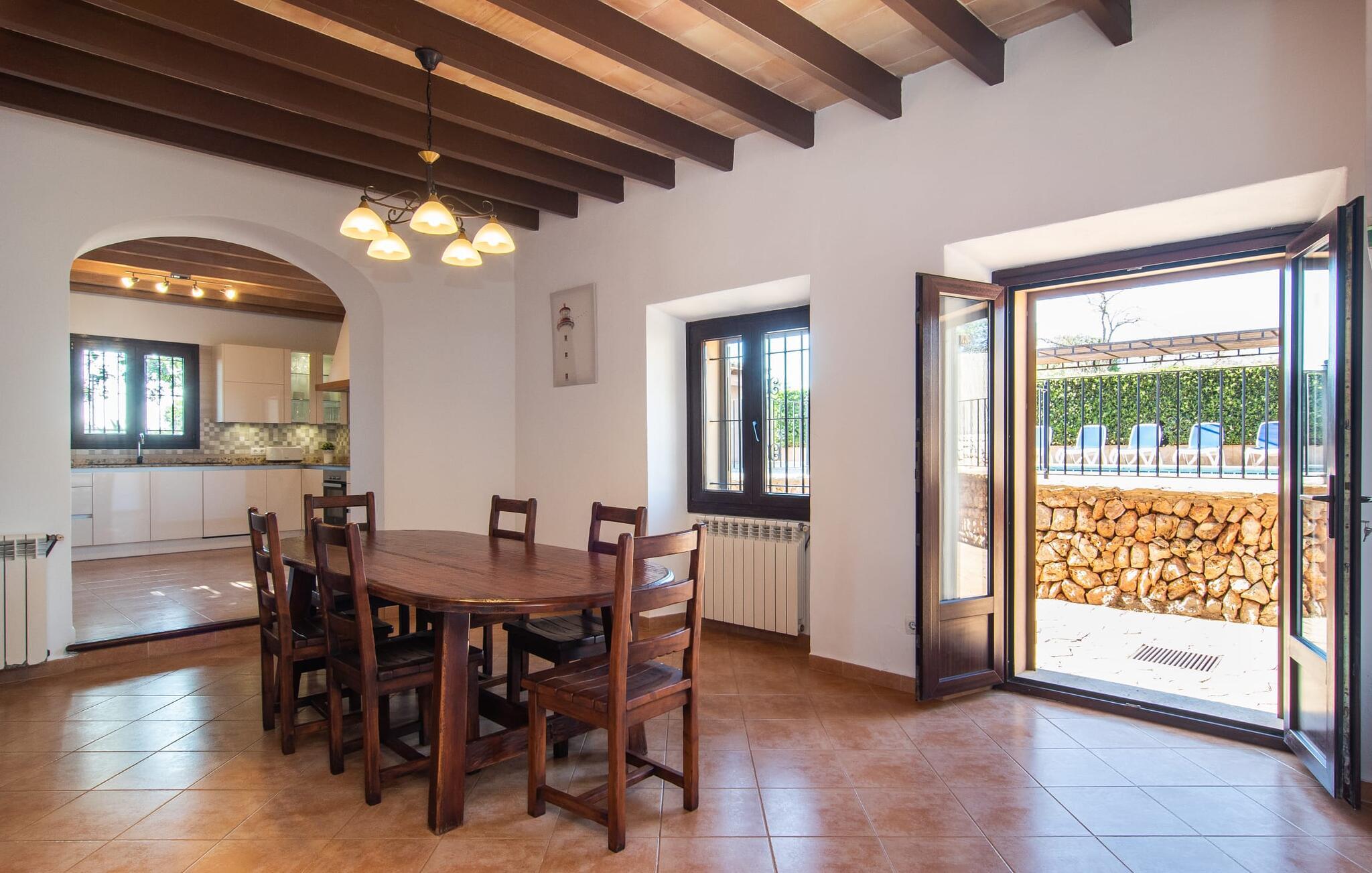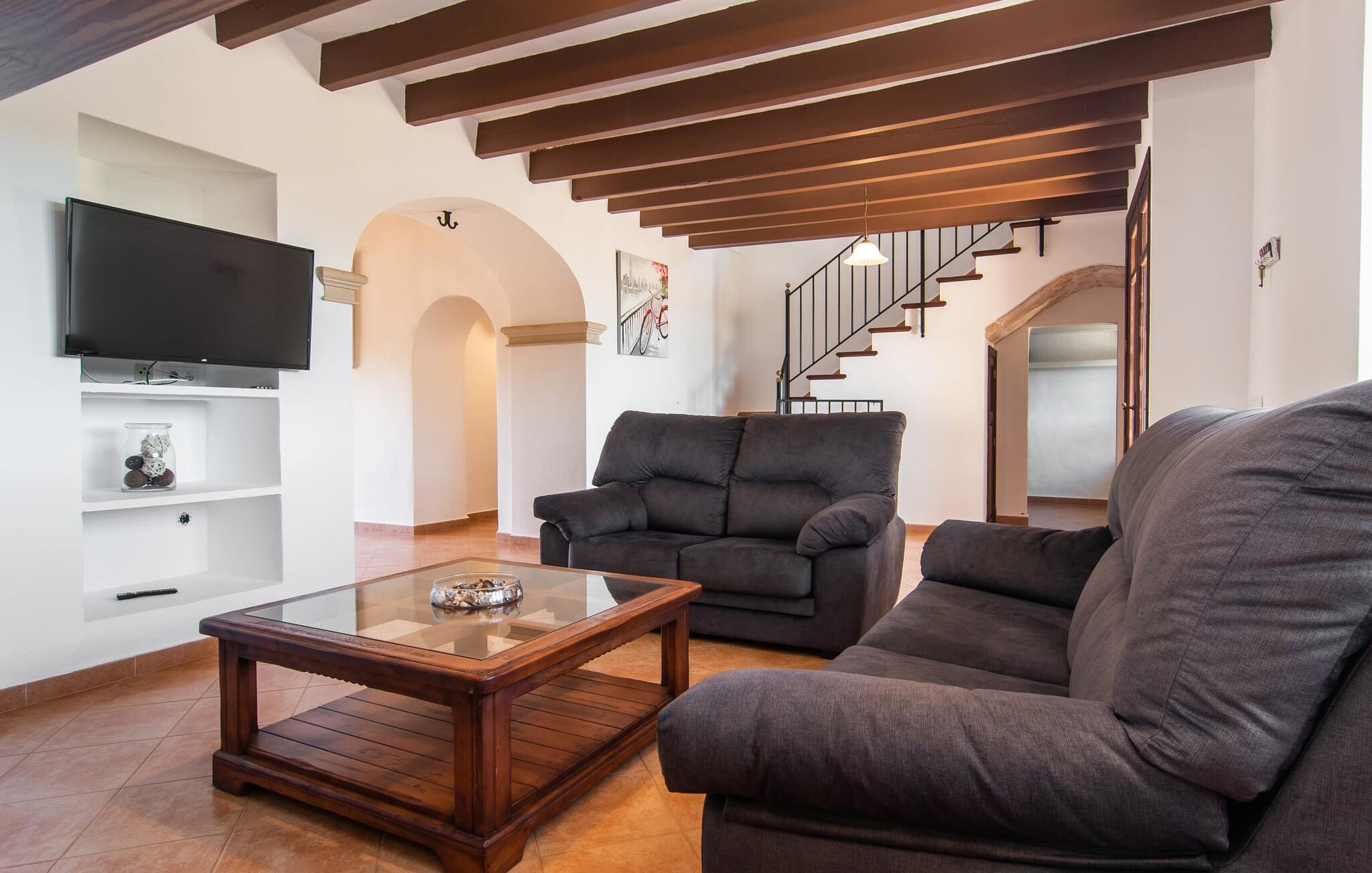Vidunderligt beskyttet mod udsigt og omgivet af hække, mure og masser af træer, er denne finca på det sydlige Mallorca en sand juvel. Hovedattraktionen ved den typiske middelhavsejendom er det rummelige poolområde, hvor der i midten er en 10 meter lang pool med smukke blå mosaikfliser, som nemt kan nås via en romersk trappe. På den omkringliggende solterrasse finder I indbydende steder under åben himmel eller under et lætag - så snup jeres badelagen, en bog og en lækker kold drink og god fornøjelse! Når I falder i søvn på en af de komfortable liggestole, har I måske allerede en idé eller to til aftensmaden. Og så ender I uundgåeligt ved det smukke udekøkken, som er installeret under tag foran poolen og udover grillen byder på en fantastisk spiseplads til aftenens grillsessioner. Flairen i det rummelige interiør, der strækker sig over stueetagen og første sal, er også typisk mallorcansk. Lyse vægge, synlige bjælkelofter og store gulvfliser skaber stilfulde rammer om de solide møbler, der sikrer en behagelig bolig. Stue, spiseplads og køkken smelter sammen i en halvåben planløsning - en arkitektur, der skaber en behagelig rumfølelse. Køkkenet byder på god plads og har ligesom spisepladsen direkte udgang til terrassen. Der er også et soveværelse og et badeværelse på denne stueplan. De andre to soveværelser og to badeværelser en suite er placeret ovenpå. Fincaen "Can Pere Xina" byder ikke kun på en stor portion komfort, men også plads, der giver mulighed for maksimalt privatliv. Stuehuset "Can Pere Xina" er smukt sydvendt i trekanten med Santanyi og S'Alqueria Blanca i den sydlige del af øen. Vejen, som af og til kan høres afhængigt af vindretningen, giver jer mulighed for hurtigt at nå forskellige destinationer. Der findes supermarkeder, bagerier og restauranter i de nærliggende landsbyer, hver kun 2,5 til 6 km væk. Strandene i Santanyi, Figuera og den berømte Es Trenc ligger kun 15 til 30 minutter væk i bil. Sørg for at besøge naturreservatet Mondragó, kun 2 km væk.