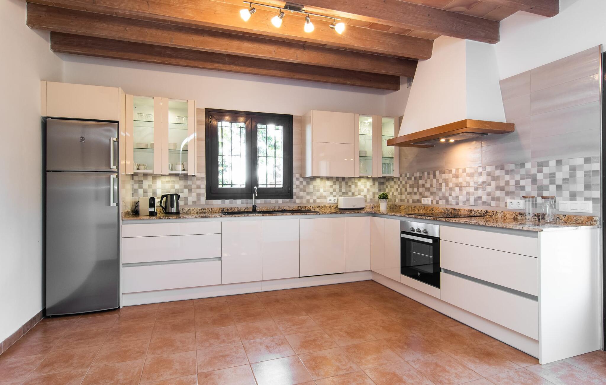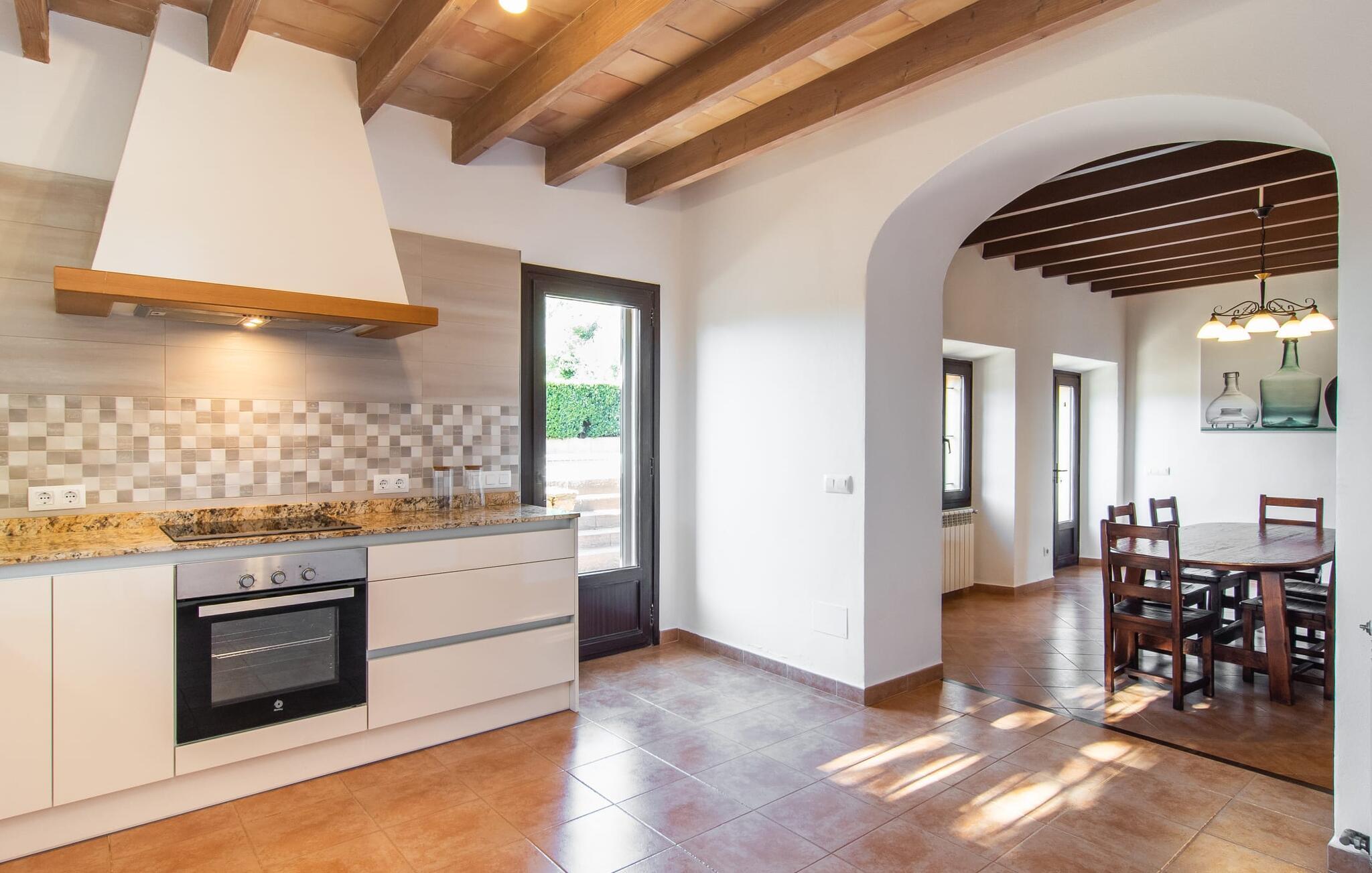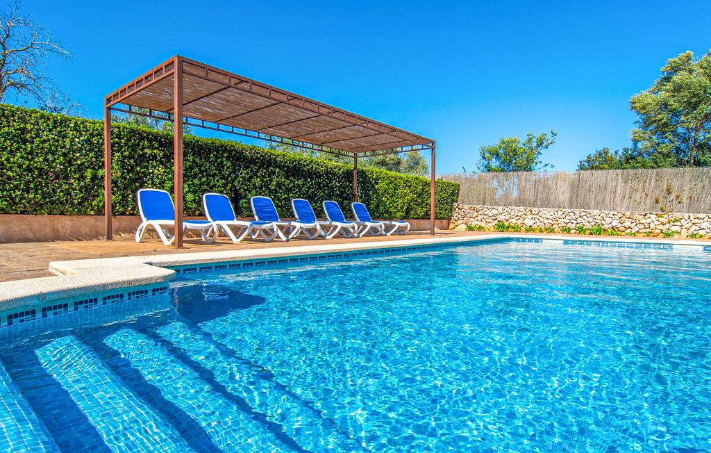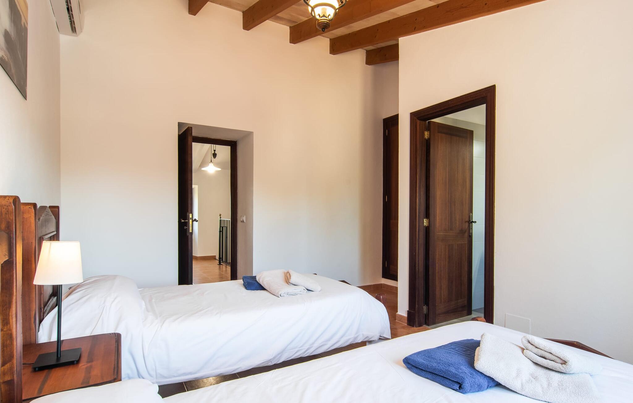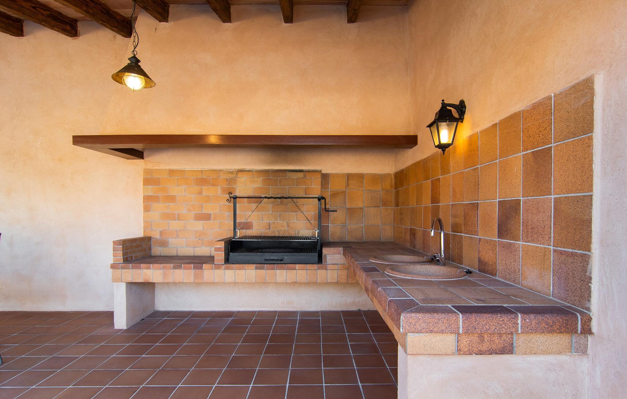 Vidunderligt beskyttet mod udsigt og omgivet af hække, mure og masser af træer, er denne finca på det sydlige Mallorca en sand juvel. Hovedattraktionen ved den typiske middelhavsejendom er det rummelige poolområde, hvor der i midten er en 10 meter lang pool med smukke blå mosaikfliser, som nemt kan nås via en romersk trappe. På den omkringliggende solterrasse finder I indbydende steder under åben himmel eller under et lætag - så snup jeres badelagen, en bog og en lækker kold drink og god fornøjelse! Når I falder i søvn på en af de komfortable liggestole, har I måske allerede en idé eller to til aftensmaden. Og så ender I uundgåeligt ved det smukke udekøkken, som er installeret under tag foran poolen og udover grillen byder på en fantastisk spiseplads til aftenens grillsessioner. Flairen i det rummelige interiør, der strækker sig over stueetagen og første sal, er også typisk mallorcansk. Lyse vægge, synlige bjælkelofter og store gulvfliser skaber stilfulde rammer om de solide møbler, der sikrer en behagelig bolig. Stue, spiseplads og køkken smelter sammen i en halvåben planløsning - en arkitektur, der skaber en behagelig rumfølelse. Køkkenet byder på god plads og har ligesom spisepladsen direkte udgang til terrassen. Der er også et soveværelse og et badeværelse på denne stueplan. De andre to soveværelser og to badeværelser en suite er placeret ovenpå. Fincaen "Can Pere Xina" byder ikke kun på en stor portion komfort, men også plads, der giver mulighed for maksimalt privatliv. Stuehuset "Can Pere Xina" er smukt sydvendt i trekanten med Santanyi og S'Alqueria Blanca i den sydlige del af øen. Vejen, som af og til kan høres afhængigt af vindretningen, giver jer mulighed for hurtigt at nå forskellige destinationer. Der findes supermarkeder, bagerier og restauranter i de nærliggende landsbyer, hver kun 2,5 til 6 km væk. Strandene i Santanyi, Figuera og den berømte Es Trenc ligger kun 15 til 30 minutter væk i bil. Sørg for at besøge naturreservatet Mondragó, kun 2 km væk.