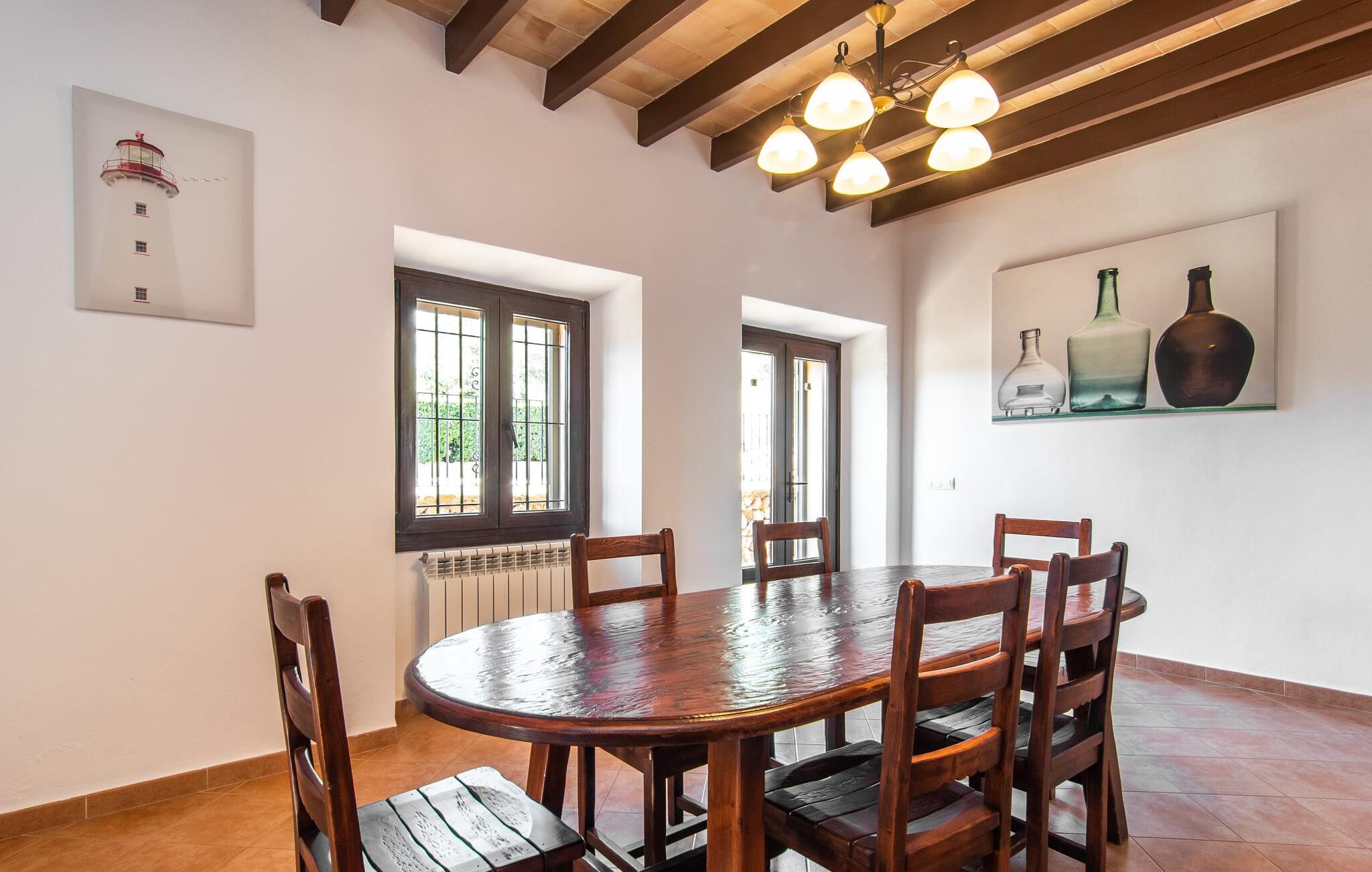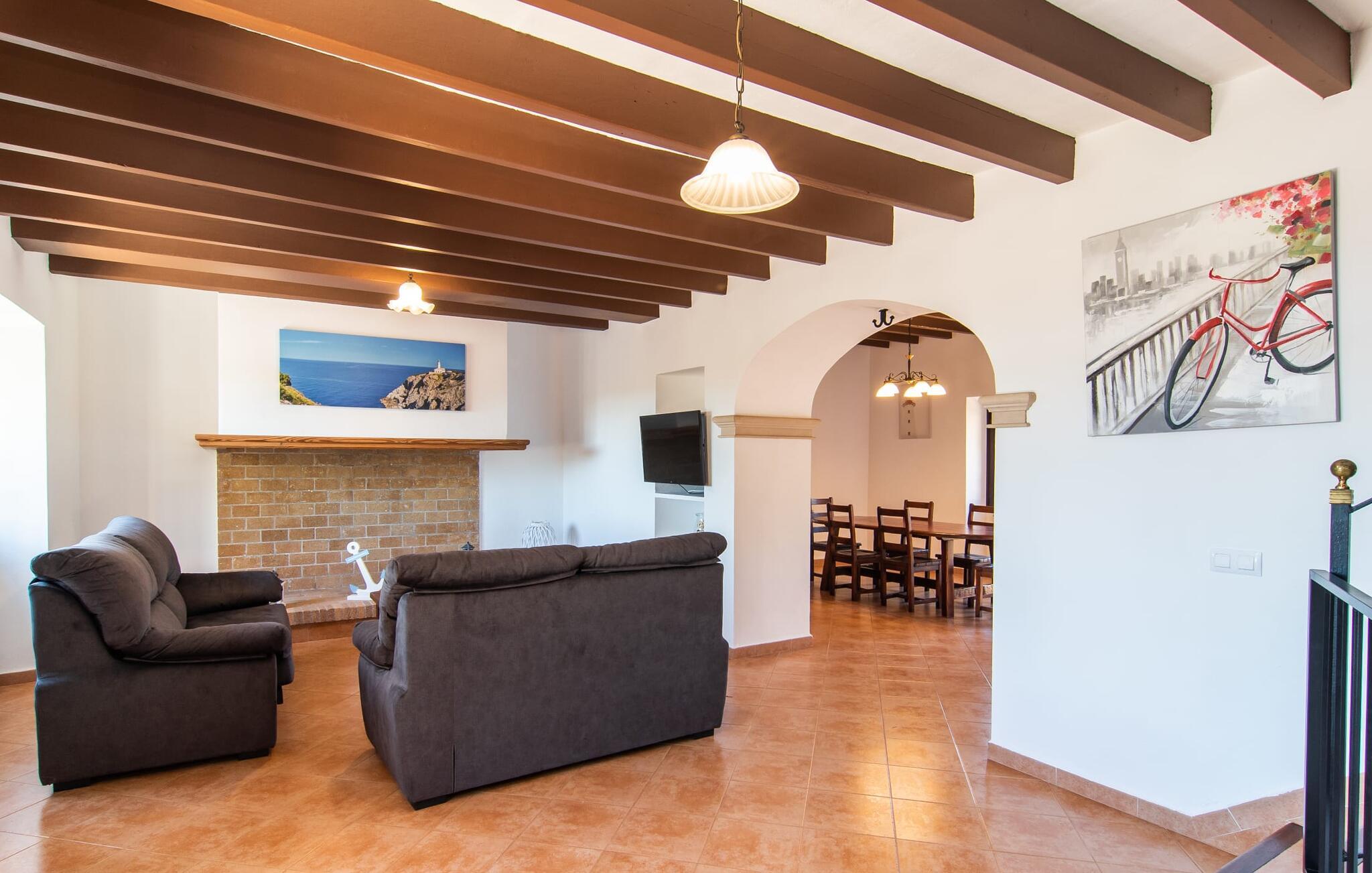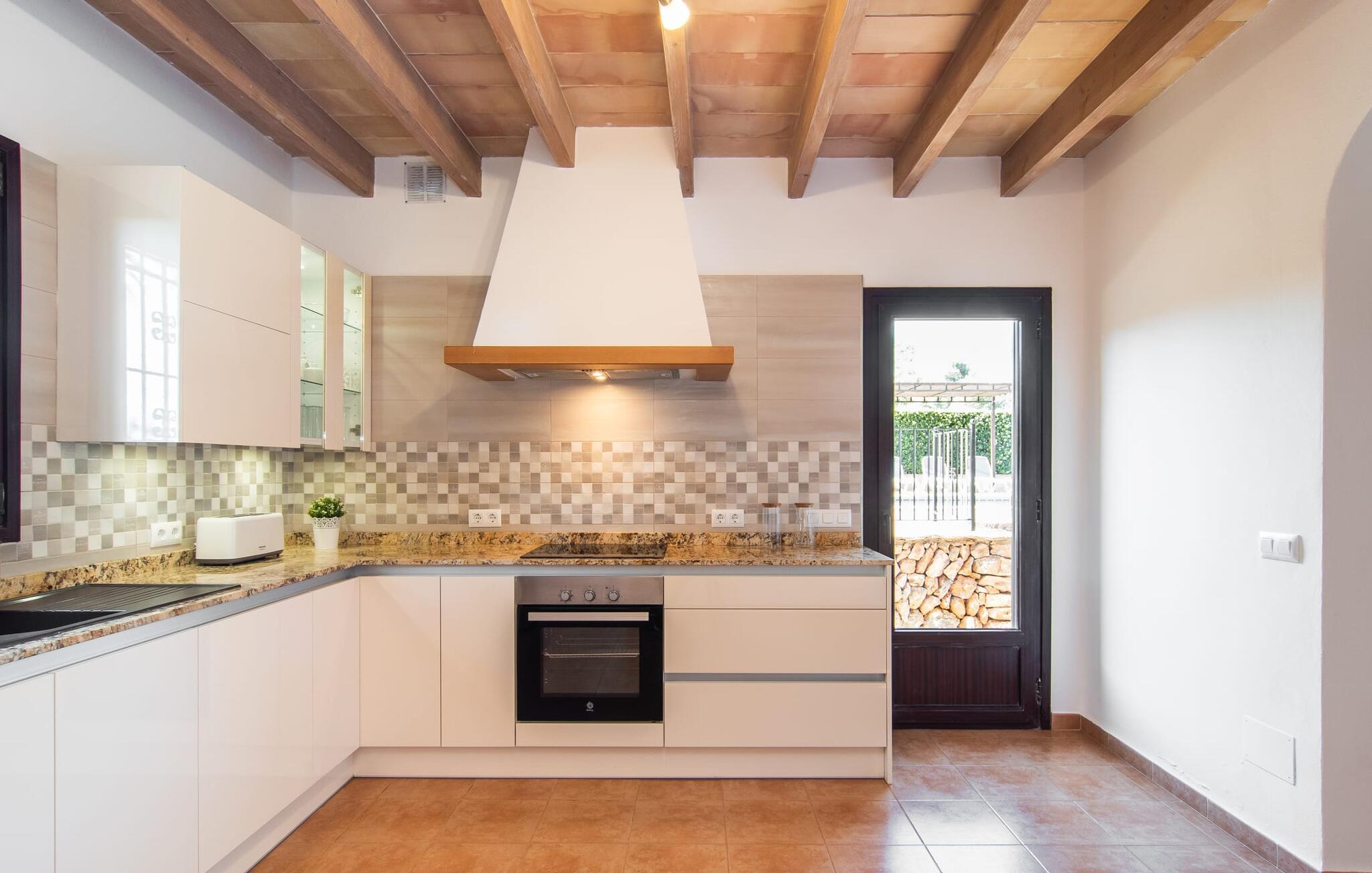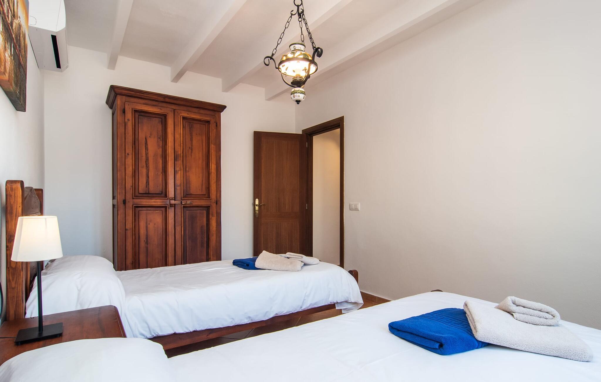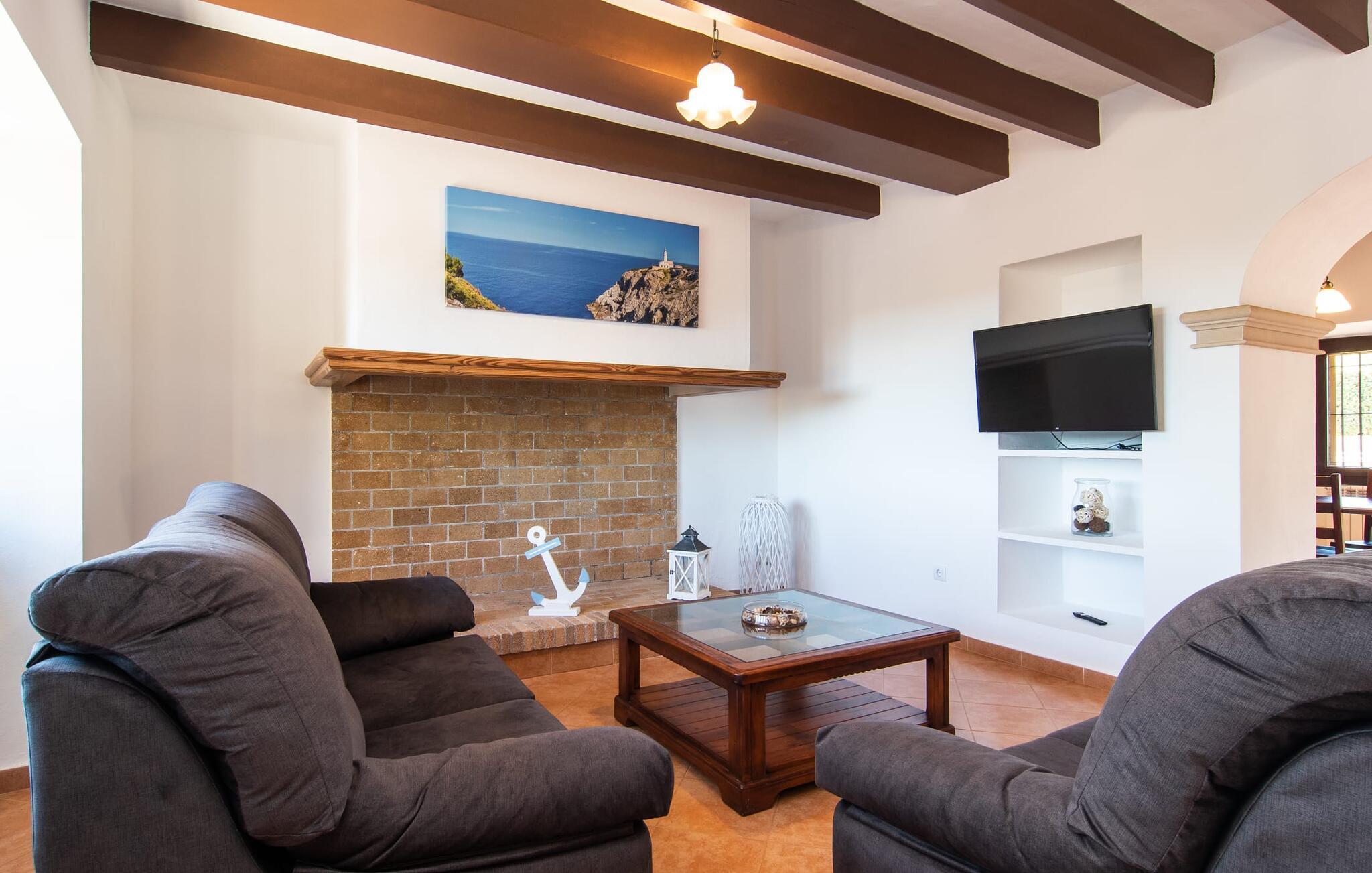Vidunderligt beskyttet mod udsigt og omgivet af hække, mure og masser af træer, er denne finca på det sydlige Mallorca en sand juvel. Hovedattraktionen ved den typiske middelhavsejendom er det rummelige poolområde, hvor der i midten er en 10 meter lang pool med smukke blå mosaikfliser, som nemt kan nås via en romersk trappe. På den omkringliggende solterrasse finder I indbydende steder under åben himmel eller under et lætag - så snup jeres badelagen, en bog og en lækker kold drink og god fornøjelse! Når I falder i søvn på en af de komfortable liggestole, har I måske allerede en idé eller to til aftensmaden. Og så ender I uundgåeligt ved det smukke udekøkken, som er installeret under tag foran poolen og udover grillen byder på en fantastisk spiseplads til aftenens grillsessioner. Flairen i det rummelige interiør, der strækker sig over stueetagen og første sal, er også typisk mallorcansk. Lyse vægge, synlige bjælkelofter og store gulvfliser skaber stilfulde rammer om de solide møbler, der sikrer en behagelig bolig. Stue, spiseplads og køkken smelter sammen i en halvåben planløsning - en arkitektur, der skaber en behagelig rumfølelse. Køkkenet byder på god plads og har ligesom spisepladsen direkte udgang til terrassen. Der er også et soveværelse og et badeværelse på denne stueplan. De andre to soveværelser og to badeværelser en suite er placeret ovenpå. Fincaen "Can Pere Xina" byder ikke kun på en stor portion komfort, men også plads, der giver mulighed for maksimalt privatliv. Stuehuset "Can Pere Xina" er smukt sydvendt i trekanten med Santanyi og S'Alqueria Blanca i den sydlige del af øen. Vejen, som af og til kan høres afhængigt af vindretningen, giver jer mulighed for hurtigt at nå forskellige destinationer. Der findes supermarkeder, bagerier og restauranter i de nærliggende landsbyer, hver kun 2,5 til 6 km væk. Strandene i Santanyi, Figuera og den berømte Es Trenc ligger kun 15 til 30 minutter væk i bil. Sørg for at besøge naturreservatet Mondragó, kun 2 km væk.