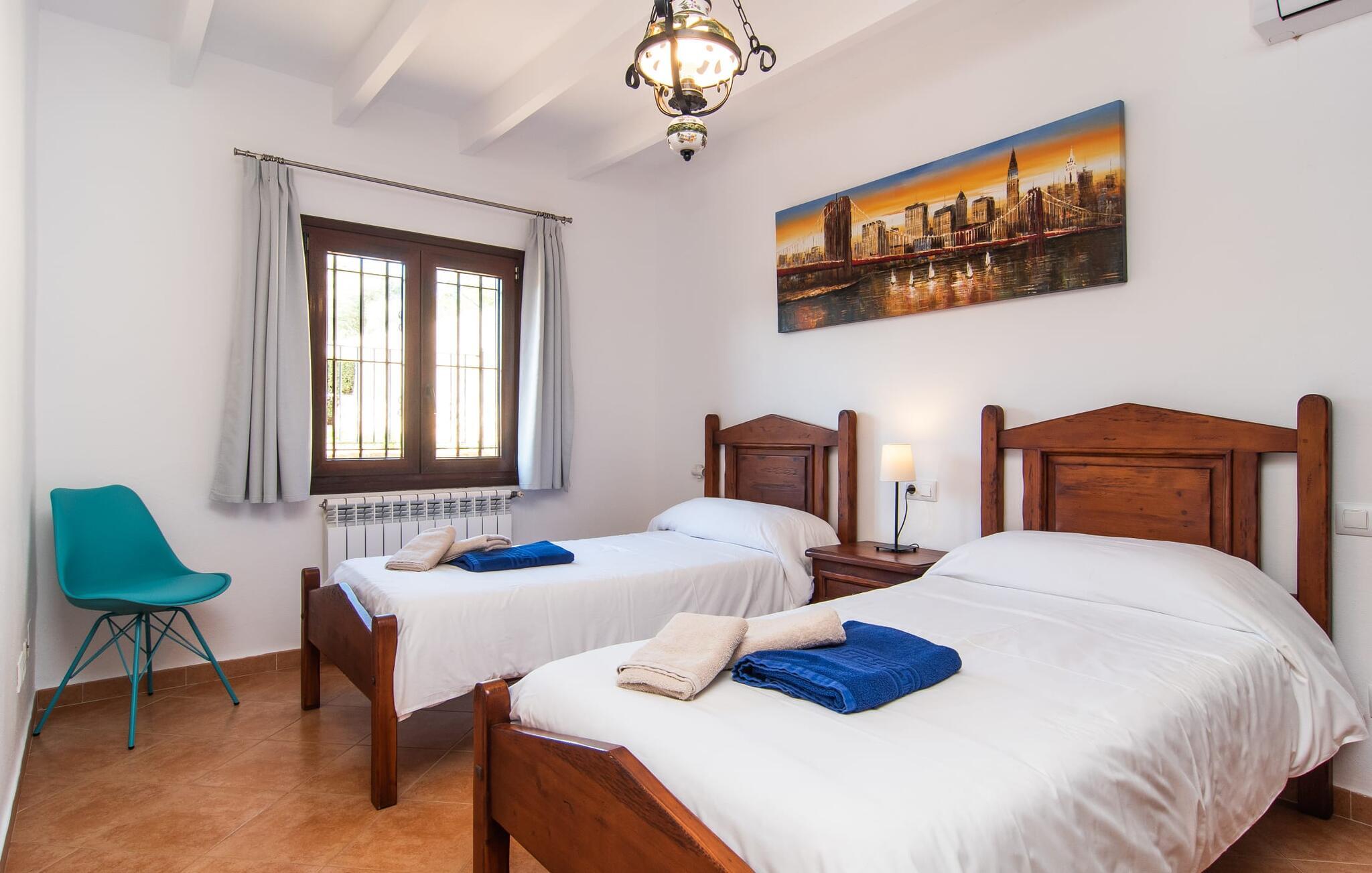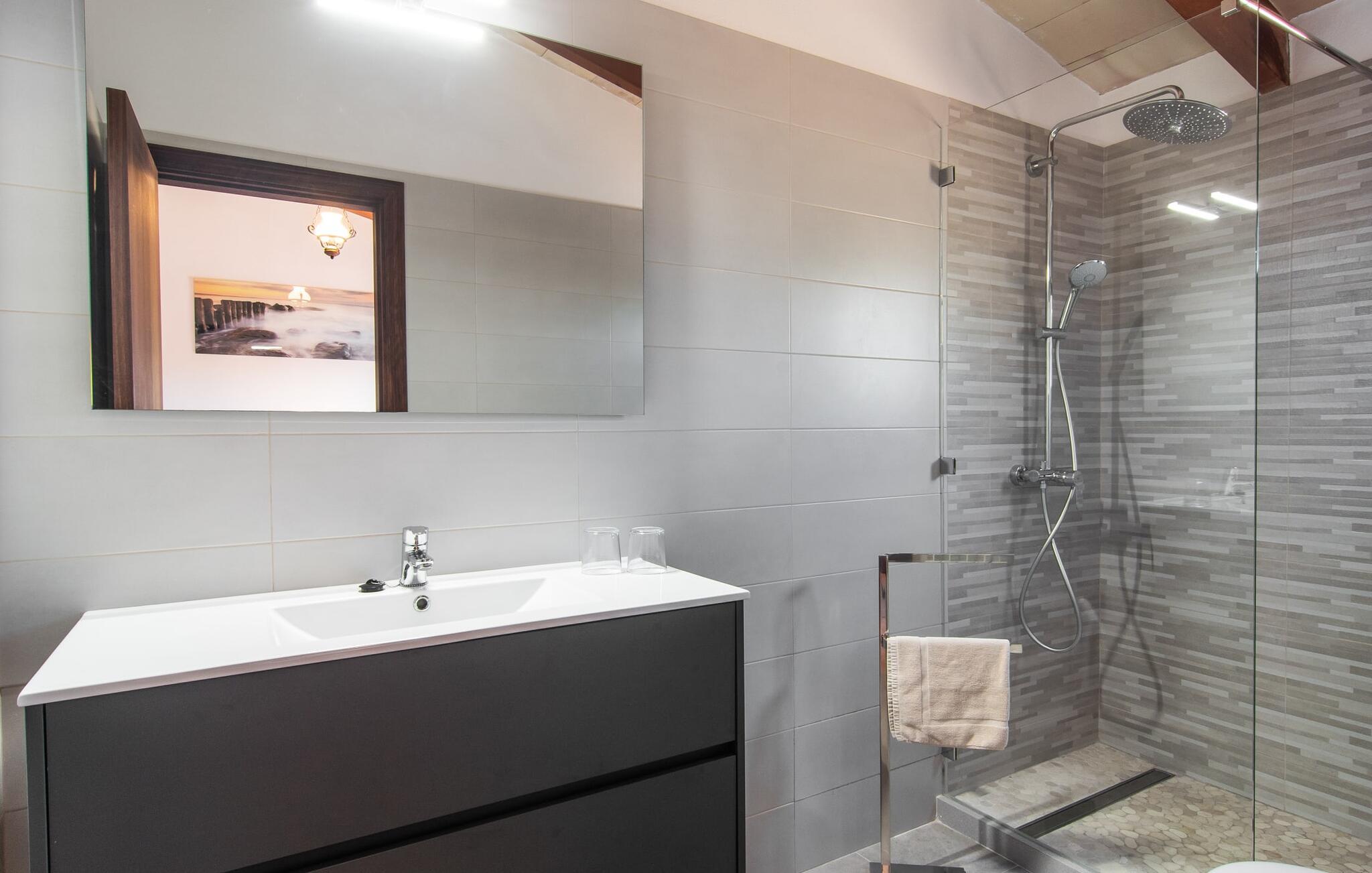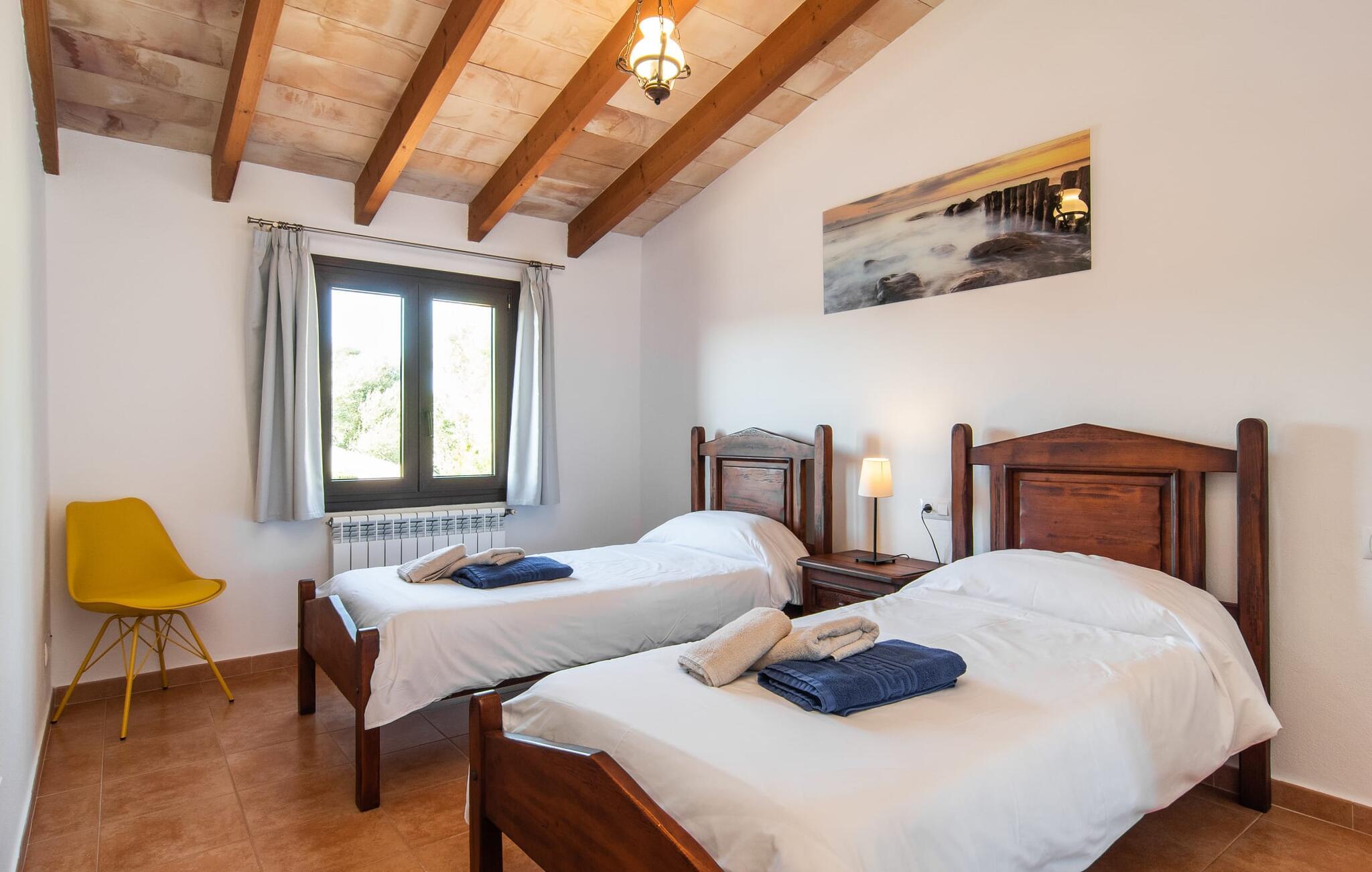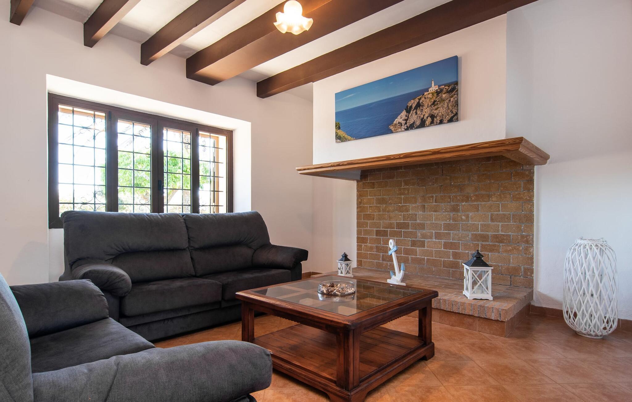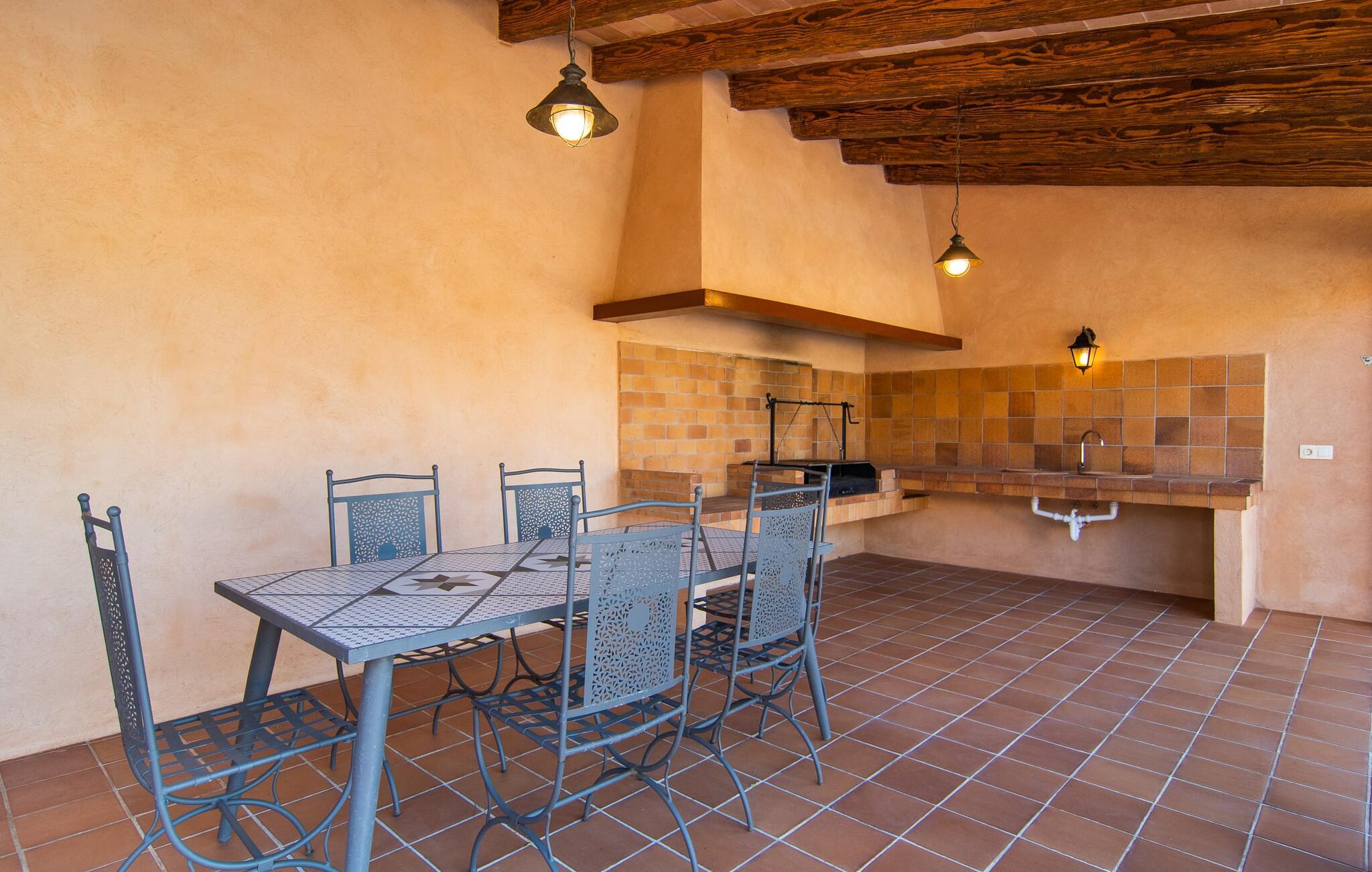 Vidunderligt beskyttet mod udsigt og omgivet af hække, mure og masser af træer, er denne finca på det sydlige Mallorca en sand juvel. Hovedattraktionen ved den typiske middelhavsejendom er det rummelige poolområde, hvor der i midten er en 10 meter lang pool med smukke blå mosaikfliser, som nemt kan nås via en romersk trappe. På den omkringliggende solterrasse finder I indbydende steder under åben himmel eller under et lætag - så snup jeres badelagen, en bog og en lækker kold drink og god fornøjelse! Når I falder i søvn på en af de komfortable liggestole, har I måske allerede en idé eller to til aftensmaden. Og så ender I uundgåeligt ved det smukke udekøkken, som er installeret under tag foran poolen og udover grillen byder på en fantastisk spiseplads til aftenens grillsessioner. Flairen i det rummelige interiør, der strækker sig over stueetagen og første sal, er også typisk mallorcansk. Lyse vægge, synlige bjælkelofter og store gulvfliser skaber stilfulde rammer om de solide møbler, der sikrer en behagelig bolig. Stue, spiseplads og køkken smelter sammen i en halvåben planløsning - en arkitektur, der skaber en behagelig rumfølelse. Køkkenet byder på god plads og har ligesom spisepladsen direkte udgang til terrassen. Der er også et soveværelse og et badeværelse på denne stueplan. De andre to soveværelser og to badeværelser en suite er placeret ovenpå. Fincaen "Can Pere Xina" byder ikke kun på en stor portion komfort, men også plads, der giver mulighed for maksimalt privatliv. Stuehuset "Can Pere Xina" er smukt sydvendt i trekanten med Santanyi og S'Alqueria Blanca i den sydlige del af øen. Vejen, som af og til kan høres afhængigt af vindretningen, giver jer mulighed for hurtigt at nå forskellige destinationer. Der findes supermarkeder, bagerier og restauranter i de nærliggende landsbyer, hver kun 2,5 til 6 km væk. Strandene i Santanyi, Figuera og den berømte Es Trenc ligger kun 15 til 30 minutter væk i bil. Sørg for at besøge naturreservatet Mondragó, kun 2 km væk.