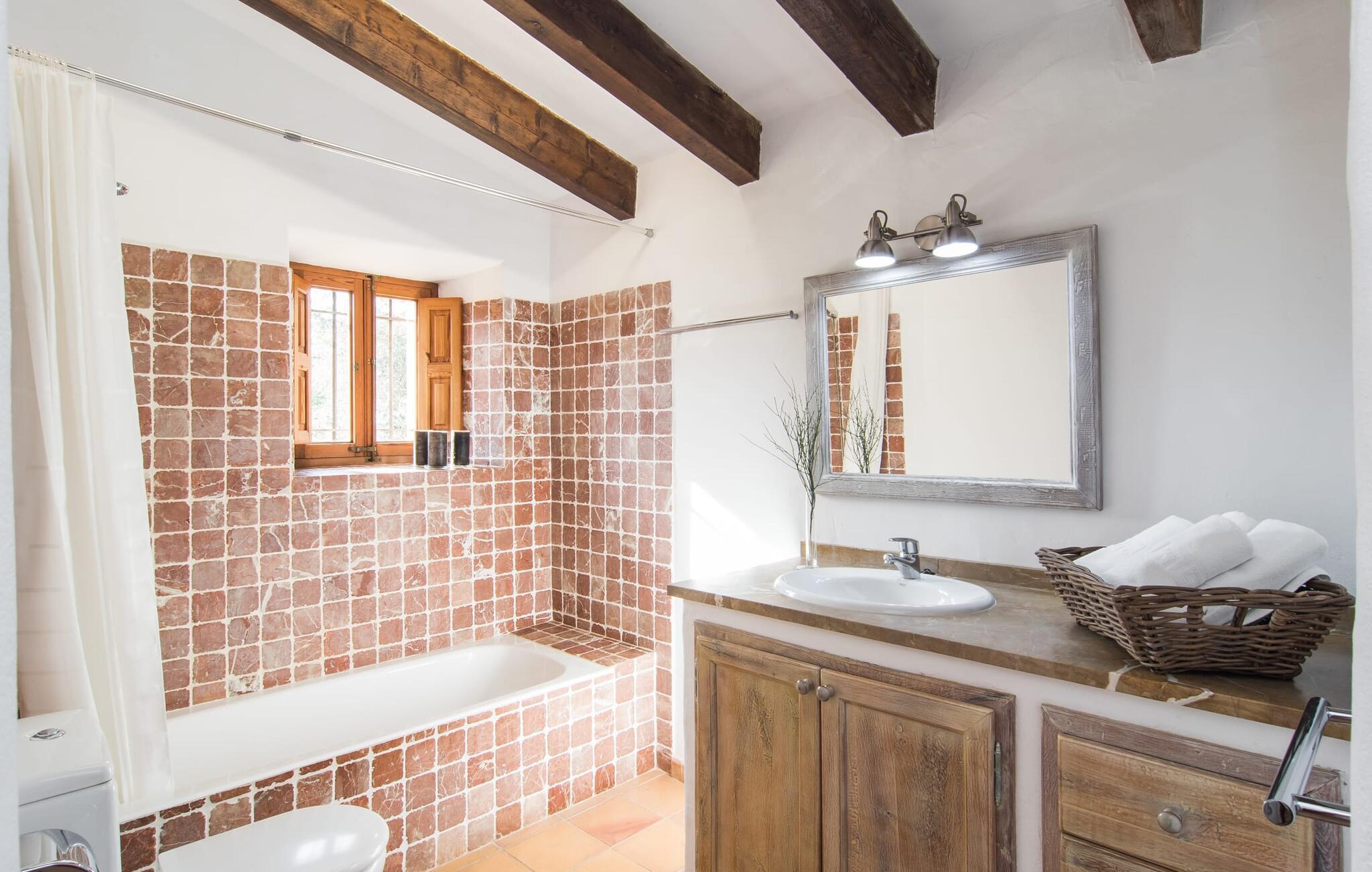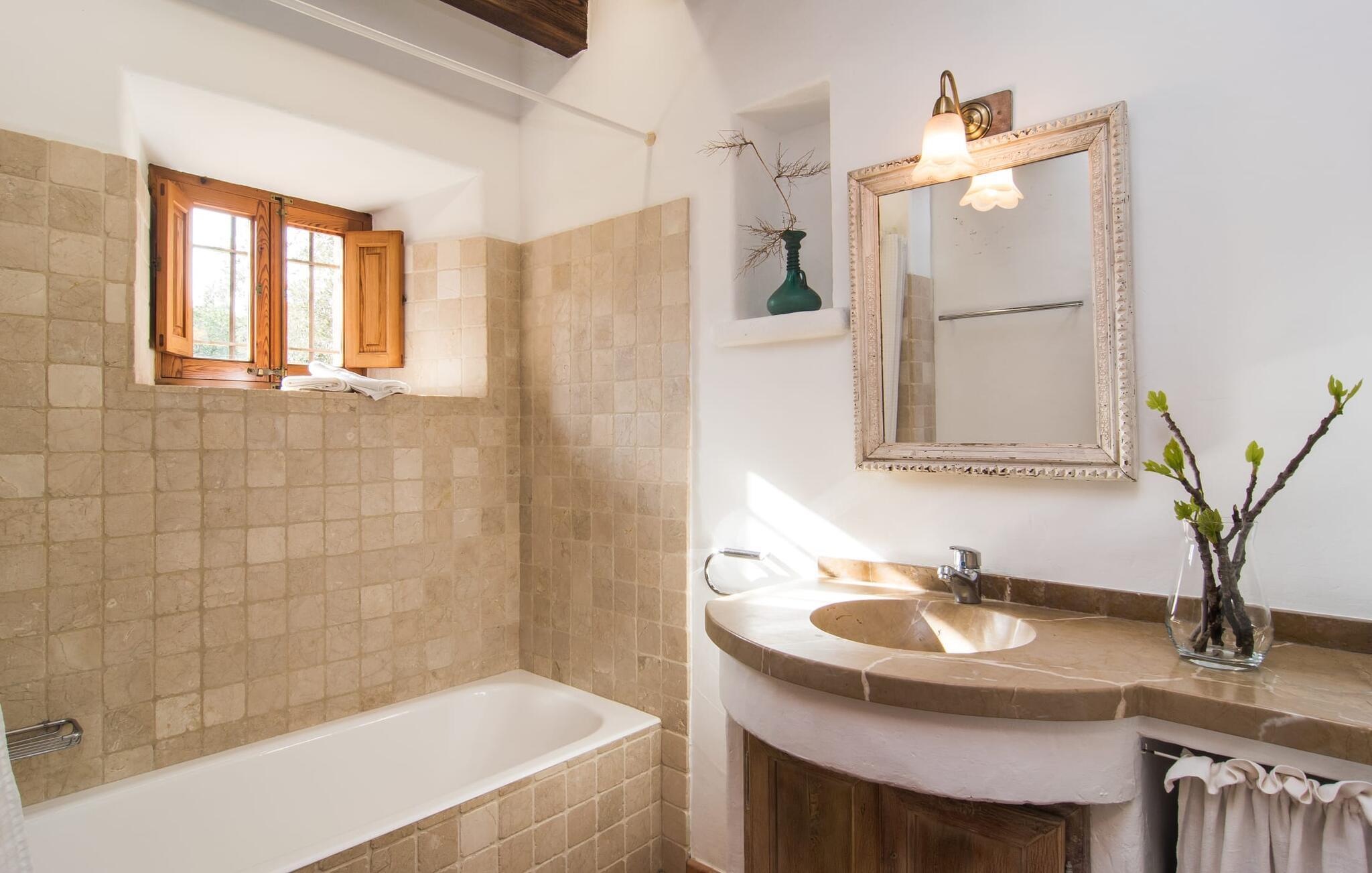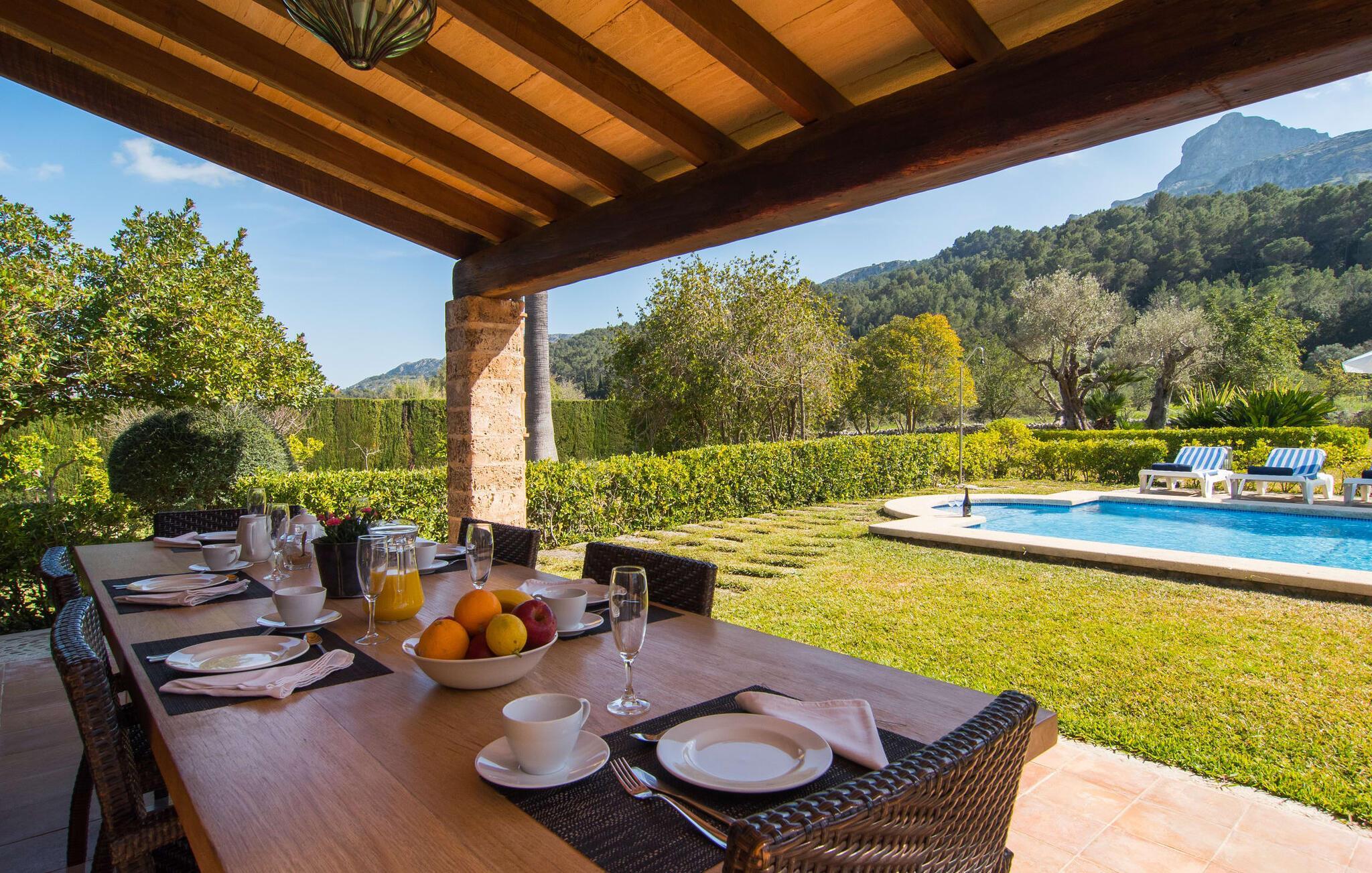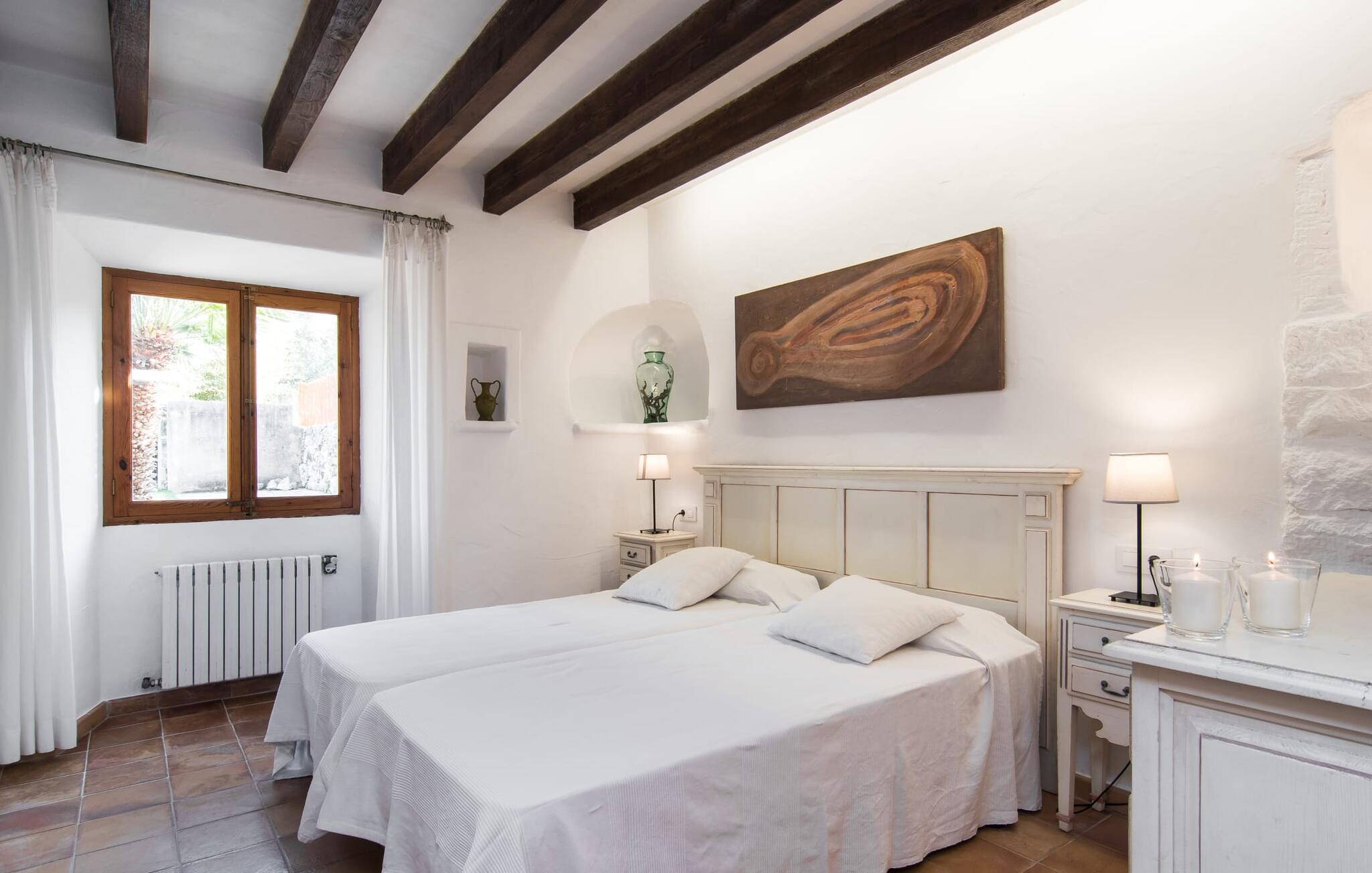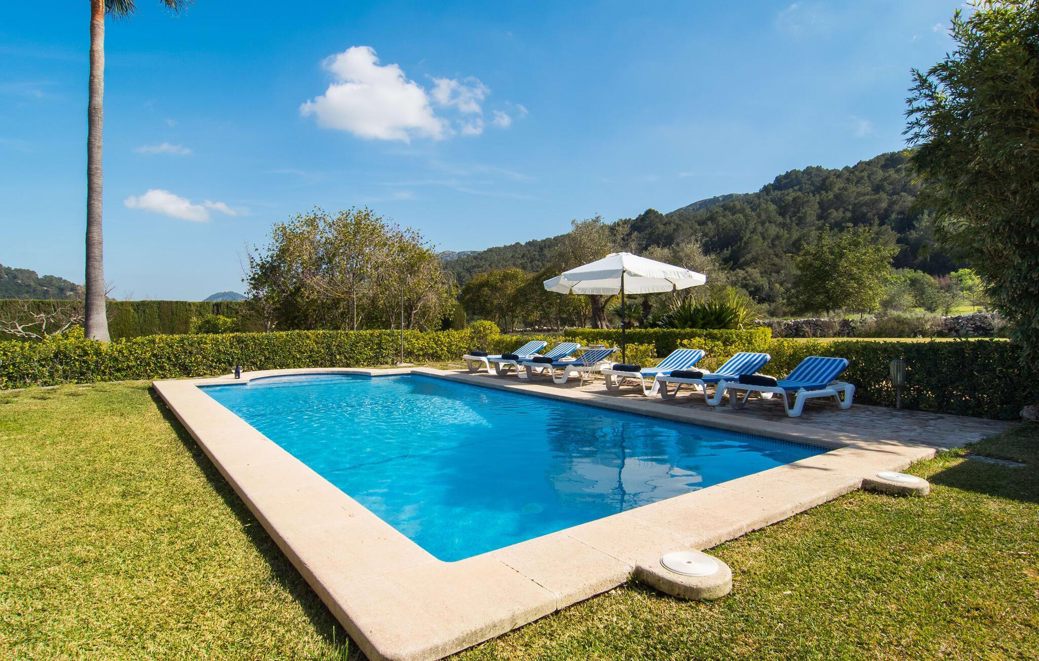 Denne bondegård i den nordlige del af Mallorca er en sand perle og venter på op til otte feriegæster, der ønsker at tilbringe en dejlig tid i en rolig atmosfære. Omgivelserne kunne næsten ikke være mere maleriske: i det fjerne de imponerende Tramuntana-bjerge, omkring ejendommen er der en grøn slette med enge, marker og mange gamle træer - ren idyl! Dette fortsætter harmonisk på fincaens egen ejendom, som er dekorativt omsluttet af stengærder og hække: Her veksler græsplæner og terrassearealer, og middelhavsplanter liver med held helhedsbilledet op. Behageligt tæt på huset indbyder poolen, som nemt kan nås via romerske trappetrin, til at køle af, plaske rundt og svømme og selvfølgelig er der en praktisk udendørs bruser. Komfortable liggestole er tilgængelige til solbadning - og til at sidde er der den overdækkede terrasse med et loungeområde og spisebord med udsigt over poolområdet, haven og bjerget i baggrunden. På den modsatte side af huset giver et andet stort terrasseområde mulighed for at sidde al fresco eller bruge de vidunderlige udendørs køkken muligheder til at forberede og nyde dine ferie delikatesser al fresco. En velholdt, indbydende lys landstedsstemning præger interiøret i "Can Peric". Lige ved siden af terrassen er der en hyggelig, delvist muret opholdsstue med komfortable sofaer, et fjernsyn og en hyggelig pejs. Et par trin fører til det traditionelt anlagte gulv med natursten omkring den gamle, oprindeligt oplyste møllesten, som er et vidne om husets historie og et enestående blikfang. Du kan spise indendørs ved det tilstødende spisebord i den rustikke atmosfære af naturstensvæggene. Det fuldt udstyrede køkken er bekvemt lige rundt om hjørnet. På denne stueplan er der også et soveværelse med dobbeltseng og et badeværelse. På øverste etage er der to dobbeltværelser med dobbeltsenge, et soveværelse med to enkeltsenge og to badeværelser. Alle soveværelser skaber en meget hyggelig atmosfære med lyse farver og masser af træ - den bedste forudsætning for at tilbringe hyggelige nætter i dette rolige område. Dette skønne feriehus på Mallorca, som ligger ca. 8 km vest for den maleriske by Pollenca, scorer ikke kun point med sin vidunderligt smukke, rolige beliggenhed. Du kan gøre dine daglige indkøb i landsbyen. Den indbydende strand Platja de Port de Pollença ligger omkring 11 km væk, og den populære by Alcúdia kan nås på lidt over 20 minutter med udlejningsbil. Dette er et Fincallorca feriehus.