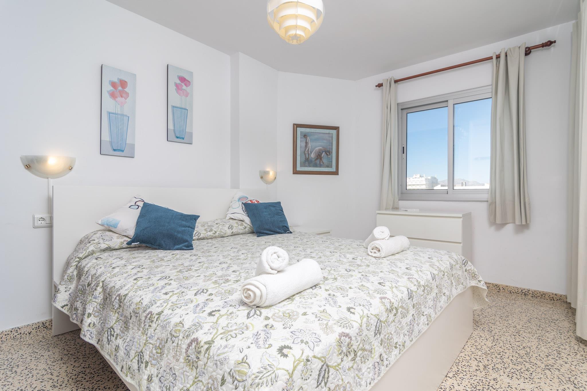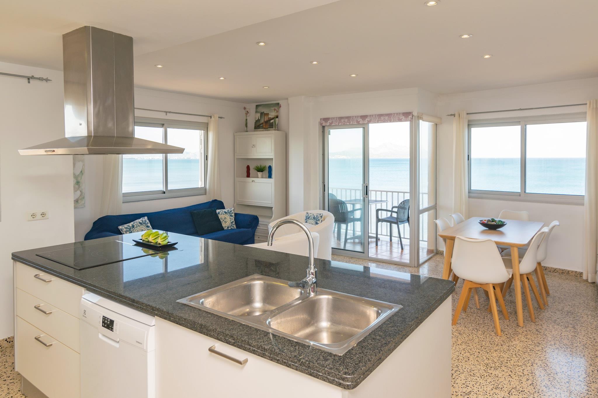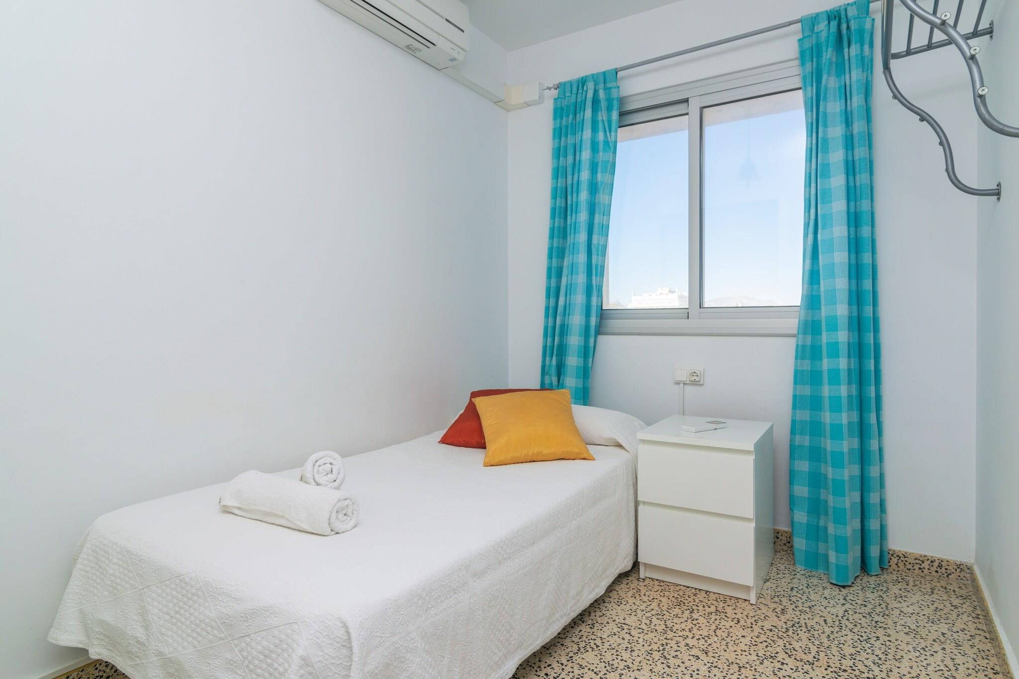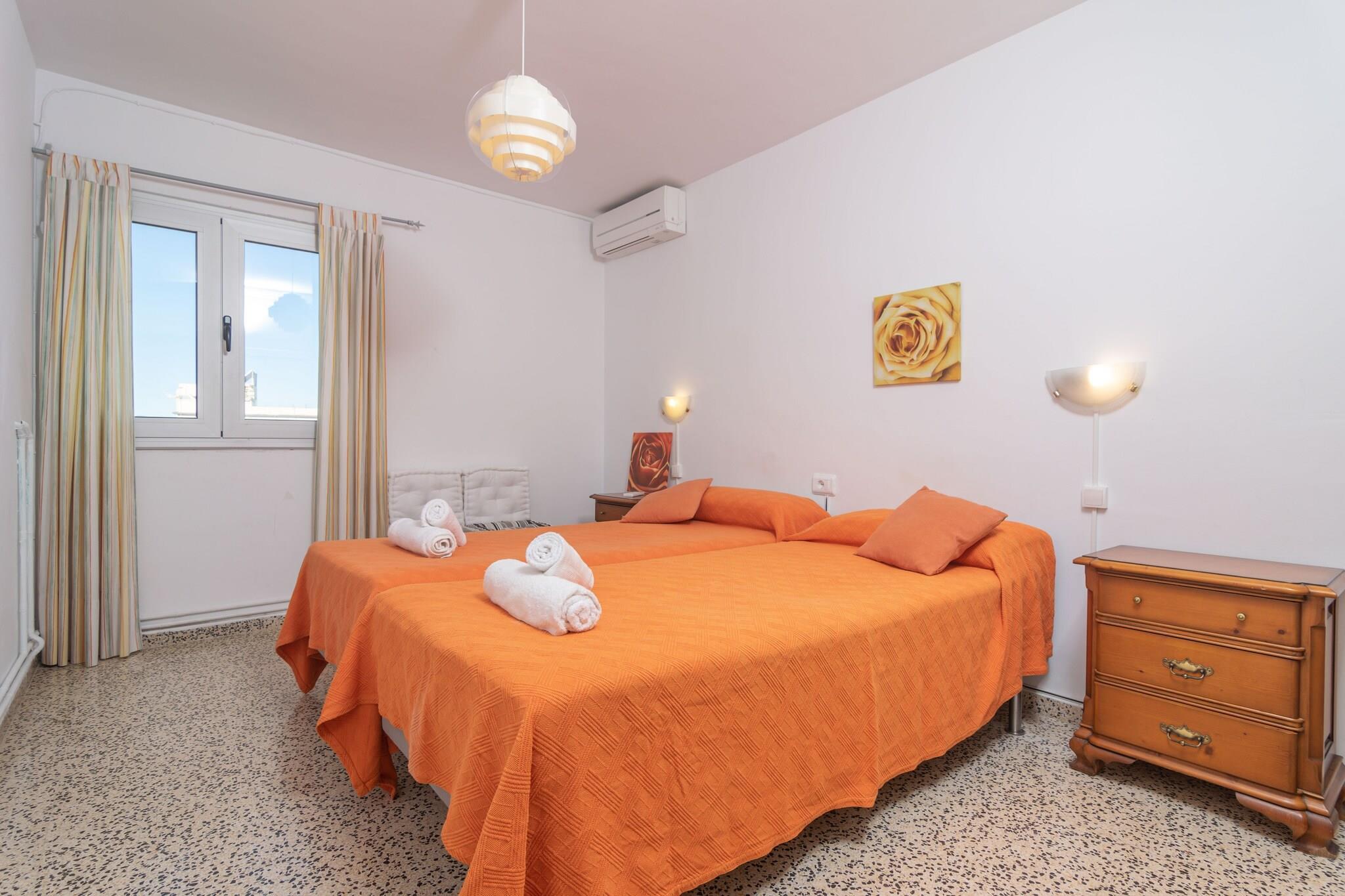 Hovedterrassen er det ideelle sted at slappe af og nyde den forfriskende havbrise efter en dag på stranden. Det er møbleret med et bord og stole, perfekt til udendørs måltider, mens du nyder en uovertruffen udsigt over kysten. Uanset om du spiser eller bare slapper af, tilbyder dette sted et fredeligt tilflugtssted med frisk luft og en fantastisk natur. Denne lejlighed på fjerde sal, som er tilgængelig med elevator, har et rummeligt opholds-/spisestue-køkkenområde udstyret med aircondition, satellit-tv og en keramisk kogeplade. Der er tre soveværelser, alle med aircondition: et med dobbeltseng og adgang til en anden terrasse, et andet med to enkeltsenge og et tredje med en enkeltseng. Indkvarteringen omfatter et badeværelse med badekar, vaskemaskine, strygejern og strygebræt. Familier, der rejser med babyer, kan anmode om en barneseng og høj stol for ekstra bekvemmelighed. Lejligheden ligger i hjertet af Can Picafort og tilbyder nem adgang til butikker, supermarkeder og restauranter. Det bedste af det hele er, at den smukke strand med krystalklart vand og gyldent sand ligger kun få skridt væk. I nærheden finder du den vidunderlige Capellans-strand og offentlige transportforbindelser til andre fantastiske steder som Playa de Muro og den charmerende gamle bydel i Alcúdia.