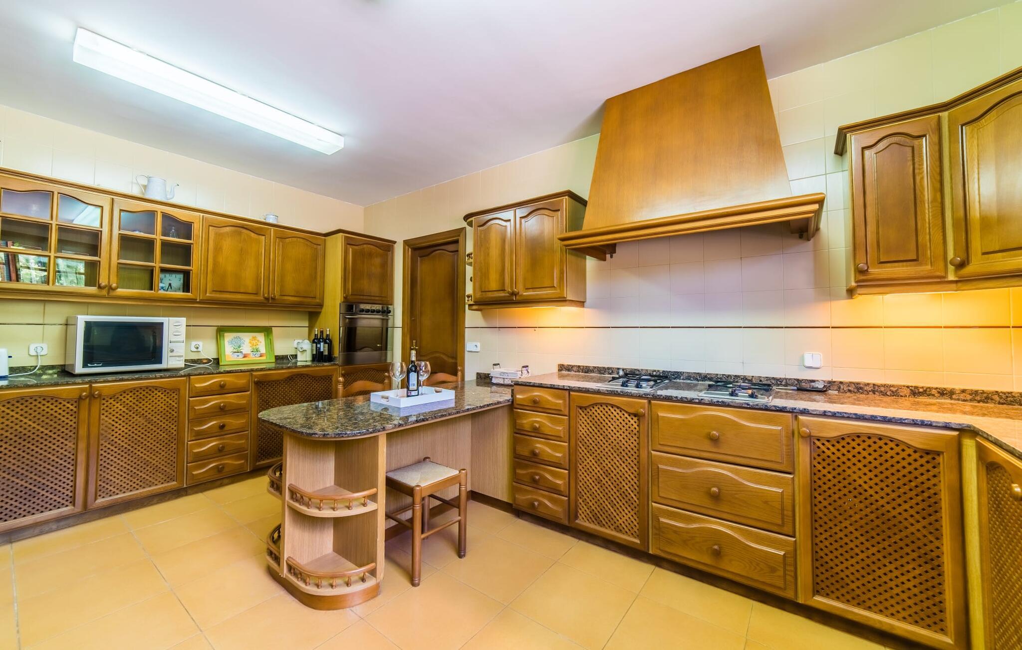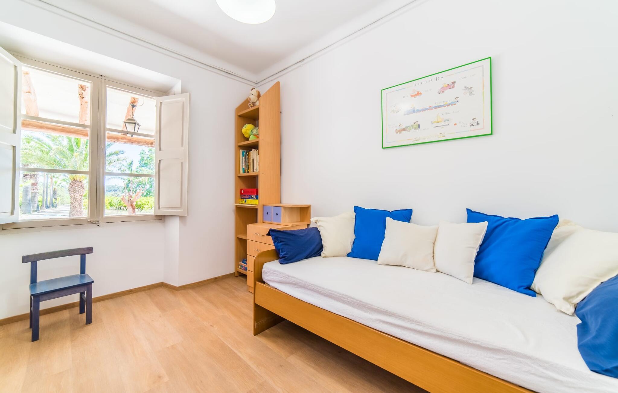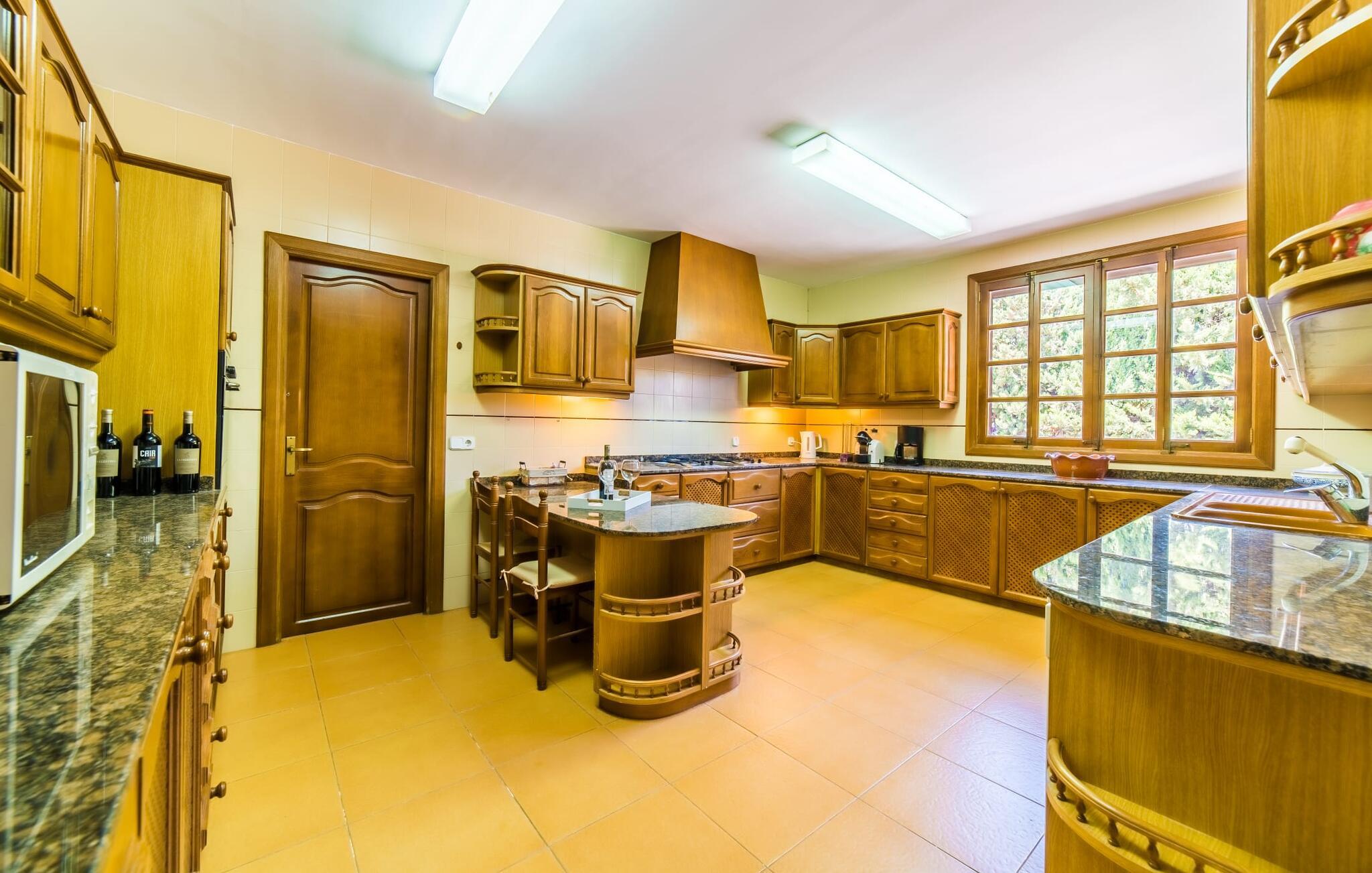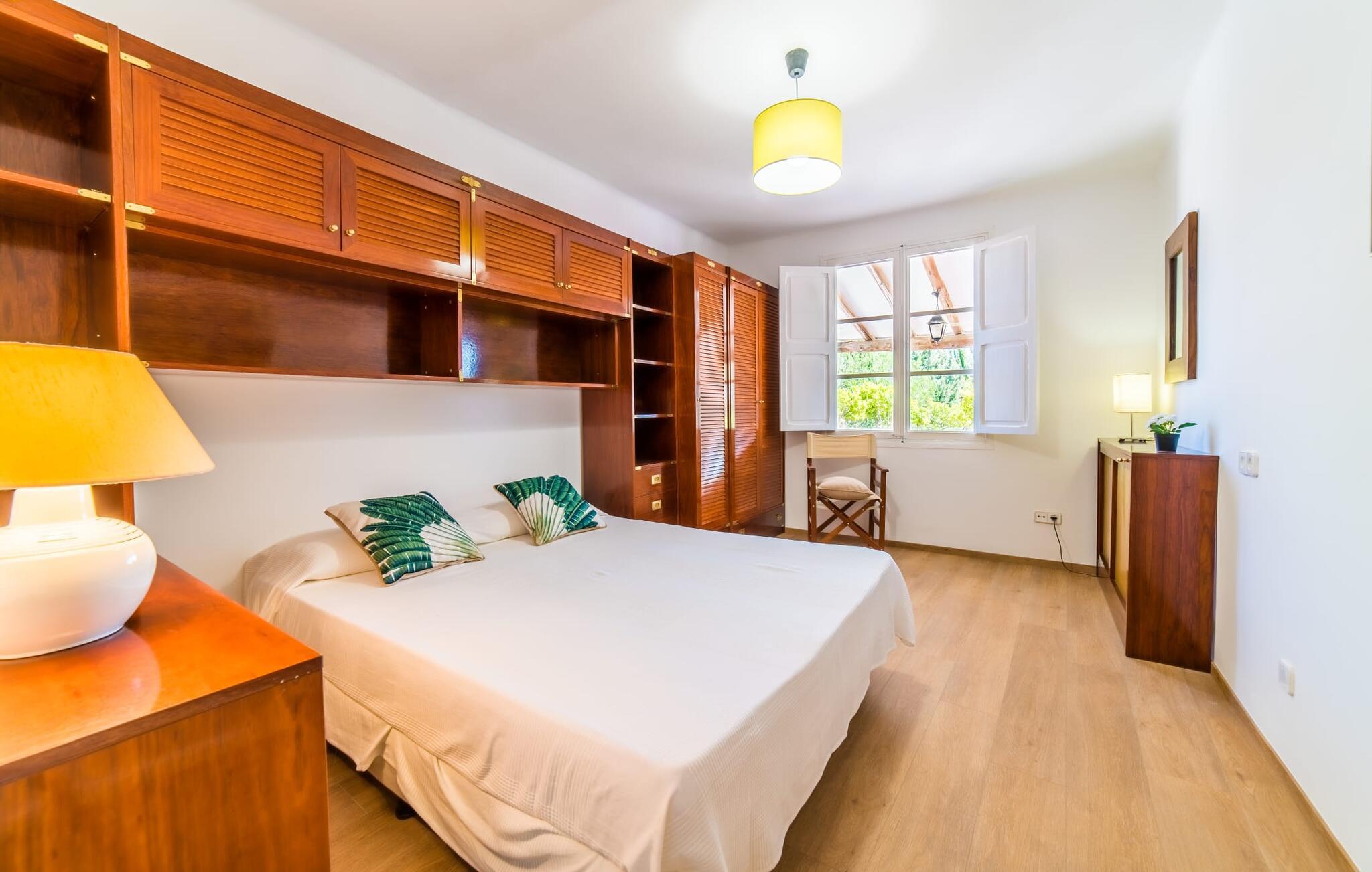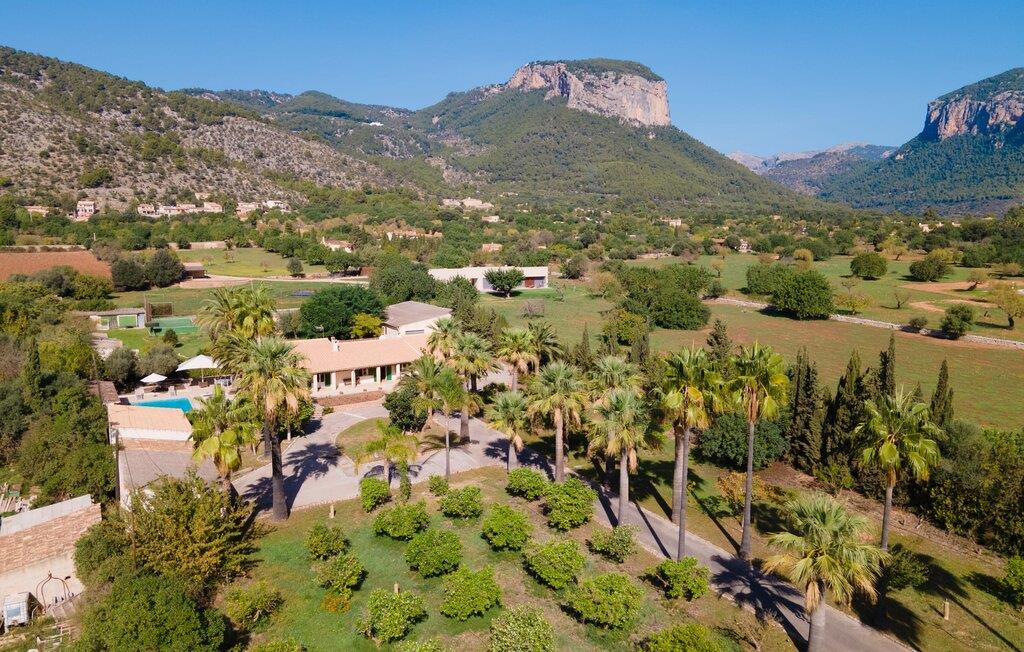 Hvis I har valgt denne familievenlige villa, viser du, at I ved, hvad I skal kigge efter i et sommerhus på denne ø: Bungalowvillaen “Can Renou” byder på meget at lave og ligger i en stille dal på sydskråningerne af Tramuntana-bjergene rejser sig som stenvagter, kun få minutters gang fra den lille brostensbelagte by Alaró. En imponerende indkørsel fører jer direkte til parkeringspladsen. Den store grund med mægtige palmer og knudrede oliventræer har alt at byde på; Der er noget for enhver aldersgruppe: en pool (med udendørs bruser og toilet), en legeplads for de mindste, en velholdt tennisbane og et bordtennisbord under et fortelt afrunder det virkelig omfattende udbud af fritidsaktiviteter . Hvis I overvejer at grille en sport, vil I (og alle andre) blive glade for at vide, at der også er en indbygget grill. Med så meget på tilbud kan ingen sige, at de blev udeladt denne gang. Når I har fået nok af sjov og leg, kan I finde en liggestol på en af de mange terrasser - udendørs og overdækkede - ved poolen og rundt om huset eller gå en tur og gå på opdagelse i ejendommen. Det bliver superhyggeligt i stuen: dybblå to-personers sofaer og fløjstole inviterer til at se tv eller læse en god bog, palmerne kigger gennem terrassedøren og den lukkede pejs har mistet sine knitrende flammer til levende lys. I det rustikke køkken med hjørnekabine, mikroovn og opvaskemaskine kan I lave mad til en hel hær eller hyre dem til at hjælpe med at lave mad - I skal bare passe på, at de ikke løber væk, efter at vinen er fjernet. Væk fra den lange gang, hvor mange gamle skatte er udstillet, er der nogle få soveværelser og badeværelser - nogle mennesker (bedstemor, bedstefar, snorkere, singler og unge voksne) vil være glade for, at der er to komfortable enkeltværelser til rådighed. For resten af gruppen er der tre dobbeltsenge (1,5 x 2 m) og to enkeltsenge til rådighed; Det en-suite badeværelse med hvide skabe og spabadet vil selvfølgelig være meget attråværdigt, men de to andre moderne badeværelser har også meget at byde på: Håndklædevarmere, regnbruser og brusekabiner til trætte vandrere og mere svedige (bord). ) tennisproffer. Og selvfølgelig for dem, der ønsker at tilbringe en aften i klubberne i Palma. En familievenlig villa med en betagende beliggenhed: "Can Renou" ligger kun få minutters gang fra den smukke skomagerlandsby Alaró og det nærmeste supermarked. Selvom I kun er omkring en halv time væk fra Palmas seværdigheder, er I næsten i bjergene. Der er kun 10 km til vandreparadiset omkring Orienten, og den traditionelle læder- og vinby Inca er ideel til længere shoppingture. I kan finde sand og hav på strandene i hovedstaden, eller prøve Alcúdia-bugten (ca. 40 km). Bemærk venligst, at denne ejendom ikke accepterer ungdomsgrupper eller polterabender. En ungdomsgruppe på denne ejendom består af personer under 30 år. Book ikke denne ejendom, hvis I er en ungdomsgruppe eller polterabend, da jeres reservation vil blive afvist, når den er booket, hvilket også kan være tilfældet ved ankomst til ejendommen eller under jeres ophold, og I vil ikke modtage en refusion