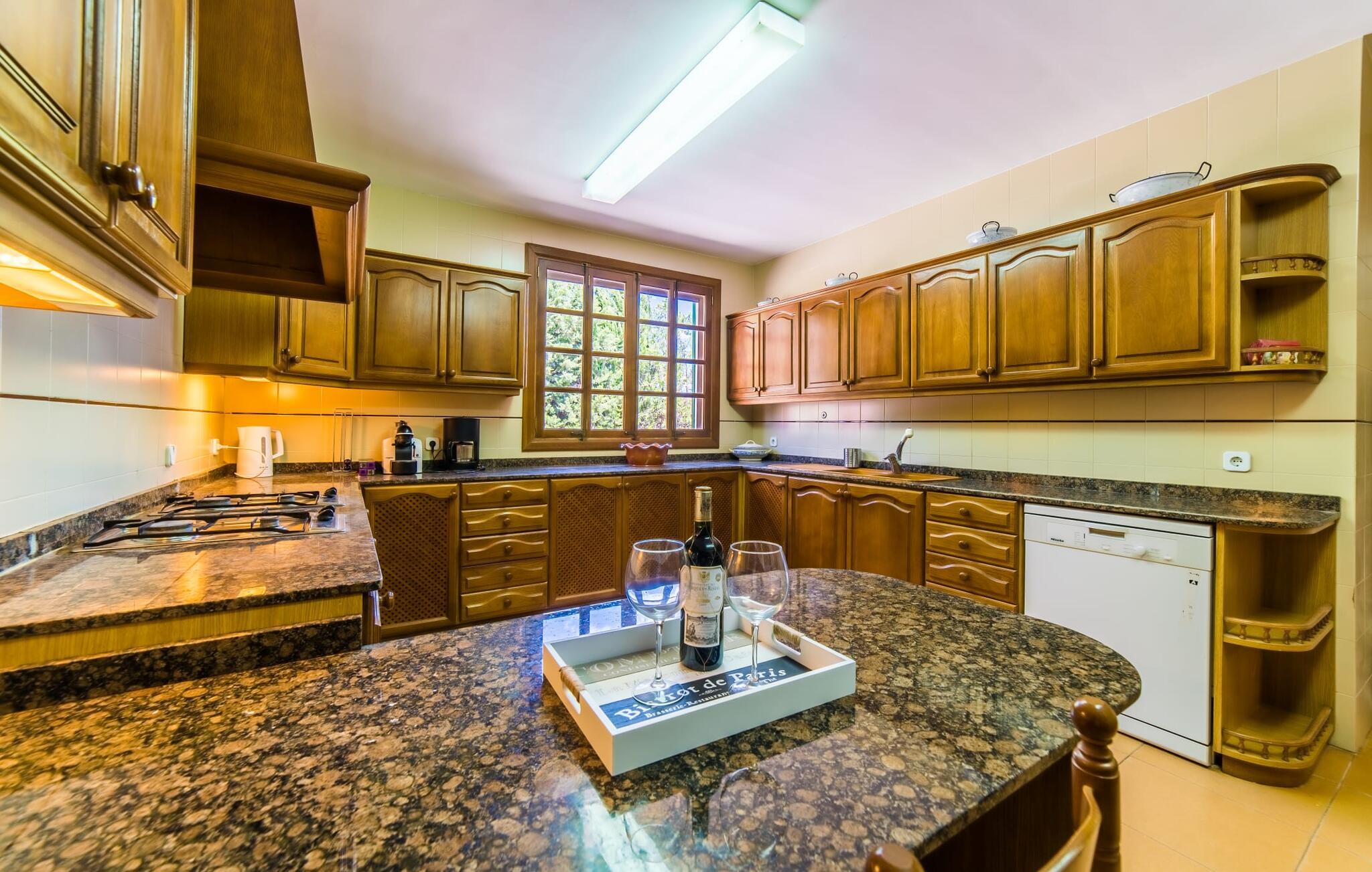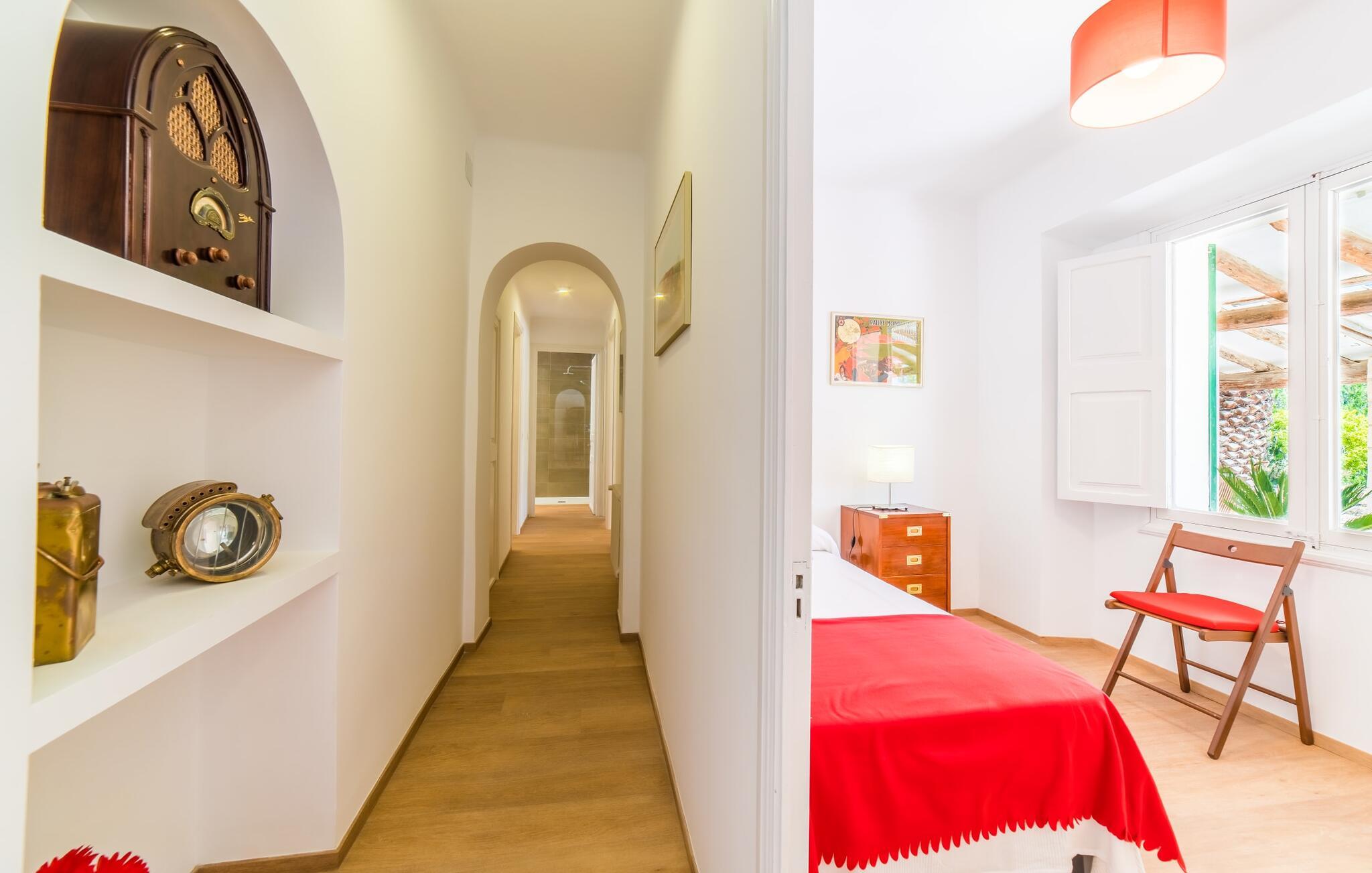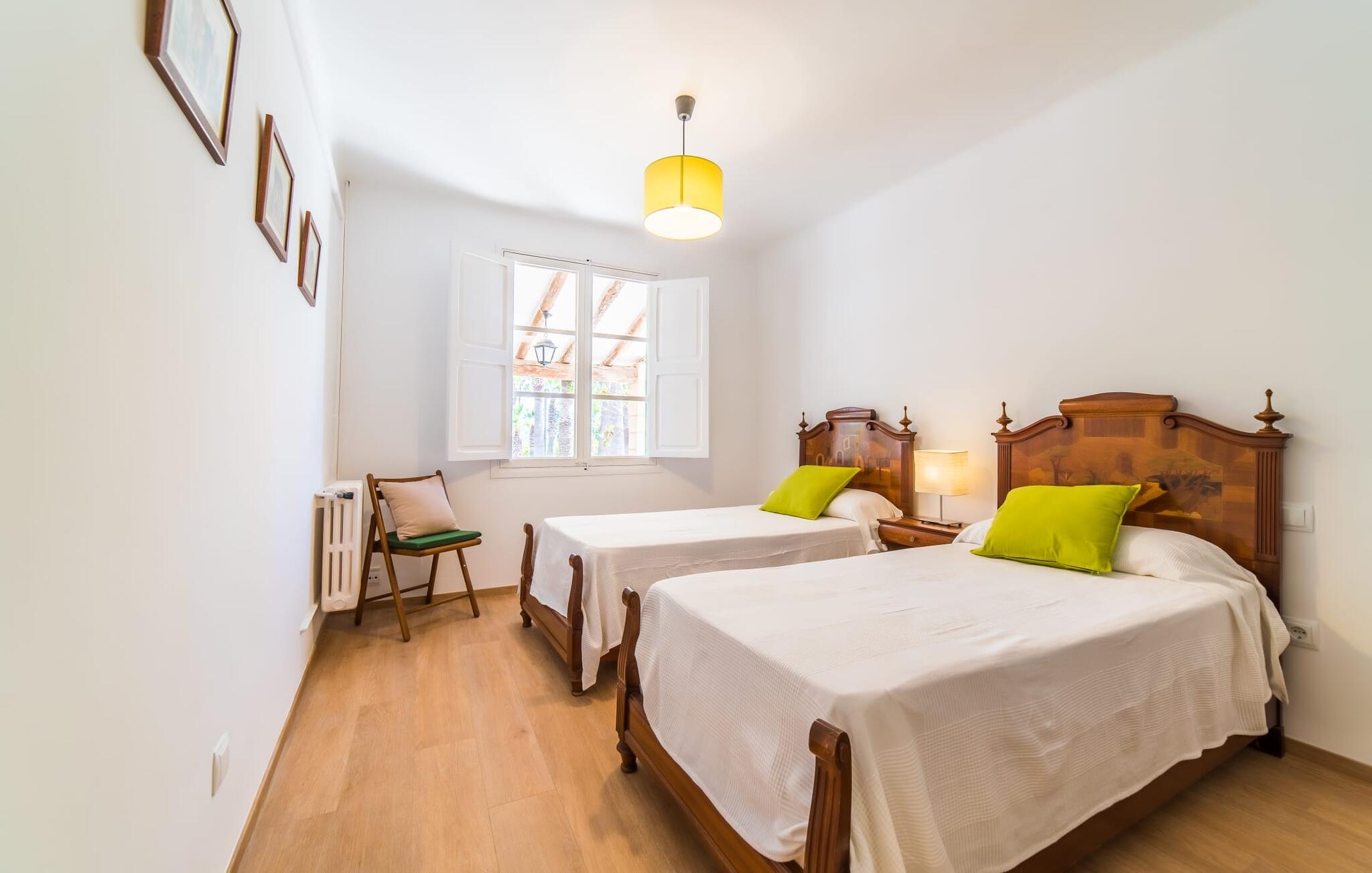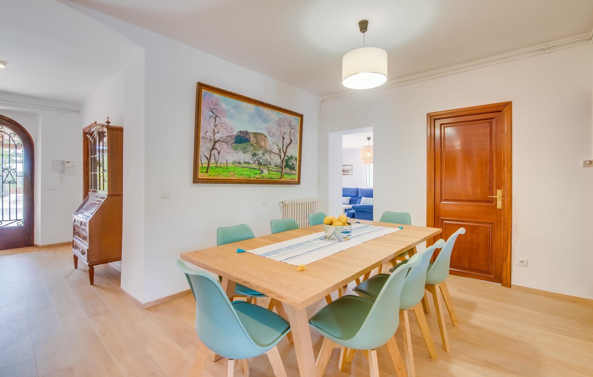 Hvis I har valgt denne familievenlige villa, viser du, at I ved, hvad I skal kigge efter i et sommerhus på denne ø: Bungalowvillaen “Can Renou” byder på meget at lave og ligger i en stille dal på sydskråningerne af Tramuntana-bjergene rejser sig som stenvagter, kun få minutters gang fra den lille brostensbelagte by Alaró. En imponerende indkørsel fører jer direkte til parkeringspladsen. Den store grund med mægtige palmer og knudrede oliventræer har alt at byde på; Der er noget for enhver aldersgruppe: en pool (med udendørs bruser og toilet), en legeplads for de mindste, en velholdt tennisbane og et bordtennisbord under et fortelt afrunder det virkelig omfattende udbud af fritidsaktiviteter . Hvis I overvejer at grille en sport, vil I (og alle andre) blive glade for at vide, at der også er en indbygget grill. Med så meget på tilbud kan ingen sige, at de blev udeladt denne gang. Når I har fået nok af sjov og leg, kan I finde en liggestol på en af de mange terrasser - udendørs og overdækkede - ved poolen og rundt om huset eller gå en tur og gå på opdagelse i ejendommen. Det bliver superhyggeligt i stuen: dybblå to-personers sofaer og fløjstole inviterer til at se tv eller læse en god bog, palmerne kigger gennem terrassedøren og den lukkede pejs har mistet sine knitrende flammer til levende lys. I det rustikke køkken med hjørnekabine, mikroovn og opvaskemaskine kan I lave mad til en hel hær eller hyre dem til at hjælpe med at lave mad - I skal bare passe på, at de ikke løber væk, efter at vinen er fjernet. Væk fra den lange gang, hvor mange gamle skatte er udstillet, er der nogle få soveværelser og badeværelser - nogle mennesker (bedstemor, bedstefar, snorkere, singler og unge voksne) vil være glade for, at der er to komfortable enkeltværelser til rådighed. For resten af gruppen er der tre dobbeltsenge (1,5 x 2 m) og to enkeltsenge til rådighed; Det en-suite badeværelse med hvide skabe og spabadet vil selvfølgelig være meget attråværdigt, men de to andre moderne badeværelser har også meget at byde på: Håndklædevarmere, regnbruser og brusekabiner til trætte vandrere og mere svedige (bord). ) tennisproffer. Og selvfølgelig for dem, der ønsker at tilbringe en aften i klubberne i Palma. En familievenlig villa med en betagende beliggenhed: "Can Renou" ligger kun få minutters gang fra den smukke skomagerlandsby Alaró og det nærmeste supermarked. Selvom I kun er omkring en halv time væk fra Palmas seværdigheder, er I næsten i bjergene. Der er kun 10 km til vandreparadiset omkring Orienten, og den traditionelle læder- og vinby Inca er ideel til længere shoppingture. I kan finde sand og hav på strandene i hovedstaden, eller prøve Alcúdia-bugten (ca. 40 km). Bemærk venligst, at denne ejendom ikke accepterer ungdomsgrupper eller polterabender. En ungdomsgruppe på denne ejendom består af personer under 30 år. Book ikke denne ejendom, hvis I er en ungdomsgruppe eller polterabend, da jeres reservation vil blive afvist, når den er booket, hvilket også kan være tilfældet ved ankomst til ejendommen eller under jeres ophold, og I vil ikke modtage en refusion
