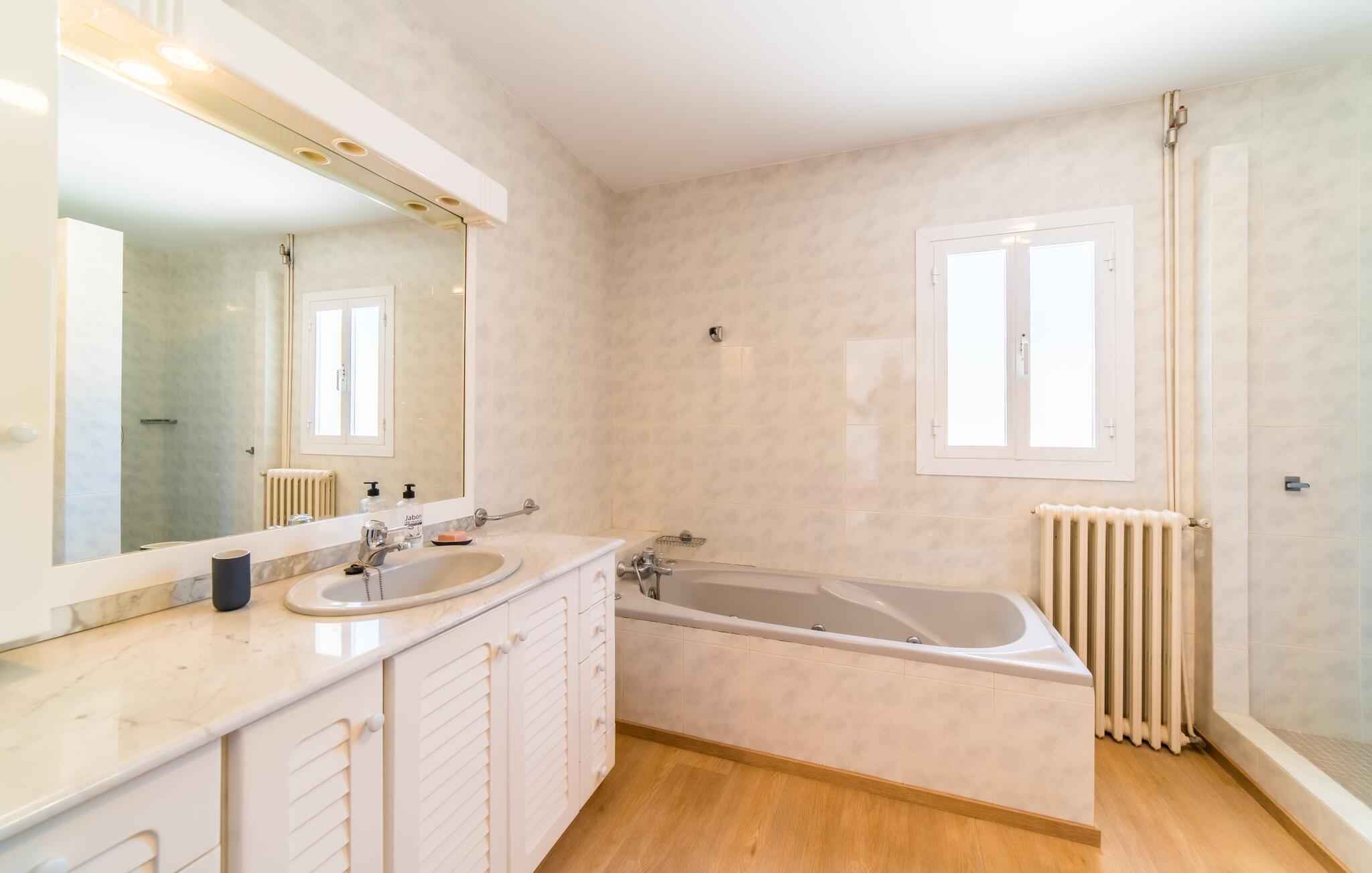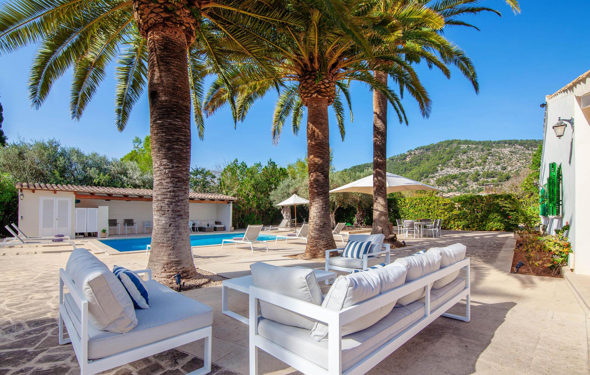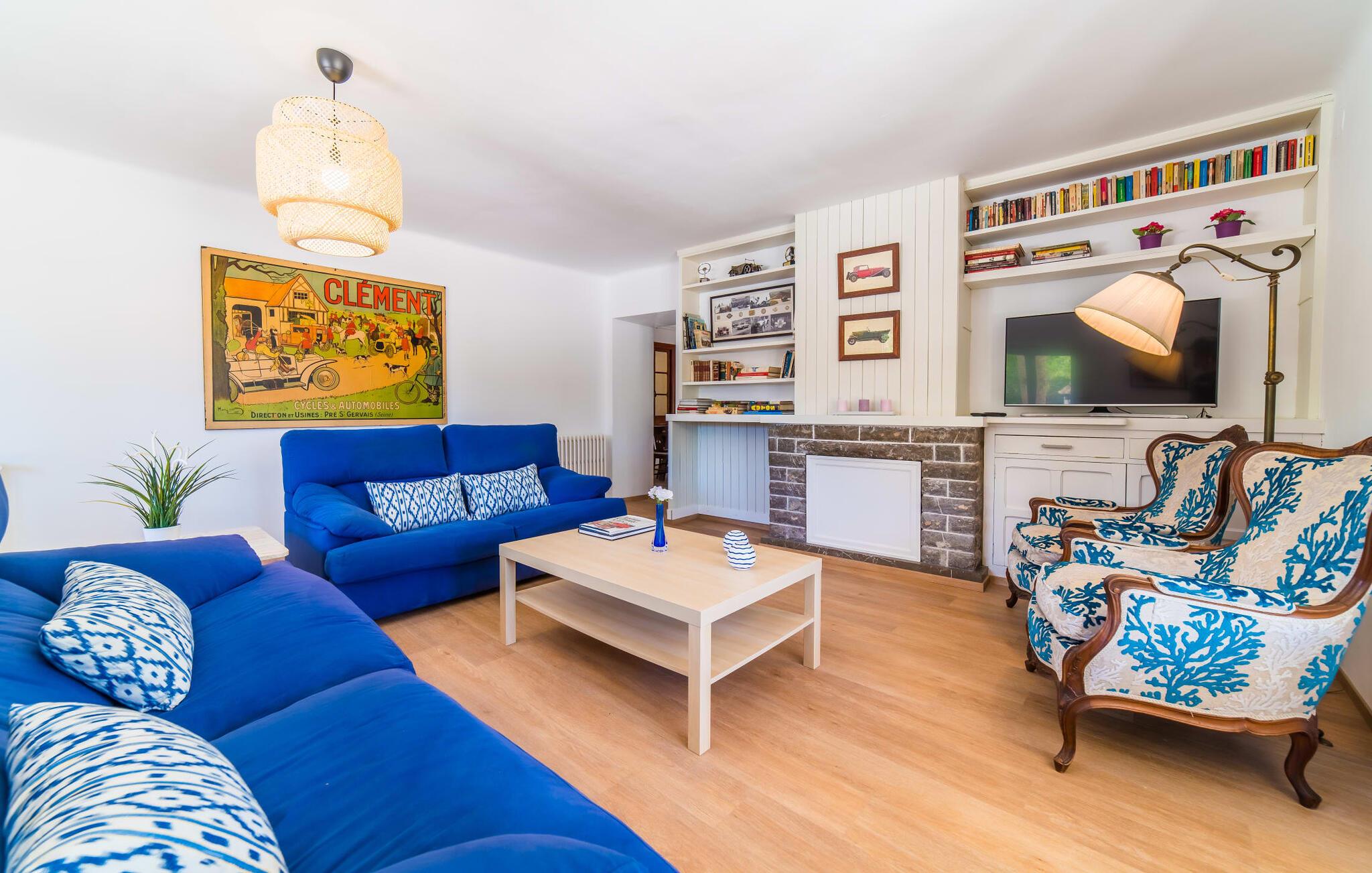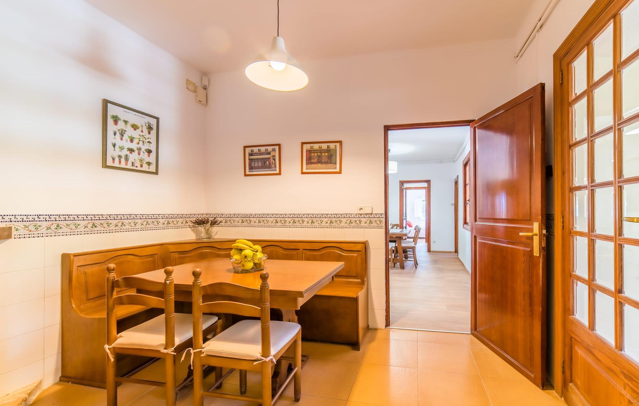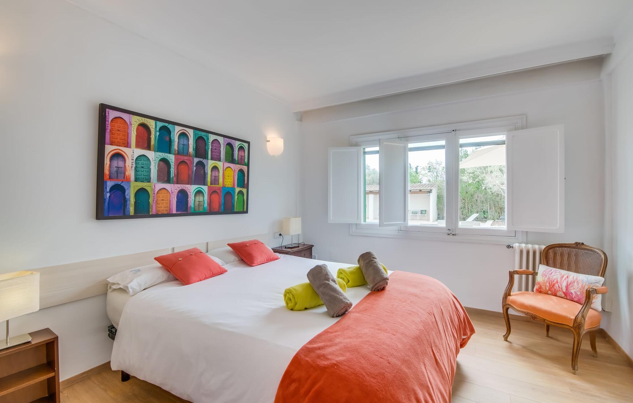 Hvis I har valgt denne familievenlige villa, viser du, at I ved, hvad I skal kigge efter i et sommerhus på denne ø: Bungalowvillaen “Can Renou” byder på meget at lave og ligger i en stille dal på sydskråningerne af Tramuntana-bjergene rejser sig som stenvagter, kun få minutters gang fra den lille brostensbelagte by Alaró. En imponerende indkørsel fører jer direkte til parkeringspladsen. Den store grund med mægtige palmer og knudrede oliventræer har alt at byde på; Der er noget for enhver aldersgruppe: en pool (med udendørs bruser og toilet), en legeplads for de mindste, en velholdt tennisbane og et bordtennisbord under et fortelt afrunder det virkelig omfattende udbud af fritidsaktiviteter . Hvis I overvejer at grille en sport, vil I (og alle andre) blive glade for at vide, at der også er en indbygget grill. Med så meget på tilbud kan ingen sige, at de blev udeladt denne gang. Når I har fået nok af sjov og leg, kan I finde en liggestol på en af de mange terrasser - udendørs og overdækkede - ved poolen og rundt om huset eller gå en tur og gå på opdagelse i ejendommen. Det bliver superhyggeligt i stuen: dybblå to-personers sofaer og fløjstole inviterer til at se tv eller læse en god bog, palmerne kigger gennem terrassedøren og den lukkede pejs har mistet sine knitrende flammer til levende lys. I det rustikke køkken med hjørnekabine, mikroovn og opvaskemaskine kan I lave mad til en hel hær eller hyre dem til at hjælpe med at lave mad - I skal bare passe på, at de ikke løber væk, efter at vinen er fjernet. Væk fra den lange gang, hvor mange gamle skatte er udstillet, er der nogle få soveværelser og badeværelser - nogle mennesker (bedstemor, bedstefar, snorkere, singler og unge voksne) vil være glade for, at der er to komfortable enkeltværelser til rådighed. For resten af gruppen er der tre dobbeltsenge (1,5 x 2 m) og to enkeltsenge til rådighed; Det en-suite badeværelse med hvide skabe og spabadet vil selvfølgelig være meget attråværdigt, men de to andre moderne badeværelser har også meget at byde på: Håndklædevarmere, regnbruser og brusekabiner til trætte vandrere og mere svedige (bord). ) tennisproffer. Og selvfølgelig for dem, der ønsker at tilbringe en aften i klubberne i Palma. En familievenlig villa med en betagende beliggenhed: "Can Renou" ligger kun få minutters gang fra den smukke skomagerlandsby Alaró og det nærmeste supermarked. Selvom I kun er omkring en halv time væk fra Palmas seværdigheder, er I næsten i bjergene. Der er kun 10 km til vandreparadiset omkring Orienten, og den traditionelle læder- og vinby Inca er ideel til længere shoppingture. I kan finde sand og hav på strandene i hovedstaden, eller prøve Alcúdia-bugten (ca. 40 km). Bemærk venligst, at denne ejendom ikke accepterer ungdomsgrupper eller polterabender. En ungdomsgruppe på denne ejendom består af personer under 30 år. Book ikke denne ejendom, hvis I er en ungdomsgruppe eller polterabend, da jeres reservation vil blive afvist, når den er booket, hvilket også kan være tilfældet ved ankomst til ejendommen eller under jeres ophold, og I vil ikke modtage en refusion