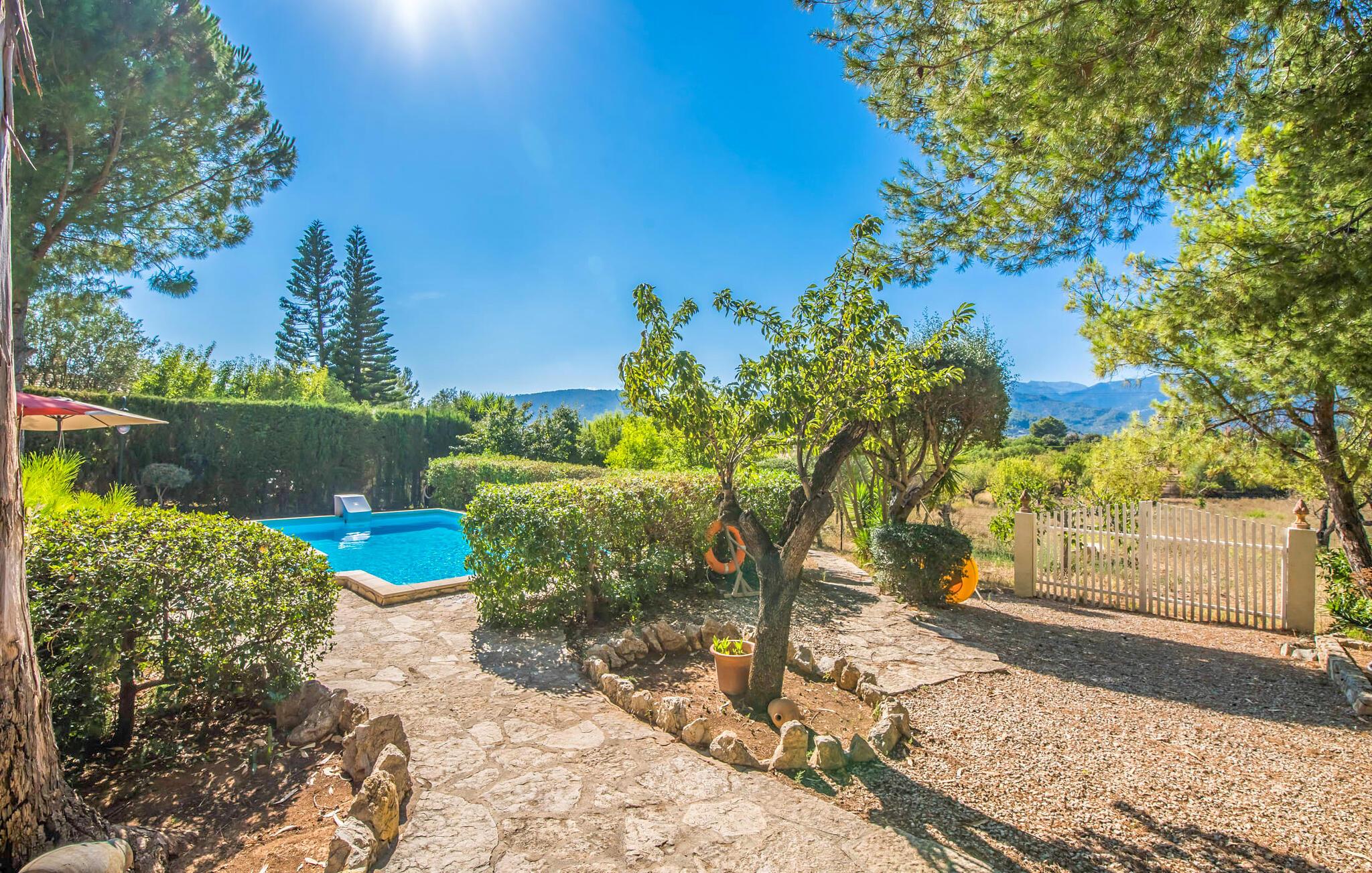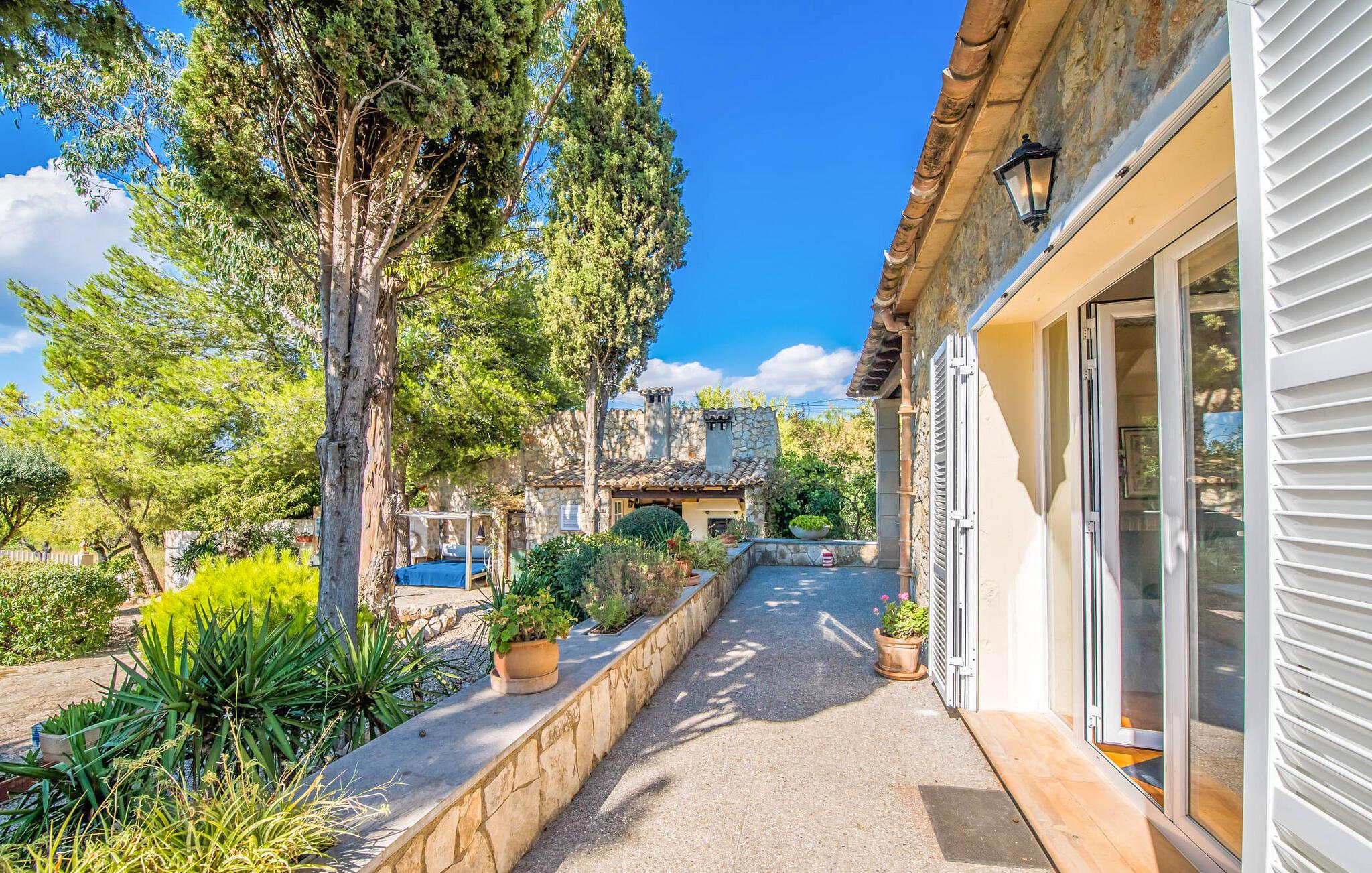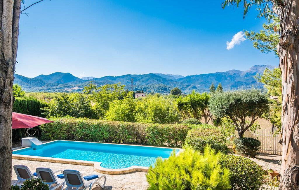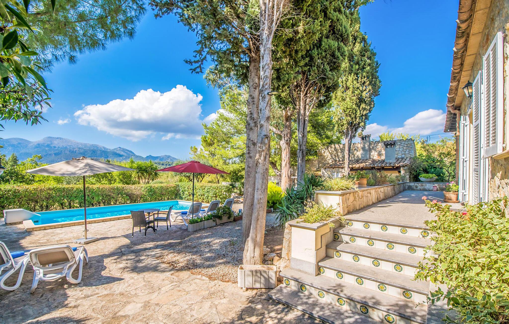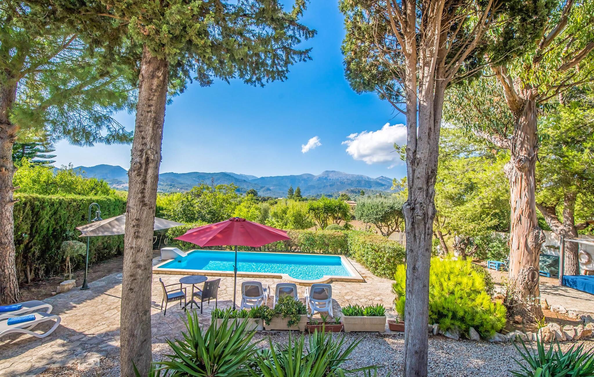 Villaen “Can Reure” ligger præcis mellem Mancor de la Vall og Inca; Begge steder kan nås på kun fem minutter i bil. På den rustikke, 2.500 m² store ejendom finder I talrige mandeltræer, som giver et strejf af typisk mallorcansk flair og samtidig giver udendørsområdet en vis hygge. Små hække, vægge og den store mængde natursten og småsten passer harmonisk ind og understreger denne stemning yderligere. Udeområdets midtpunkt er poolen, som er let tilgængelig via en halvcirkelformet trappe og giver en uforlignelig forfriskning på varme dage. I kan slappe meget af på liggestolene og virkelig nyde middelhavssolen. I tilfælde af at UV-strålingen bliver for stærk, er en parasol tilgængelig. I kan selvfølgelig også bruge lidt tid i et af de luftige, naturligt skyggefulde områder, der dukker op hist og her. Fra poolterrassen direkte foran huset kan I virkelig nyde og nyde den vidunderlige udsigt over bjergene. Den overdækkede grillplads er perfekt til kulinariske aftener ved grillen, mens I er sammen som en gruppe. Den gamle, delvist renoverede, et-etagers bygning har et samlet areal på 160 m² og består af en gang, et opholdsrum, et køkken, to soveværelser og to badeværelser, hvoraf det ene er en-suite. Et af soveværelserne er tilgængelige via et par trin, der fører ned. Soveværelserne er individuelt og komfortabelt indrettede og er beregnet til at skabe en behagelig ramme for en afslappende nattesøvn. I den kombinerede stue/spisestue inviterer de smukke ternede lænestole til afslapning og på køligere aftener giver pejsen ekstra varme og hygge. Har I lyst til at spise indenfor, er der et smukt fritstående træbord i stuen. På den komfortable sofa kan I nyde den smukke udsigt over Tramuntana-bjergene, mens I læser en god bog fra det lille bibliotek. Køkkenet er ideelt til at opfylde jeres daglige behov og byder på alt fra en kedel til en filterkaffemaskine. Badeværelserne er både funktionelt udstyrede og venlige. Et strygejern og en hårtørrer er tilgængelige og kan selvfølgelig bruges af gæster. Inkaområdet er en ideel base for at udforske den imponerende nordlige kyst- og bjergregion. Under jeres ophold på Villa "San Reure" er I sikker på at tage mindst én naturskøn køretur over bakkerne for at observere og beundre den uforglemmelige betagende udsigt. Der er også talrige maleriske strande og nicher, som kan besøges herfra, herunder Playa del Muro eller Platja des Morer Vermell (begge omkring 30 minutter væk i bil). Der er en livlig atmosfære i det nærliggende Inca. Denne by er især kendt for sin lokale læderindustri. Her produceres sko fra det populære mærke “Camper”. I kælderrestauranterne finder I store vintønder stablet højt. Der kan I smage typiske mallorcanske retter og regionale vine. Beliggenheden tæt på forbindelsesvejen bringer en del trafikstøj med sig, men den tilbyder også en fremragende, bekvem beliggenhed, så I nemt kan nå de nærmeste byer og steder i alle retninger. I det indre af øen, kun 2 km fra den berømte "læderby" Inca, ligger den smukke villa "Can Reure". Ejendommen er bygget i rustik mallorcansk stil og tilbyder en spektakulær udsigt over Tramuntana-bjergene. På grund af sin beliggenhed i hjertet af øen kan I hurtigt nå Mallorcas talrige og varierede strande fra villaen.