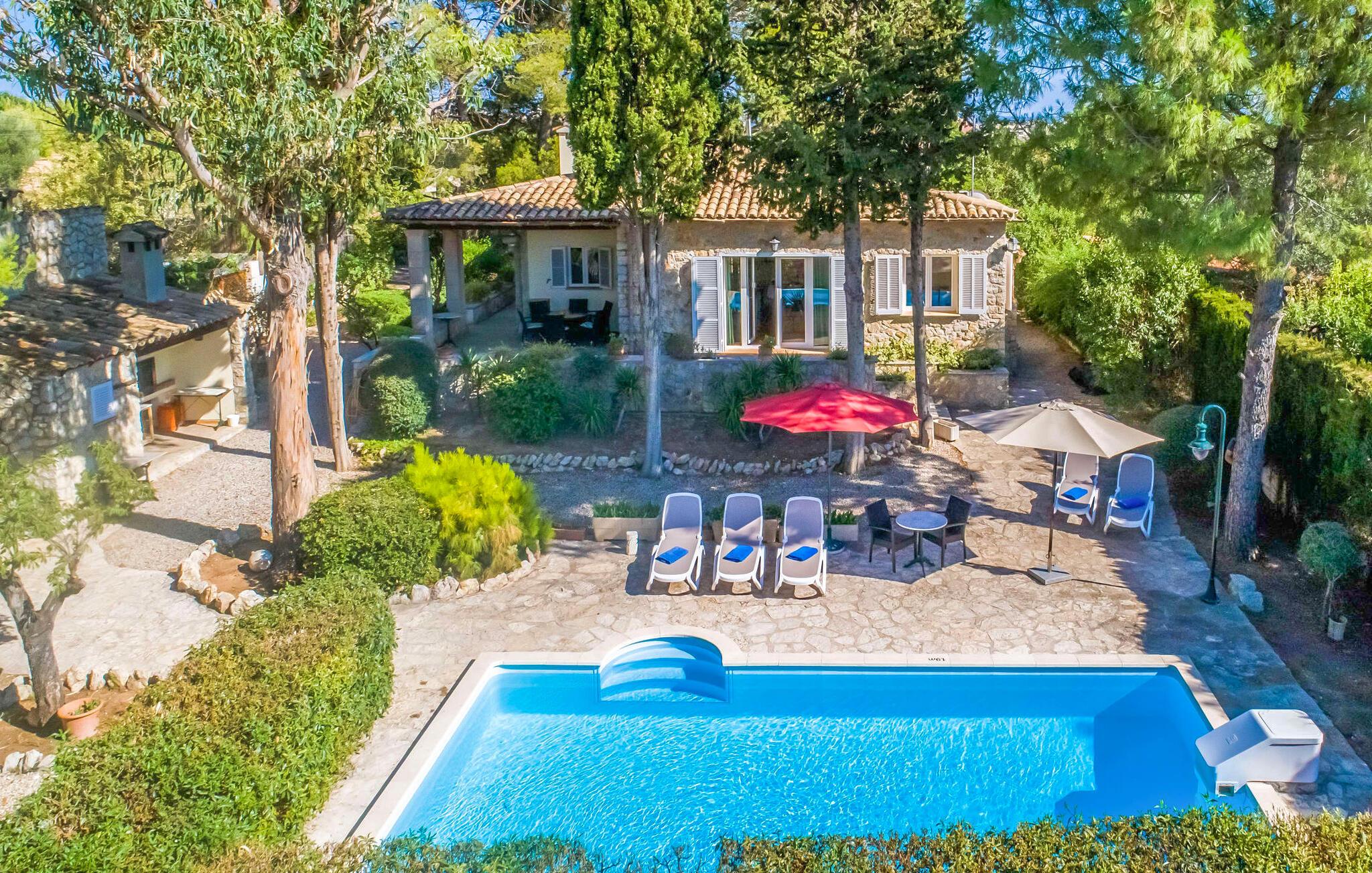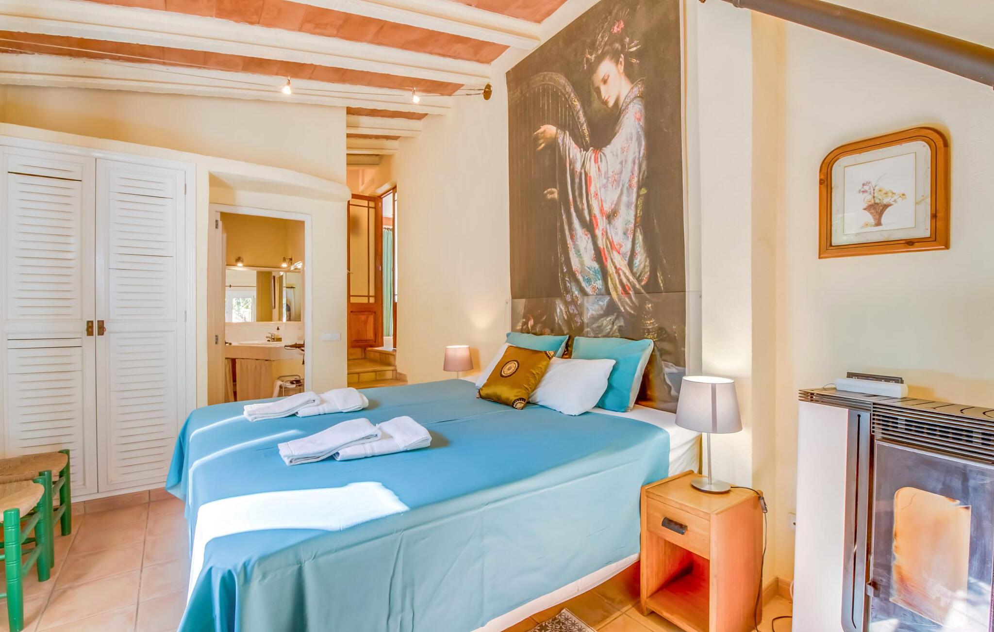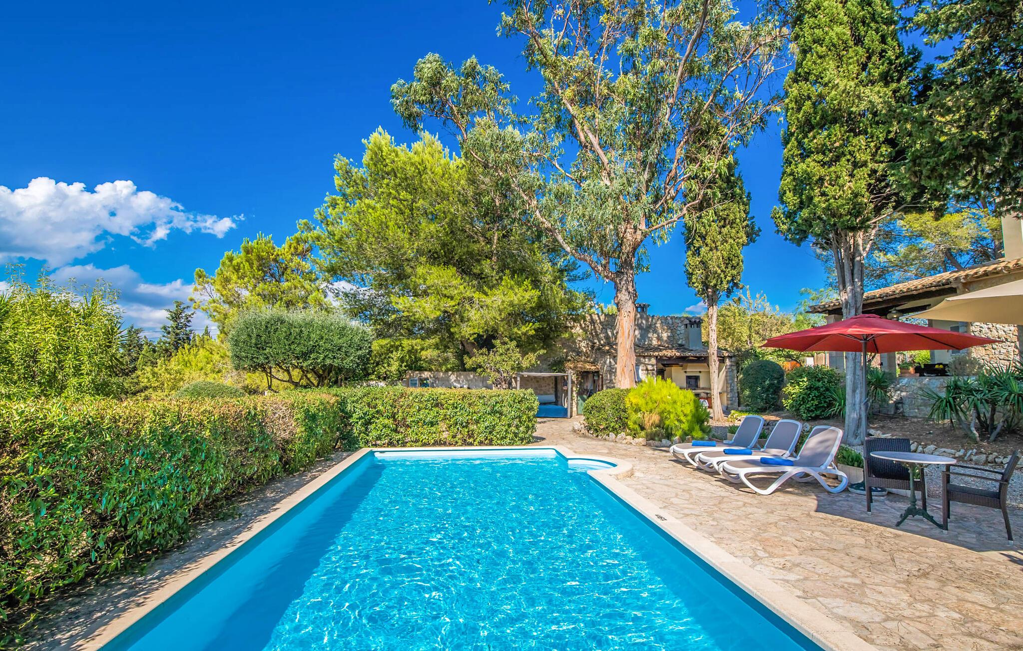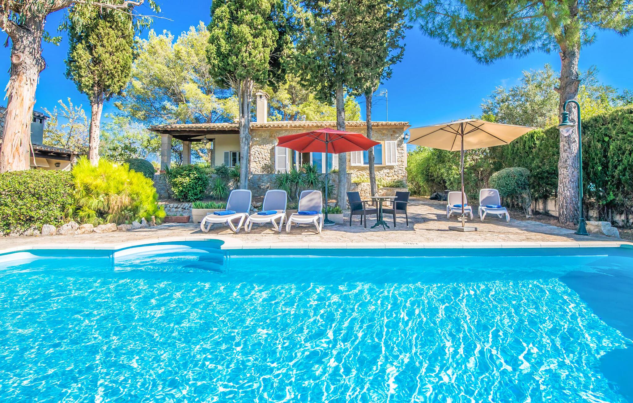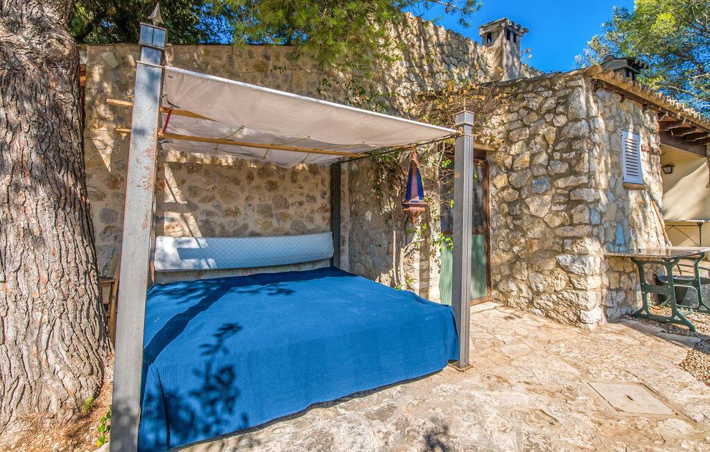 Villaen “Can Reure” ligger præcis mellem Mancor de la Vall og Inca; Begge steder kan nås på kun fem minutter i bil. På den rustikke, 2.500 m² store ejendom finder I talrige mandeltræer, som giver et strejf af typisk mallorcansk flair og samtidig giver udendørsområdet en vis hygge. Små hække, vægge og den store mængde natursten og småsten passer harmonisk ind og understreger denne stemning yderligere. Udeområdets midtpunkt er poolen, som er let tilgængelig via en halvcirkelformet trappe og giver en uforlignelig forfriskning på varme dage. I kan slappe meget af på liggestolene og virkelig nyde middelhavssolen. I tilfælde af at UV-strålingen bliver for stærk, er en parasol tilgængelig. I kan selvfølgelig også bruge lidt tid i et af de luftige, naturligt skyggefulde områder, der dukker op hist og her. Fra poolterrassen direkte foran huset kan I virkelig nyde og nyde den vidunderlige udsigt over bjergene. Den overdækkede grillplads er perfekt til kulinariske aftener ved grillen, mens I er sammen som en gruppe. Den gamle, delvist renoverede, et-etagers bygning har et samlet areal på 160 m² og består af en gang, et opholdsrum, et køkken, to soveværelser og to badeværelser, hvoraf det ene er en-suite. Et af soveværelserne er tilgængelige via et par trin, der fører ned. Soveværelserne er individuelt og komfortabelt indrettede og er beregnet til at skabe en behagelig ramme for en afslappende nattesøvn. I den kombinerede stue/spisestue inviterer de smukke ternede lænestole til afslapning og på køligere aftener giver pejsen ekstra varme og hygge. Har I lyst til at spise indenfor, er der et smukt fritstående træbord i stuen. På den komfortable sofa kan I nyde den smukke udsigt over Tramuntana-bjergene, mens I læser en god bog fra det lille bibliotek. Køkkenet er ideelt til at opfylde jeres daglige behov og byder på alt fra en kedel til en filterkaffemaskine. Badeværelserne er både funktionelt udstyrede og venlige. Et strygejern og en hårtørrer er tilgængelige og kan selvfølgelig bruges af gæster. Inkaområdet er en ideel base for at udforske den imponerende nordlige kyst- og bjergregion. Under jeres ophold på Villa "San Reure" er I sikker på at tage mindst én naturskøn køretur over bakkerne for at observere og beundre den uforglemmelige betagende udsigt. Der er også talrige maleriske strande og nicher, som kan besøges herfra, herunder Playa del Muro eller Platja des Morer Vermell (begge omkring 30 minutter væk i bil). Der er en livlig atmosfære i det nærliggende Inca. Denne by er især kendt for sin lokale læderindustri. Her produceres sko fra det populære mærke “Camper”. I kælderrestauranterne finder I store vintønder stablet højt. Der kan I smage typiske mallorcanske retter og regionale vine. Beliggenheden tæt på forbindelsesvejen bringer en del trafikstøj med sig, men den tilbyder også en fremragende, bekvem beliggenhed, så I nemt kan nå de nærmeste byer og steder i alle retninger. I det indre af øen, kun 2 km fra den berømte "læderby" Inca, ligger den smukke villa "Can Reure". Ejendommen er bygget i rustik mallorcansk stil og tilbyder en spektakulær udsigt over Tramuntana-bjergene. På grund af sin beliggenhed i hjertet af øen kan I hurtigt nå Mallorcas talrige og varierede strande fra villaen.