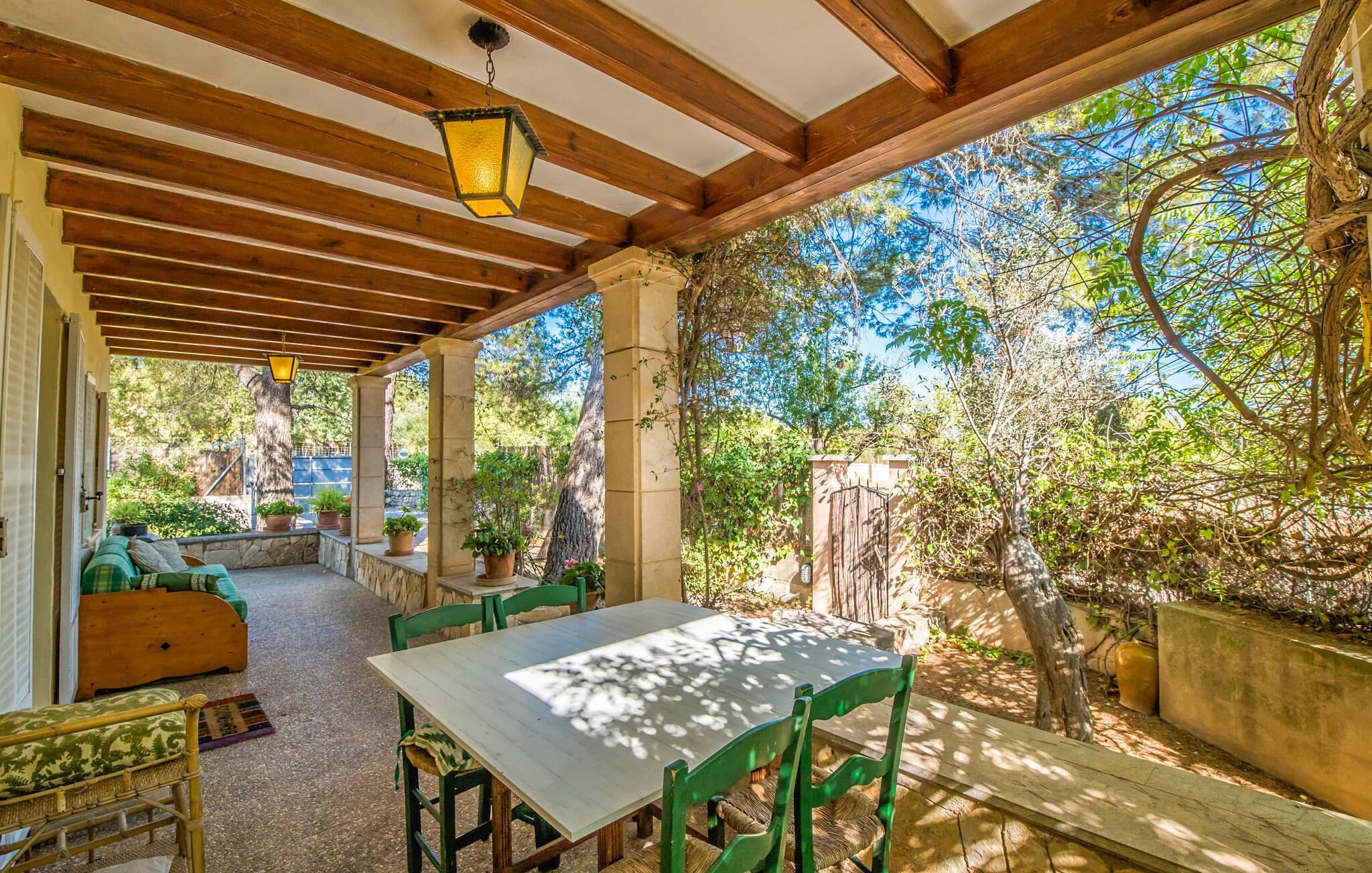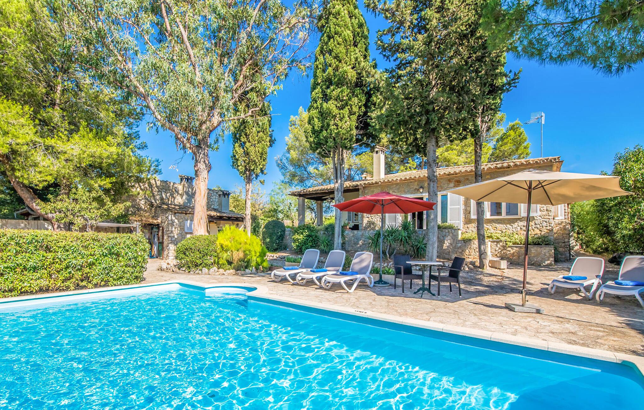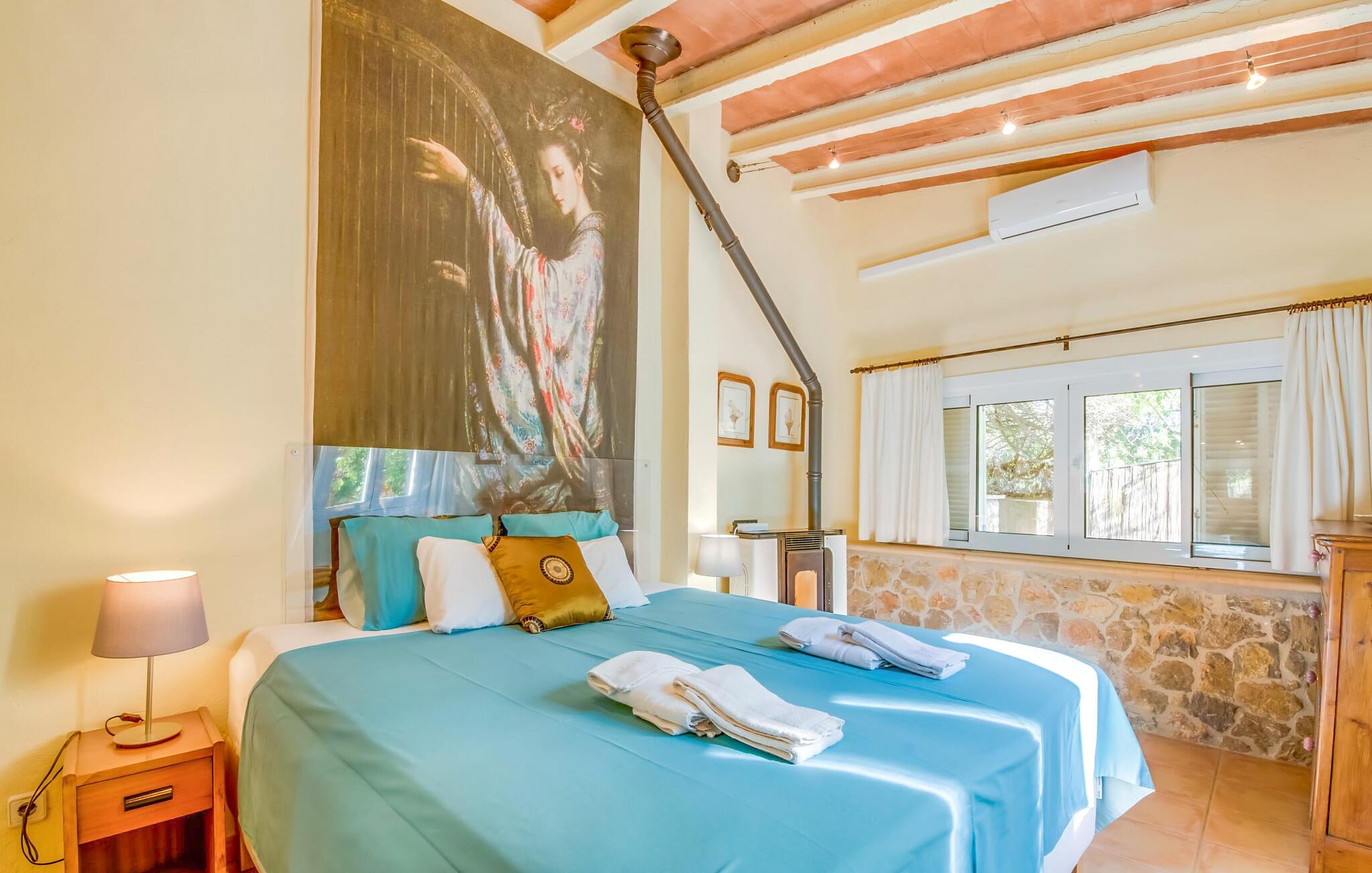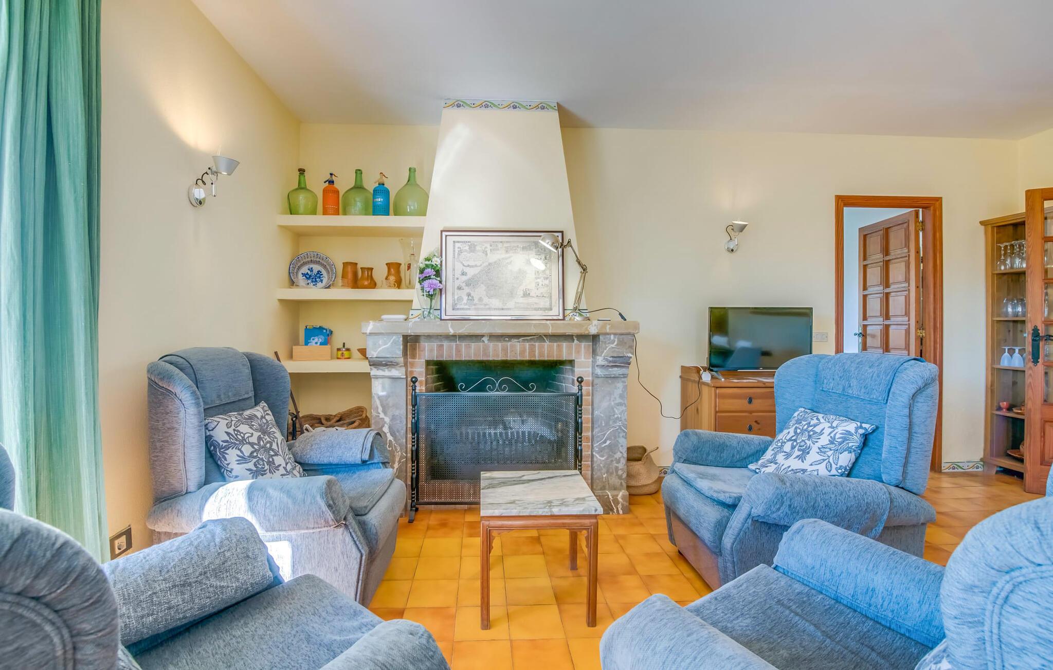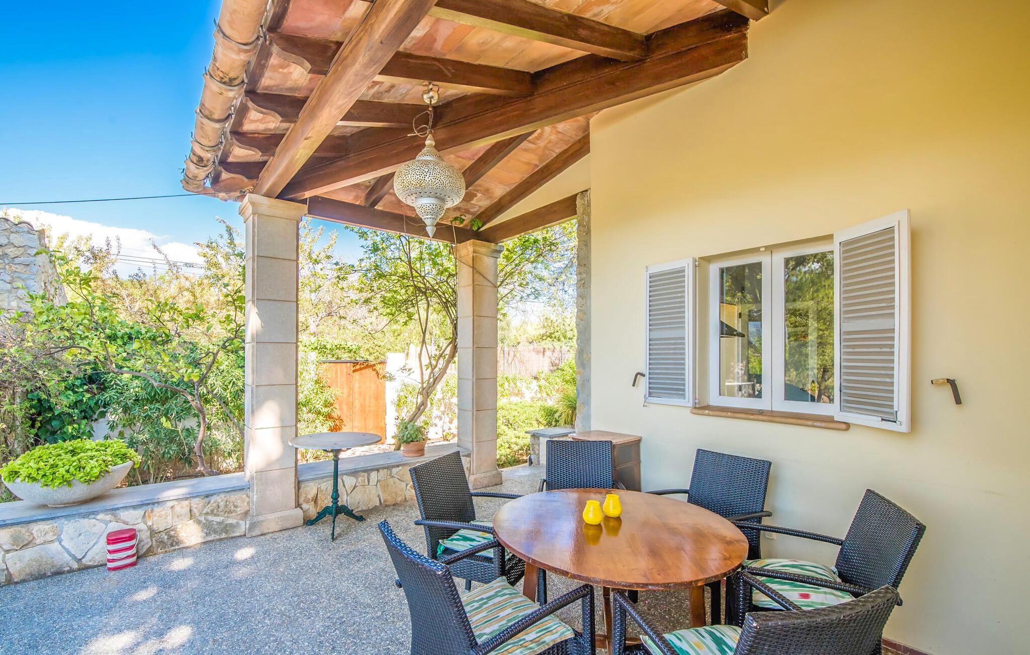 Villaen “Can Reure” ligger præcis mellem Mancor de la Vall og Inca; Begge steder kan nås på kun fem minutter i bil. På den rustikke, 2.500 m² store ejendom finder I talrige mandeltræer, som giver et strejf af typisk mallorcansk flair og samtidig giver udendørsområdet en vis hygge. Små hække, vægge og den store mængde natursten og småsten passer harmonisk ind og understreger denne stemning yderligere. Udeområdets midtpunkt er poolen, som er let tilgængelig via en halvcirkelformet trappe og giver en uforlignelig forfriskning på varme dage. I kan slappe meget af på liggestolene og virkelig nyde middelhavssolen. I tilfælde af at UV-strålingen bliver for stærk, er en parasol tilgængelig. I kan selvfølgelig også bruge lidt tid i et af de luftige, naturligt skyggefulde områder, der dukker op hist og her. Fra poolterrassen direkte foran huset kan I virkelig nyde og nyde den vidunderlige udsigt over bjergene. Den overdækkede grillplads er perfekt til kulinariske aftener ved grillen, mens I er sammen som en gruppe. Den gamle, delvist renoverede, et-etagers bygning har et samlet areal på 160 m² og består af en gang, et opholdsrum, et køkken, to soveværelser og to badeværelser, hvoraf det ene er en-suite. Et af soveværelserne er tilgængelige via et par trin, der fører ned. Soveværelserne er individuelt og komfortabelt indrettede og er beregnet til at skabe en behagelig ramme for en afslappende nattesøvn. I den kombinerede stue/spisestue inviterer de smukke ternede lænestole til afslapning og på køligere aftener giver pejsen ekstra varme og hygge. Har I lyst til at spise indenfor, er der et smukt fritstående træbord i stuen. På den komfortable sofa kan I nyde den smukke udsigt over Tramuntana-bjergene, mens I læser en god bog fra det lille bibliotek. Køkkenet er ideelt til at opfylde jeres daglige behov og byder på alt fra en kedel til en filterkaffemaskine. Badeværelserne er både funktionelt udstyrede og venlige. Et strygejern og en hårtørrer er tilgængelige og kan selvfølgelig bruges af gæster. Inkaområdet er en ideel base for at udforske den imponerende nordlige kyst- og bjergregion. Under jeres ophold på Villa "San Reure" er I sikker på at tage mindst én naturskøn køretur over bakkerne for at observere og beundre den uforglemmelige betagende udsigt. Der er også talrige maleriske strande og nicher, som kan besøges herfra, herunder Playa del Muro eller Platja des Morer Vermell (begge omkring 30 minutter væk i bil). Der er en livlig atmosfære i det nærliggende Inca. Denne by er især kendt for sin lokale læderindustri. Her produceres sko fra det populære mærke “Camper”. I kælderrestauranterne finder I store vintønder stablet højt. Der kan I smage typiske mallorcanske retter og regionale vine. Beliggenheden tæt på forbindelsesvejen bringer en del trafikstøj med sig, men den tilbyder også en fremragende, bekvem beliggenhed, så I nemt kan nå de nærmeste byer og steder i alle retninger. I det indre af øen, kun 2 km fra den berømte "læderby" Inca, ligger den smukke villa "Can Reure". Ejendommen er bygget i rustik mallorcansk stil og tilbyder en spektakulær udsigt over Tramuntana-bjergene. På grund af sin beliggenhed i hjertet af øen kan I hurtigt nå Mallorcas talrige og varierede strande fra villaen.
