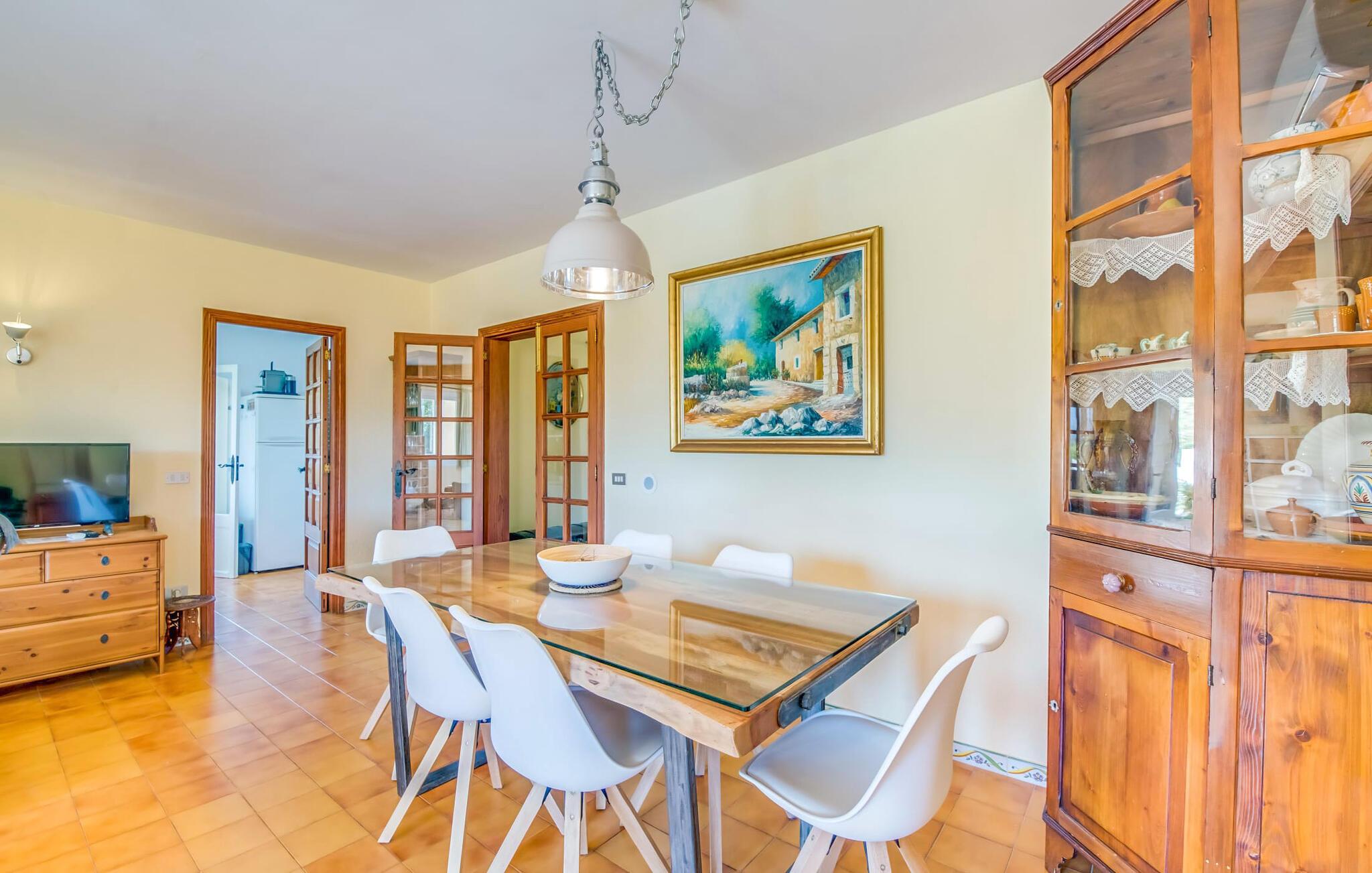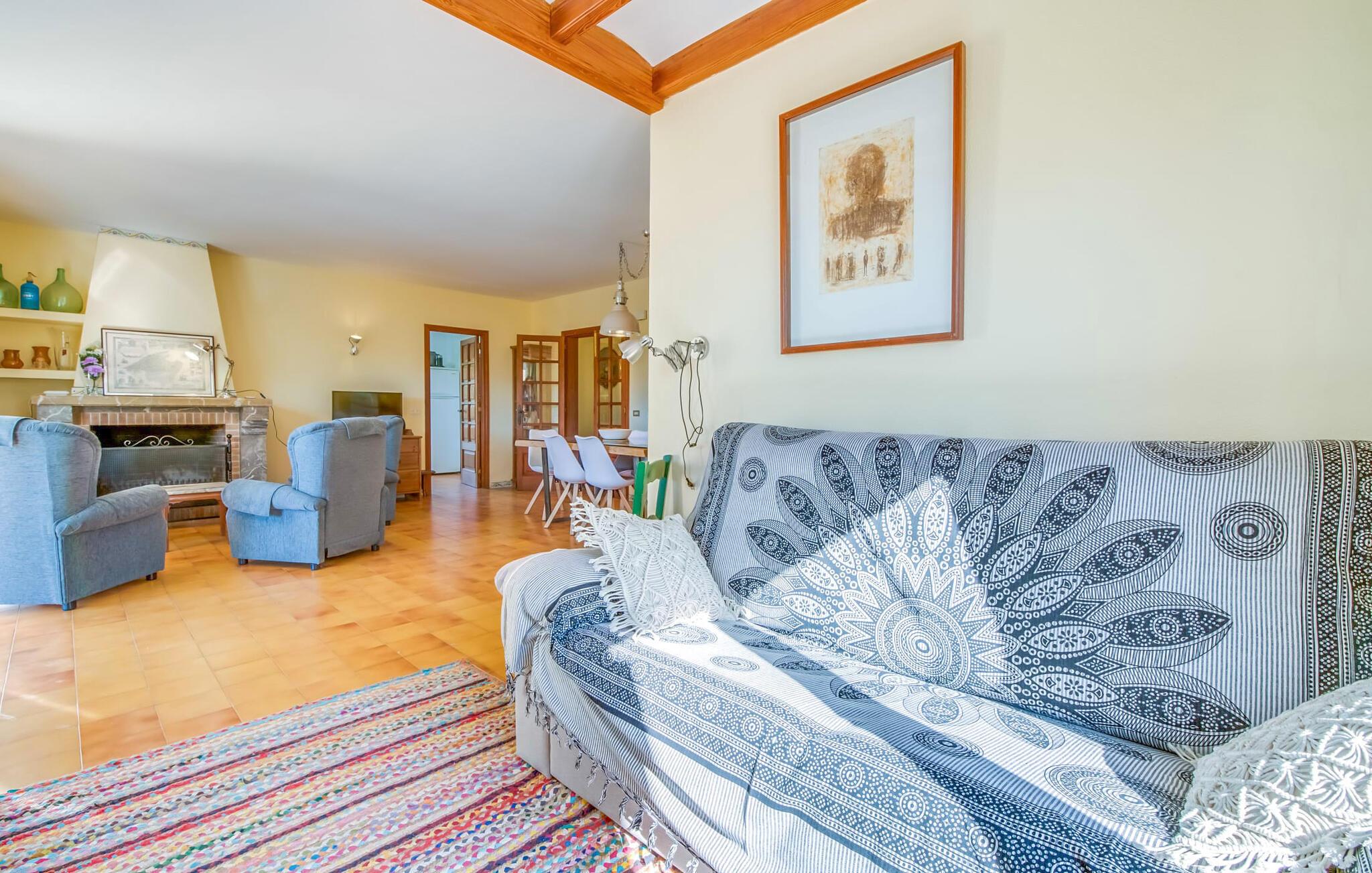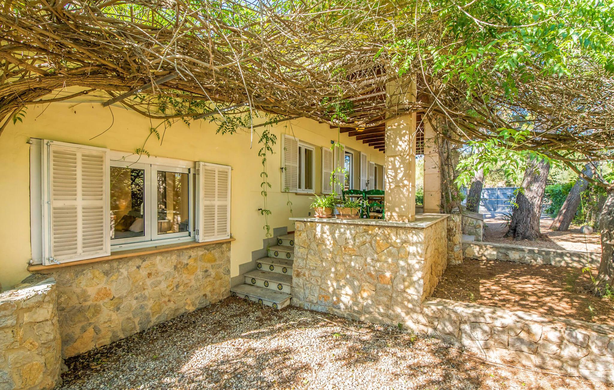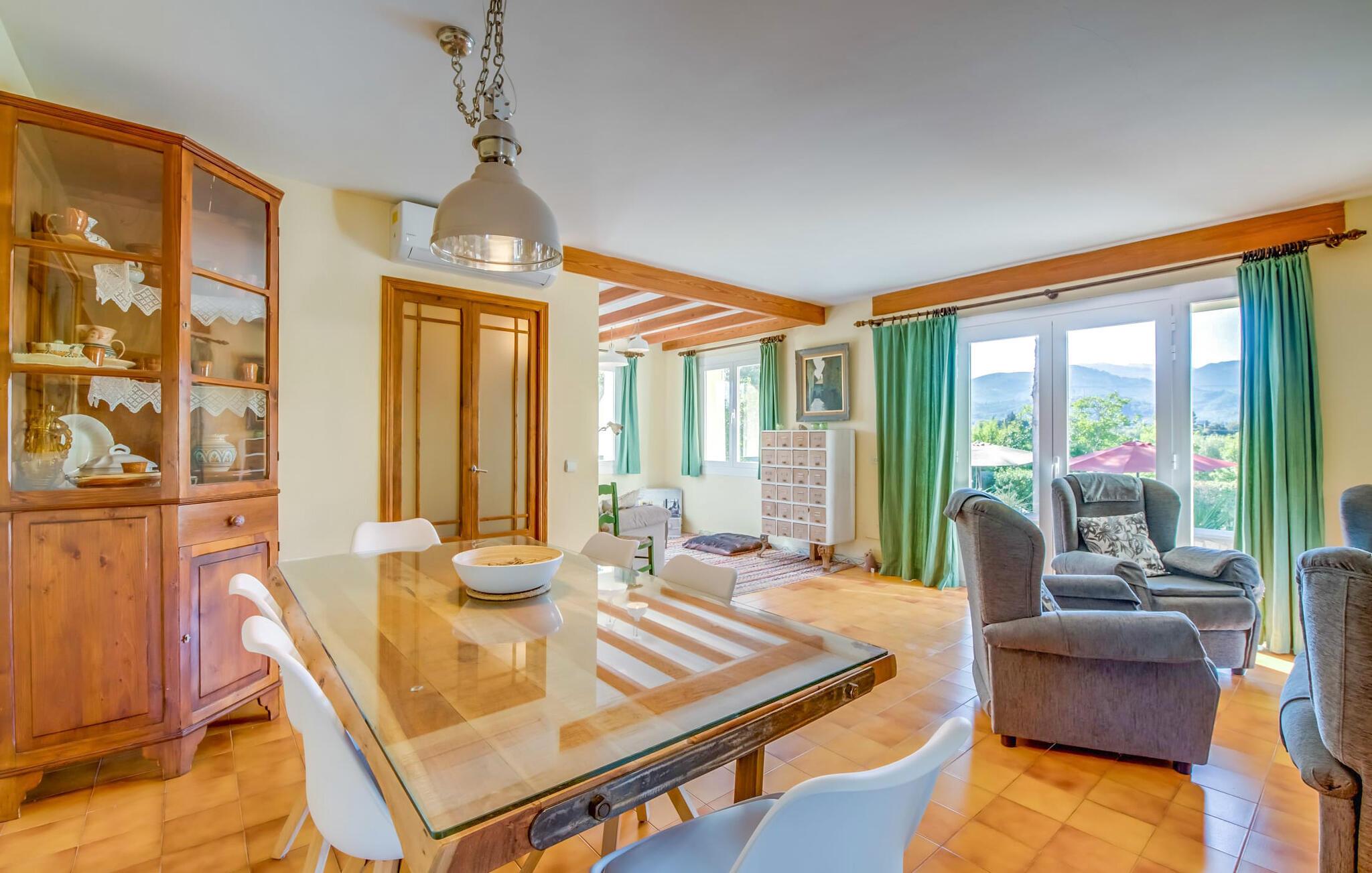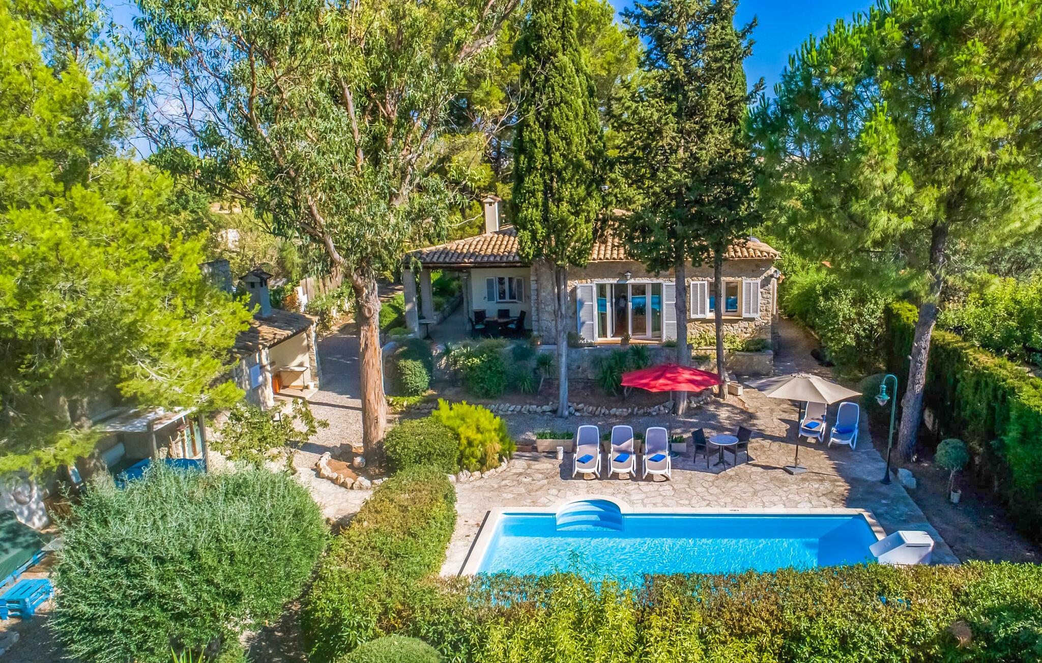 Villaen “Can Reure” ligger præcis mellem Mancor de la Vall og Inca; Begge steder kan nås på kun fem minutter i bil. På den rustikke, 2.500 m² store ejendom finder I talrige mandeltræer, som giver et strejf af typisk mallorcansk flair og samtidig giver udendørsområdet en vis hygge. Små hække, vægge og den store mængde natursten og småsten passer harmonisk ind og understreger denne stemning yderligere. Udeområdets midtpunkt er poolen, som er let tilgængelig via en halvcirkelformet trappe og giver en uforlignelig forfriskning på varme dage. I kan slappe meget af på liggestolene og virkelig nyde middelhavssolen. I tilfælde af at UV-strålingen bliver for stærk, er en parasol tilgængelig. I kan selvfølgelig også bruge lidt tid i et af de luftige, naturligt skyggefulde områder, der dukker op hist og her. Fra poolterrassen direkte foran huset kan I virkelig nyde og nyde den vidunderlige udsigt over bjergene. Den overdækkede grillplads er perfekt til kulinariske aftener ved grillen, mens I er sammen som en gruppe. Den gamle, delvist renoverede, et-etagers bygning har et samlet areal på 160 m² og består af en gang, et opholdsrum, et køkken, to soveværelser og to badeværelser, hvoraf det ene er en-suite. Et af soveværelserne er tilgængelige via et par trin, der fører ned. Soveværelserne er individuelt og komfortabelt indrettede og er beregnet til at skabe en behagelig ramme for en afslappende nattesøvn. I den kombinerede stue/spisestue inviterer de smukke ternede lænestole til afslapning og på køligere aftener giver pejsen ekstra varme og hygge. Har I lyst til at spise indenfor, er der et smukt fritstående træbord i stuen. På den komfortable sofa kan I nyde den smukke udsigt over Tramuntana-bjergene, mens I læser en god bog fra det lille bibliotek. Køkkenet er ideelt til at opfylde jeres daglige behov og byder på alt fra en kedel til en filterkaffemaskine. Badeværelserne er både funktionelt udstyrede og venlige. Et strygejern og en hårtørrer er tilgængelige og kan selvfølgelig bruges af gæster. Inkaområdet er en ideel base for at udforske den imponerende nordlige kyst- og bjergregion. Under jeres ophold på Villa "San Reure" er I sikker på at tage mindst én naturskøn køretur over bakkerne for at observere og beundre den uforglemmelige betagende udsigt. Der er også talrige maleriske strande og nicher, som kan besøges herfra, herunder Playa del Muro eller Platja des Morer Vermell (begge omkring 30 minutter væk i bil). Der er en livlig atmosfære i det nærliggende Inca. Denne by er især kendt for sin lokale læderindustri. Her produceres sko fra det populære mærke “Camper”. I kælderrestauranterne finder I store vintønder stablet højt. Der kan I smage typiske mallorcanske retter og regionale vine. Beliggenheden tæt på forbindelsesvejen bringer en del trafikstøj med sig, men den tilbyder også en fremragende, bekvem beliggenhed, så I nemt kan nå de nærmeste byer og steder i alle retninger. I det indre af øen, kun 2 km fra den berømte "læderby" Inca, ligger den smukke villa "Can Reure". Ejendommen er bygget i rustik mallorcansk stil og tilbyder en spektakulær udsigt over Tramuntana-bjergene. På grund af sin beliggenhed i hjertet af øen kan I hurtigt nå Mallorcas talrige og varierede strande fra villaen.