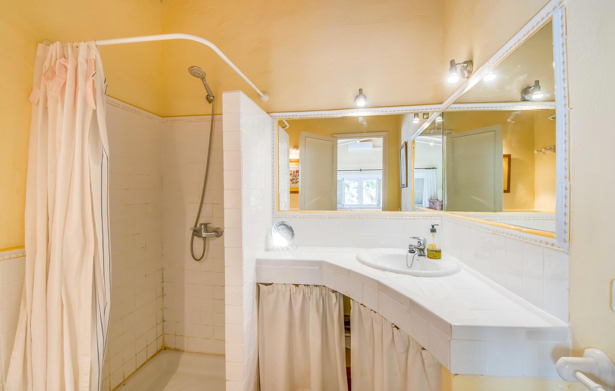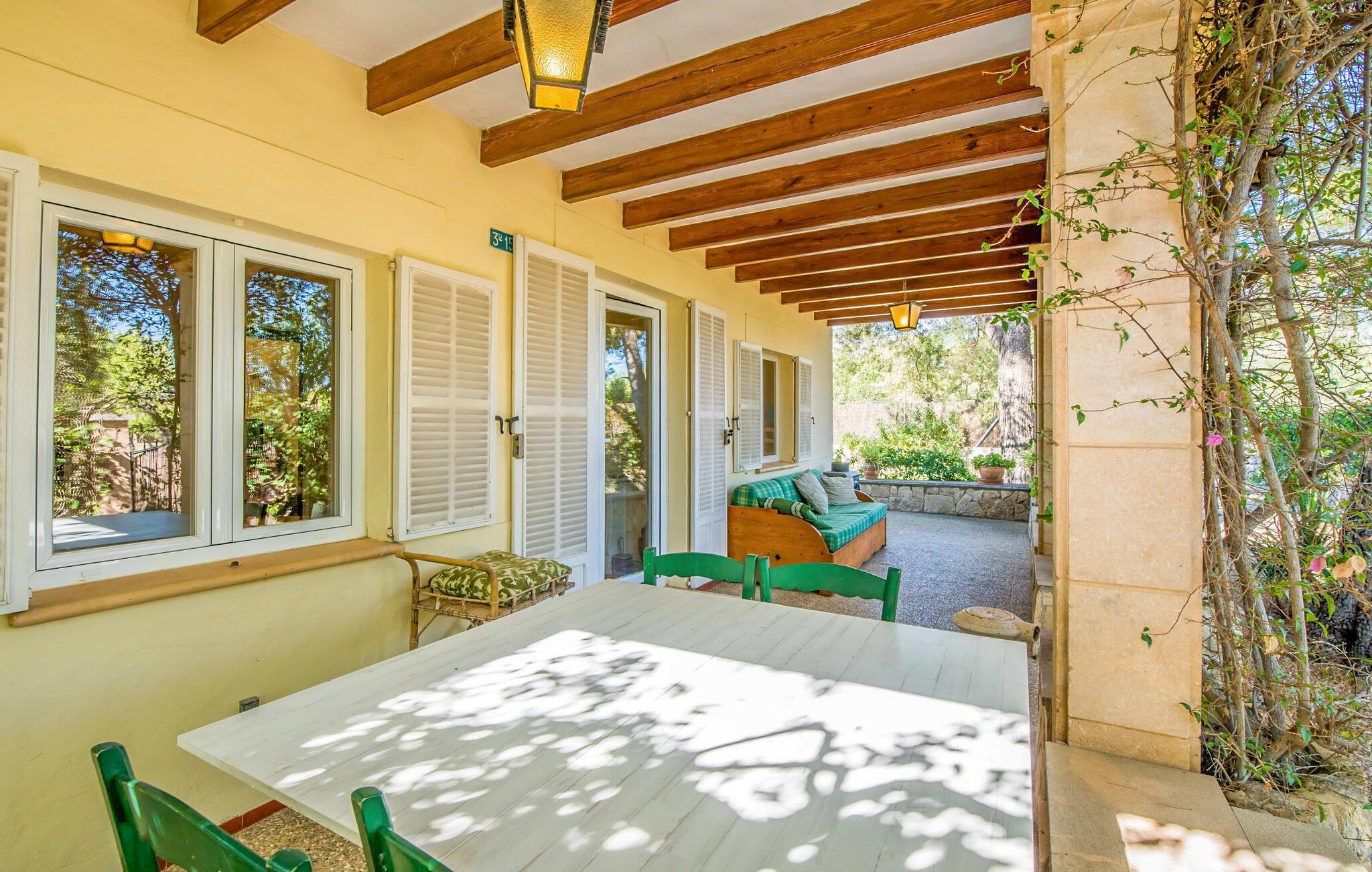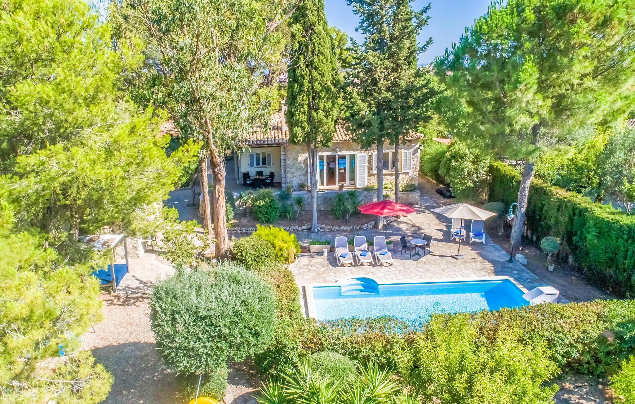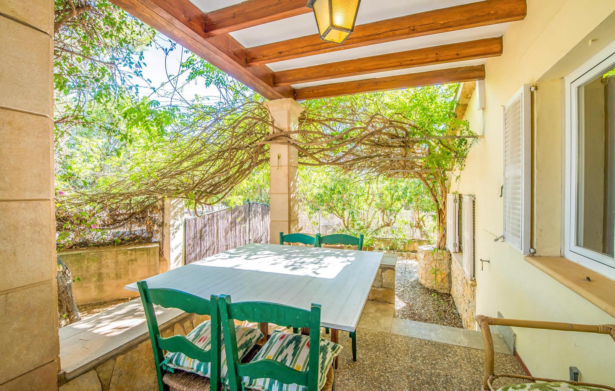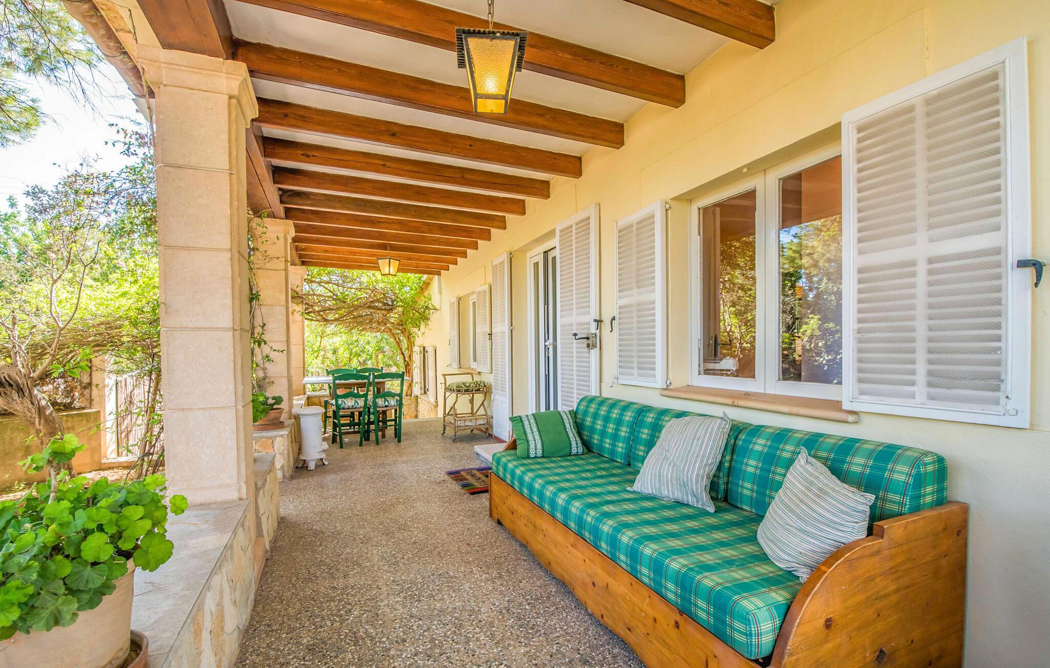 Villaen “Can Reure” ligger præcis mellem Mancor de la Vall og Inca; Begge steder kan nås på kun fem minutter i bil. På den rustikke, 2.500 m² store ejendom finder I talrige mandeltræer, som giver et strejf af typisk mallorcansk flair og samtidig giver udendørsområdet en vis hygge. Små hække, vægge og den store mængde natursten og småsten passer harmonisk ind og understreger denne stemning yderligere. Udeområdets midtpunkt er poolen, som er let tilgængelig via en halvcirkelformet trappe og giver en uforlignelig forfriskning på varme dage. I kan slappe meget af på liggestolene og virkelig nyde middelhavssolen. I tilfælde af at UV-strålingen bliver for stærk, er en parasol tilgængelig. I kan selvfølgelig også bruge lidt tid i et af de luftige, naturligt skyggefulde områder, der dukker op hist og her. Fra poolterrassen direkte foran huset kan I virkelig nyde og nyde den vidunderlige udsigt over bjergene. Den overdækkede grillplads er perfekt til kulinariske aftener ved grillen, mens I er sammen som en gruppe. Den gamle, delvist renoverede, et-etagers bygning har et samlet areal på 160 m² og består af en gang, et opholdsrum, et køkken, to soveværelser og to badeværelser, hvoraf det ene er en-suite. Et af soveværelserne er tilgængelige via et par trin, der fører ned. Soveværelserne er individuelt og komfortabelt indrettede og er beregnet til at skabe en behagelig ramme for en afslappende nattesøvn. I den kombinerede stue/spisestue inviterer de smukke ternede lænestole til afslapning og på køligere aftener giver pejsen ekstra varme og hygge. Har I lyst til at spise indenfor, er der et smukt fritstående træbord i stuen. På den komfortable sofa kan I nyde den smukke udsigt over Tramuntana-bjergene, mens I læser en god bog fra det lille bibliotek. Køkkenet er ideelt til at opfylde jeres daglige behov og byder på alt fra en kedel til en filterkaffemaskine. Badeværelserne er både funktionelt udstyrede og venlige. Et strygejern og en hårtørrer er tilgængelige og kan selvfølgelig bruges af gæster. Inkaområdet er en ideel base for at udforske den imponerende nordlige kyst- og bjergregion. Under jeres ophold på Villa "San Reure" er I sikker på at tage mindst én naturskøn køretur over bakkerne for at observere og beundre den uforglemmelige betagende udsigt. Der er også talrige maleriske strande og nicher, som kan besøges herfra, herunder Playa del Muro eller Platja des Morer Vermell (begge omkring 30 minutter væk i bil). Der er en livlig atmosfære i det nærliggende Inca. Denne by er især kendt for sin lokale læderindustri. Her produceres sko fra det populære mærke “Camper”. I kælderrestauranterne finder I store vintønder stablet højt. Der kan I smage typiske mallorcanske retter og regionale vine. Beliggenheden tæt på forbindelsesvejen bringer en del trafikstøj med sig, men den tilbyder også en fremragende, bekvem beliggenhed, så I nemt kan nå de nærmeste byer og steder i alle retninger. I det indre af øen, kun 2 km fra den berømte "læderby" Inca, ligger den smukke villa "Can Reure". Ejendommen er bygget i rustik mallorcansk stil og tilbyder en spektakulær udsigt over Tramuntana-bjergene. På grund af sin beliggenhed i hjertet af øen kan I hurtigt nå Mallorcas talrige og varierede strande fra villaen.