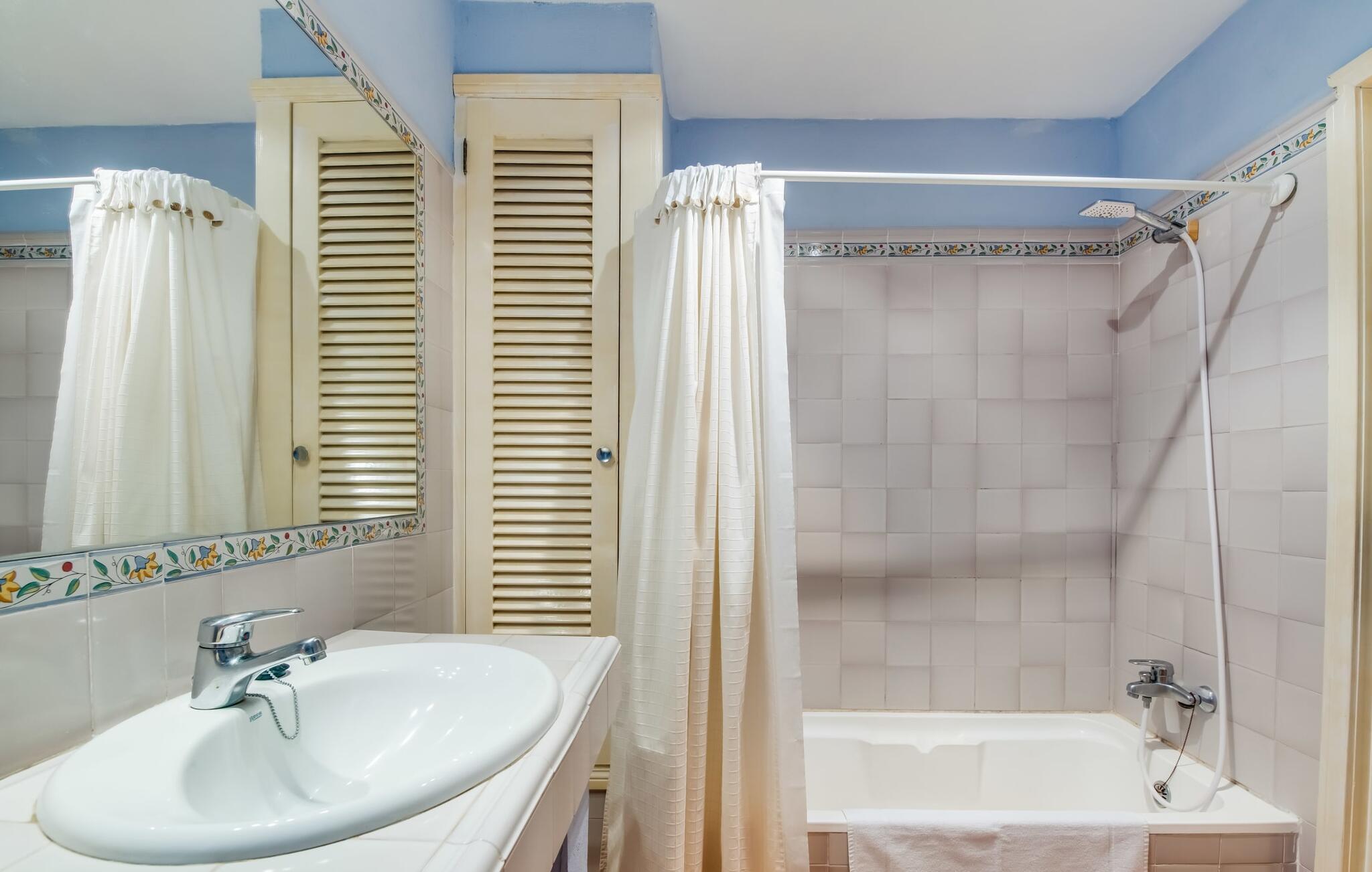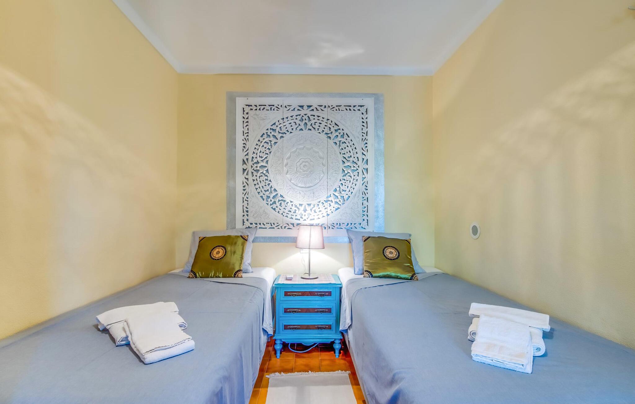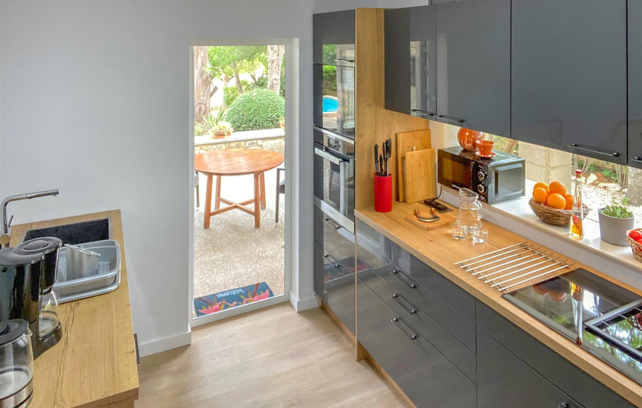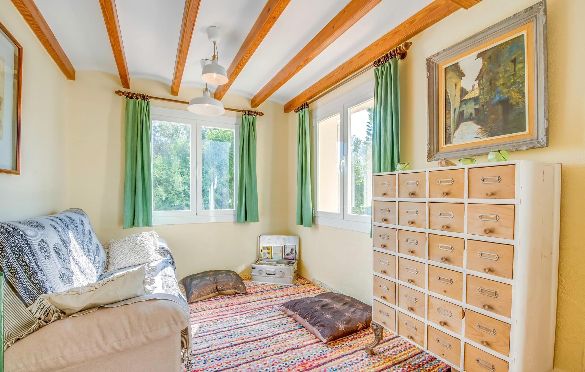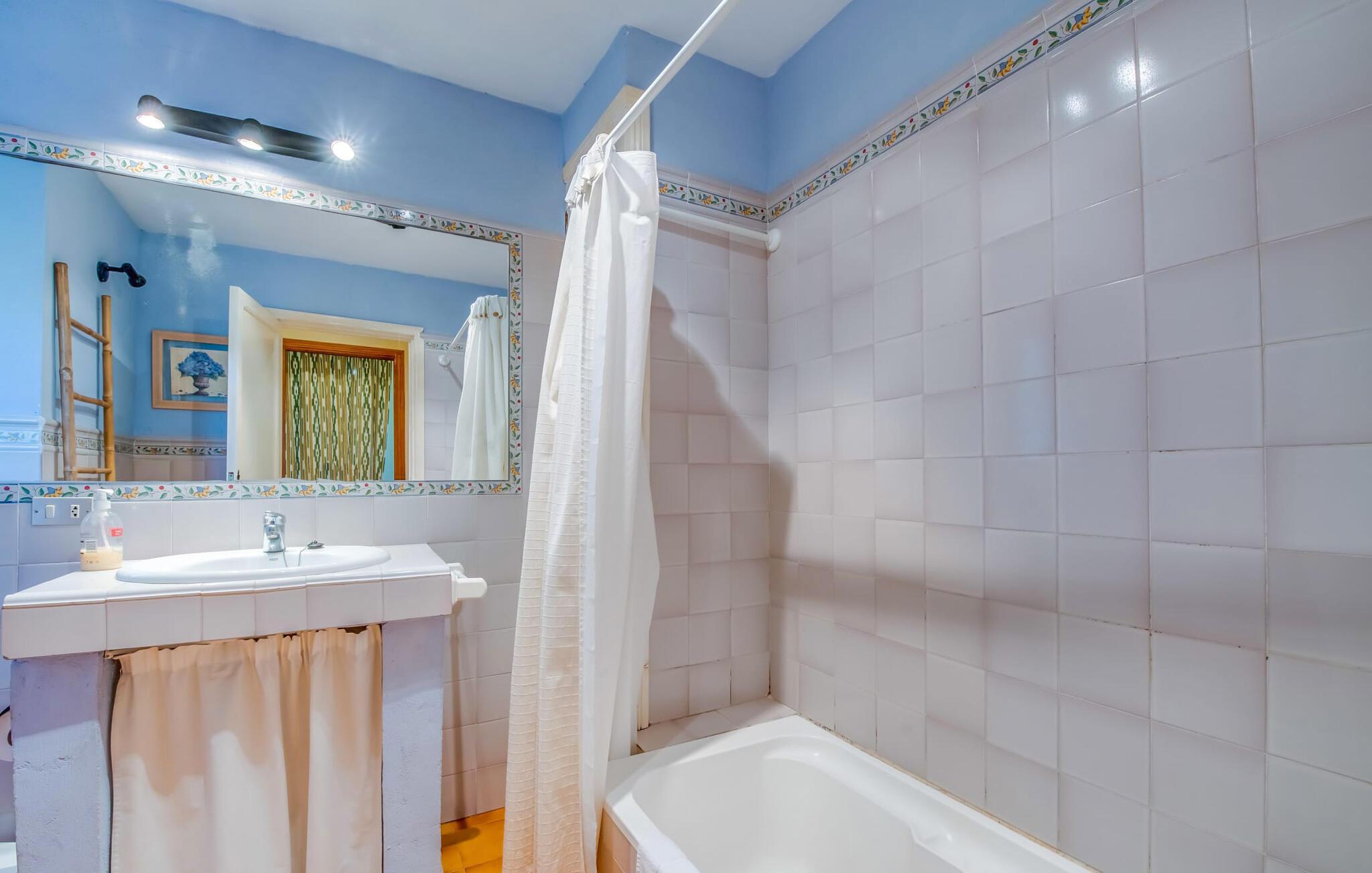 Villaen “Can Reure” ligger præcis mellem Mancor de la Vall og Inca; Begge steder kan nås på kun fem minutter i bil. På den rustikke, 2.500 m² store ejendom finder I talrige mandeltræer, som giver et strejf af typisk mallorcansk flair og samtidig giver udendørsområdet en vis hygge. Små hække, vægge og den store mængde natursten og småsten passer harmonisk ind og understreger denne stemning yderligere. Udeområdets midtpunkt er poolen, som er let tilgængelig via en halvcirkelformet trappe og giver en uforlignelig forfriskning på varme dage. I kan slappe meget af på liggestolene og virkelig nyde middelhavssolen. I tilfælde af at UV-strålingen bliver for stærk, er en parasol tilgængelig. I kan selvfølgelig også bruge lidt tid i et af de luftige, naturligt skyggefulde områder, der dukker op hist og her. Fra poolterrassen direkte foran huset kan I virkelig nyde og nyde den vidunderlige udsigt over bjergene. Den overdækkede grillplads er perfekt til kulinariske aftener ved grillen, mens I er sammen som en gruppe. Den gamle, delvist renoverede, et-etagers bygning har et samlet areal på 160 m² og består af en gang, et opholdsrum, et køkken, to soveværelser og to badeværelser, hvoraf det ene er en-suite. Et af soveværelserne er tilgængelige via et par trin, der fører ned. Soveværelserne er individuelt og komfortabelt indrettede og er beregnet til at skabe en behagelig ramme for en afslappende nattesøvn. I den kombinerede stue/spisestue inviterer de smukke ternede lænestole til afslapning og på køligere aftener giver pejsen ekstra varme og hygge. Har I lyst til at spise indenfor, er der et smukt fritstående træbord i stuen. På den komfortable sofa kan I nyde den smukke udsigt over Tramuntana-bjergene, mens I læser en god bog fra det lille bibliotek. Køkkenet er ideelt til at opfylde jeres daglige behov og byder på alt fra en kedel til en filterkaffemaskine. Badeværelserne er både funktionelt udstyrede og venlige. Et strygejern og en hårtørrer er tilgængelige og kan selvfølgelig bruges af gæster. Inkaområdet er en ideel base for at udforske den imponerende nordlige kyst- og bjergregion. Under jeres ophold på Villa "San Reure" er I sikker på at tage mindst én naturskøn køretur over bakkerne for at observere og beundre den uforglemmelige betagende udsigt. Der er også talrige maleriske strande og nicher, som kan besøges herfra, herunder Playa del Muro eller Platja des Morer Vermell (begge omkring 30 minutter væk i bil). Der er en livlig atmosfære i det nærliggende Inca. Denne by er især kendt for sin lokale læderindustri. Her produceres sko fra det populære mærke “Camper”. I kælderrestauranterne finder I store vintønder stablet højt. Der kan I smage typiske mallorcanske retter og regionale vine. Beliggenheden tæt på forbindelsesvejen bringer en del trafikstøj med sig, men den tilbyder også en fremragende, bekvem beliggenhed, så I nemt kan nå de nærmeste byer og steder i alle retninger. I det indre af øen, kun 2 km fra den berømte "læderby" Inca, ligger den smukke villa "Can Reure". Ejendommen er bygget i rustik mallorcansk stil og tilbyder en spektakulær udsigt over Tramuntana-bjergene. På grund af sin beliggenhed i hjertet af øen kan I hurtigt nå Mallorcas talrige og varierede strande fra villaen.