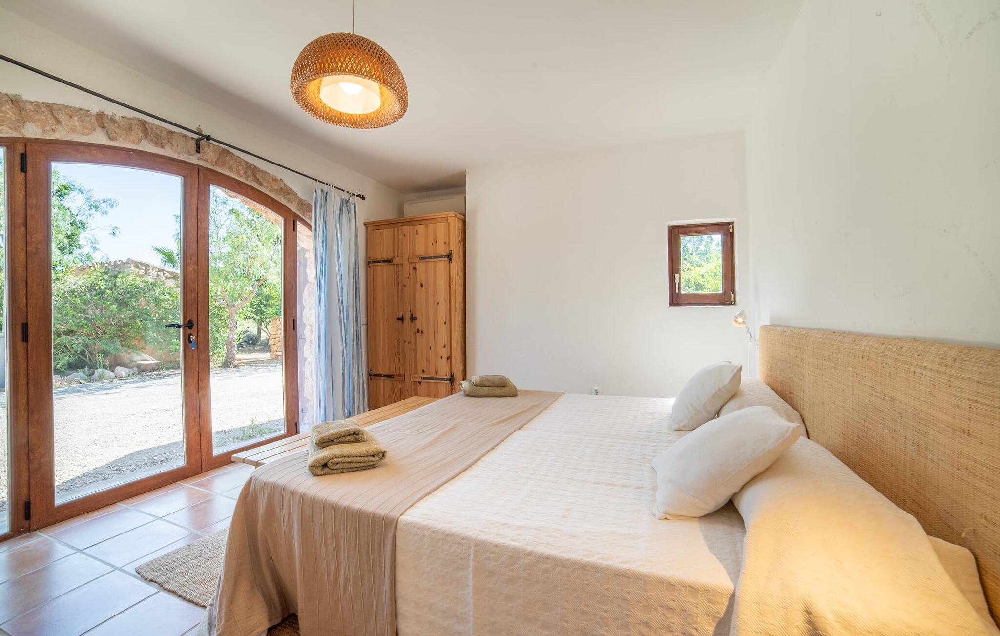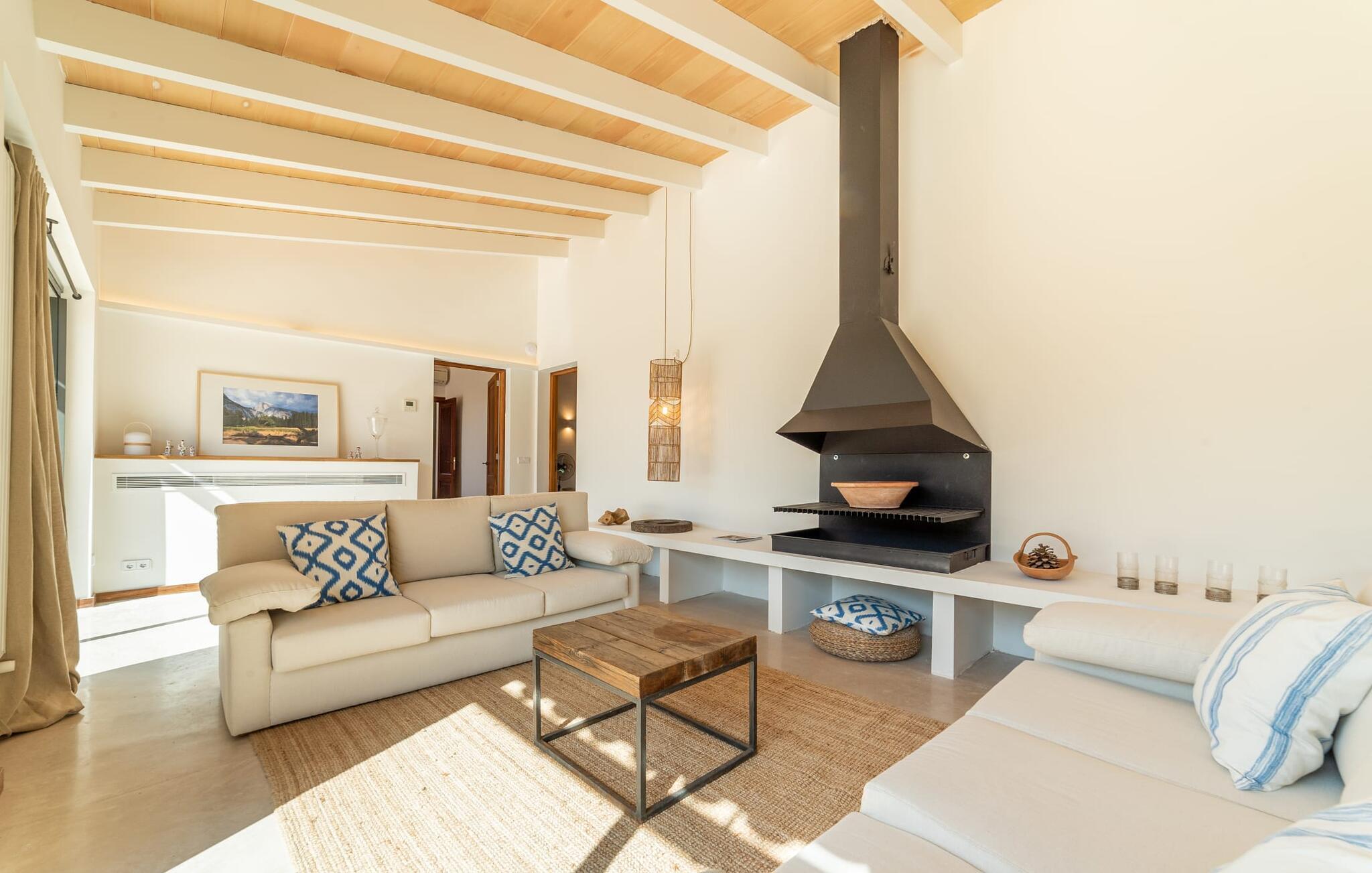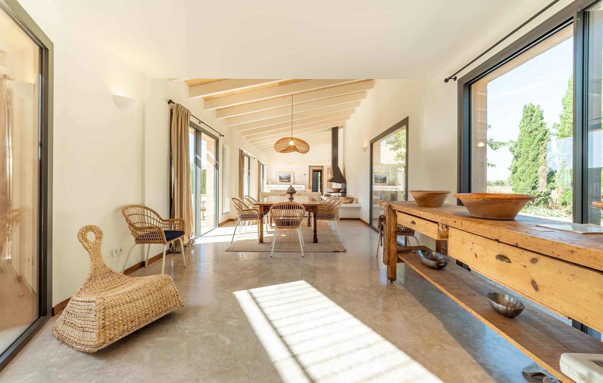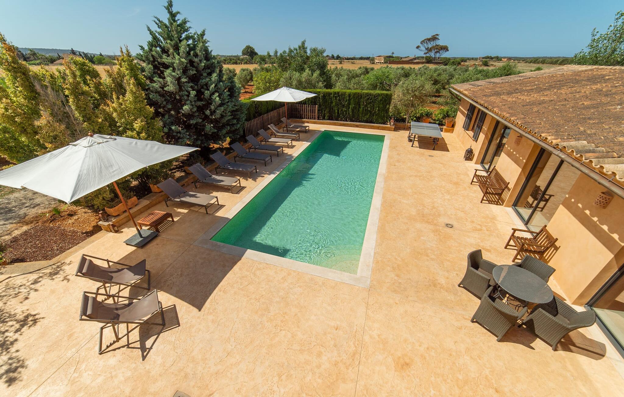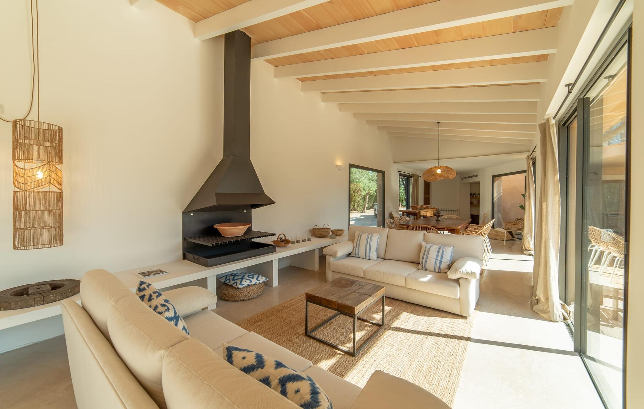 Denne vintage finca er blevet fuldstændig renoveret, mens den har bevaret den originale charme fra et mallorcansk landsted. Fincaen "Can Riera d'Es Trenc" imponerer sine gæster med en harmonisk stemning bestående af en naturstensfacade og glatte pudsede overflader, som kombineres med moderne møbler og ekstraudstyr i udendørsområdet. Beliggende i en beskyttende mur af cypres-, oliven- og frugttræer, er alt koncentreret i hjertet af ejendommen: det luksuriøse poolområde med den omkringliggende terrasse. Poolen er flisebelagt med turkisgrøn mosaik og tilbyder en praktisk hjørneindgang og lav dybde. Den støder op til en terrasse med adskillige yderst attraktive liggestole i træ og er ergonomisk designet. De ekstra sæder er frit indrettet og kan efter ønske placeres i skygge eller i solen. Den sydvendte ejendom består af to dele: Hovedhuset med to etager og en overdækket terrasse, som rummer både spisestue og en hyggelig overdækket veranda, og "poolhuset" med to soveværelser. Annekset byder også på en stor terrasse, bordtennis og bordfodbold. Så intet står i vejen for en afslappet grillaften med en sjov faktor. Uanset om I rejser med to eller tre familier eller vennepar - fincaen "Can Riera d'Es Trenc" er simpelthen perfekt for op til tolv personer, især fordi boligen er i hovedhuset og poolhuset. Fire dobbeltværelser er i "moderhuset" og de to andre i annekset. Særlig bekvemt er, at 5 af de 6 værelser har eget badeværelse, hvilket sammen med endnu et badeværelse resulterer i i alt 6 komplette håndvaske, så privatlivets fred er vidunderligt bevaret. Badeværelserne, der er renoveret med stor sans for detaljer, imponerer med individuelle fliser, brusere fra gulv til loft, iøjnefaldende håndvaske og generel fashionabel chic. Der er også et ensartet farvekoncept i alle værelser med aircondition (!). Det ser behageligt og sobert ud, tidløst, fordi hvidt med grå og beige accenter skaber en behagelig glans ved siden af træbjælkerne og dørene. Det unægteligt varme materiale træ finder alligevel sit formål - som i den lyse stue med pejs, sofaernes lyse atmosfære og det indirekte lyskoncept for enestående komfort. Spisebordet ser særligt godt ud med sin tykke træplanke. Et rummeligt køkken i rustik og dog minimalistisk stil med træfronter. Et hyggeligt opholdsområde og de bløde farver på væggene fuldender billedet af et progressivt landkøkken med absolut komfort. Begge områder er designet, så gæsten føler sig godt tilpas i den trendy sommerhusstil og føler sig hjemme på ferien. Det er ejeren klart lykkedes med. Men fra tid til anden vil I gerne forlade drømmeejendommen "Can Riera d'Es Trenc" for at udforske og forstå den smukke sydlige del af øen på nemme og sjove udflugter, der kan tage jer til at besøge en polobane eller stranden. I den stille sydlige del af øen kan I opleve livet i det mallorcanske landskab, hvor der stadig udvindes salt i dag, hvilket også er derfra stednavnet “Ses Salines”. Det er ikke kun værd at besøge Campos, Ses Salines eller Santanyí på markedsdage. Der kan I opdage mallorcinsk arkitekturs storhedstid, når I går gennem husene lavet af gylden, grå og hvid sandsten. Fincaen ligger mellem landsbyen og stranden. For naturelskere er fincaen et godt udgangspunkt for udflugter til fods eller på cykel og for at observere flamingoer og trækfugle, når det er tid til at vandre fra Campos saltsletter. Derfor er placeringen af fincaen ideel til at starte ruter, der tager jer til smukke kystlandsbyer og drømmestrande som den naturlige strand med krystalklart vand i Es Trenc. Ren afslapning! Den charmerende villa "Can Riera d'Es Trenc" er beliggende i kvadranten af Campos, Ses Salines, Colonia de Sant Jordi og Es Trenc, i den smukke sydlige region Mallorca, hvor landbrug, olivenlunde og saltproduktion dominerer det samlede billede . Indkøb til daglige behov kan foregå i Campos eller Ses Salines, hvor det ugentlige landmandsmarked også finder sted hver tirsdag eller torsdag. Særligt bemærkelsesværdig er nærheden til de smukke strande på sydkysten, Ses Covetes eller Es Trenc, som kun ligger 6 km væk.