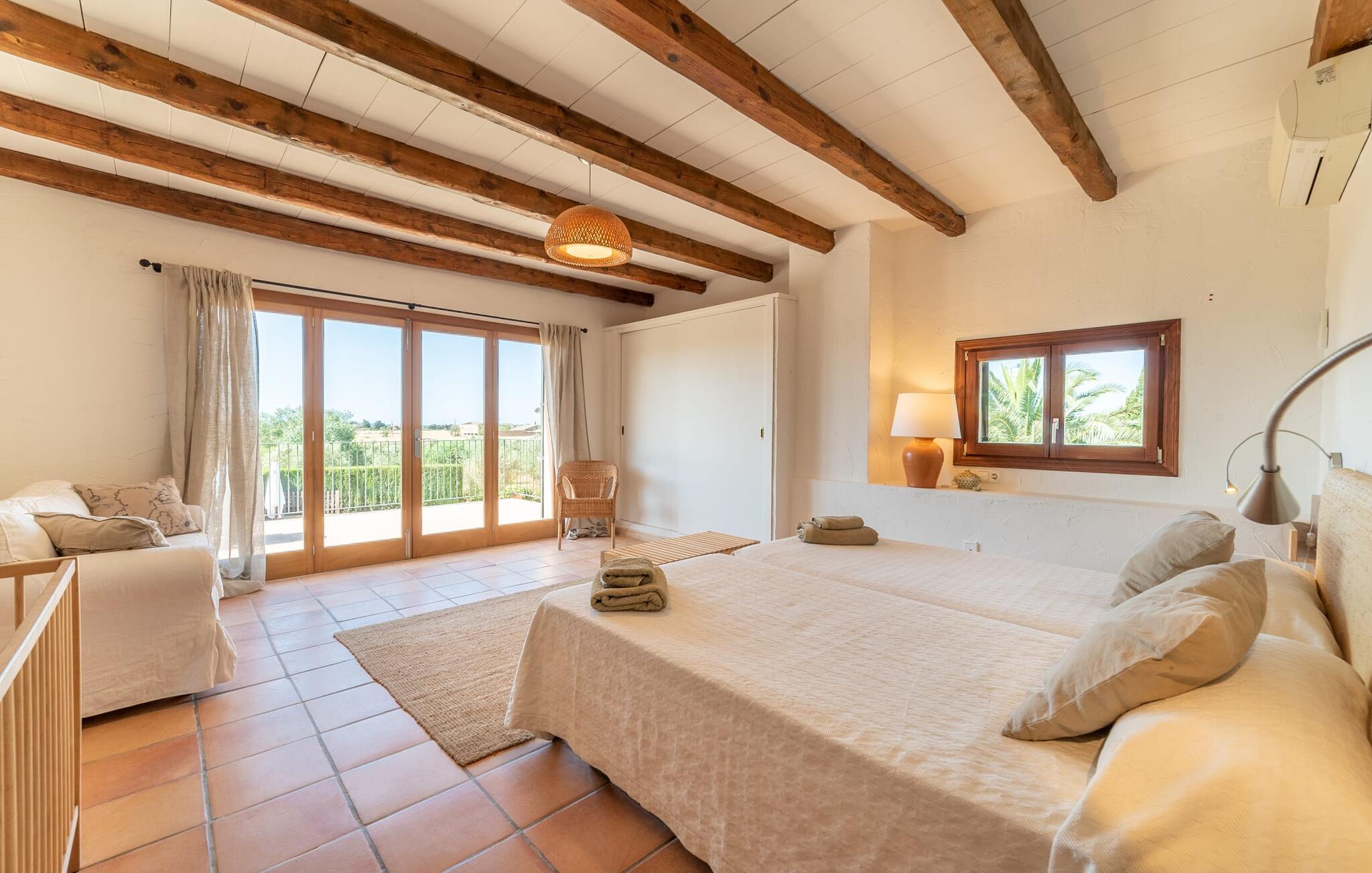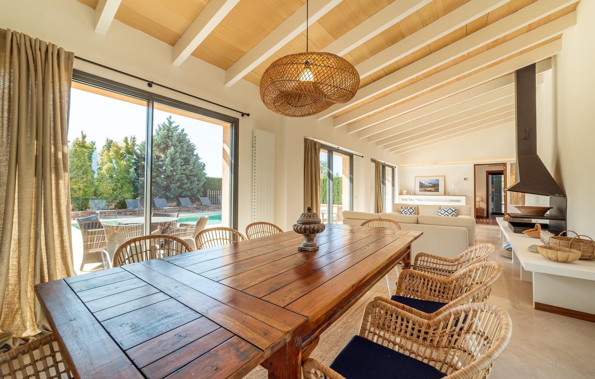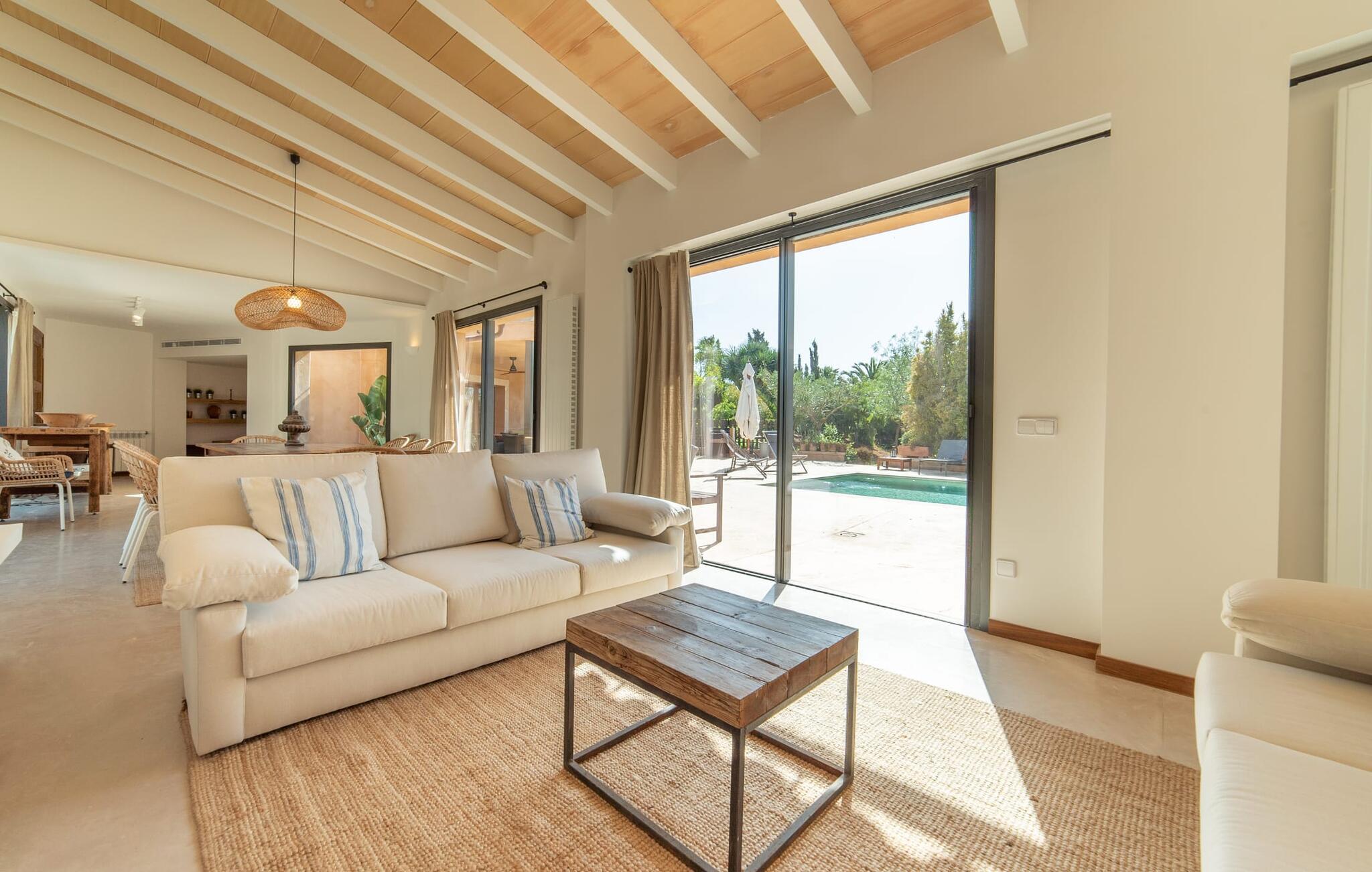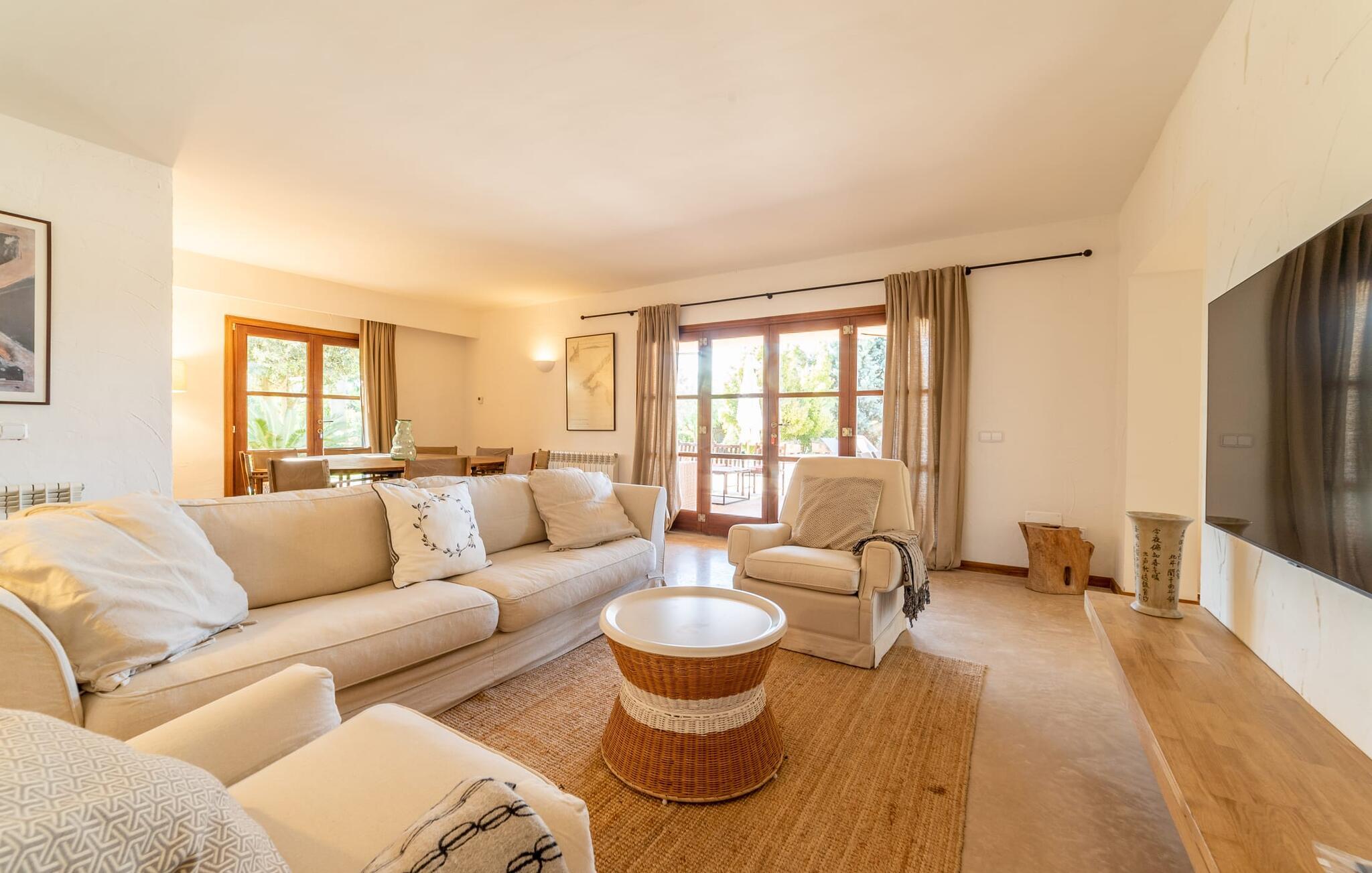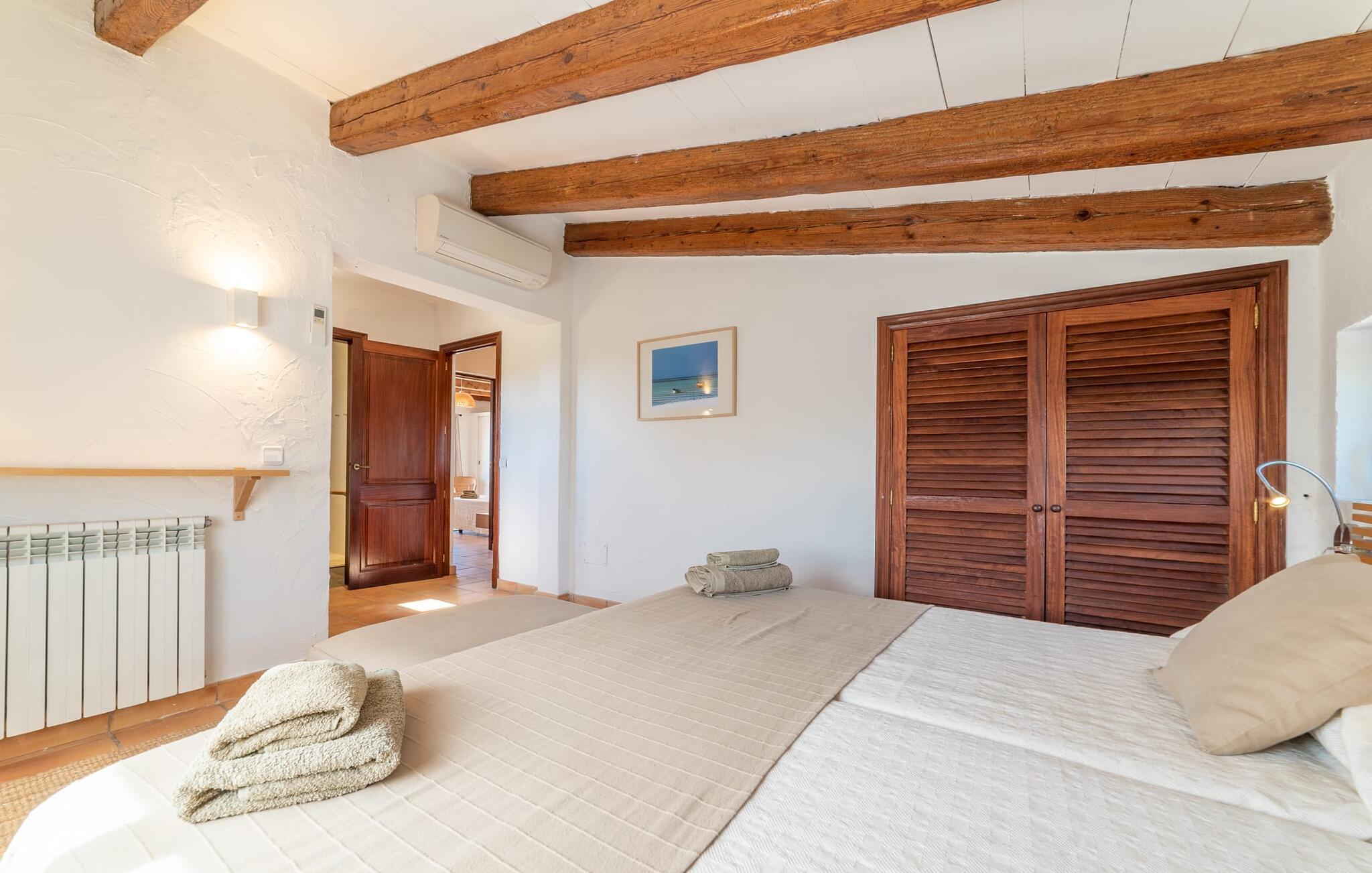 Denne vintage finca er blevet fuldstændig renoveret, mens den har bevaret den originale charme fra et mallorcansk landsted. Fincaen "Can Riera d'Es Trenc" imponerer sine gæster med en harmonisk stemning bestående af en naturstensfacade og glatte pudsede overflader, som kombineres med moderne møbler og ekstraudstyr i udendørsområdet. Beliggende i en beskyttende mur af cypres-, oliven- og frugttræer, er alt koncentreret i hjertet af ejendommen: det luksuriøse poolområde med den omkringliggende terrasse. Poolen er flisebelagt med turkisgrøn mosaik og tilbyder en praktisk hjørneindgang og lav dybde. Den støder op til en terrasse med adskillige yderst attraktive liggestole i træ og er ergonomisk designet. De ekstra sæder er frit indrettet og kan efter ønske placeres i skygge eller i solen. Den sydvendte ejendom består af to dele: Hovedhuset med to etager og en overdækket terrasse, som rummer både spisestue og en hyggelig overdækket veranda, og "poolhuset" med to soveværelser. Annekset byder også på en stor terrasse, bordtennis og bordfodbold. Så intet står i vejen for en afslappet grillaften med en sjov faktor. Uanset om I rejser med to eller tre familier eller vennepar - fincaen "Can Riera d'Es Trenc" er simpelthen perfekt for op til tolv personer, især fordi boligen er i hovedhuset og poolhuset. Fire dobbeltværelser er i "moderhuset" og de to andre i annekset. Særlig bekvemt er, at 5 af de 6 værelser har eget badeværelse, hvilket sammen med endnu et badeværelse resulterer i i alt 6 komplette håndvaske, så privatlivets fred er vidunderligt bevaret. Badeværelserne, der er renoveret med stor sans for detaljer, imponerer med individuelle fliser, brusere fra gulv til loft, iøjnefaldende håndvaske og generel fashionabel chic. Der er også et ensartet farvekoncept i alle værelser med aircondition (!). Det ser behageligt og sobert ud, tidløst, fordi hvidt med grå og beige accenter skaber en behagelig glans ved siden af træbjælkerne og dørene. Det unægteligt varme materiale træ finder alligevel sit formål - som i den lyse stue med pejs, sofaernes lyse atmosfære og det indirekte lyskoncept for enestående komfort. Spisebordet ser særligt godt ud med sin tykke træplanke. Et rummeligt køkken i rustik og dog minimalistisk stil med træfronter. Et hyggeligt opholdsområde og de bløde farver på væggene fuldender billedet af et progressivt landkøkken med absolut komfort. Begge områder er designet, så gæsten føler sig godt tilpas i den trendy sommerhusstil og føler sig hjemme på ferien. Det er ejeren klart lykkedes med. Men fra tid til anden vil I gerne forlade drømmeejendommen "Can Riera d'Es Trenc" for at udforske og forstå den smukke sydlige del af øen på nemme og sjove udflugter, der kan tage jer til at besøge en polobane eller stranden. I den stille sydlige del af øen kan I opleve livet i det mallorcanske landskab, hvor der stadig udvindes salt i dag, hvilket også er derfra stednavnet “Ses Salines”. Det er ikke kun værd at besøge Campos, Ses Salines eller Santanyí på markedsdage. Der kan I opdage mallorcinsk arkitekturs storhedstid, når I går gennem husene lavet af gylden, grå og hvid sandsten. Fincaen ligger mellem landsbyen og stranden. For naturelskere er fincaen et godt udgangspunkt for udflugter til fods eller på cykel og for at observere flamingoer og trækfugle, når det er tid til at vandre fra Campos saltsletter. Derfor er placeringen af fincaen ideel til at starte ruter, der tager jer til smukke kystlandsbyer og drømmestrande som den naturlige strand med krystalklart vand i Es Trenc. Ren afslapning! Den charmerende villa "Can Riera d'Es Trenc" er beliggende i kvadranten af Campos, Ses Salines, Colonia de Sant Jordi og Es Trenc, i den smukke sydlige region Mallorca, hvor landbrug, olivenlunde og saltproduktion dominerer det samlede billede . Indkøb til daglige behov kan foregå i Campos eller Ses Salines, hvor det ugentlige landmandsmarked også finder sted hver tirsdag eller torsdag. Særligt bemærkelsesværdig er nærheden til de smukke strande på sydkysten, Ses Covetes eller Es Trenc, som kun ligger 6 km væk.