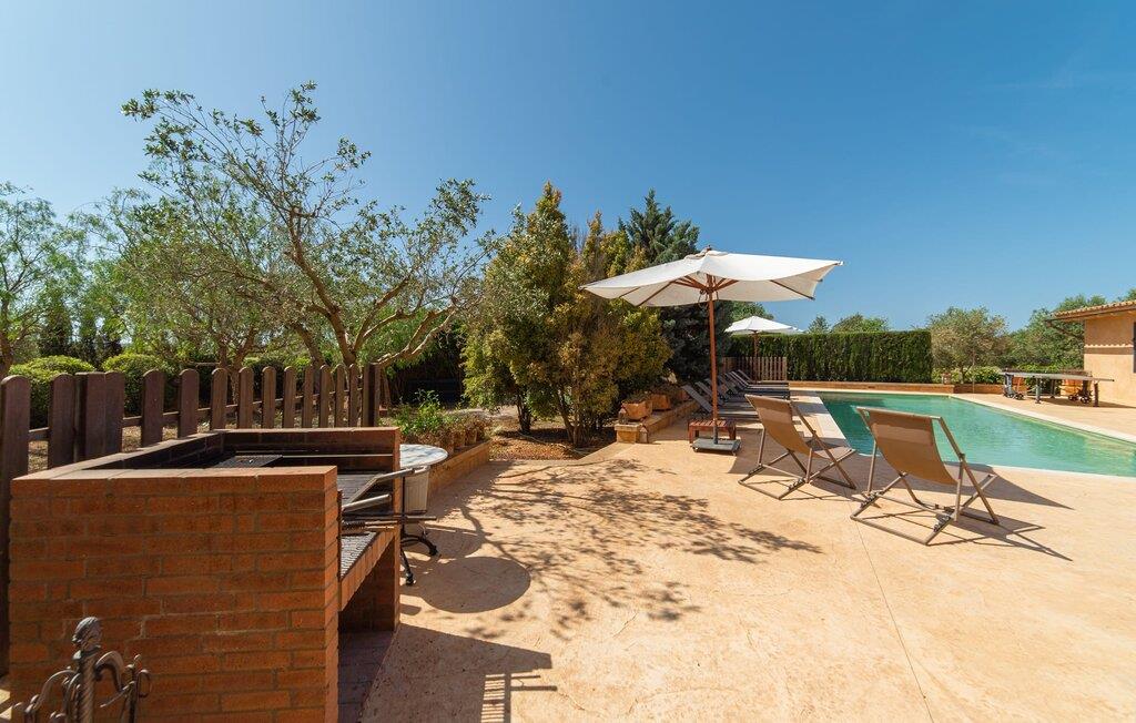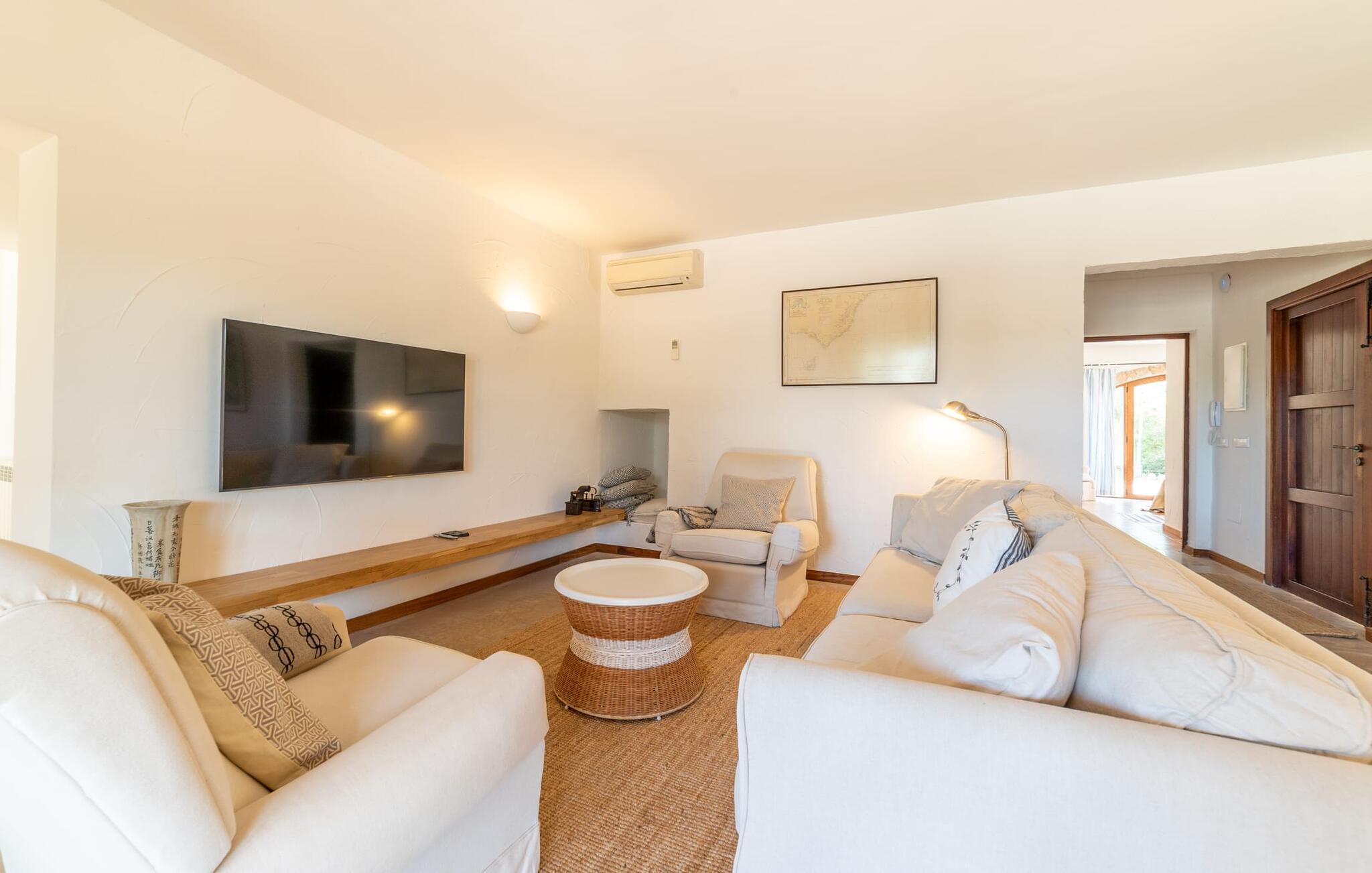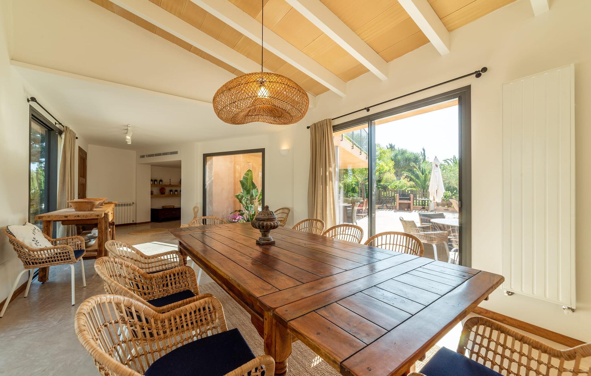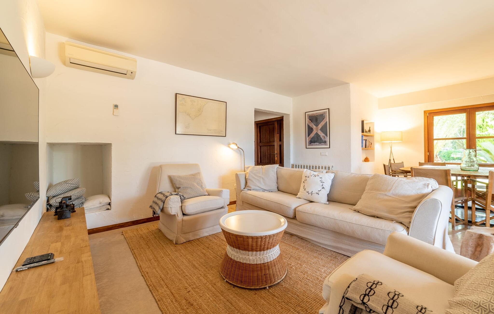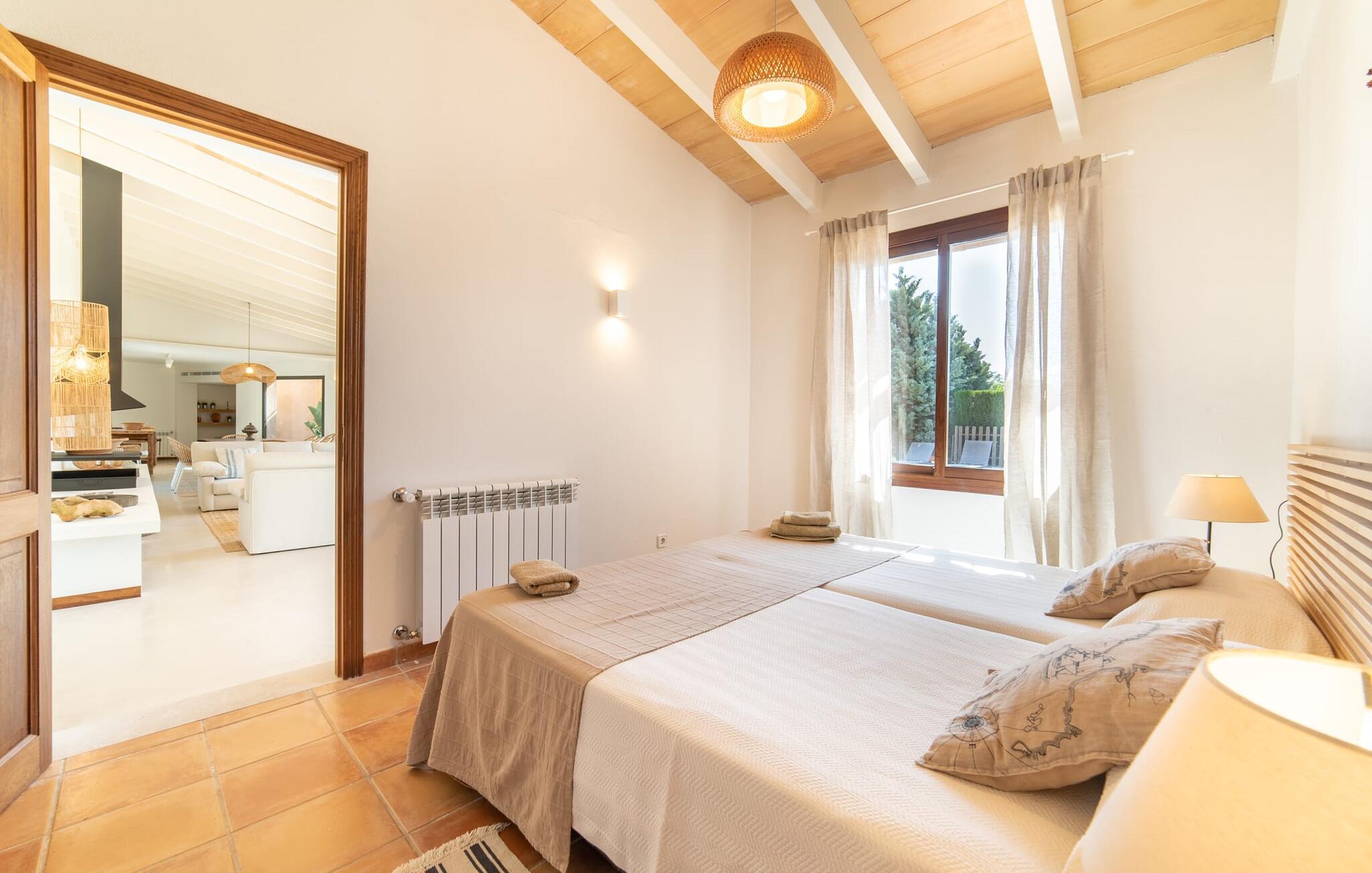 Denne vintage finca er blevet fuldstændig renoveret, mens den har bevaret den originale charme fra et mallorcansk landsted. Fincaen "Can Riera d'Es Trenc" imponerer sine gæster med en harmonisk stemning bestående af en naturstensfacade og glatte pudsede overflader, som kombineres med moderne møbler og ekstraudstyr i udendørsområdet. Beliggende i en beskyttende mur af cypres-, oliven- og frugttræer, er alt koncentreret i hjertet af ejendommen: det luksuriøse poolområde med den omkringliggende terrasse. Poolen er flisebelagt med turkisgrøn mosaik og tilbyder en praktisk hjørneindgang og lav dybde. Den støder op til en terrasse med adskillige yderst attraktive liggestole i træ og er ergonomisk designet. De ekstra sæder er frit indrettet og kan efter ønske placeres i skygge eller i solen. Den sydvendte ejendom består af to dele: Hovedhuset med to etager og en overdækket terrasse, som rummer både spisestue og en hyggelig overdækket veranda, og "poolhuset" med to soveværelser. Annekset byder også på en stor terrasse, bordtennis og bordfodbold. Så intet står i vejen for en afslappet grillaften med en sjov faktor. Uanset om I rejser med to eller tre familier eller vennepar - fincaen "Can Riera d'Es Trenc" er simpelthen perfekt for op til tolv personer, især fordi boligen er i hovedhuset og poolhuset. Fire dobbeltværelser er i "moderhuset" og de to andre i annekset. Særlig bekvemt er, at 5 af de 6 værelser har eget badeværelse, hvilket sammen med endnu et badeværelse resulterer i i alt 6 komplette håndvaske, så privatlivets fred er vidunderligt bevaret. Badeværelserne, der er renoveret med stor sans for detaljer, imponerer med individuelle fliser, brusere fra gulv til loft, iøjnefaldende håndvaske og generel fashionabel chic. Der er også et ensartet farvekoncept i alle værelser med aircondition (!). Det ser behageligt og sobert ud, tidløst, fordi hvidt med grå og beige accenter skaber en behagelig glans ved siden af træbjælkerne og dørene. Det unægteligt varme materiale træ finder alligevel sit formål - som i den lyse stue med pejs, sofaernes lyse atmosfære og det indirekte lyskoncept for enestående komfort. Spisebordet ser særligt godt ud med sin tykke træplanke. Et rummeligt køkken i rustik og dog minimalistisk stil med træfronter. Et hyggeligt opholdsområde og de bløde farver på væggene fuldender billedet af et progressivt landkøkken med absolut komfort. Begge områder er designet, så gæsten føler sig godt tilpas i den trendy sommerhusstil og føler sig hjemme på ferien. Det er ejeren klart lykkedes med. Men fra tid til anden vil I gerne forlade drømmeejendommen "Can Riera d'Es Trenc" for at udforske og forstå den smukke sydlige del af øen på nemme og sjove udflugter, der kan tage jer til at besøge en polobane eller stranden. I den stille sydlige del af øen kan I opleve livet i det mallorcanske landskab, hvor der stadig udvindes salt i dag, hvilket også er derfra stednavnet “Ses Salines”. Det er ikke kun værd at besøge Campos, Ses Salines eller Santanyí på markedsdage. Der kan I opdage mallorcinsk arkitekturs storhedstid, når I går gennem husene lavet af gylden, grå og hvid sandsten. Fincaen ligger mellem landsbyen og stranden. For naturelskere er fincaen et godt udgangspunkt for udflugter til fods eller på cykel og for at observere flamingoer og trækfugle, når det er tid til at vandre fra Campos saltsletter. Derfor er placeringen af fincaen ideel til at starte ruter, der tager jer til smukke kystlandsbyer og drømmestrande som den naturlige strand med krystalklart vand i Es Trenc. Ren afslapning! Den charmerende villa "Can Riera d'Es Trenc" er beliggende i kvadranten af Campos, Ses Salines, Colonia de Sant Jordi og Es Trenc, i den smukke sydlige region Mallorca, hvor landbrug, olivenlunde og saltproduktion dominerer det samlede billede . Indkøb til daglige behov kan foregå i Campos eller Ses Salines, hvor det ugentlige landmandsmarked også finder sted hver tirsdag eller torsdag. Særligt bemærkelsesværdig er nærheden til de smukke strande på sydkysten, Ses Covetes eller Es Trenc, som kun ligger 6 km væk.