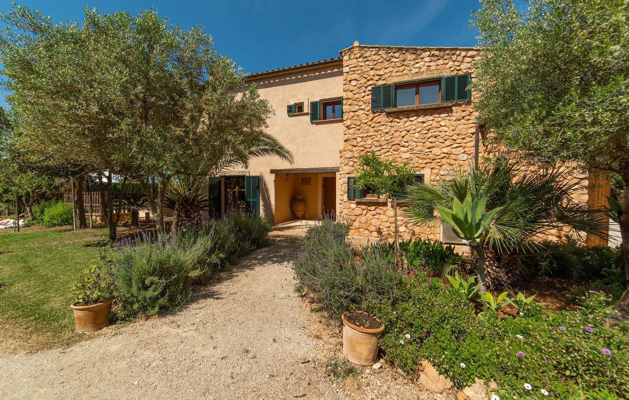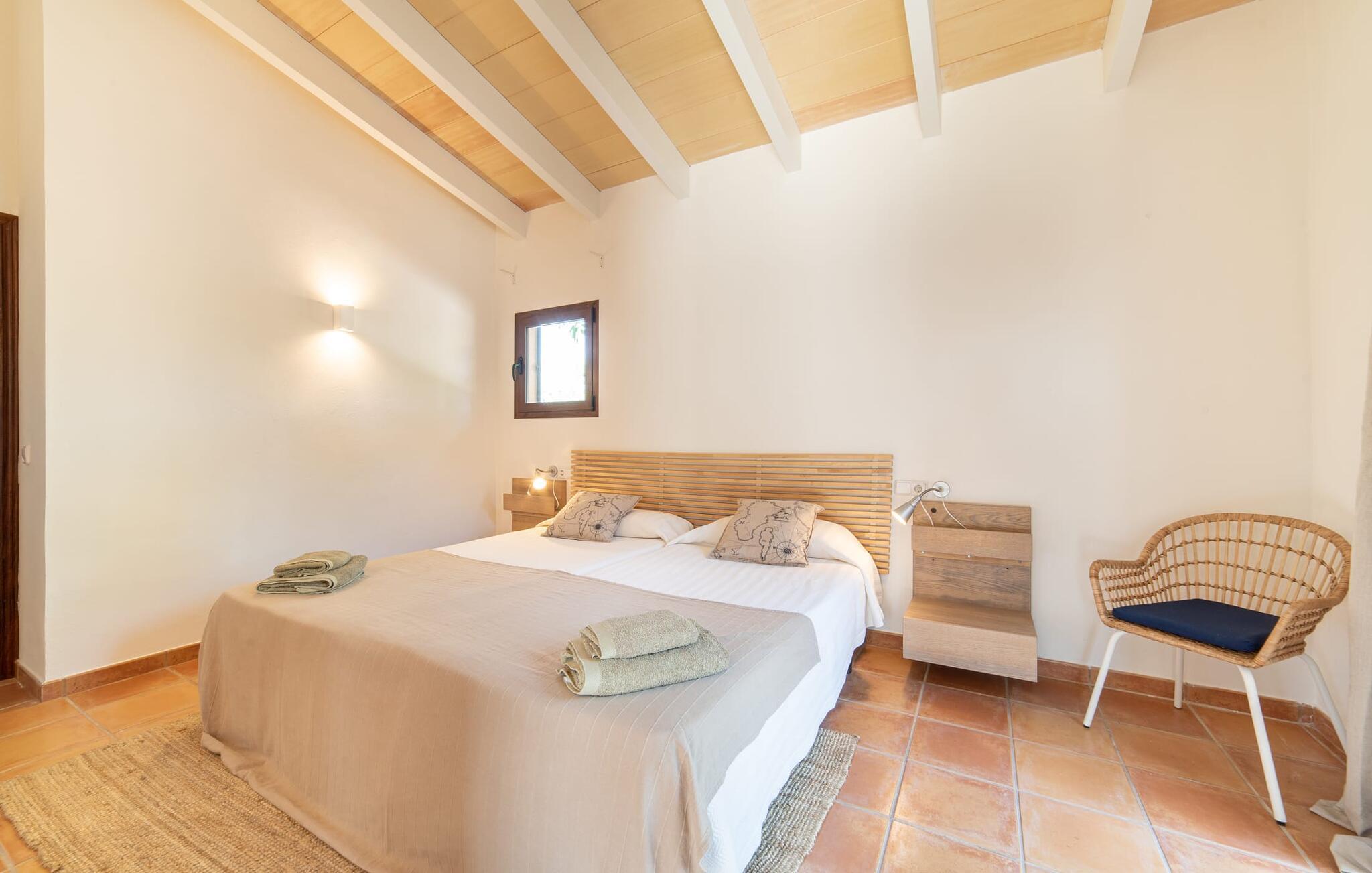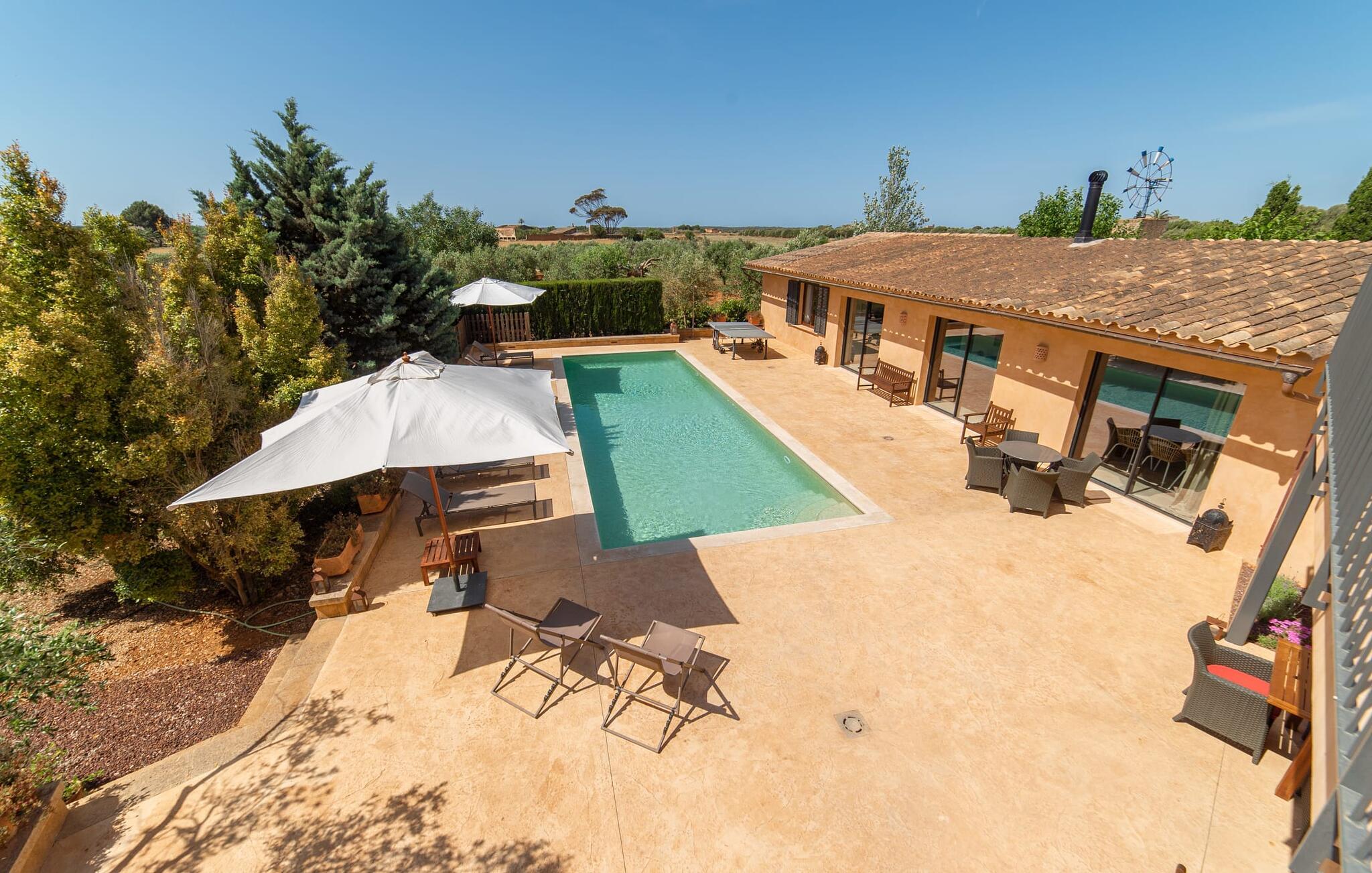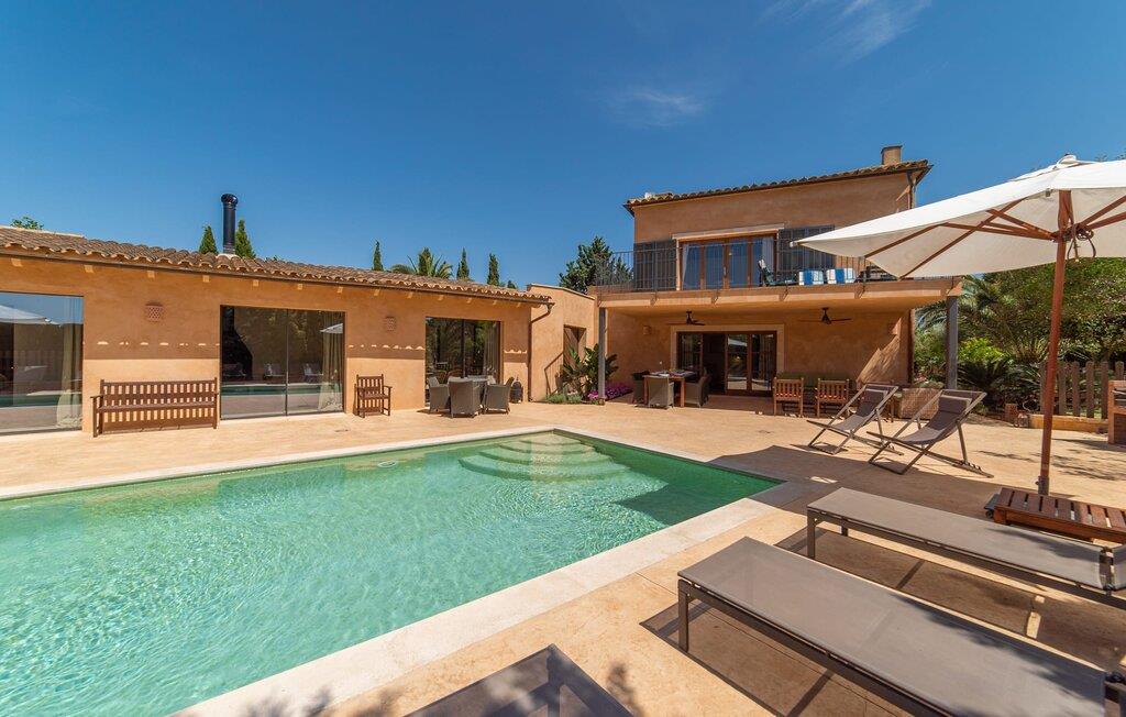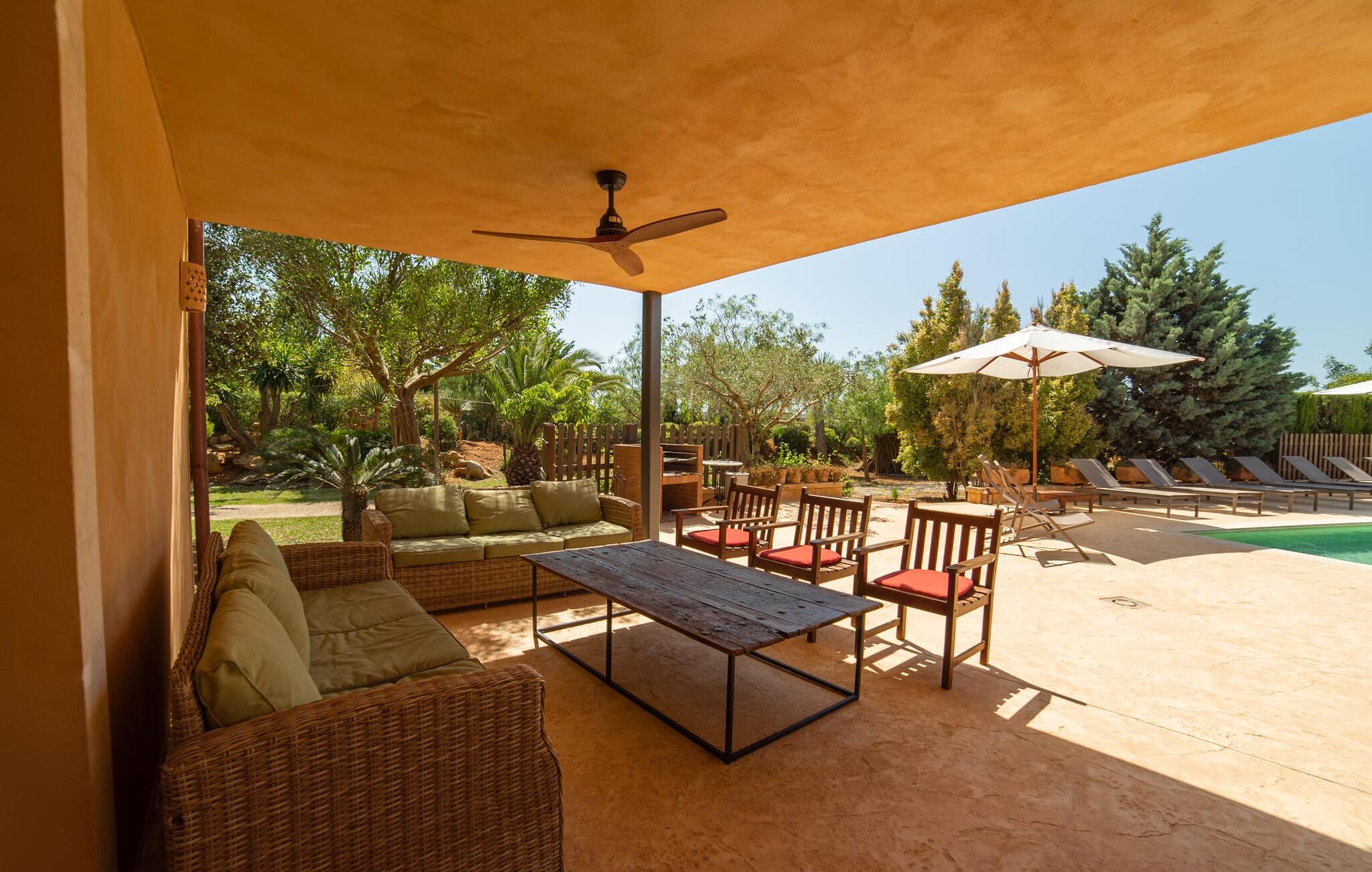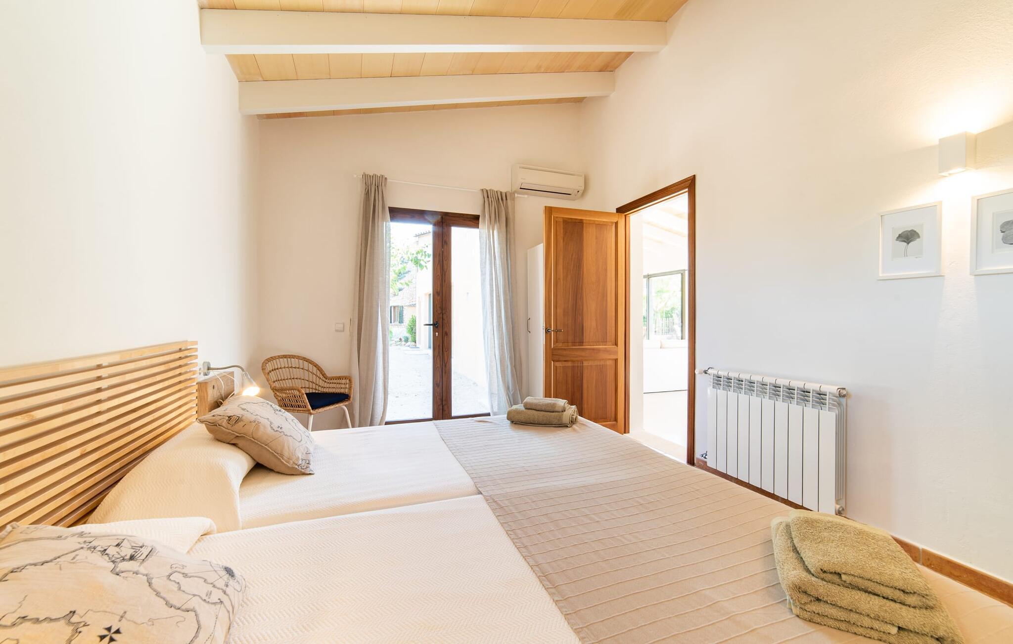 Denne vintage finca er blevet fuldstændig renoveret, mens den har bevaret den originale charme fra et mallorcansk landsted. Fincaen "Can Riera d'Es Trenc" imponerer sine gæster med en harmonisk stemning bestående af en naturstensfacade og glatte pudsede overflader, som kombineres med moderne møbler og ekstraudstyr i udendørsområdet. Beliggende i en beskyttende mur af cypres-, oliven- og frugttræer, er alt koncentreret i hjertet af ejendommen: det luksuriøse poolområde med den omkringliggende terrasse. Poolen er flisebelagt med turkisgrøn mosaik og tilbyder en praktisk hjørneindgang og lav dybde. Den støder op til en terrasse med adskillige yderst attraktive liggestole i træ og er ergonomisk designet. De ekstra sæder er frit indrettet og kan efter ønske placeres i skygge eller i solen. Den sydvendte ejendom består af to dele: Hovedhuset med to etager og en overdækket terrasse, som rummer både spisestue og en hyggelig overdækket veranda, og "poolhuset" med to soveværelser. Annekset byder også på en stor terrasse, bordtennis og bordfodbold. Så intet står i vejen for en afslappet grillaften med en sjov faktor. Uanset om I rejser med to eller tre familier eller vennepar - fincaen "Can Riera d'Es Trenc" er simpelthen perfekt for op til tolv personer, især fordi boligen er i hovedhuset og poolhuset. Fire dobbeltværelser er i "moderhuset" og de to andre i annekset. Særlig bekvemt er, at 5 af de 6 værelser har eget badeværelse, hvilket sammen med endnu et badeværelse resulterer i i alt 6 komplette håndvaske, så privatlivets fred er vidunderligt bevaret. Badeværelserne, der er renoveret med stor sans for detaljer, imponerer med individuelle fliser, brusere fra gulv til loft, iøjnefaldende håndvaske og generel fashionabel chic. Der er også et ensartet farvekoncept i alle værelser med aircondition (!). Det ser behageligt og sobert ud, tidløst, fordi hvidt med grå og beige accenter skaber en behagelig glans ved siden af træbjælkerne og dørene. Det unægteligt varme materiale træ finder alligevel sit formål - som i den lyse stue med pejs, sofaernes lyse atmosfære og det indirekte lyskoncept for enestående komfort. Spisebordet ser særligt godt ud med sin tykke træplanke. Et rummeligt køkken i rustik og dog minimalistisk stil med træfronter. Et hyggeligt opholdsområde og de bløde farver på væggene fuldender billedet af et progressivt landkøkken med absolut komfort. Begge områder er designet, så gæsten føler sig godt tilpas i den trendy sommerhusstil og føler sig hjemme på ferien. Det er ejeren klart lykkedes med. Men fra tid til anden vil I gerne forlade drømmeejendommen "Can Riera d'Es Trenc" for at udforske og forstå den smukke sydlige del af øen på nemme og sjove udflugter, der kan tage jer til at besøge en polobane eller stranden. I den stille sydlige del af øen kan I opleve livet i det mallorcanske landskab, hvor der stadig udvindes salt i dag, hvilket også er derfra stednavnet “Ses Salines”. Det er ikke kun værd at besøge Campos, Ses Salines eller Santanyí på markedsdage. Der kan I opdage mallorcinsk arkitekturs storhedstid, når I går gennem husene lavet af gylden, grå og hvid sandsten. Fincaen ligger mellem landsbyen og stranden. For naturelskere er fincaen et godt udgangspunkt for udflugter til fods eller på cykel og for at observere flamingoer og trækfugle, når det er tid til at vandre fra Campos saltsletter. Derfor er placeringen af fincaen ideel til at starte ruter, der tager jer til smukke kystlandsbyer og drømmestrande som den naturlige strand med krystalklart vand i Es Trenc. Ren afslapning! Den charmerende villa "Can Riera d'Es Trenc" er beliggende i kvadranten af Campos, Ses Salines, Colonia de Sant Jordi og Es Trenc, i den smukke sydlige region Mallorca, hvor landbrug, olivenlunde og saltproduktion dominerer det samlede billede . Indkøb til daglige behov kan foregå i Campos eller Ses Salines, hvor det ugentlige landmandsmarked også finder sted hver tirsdag eller torsdag. Særligt bemærkelsesværdig er nærheden til de smukke strande på sydkysten, Ses Covetes eller Es Trenc, som kun ligger 6 km væk.