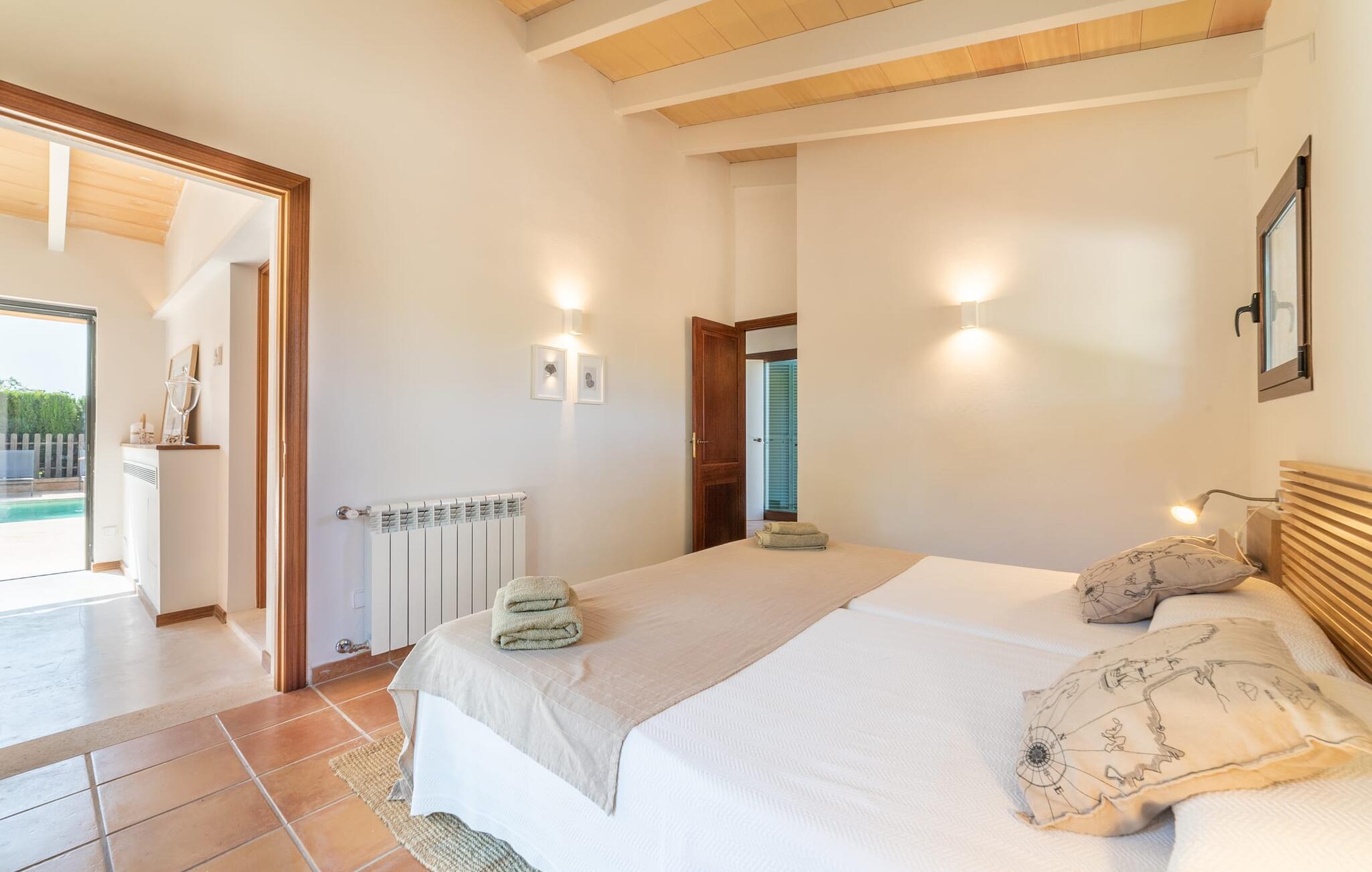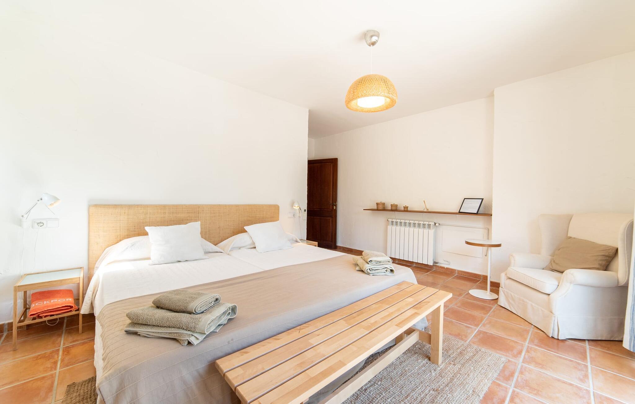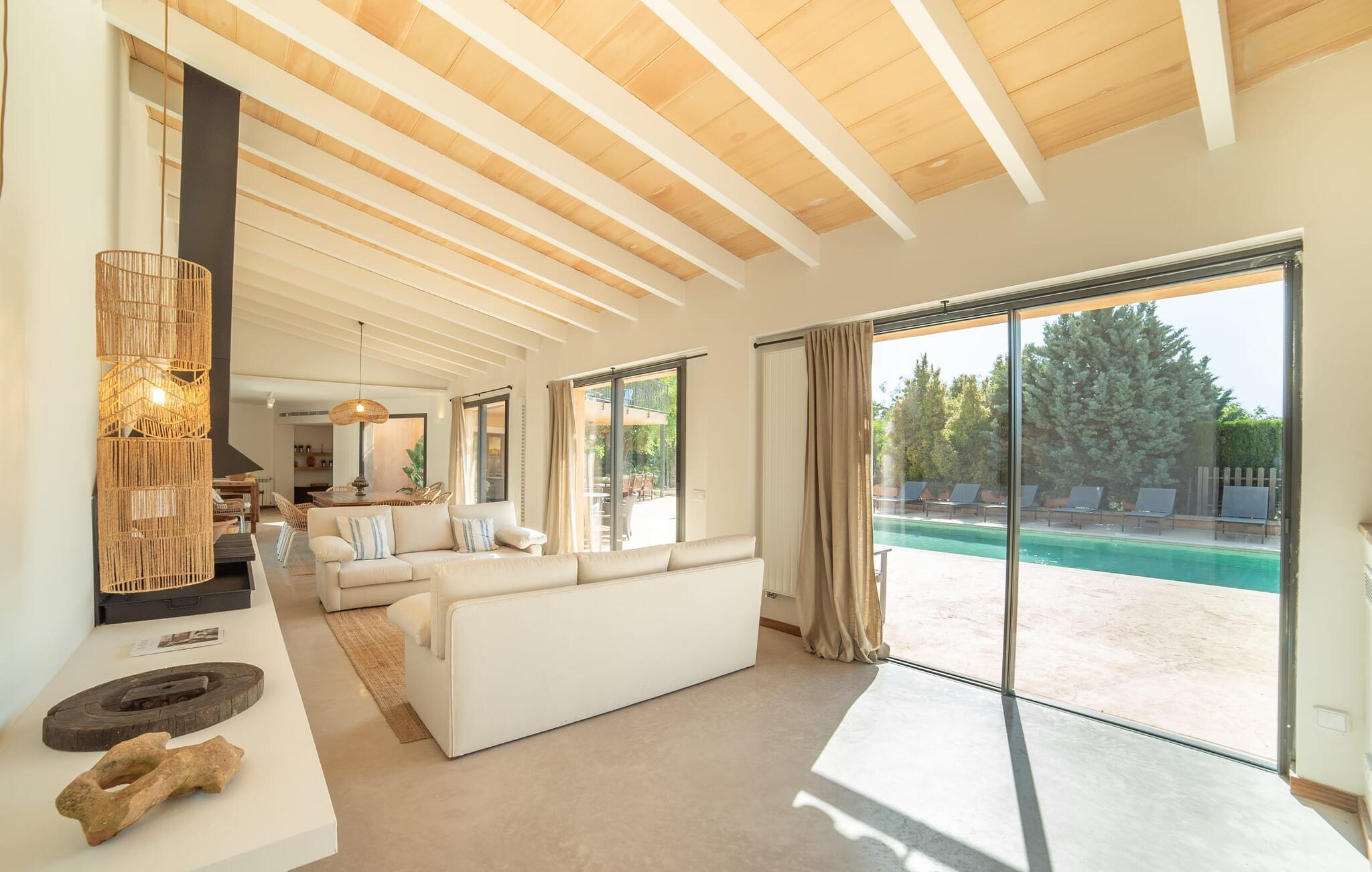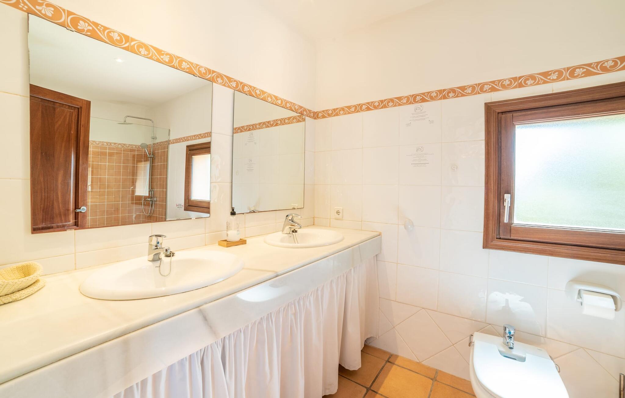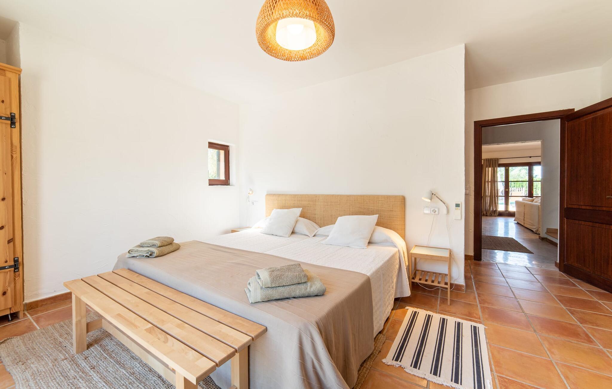Denne vintage finca er blevet fuldstændig renoveret, mens den har bevaret den originale charme fra et mallorcansk landsted. Fincaen "Can Riera d'Es Trenc" imponerer sine gæster med en harmonisk stemning bestående af en naturstensfacade og glatte pudsede overflader, som kombineres med moderne møbler og ekstraudstyr i udendørsområdet. Beliggende i en beskyttende mur af cypres-, oliven- og frugttræer, er alt koncentreret i hjertet af ejendommen: det luksuriøse poolområde med den omkringliggende terrasse. Poolen er flisebelagt med turkisgrøn mosaik og tilbyder en praktisk hjørneindgang og lav dybde. Den støder op til en terrasse med adskillige yderst attraktive liggestole i træ og er ergonomisk designet. De ekstra sæder er frit indrettet og kan efter ønske placeres i skygge eller i solen. Den sydvendte ejendom består af to dele: Hovedhuset med to etager og en overdækket terrasse, som rummer både spisestue og en hyggelig overdækket veranda, og "poolhuset" med to soveværelser. Annekset byder også på en stor terrasse, bordtennis og bordfodbold. Så intet står i vejen for en afslappet grillaften med en sjov faktor. Uanset om I rejser med to eller tre familier eller vennepar - fincaen "Can Riera d'Es Trenc" er simpelthen perfekt for op til tolv personer, især fordi boligen er i hovedhuset og poolhuset. Fire dobbeltværelser er i "moderhuset" og de to andre i annekset. Særlig bekvemt er, at 5 af de 6 værelser har eget badeværelse, hvilket sammen med endnu et badeværelse resulterer i i alt 6 komplette håndvaske, så privatlivets fred er vidunderligt bevaret. Badeværelserne, der er renoveret med stor sans for detaljer, imponerer med individuelle fliser, brusere fra gulv til loft, iøjnefaldende håndvaske og generel fashionabel chic. Der er også et ensartet farvekoncept i alle værelser med aircondition (!). Det ser behageligt og sobert ud, tidløst, fordi hvidt med grå og beige accenter skaber en behagelig glans ved siden af træbjælkerne og dørene. Det unægteligt varme materiale træ finder alligevel sit formål - som i den lyse stue med pejs, sofaernes lyse atmosfære og det indirekte lyskoncept for enestående komfort. Spisebordet ser særligt godt ud med sin tykke træplanke. Et rummeligt køkken i rustik og dog minimalistisk stil med træfronter. Et hyggeligt opholdsområde og de bløde farver på væggene fuldender billedet af et progressivt landkøkken med absolut komfort. Begge områder er designet, så gæsten føler sig godt tilpas i den trendy sommerhusstil og føler sig hjemme på ferien. Det er ejeren klart lykkedes med. Men fra tid til anden vil I gerne forlade drømmeejendommen "Can Riera d'Es Trenc" for at udforske og forstå den smukke sydlige del af øen på nemme og sjove udflugter, der kan tage jer til at besøge en polobane eller stranden. I den stille sydlige del af øen kan I opleve livet i det mallorcanske landskab, hvor der stadig udvindes salt i dag, hvilket også er derfra stednavnet “Ses Salines”. Det er ikke kun værd at besøge Campos, Ses Salines eller Santanyí på markedsdage. Der kan I opdage mallorcinsk arkitekturs storhedstid, når I går gennem husene lavet af gylden, grå og hvid sandsten. Fincaen ligger mellem landsbyen og stranden. For naturelskere er fincaen et godt udgangspunkt for udflugter til fods eller på cykel og for at observere flamingoer og trækfugle, når det er tid til at vandre fra Campos saltsletter. Derfor er placeringen af fincaen ideel til at starte ruter, der tager jer til smukke kystlandsbyer og drømmestrande som den naturlige strand med krystalklart vand i Es Trenc. Ren afslapning! Den charmerende villa "Can Riera d'Es Trenc" er beliggende i kvadranten af Campos, Ses Salines, Colonia de Sant Jordi og Es Trenc, i den smukke sydlige region Mallorca, hvor landbrug, olivenlunde og saltproduktion dominerer det samlede billede . Indkøb til daglige behov kan foregå i Campos eller Ses Salines, hvor det ugentlige landmandsmarked også finder sted hver tirsdag eller torsdag. Særligt bemærkelsesværdig er nærheden til de smukke strande på sydkysten, Ses Covetes eller Es Trenc, som kun ligger 6 km væk.