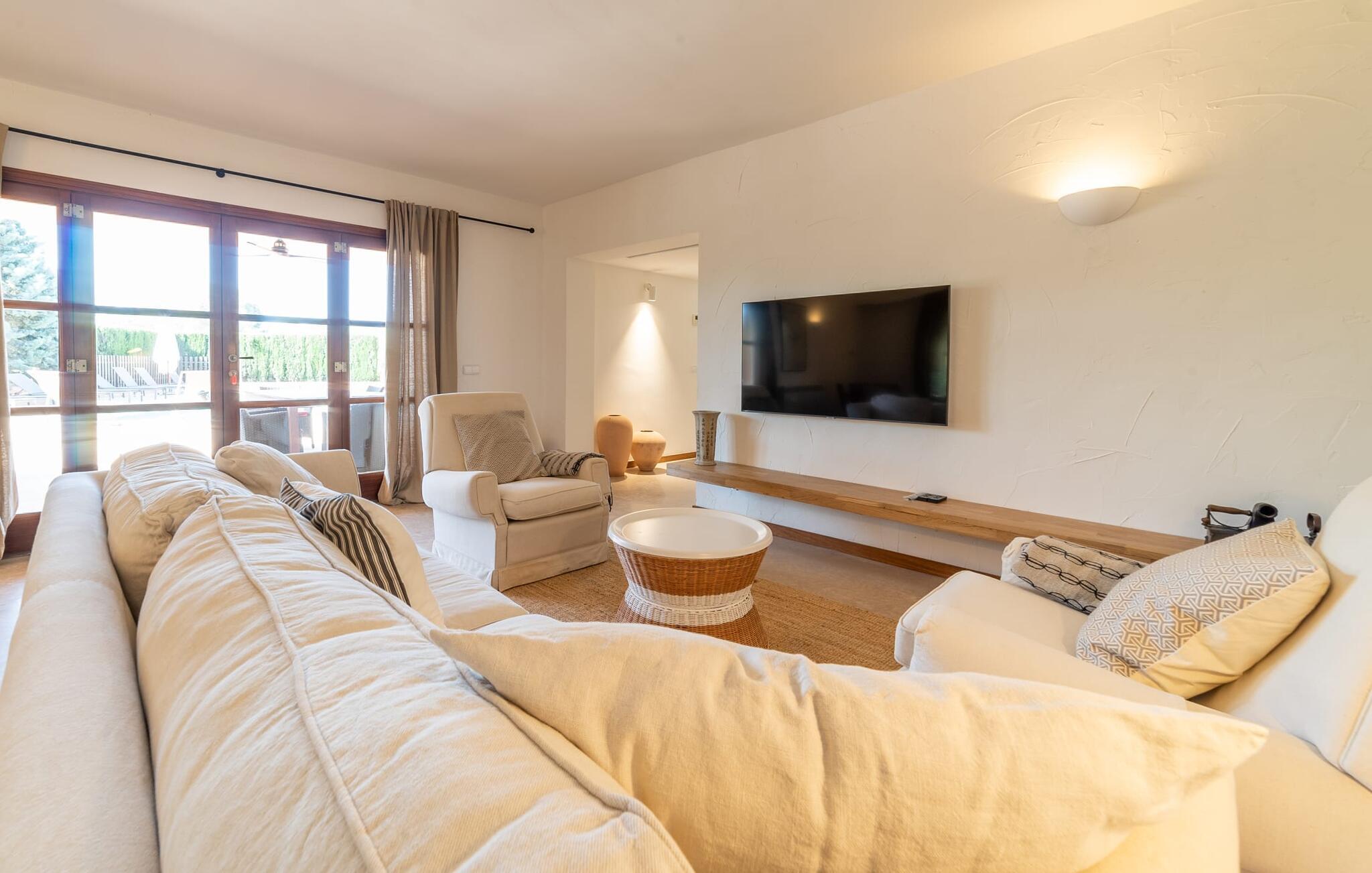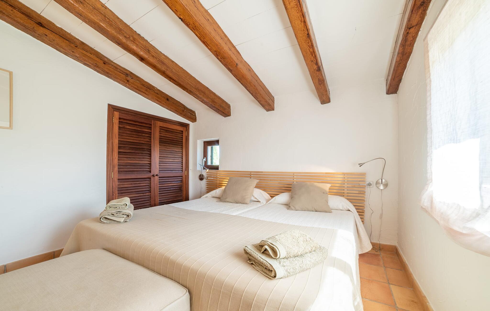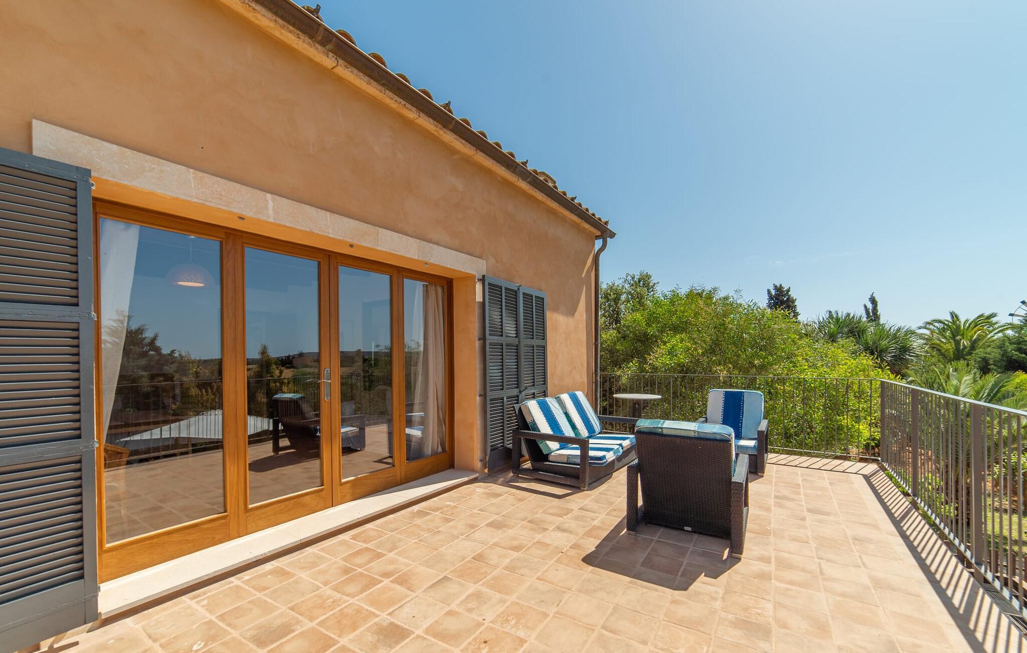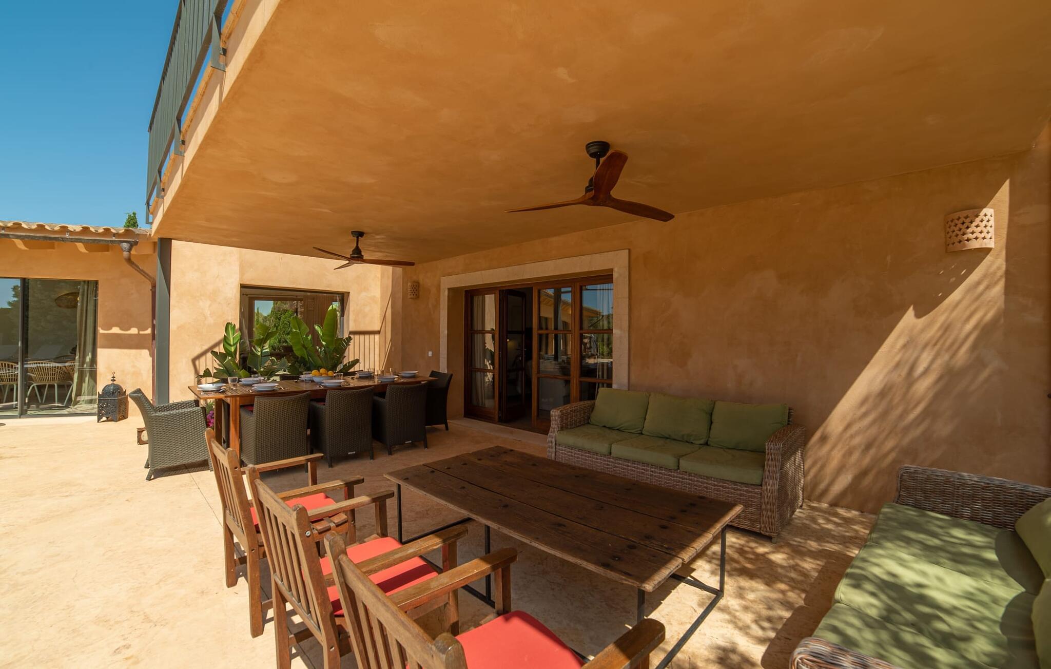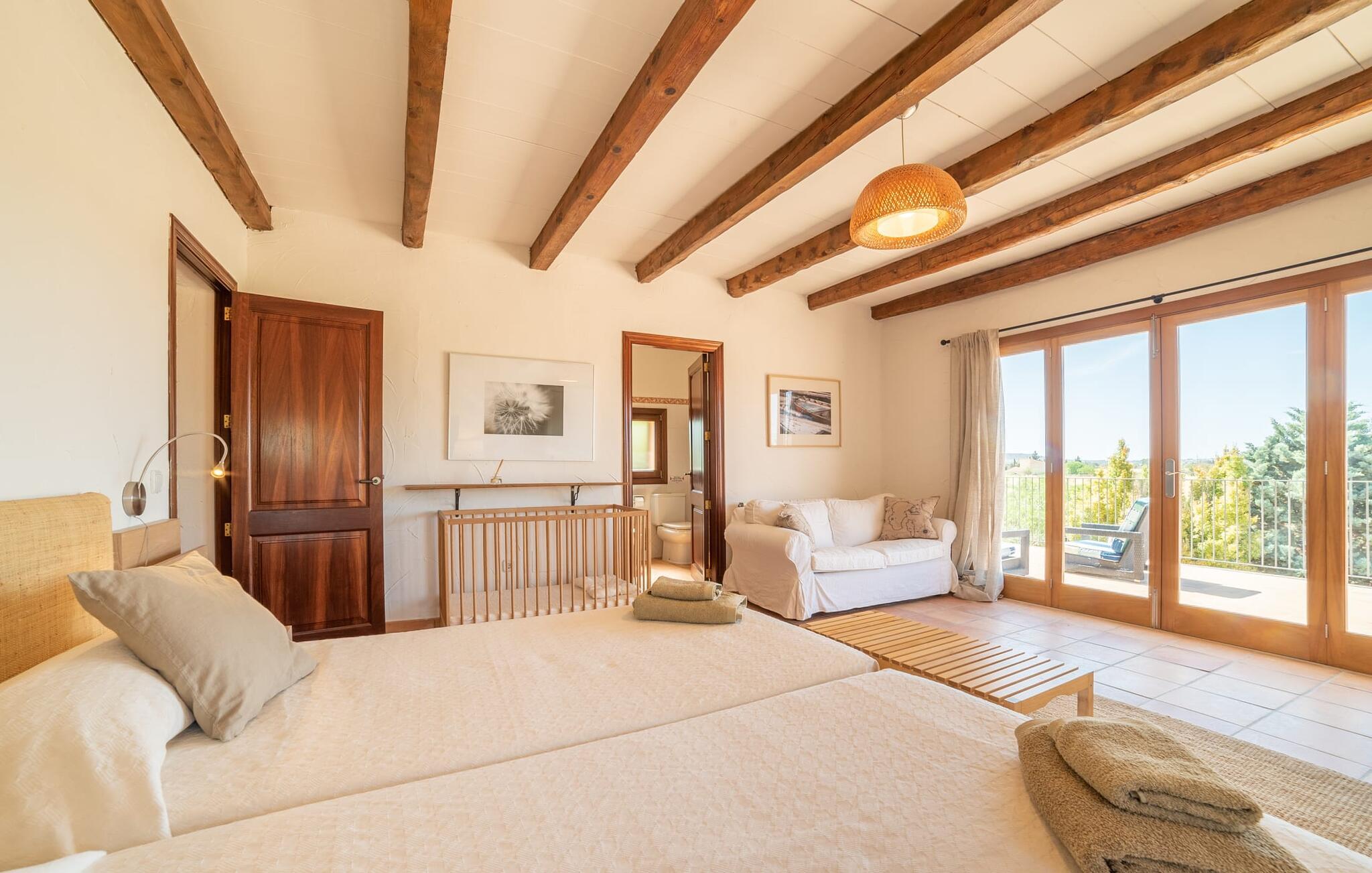 Denne vintage finca er blevet fuldstændig renoveret, mens den har bevaret den originale charme fra et mallorcansk landsted. Fincaen "Can Riera d'Es Trenc" imponerer sine gæster med en harmonisk stemning bestående af en naturstensfacade og glatte pudsede overflader, som kombineres med moderne møbler og ekstraudstyr i udendørsområdet. Beliggende i en beskyttende mur af cypres-, oliven- og frugttræer, er alt koncentreret i hjertet af ejendommen: det luksuriøse poolområde med den omkringliggende terrasse. Poolen er flisebelagt med turkisgrøn mosaik og tilbyder en praktisk hjørneindgang og lav dybde. Den støder op til en terrasse med adskillige yderst attraktive liggestole i træ og er ergonomisk designet. De ekstra sæder er frit indrettet og kan efter ønske placeres i skygge eller i solen. Den sydvendte ejendom består af to dele: Hovedhuset med to etager og en overdækket terrasse, som rummer både spisestue og en hyggelig overdækket veranda, og "poolhuset" med to soveværelser. Annekset byder også på en stor terrasse, bordtennis og bordfodbold. Så intet står i vejen for en afslappet grillaften med en sjov faktor. Uanset om I rejser med to eller tre familier eller vennepar - fincaen "Can Riera d'Es Trenc" er simpelthen perfekt for op til tolv personer, især fordi boligen er i hovedhuset og poolhuset. Fire dobbeltværelser er i "moderhuset" og de to andre i annekset. Særlig bekvemt er, at 5 af de 6 værelser har eget badeværelse, hvilket sammen med endnu et badeværelse resulterer i i alt 6 komplette håndvaske, så privatlivets fred er vidunderligt bevaret. Badeværelserne, der er renoveret med stor sans for detaljer, imponerer med individuelle fliser, brusere fra gulv til loft, iøjnefaldende håndvaske og generel fashionabel chic. Der er også et ensartet farvekoncept i alle værelser med aircondition (!). Det ser behageligt og sobert ud, tidløst, fordi hvidt med grå og beige accenter skaber en behagelig glans ved siden af træbjælkerne og dørene. Det unægteligt varme materiale træ finder alligevel sit formål - som i den lyse stue med pejs, sofaernes lyse atmosfære og det indirekte lyskoncept for enestående komfort. Spisebordet ser særligt godt ud med sin tykke træplanke. Et rummeligt køkken i rustik og dog minimalistisk stil med træfronter. Et hyggeligt opholdsområde og de bløde farver på væggene fuldender billedet af et progressivt landkøkken med absolut komfort. Begge områder er designet, så gæsten føler sig godt tilpas i den trendy sommerhusstil og føler sig hjemme på ferien. Det er ejeren klart lykkedes med. Men fra tid til anden vil I gerne forlade drømmeejendommen "Can Riera d'Es Trenc" for at udforske og forstå den smukke sydlige del af øen på nemme og sjove udflugter, der kan tage jer til at besøge en polobane eller stranden. I den stille sydlige del af øen kan I opleve livet i det mallorcanske landskab, hvor der stadig udvindes salt i dag, hvilket også er derfra stednavnet “Ses Salines”. Det er ikke kun værd at besøge Campos, Ses Salines eller Santanyí på markedsdage. Der kan I opdage mallorcinsk arkitekturs storhedstid, når I går gennem husene lavet af gylden, grå og hvid sandsten. Fincaen ligger mellem landsbyen og stranden. For naturelskere er fincaen et godt udgangspunkt for udflugter til fods eller på cykel og for at observere flamingoer og trækfugle, når det er tid til at vandre fra Campos saltsletter. Derfor er placeringen af fincaen ideel til at starte ruter, der tager jer til smukke kystlandsbyer og drømmestrande som den naturlige strand med krystalklart vand i Es Trenc. Ren afslapning! Den charmerende villa "Can Riera d'Es Trenc" er beliggende i kvadranten af Campos, Ses Salines, Colonia de Sant Jordi og Es Trenc, i den smukke sydlige region Mallorca, hvor landbrug, olivenlunde og saltproduktion dominerer det samlede billede . Indkøb til daglige behov kan foregå i Campos eller Ses Salines, hvor det ugentlige landmandsmarked også finder sted hver tirsdag eller torsdag. Særligt bemærkelsesværdig er nærheden til de smukke strande på sydkysten, Ses Covetes eller Es Trenc, som kun ligger 6 km væk.