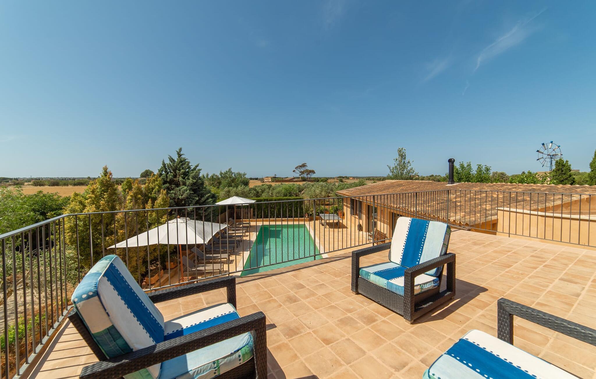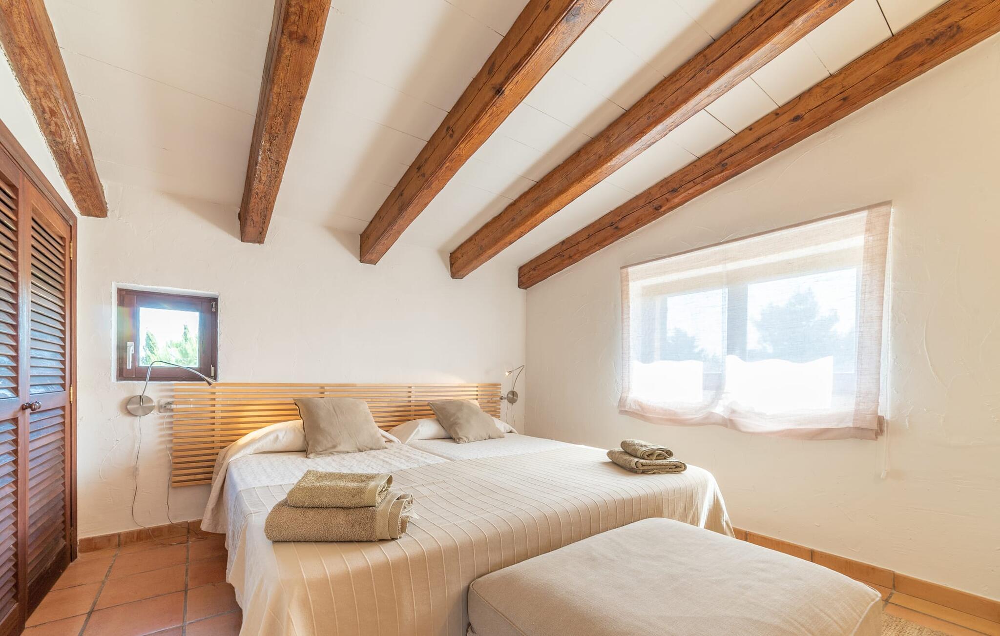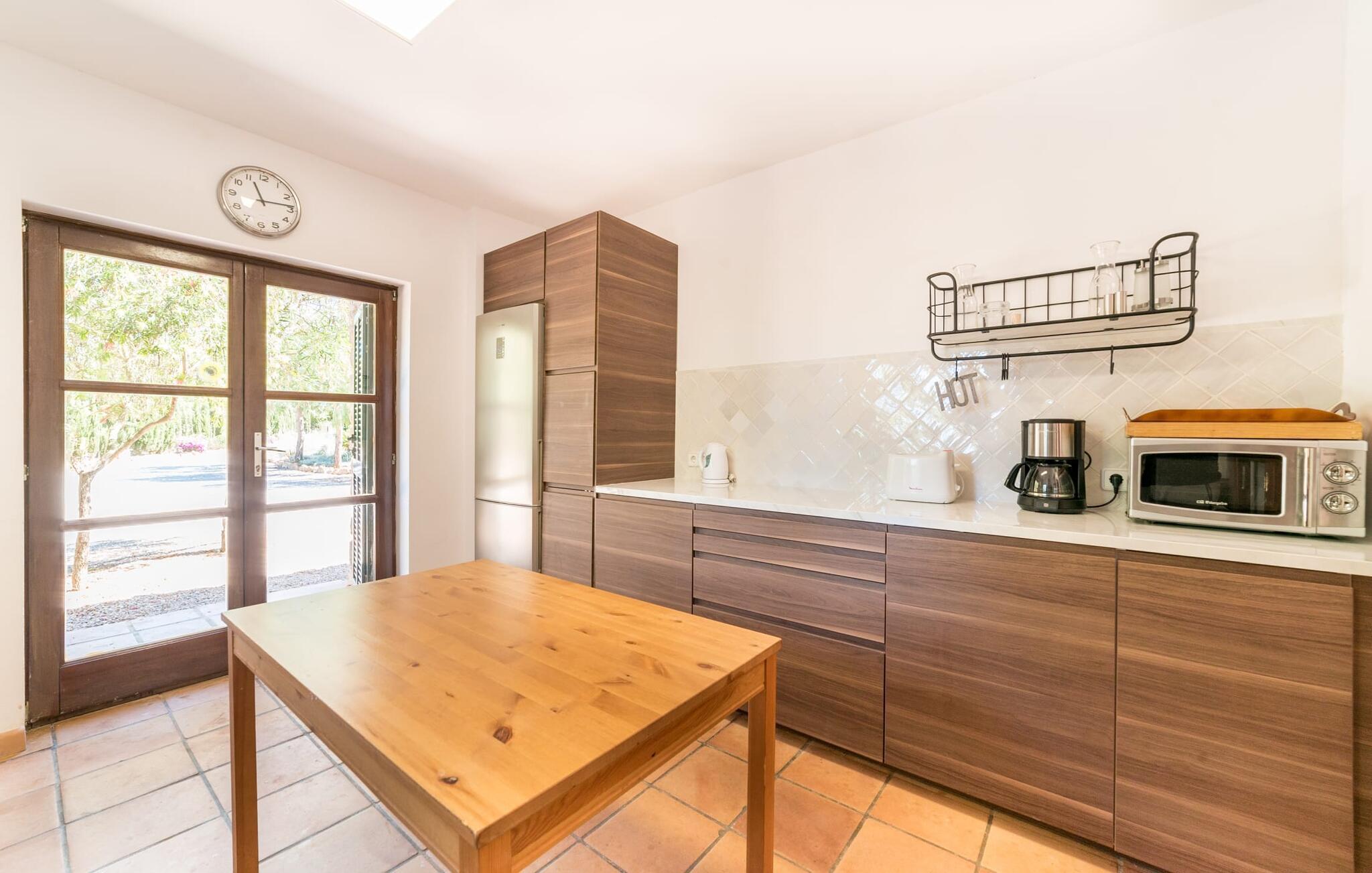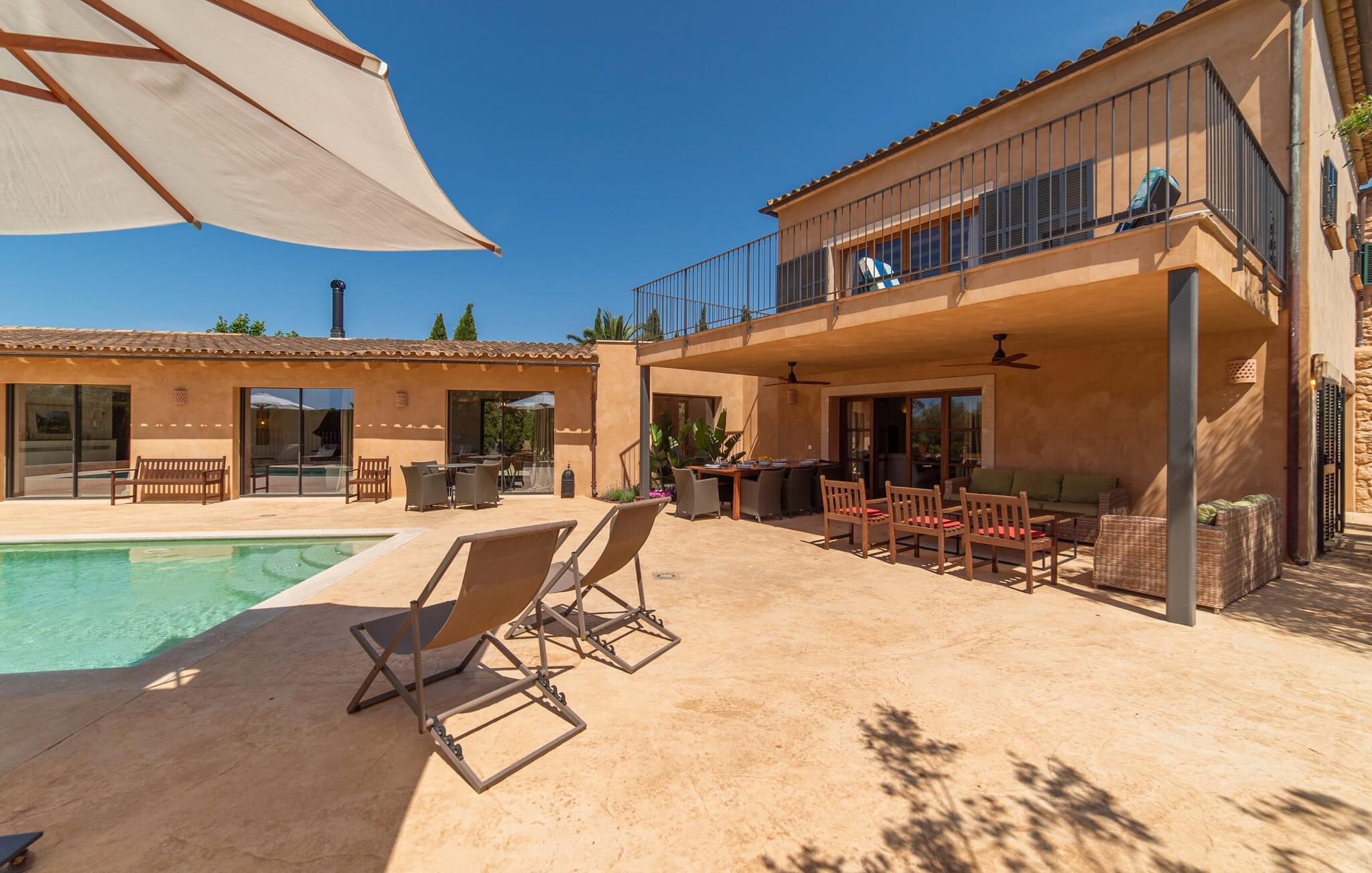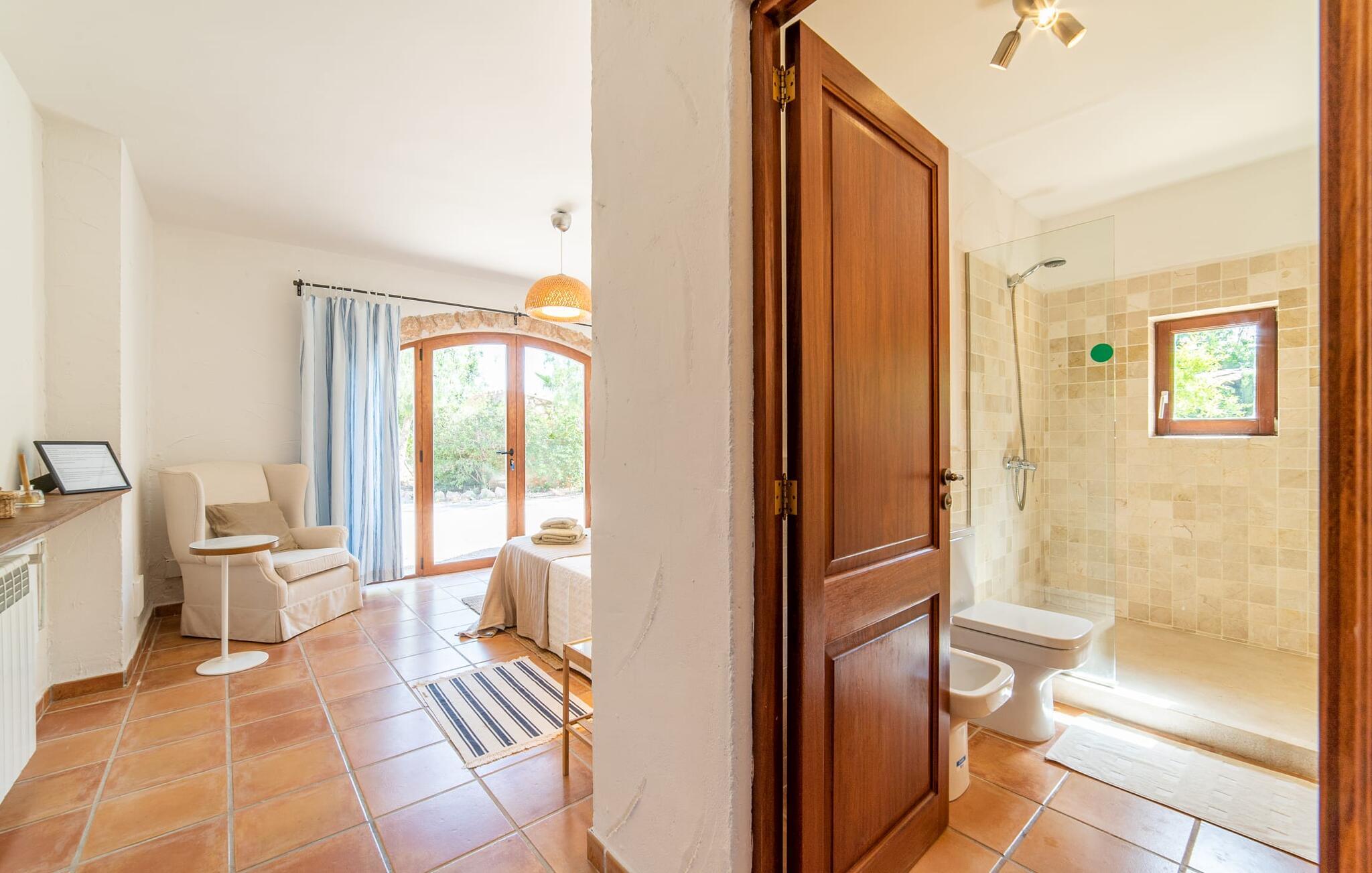 Denne vintage finca er blevet fuldstændig renoveret, mens den har bevaret den originale charme fra et mallorcansk landsted. Fincaen "Can Riera d'Es Trenc" imponerer sine gæster med en harmonisk stemning bestående af en naturstensfacade og glatte pudsede overflader, som kombineres med moderne møbler og ekstraudstyr i udendørsområdet. Beliggende i en beskyttende mur af cypres-, oliven- og frugttræer, er alt koncentreret i hjertet af ejendommen: det luksuriøse poolområde med den omkringliggende terrasse. Poolen er flisebelagt med turkisgrøn mosaik og tilbyder en praktisk hjørneindgang og lav dybde. Den støder op til en terrasse med adskillige yderst attraktive liggestole i træ og er ergonomisk designet. De ekstra sæder er frit indrettet og kan efter ønske placeres i skygge eller i solen. Den sydvendte ejendom består af to dele: Hovedhuset med to etager og en overdækket terrasse, som rummer både spisestue og en hyggelig overdækket veranda, og "poolhuset" med to soveværelser. Annekset byder også på en stor terrasse, bordtennis og bordfodbold. Så intet står i vejen for en afslappet grillaften med en sjov faktor. Uanset om I rejser med to eller tre familier eller vennepar - fincaen "Can Riera d'Es Trenc" er simpelthen perfekt for op til tolv personer, især fordi boligen er i hovedhuset og poolhuset. Fire dobbeltværelser er i "moderhuset" og de to andre i annekset. Særlig bekvemt er, at 5 af de 6 værelser har eget badeværelse, hvilket sammen med endnu et badeværelse resulterer i i alt 6 komplette håndvaske, så privatlivets fred er vidunderligt bevaret. Badeværelserne, der er renoveret med stor sans for detaljer, imponerer med individuelle fliser, brusere fra gulv til loft, iøjnefaldende håndvaske og generel fashionabel chic. Der er også et ensartet farvekoncept i alle værelser med aircondition (!). Det ser behageligt og sobert ud, tidløst, fordi hvidt med grå og beige accenter skaber en behagelig glans ved siden af træbjælkerne og dørene. Det unægteligt varme materiale træ finder alligevel sit formål - som i den lyse stue med pejs, sofaernes lyse atmosfære og det indirekte lyskoncept for enestående komfort. Spisebordet ser særligt godt ud med sin tykke træplanke. Et rummeligt køkken i rustik og dog minimalistisk stil med træfronter. Et hyggeligt opholdsområde og de bløde farver på væggene fuldender billedet af et progressivt landkøkken med absolut komfort. Begge områder er designet, så gæsten føler sig godt tilpas i den trendy sommerhusstil og føler sig hjemme på ferien. Det er ejeren klart lykkedes med. Men fra tid til anden vil I gerne forlade drømmeejendommen "Can Riera d'Es Trenc" for at udforske og forstå den smukke sydlige del af øen på nemme og sjove udflugter, der kan tage jer til at besøge en polobane eller stranden. I den stille sydlige del af øen kan I opleve livet i det mallorcanske landskab, hvor der stadig udvindes salt i dag, hvilket også er derfra stednavnet “Ses Salines”. Det er ikke kun værd at besøge Campos, Ses Salines eller Santanyí på markedsdage. Der kan I opdage mallorcinsk arkitekturs storhedstid, når I går gennem husene lavet af gylden, grå og hvid sandsten. Fincaen ligger mellem landsbyen og stranden. For naturelskere er fincaen et godt udgangspunkt for udflugter til fods eller på cykel og for at observere flamingoer og trækfugle, når det er tid til at vandre fra Campos saltsletter. Derfor er placeringen af fincaen ideel til at starte ruter, der tager jer til smukke kystlandsbyer og drømmestrande som den naturlige strand med krystalklart vand i Es Trenc. Ren afslapning! Den charmerende villa "Can Riera d'Es Trenc" er beliggende i kvadranten af Campos, Ses Salines, Colonia de Sant Jordi og Es Trenc, i den smukke sydlige region Mallorca, hvor landbrug, olivenlunde og saltproduktion dominerer det samlede billede . Indkøb til daglige behov kan foregå i Campos eller Ses Salines, hvor det ugentlige landmandsmarked også finder sted hver tirsdag eller torsdag. Særligt bemærkelsesværdig er nærheden til de smukke strande på sydkysten, Ses Covetes eller Es Trenc, som kun ligger 6 km væk.