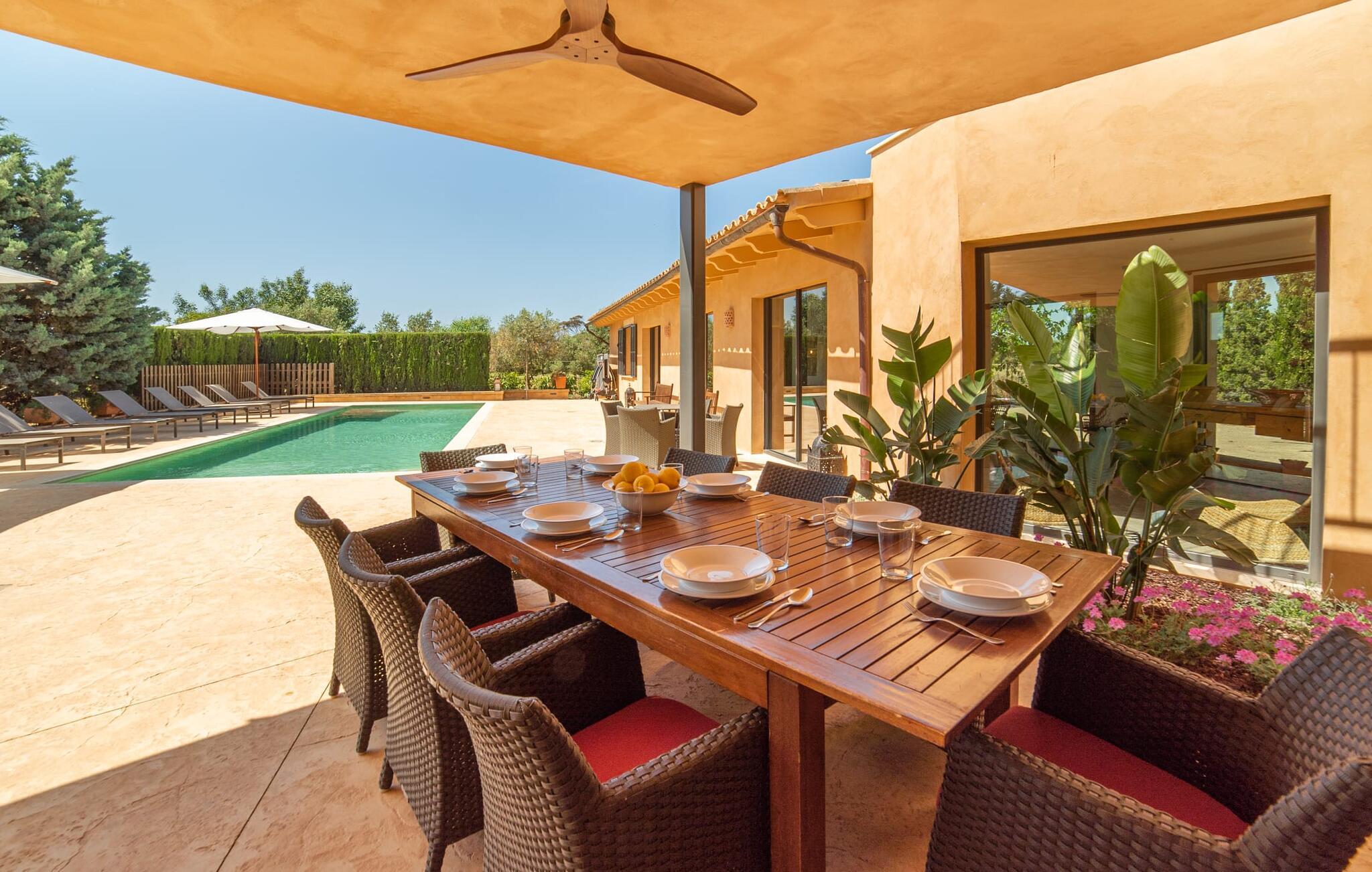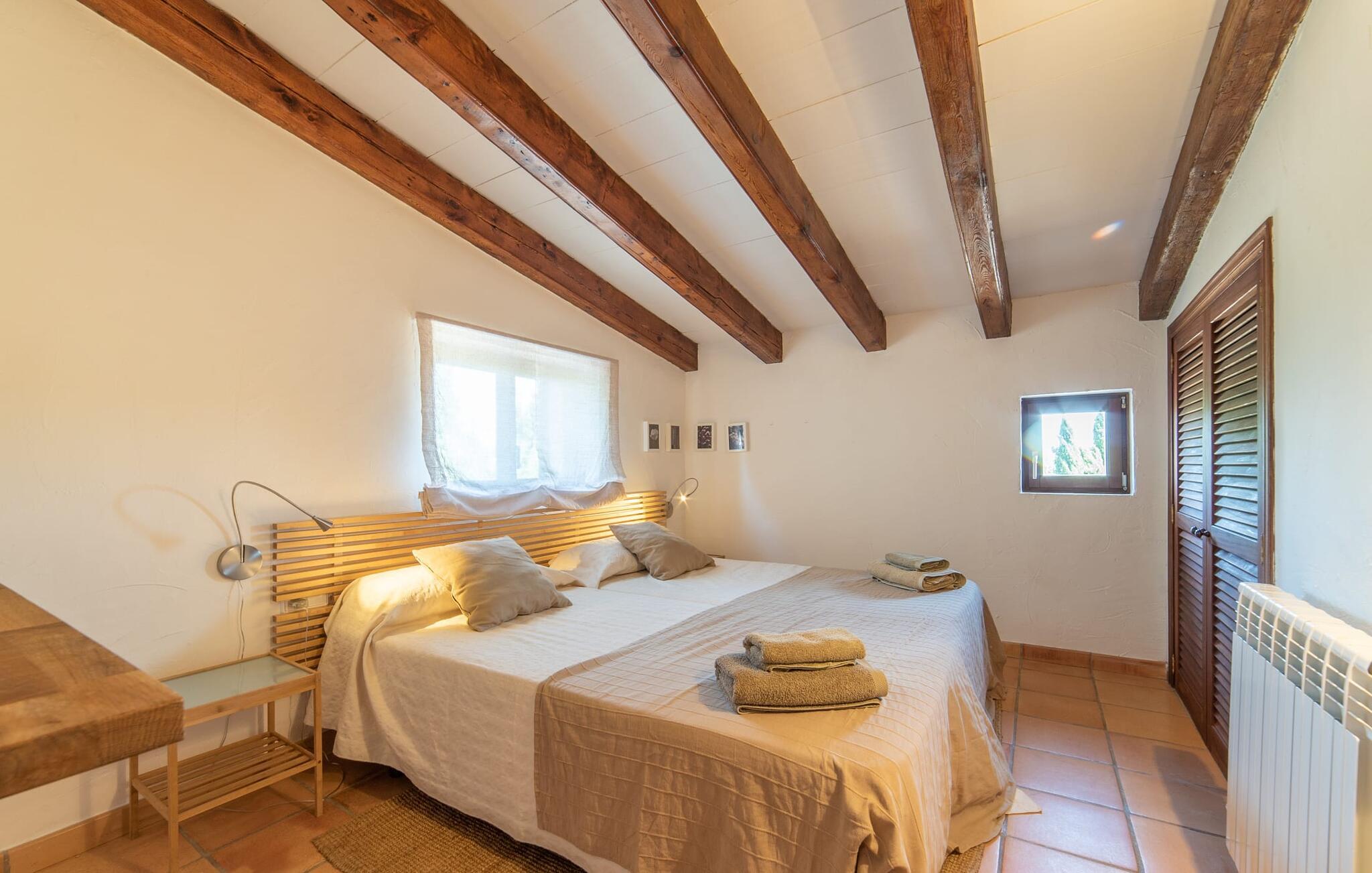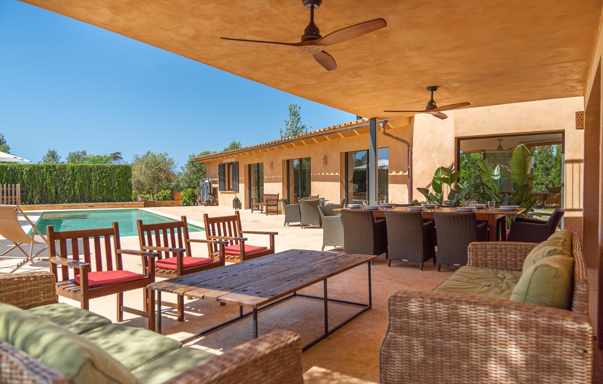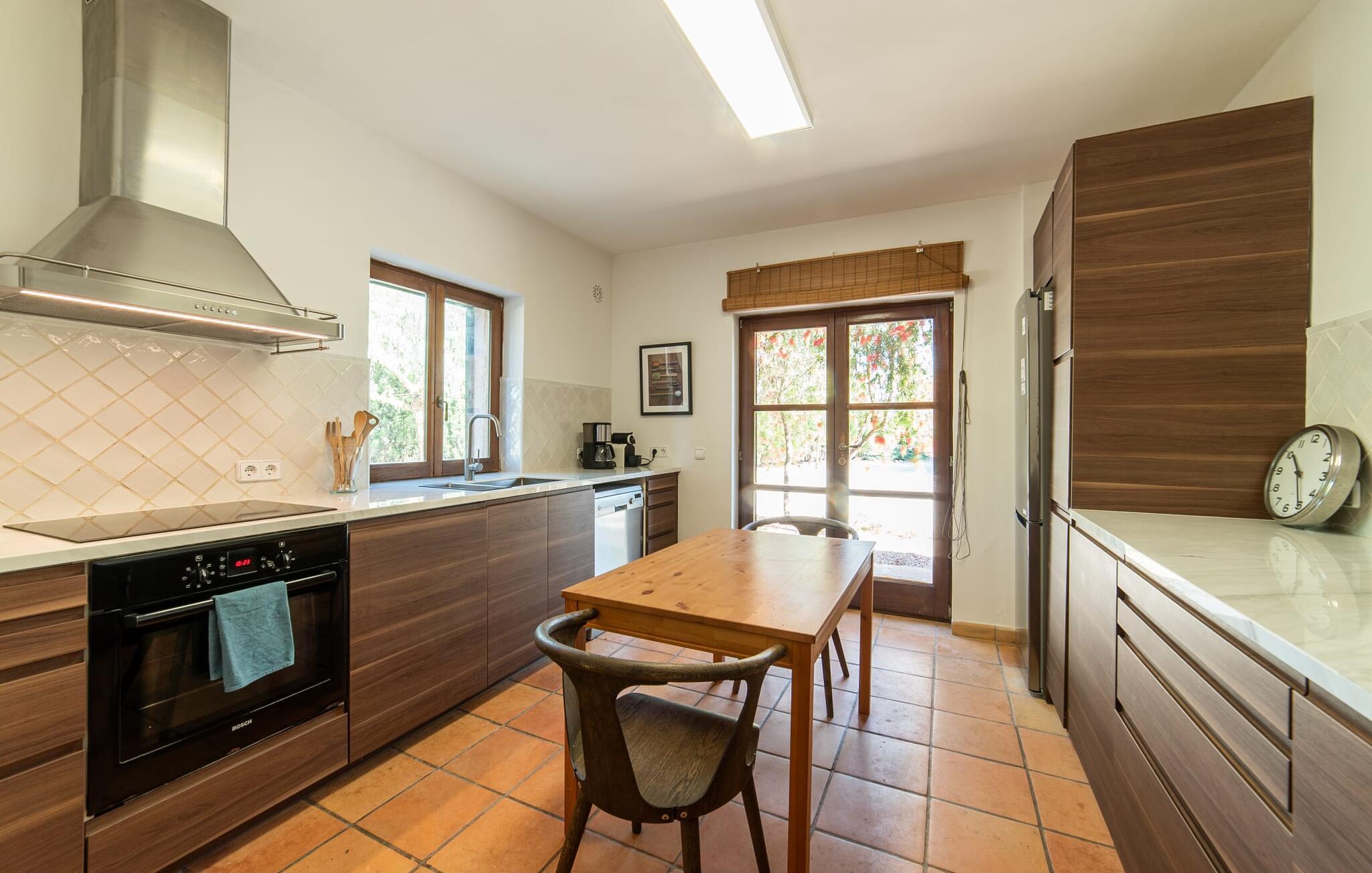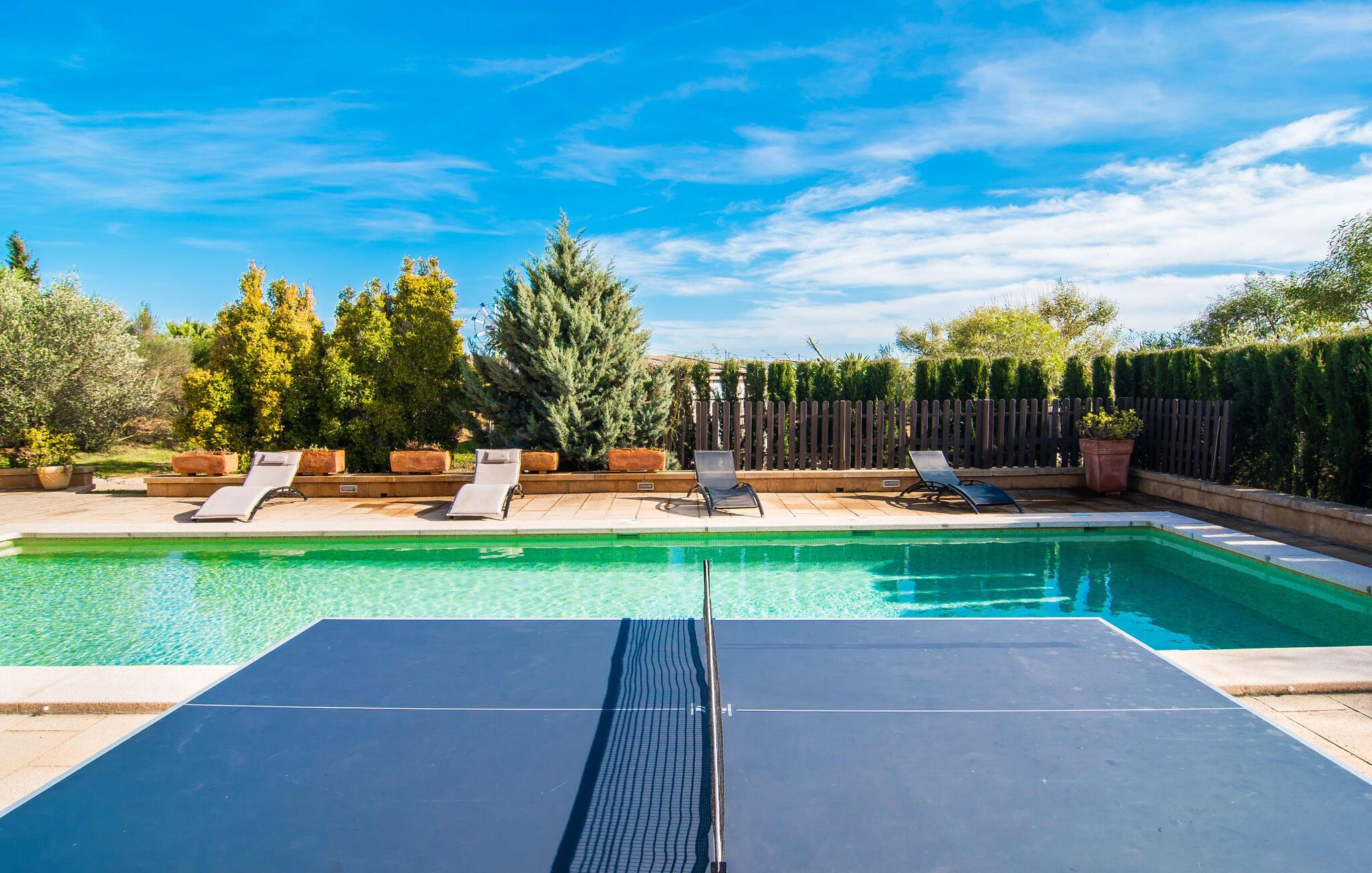 Denne vintage finca er blevet fuldstændig renoveret, mens den har bevaret den originale charme fra et mallorcansk landsted. Fincaen "Can Riera d'Es Trenc" imponerer sine gæster med en harmonisk stemning bestående af en naturstensfacade og glatte pudsede overflader, som kombineres med moderne møbler og ekstraudstyr i udendørsområdet. Beliggende i en beskyttende mur af cypres-, oliven- og frugttræer, er alt koncentreret i hjertet af ejendommen: det luksuriøse poolområde med den omkringliggende terrasse. Poolen er flisebelagt med turkisgrøn mosaik og tilbyder en praktisk hjørneindgang og lav dybde. Den støder op til en terrasse med adskillige yderst attraktive liggestole i træ og er ergonomisk designet. De ekstra sæder er frit indrettet og kan efter ønske placeres i skygge eller i solen. Den sydvendte ejendom består af to dele: Hovedhuset med to etager og en overdækket terrasse, som rummer både spisestue og en hyggelig overdækket veranda, og "poolhuset" med to soveværelser. Annekset byder også på en stor terrasse, bordtennis og bordfodbold. Så intet står i vejen for en afslappet grillaften med en sjov faktor. Uanset om I rejser med to eller tre familier eller vennepar - fincaen "Can Riera d'Es Trenc" er simpelthen perfekt for op til tolv personer, især fordi boligen er i hovedhuset og poolhuset. Fire dobbeltværelser er i "moderhuset" og de to andre i annekset. Særlig bekvemt er, at 5 af de 6 værelser har eget badeværelse, hvilket sammen med endnu et badeværelse resulterer i i alt 6 komplette håndvaske, så privatlivets fred er vidunderligt bevaret. Badeværelserne, der er renoveret med stor sans for detaljer, imponerer med individuelle fliser, brusere fra gulv til loft, iøjnefaldende håndvaske og generel fashionabel chic. Der er også et ensartet farvekoncept i alle værelser med aircondition (!). Det ser behageligt og sobert ud, tidløst, fordi hvidt med grå og beige accenter skaber en behagelig glans ved siden af træbjælkerne og dørene. Det unægteligt varme materiale træ finder alligevel sit formål - som i den lyse stue med pejs, sofaernes lyse atmosfære og det indirekte lyskoncept for enestående komfort. Spisebordet ser særligt godt ud med sin tykke træplanke. Et rummeligt køkken i rustik og dog minimalistisk stil med træfronter. Et hyggeligt opholdsområde og de bløde farver på væggene fuldender billedet af et progressivt landkøkken med absolut komfort. Begge områder er designet, så gæsten føler sig godt tilpas i den trendy sommerhusstil og føler sig hjemme på ferien. Det er ejeren klart lykkedes med. Men fra tid til anden vil I gerne forlade drømmeejendommen "Can Riera d'Es Trenc" for at udforske og forstå den smukke sydlige del af øen på nemme og sjove udflugter, der kan tage jer til at besøge en polobane eller stranden. I den stille sydlige del af øen kan I opleve livet i det mallorcanske landskab, hvor der stadig udvindes salt i dag, hvilket også er derfra stednavnet “Ses Salines”. Det er ikke kun værd at besøge Campos, Ses Salines eller Santanyí på markedsdage. Der kan I opdage mallorcinsk arkitekturs storhedstid, når I går gennem husene lavet af gylden, grå og hvid sandsten. Fincaen ligger mellem landsbyen og stranden. For naturelskere er fincaen et godt udgangspunkt for udflugter til fods eller på cykel og for at observere flamingoer og trækfugle, når det er tid til at vandre fra Campos saltsletter. Derfor er placeringen af fincaen ideel til at starte ruter, der tager jer til smukke kystlandsbyer og drømmestrande som den naturlige strand med krystalklart vand i Es Trenc. Ren afslapning! Den charmerende villa "Can Riera d'Es Trenc" er beliggende i kvadranten af Campos, Ses Salines, Colonia de Sant Jordi og Es Trenc, i den smukke sydlige region Mallorca, hvor landbrug, olivenlunde og saltproduktion dominerer det samlede billede . Indkøb til daglige behov kan foregå i Campos eller Ses Salines, hvor det ugentlige landmandsmarked også finder sted hver tirsdag eller torsdag. Særligt bemærkelsesværdig er nærheden til de smukke strande på sydkysten, Ses Covetes eller Es Trenc, som kun ligger 6 km væk.
