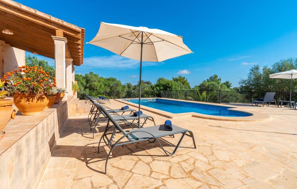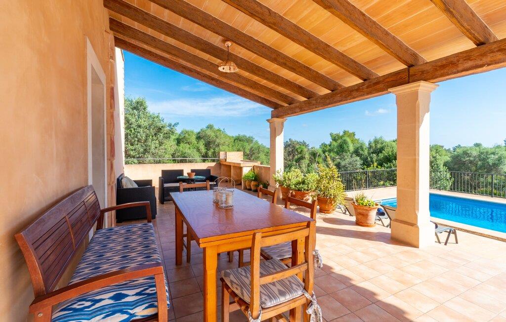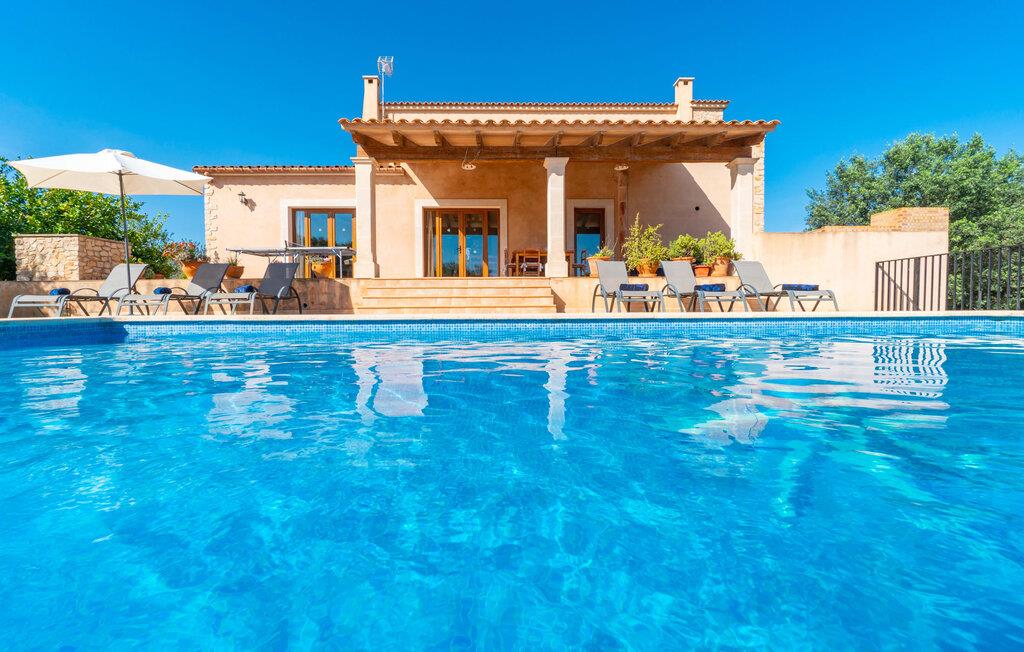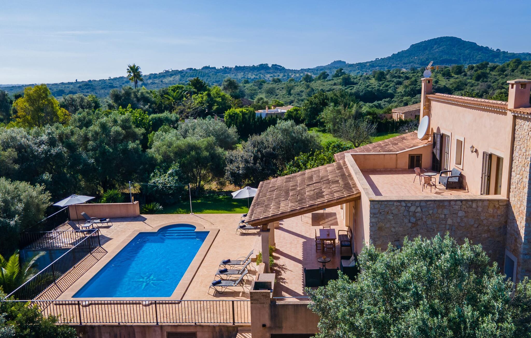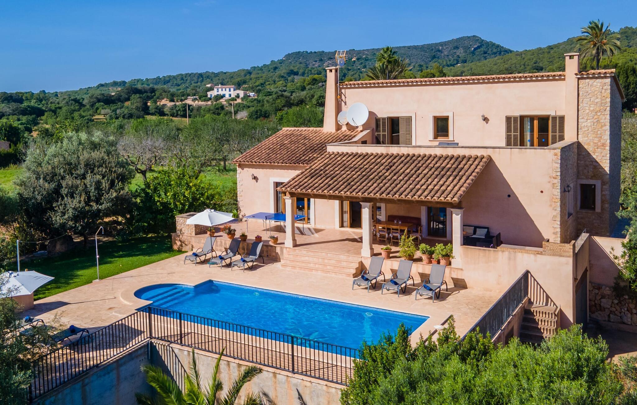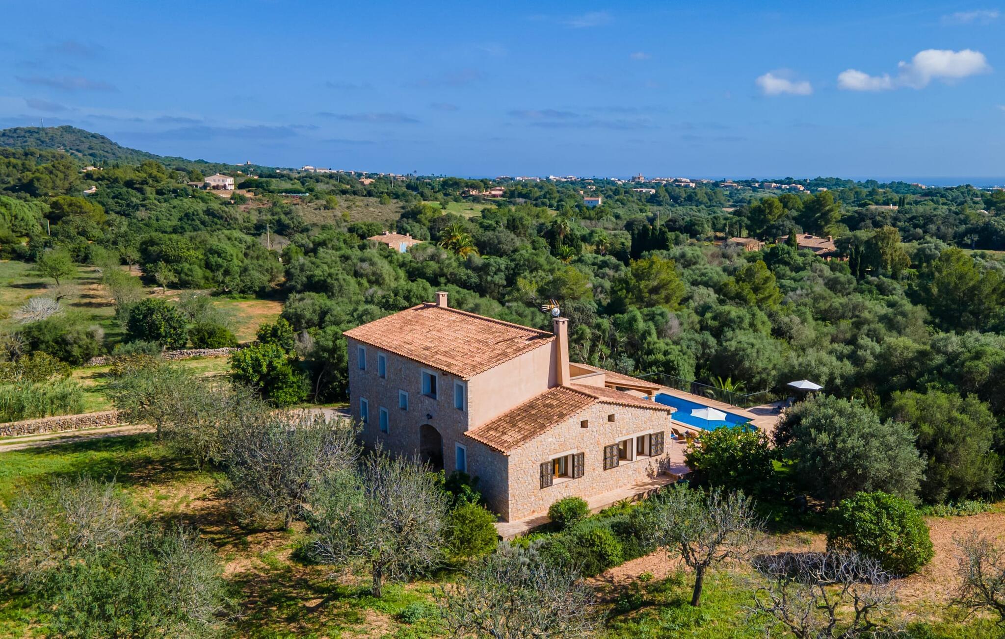 Når I når til fincaen "Can Rito Nou", genkender I straks den typiske mallorcanske stil i den nye bygning, som består af traditionelle stenbrud. Selv udefra får man et indtryk af hele anlæggets bemærkelsesværdige rummelighed. Nysgerrigheden efter mere er vakt. Mange mandeltræer og nogle oliventræer vokser på ejendommen, og der er endda et citrontræ. Bilen kan parkeres bagerst i huset. Stien fører den feriegæst rundt om huset og fører til den velholdte græsplæne. De små træer i kanten af plænen giver et roligt, skyggefuldt sted, hvis solen er for stærk. Derfra kan I nå det vidunderlige poolområde på få skridt. Poolen er fuldstændig omgivet af en brolagt terrasse. I finder også masser af liggestole her. En udendørs bruser fuldender komforten. Herfra har I udsigt til den store ejendom, der hører til fincaen. Til gengæld vandrer udsigten over bassinets vand mod fincaen. Rent privatliv og en absolut "ferie at slukke" er garanteret her. Fra det skønne poolområde kan man via få trin nå bygningens meget rummelige terrasse. Det er overdækket og inviterer jer til at blive hængende på ethvert tidspunkt af dagen. Da der er meget plads her, giver det mening at stille det eksisterende bordtennisbord op og starte en ferieturnering f.eks. En muret udendørs grill med opbevaringsplads inviterer til sjove grillaftener. Efter et længere ophold i solen eller i poolen finder I helt sikkert et skyggefuldt sted her - hvis I vil. Kommer man ind i fincaen forfra, når man det rummelige indgangsparti. Derfra kommer I ind i stuen med et stort spisebord. Dette værelse byder på masser af plads, er komfortabelt og funktionelt indrettet og er særligt populært om aftenen. Udover et moderne fladskærms-tv og anden moderne teknologi er der en hyggelig pejs, som udstråler en hyggelig varme som varmelegeme i overgangsperioden, men som også altid er velegnet til at nyde romantiske timer. I køkkenet, som er udstyret med teknologi, der ikke lader noget tilbage at ønske og afventer tilberedningen af typiske spanske retter, er der endnu et spisebord, måske til et "lille måltid imellem". Opholds- og spiseområdet har synlige bjælkelofter, hvilket giver en typisk mallorcansk atmosfære. Alle værelser i fincaen er meget lyse, da solen dækker hele området. I stueetagen er der to hyggelige soveværelser, hvis indretning garanterer en behagelig nattesøvn. To moderne badeværelser, som er omfattende udstyret og giver glæde både morgen og aften, fuldender værelserne i stueetagen. Den statelige trappe i indgangspartiet fører jer til øverste etage. Også her er der to indbydende soveværelser med hvert sit badeværelse. Fra begge soveværelser er der adgang til den store tagterrasse, som byder på en vidunderlig udsigt over det mallorcanske landskab. Efter dagens eventyr er dette også et ideelt tilflugtssted, hvis I leder efter lidt fred og ro. Nogle af de fortryllende strande på øen Mallorca ligger cirka 8 km væk. Den næste by, det nærmeste supermarked og en hæveautomat er ca. 4 km væk. Et par kilometer sydøst for den nærliggende by Felanitx ligger Santuari de Sant Salvador-klosteret, grundlagt i 1342, på Puig de Sant Salvador-bjerget. Ruinerne af Castell de Santueri er en kort køretur væk. Mellem Cala d'Or og Portocolom, også meget tæt på, ligger bugten Cala sa Nau, som er kendt som et dykkerområde, især for huledykkere. Hver søndag morgen er der et ugentligt marked i byen Felanitz. Den nærmeste golfbane ligger kun 8 km væk. Den meget rummelige og komfortable finca "Can Rito Nou" ligger på en stor grund med en absolut rolig beliggenhed i den sydøstlige del af øen. Det ligger afsides og giver betingelserne for en helt afslappende ferie. Aircondition i ejendommen er inkluderet i prisen, men dets brug er begrænset mellem kl. 20.00 og 8.00. Bagefter vil den valgfrie ekstra brug blive opkrævet kontant på stedet. Valgfri brug af varme er inkluderet i prisen fra 18:00 til 23:00 og fra 06:00 til 9:00.