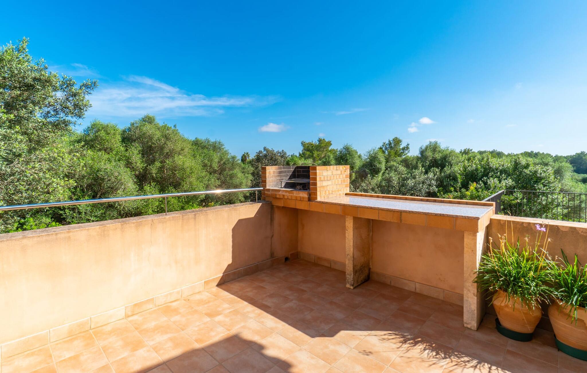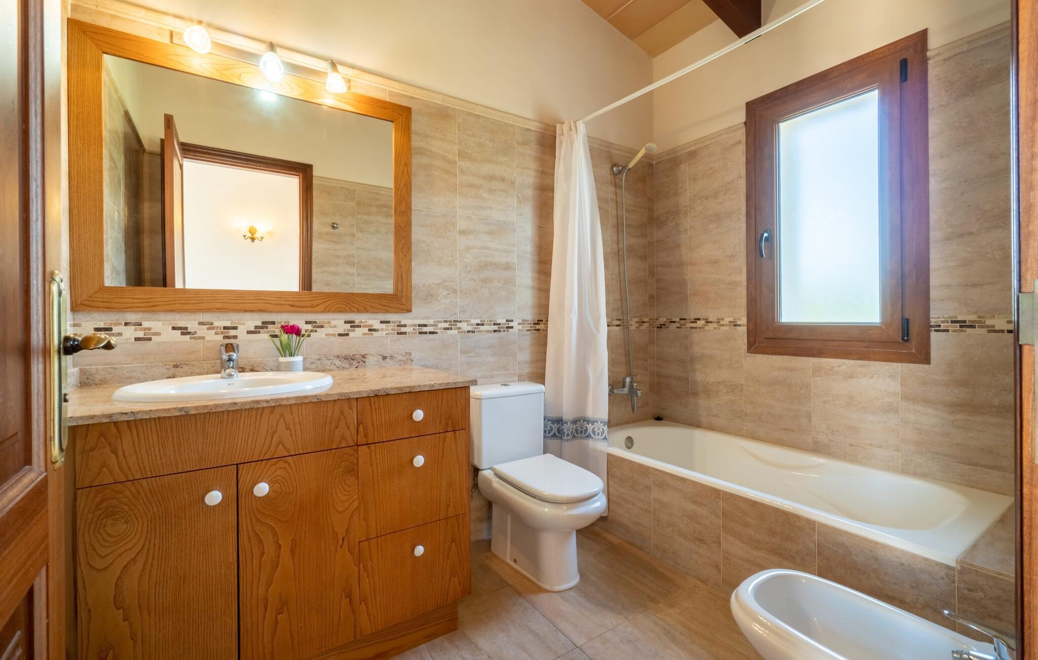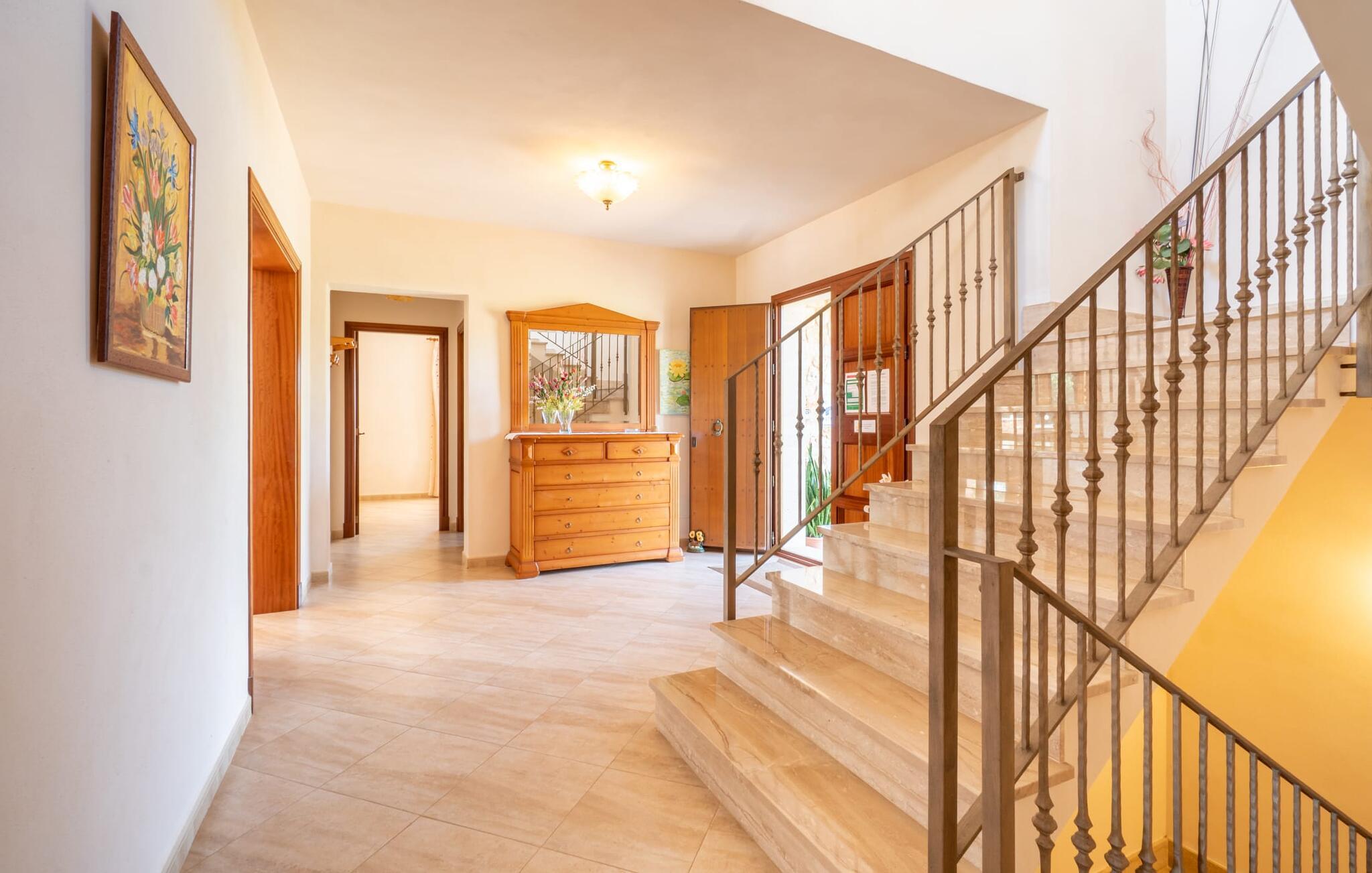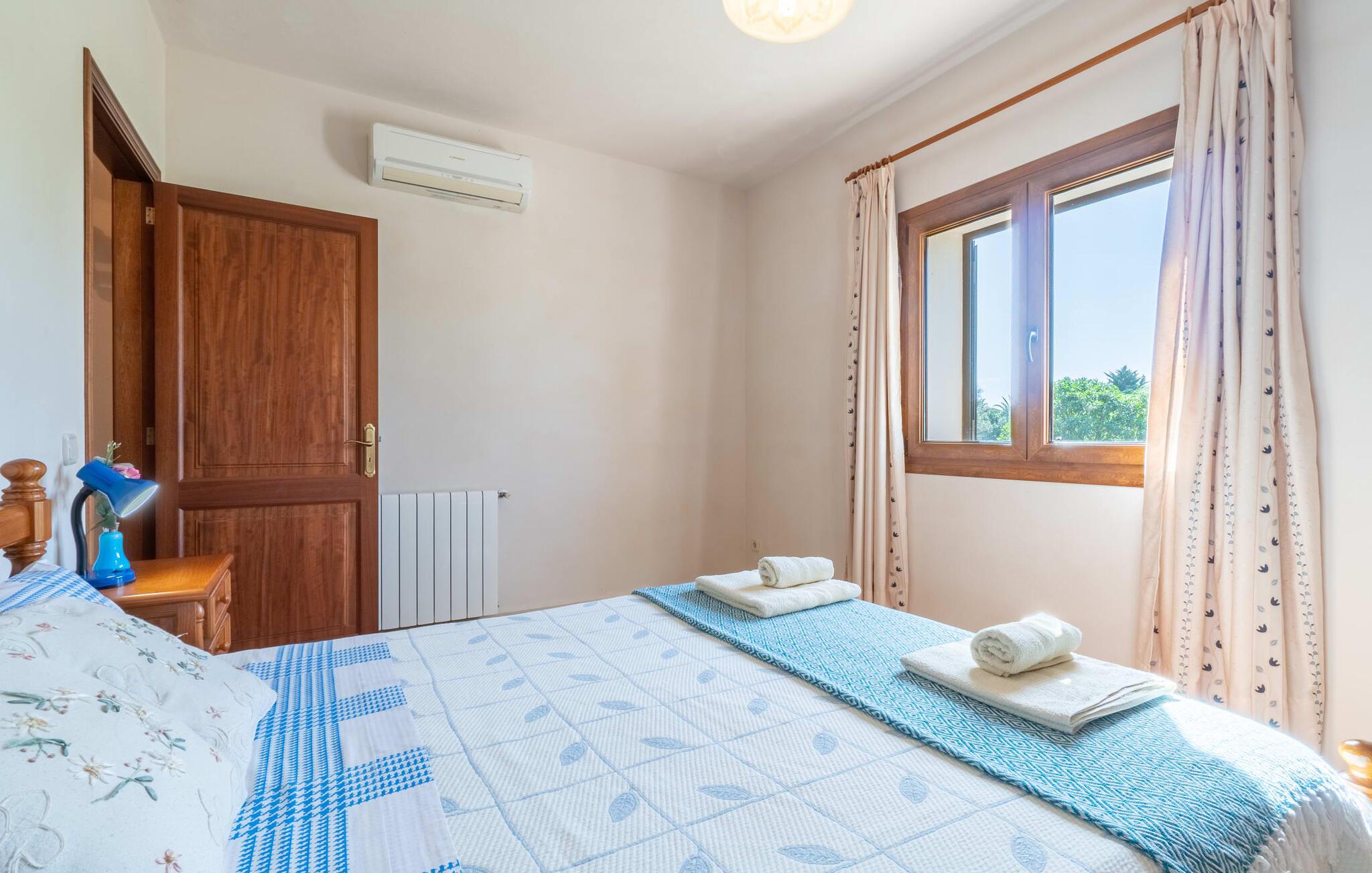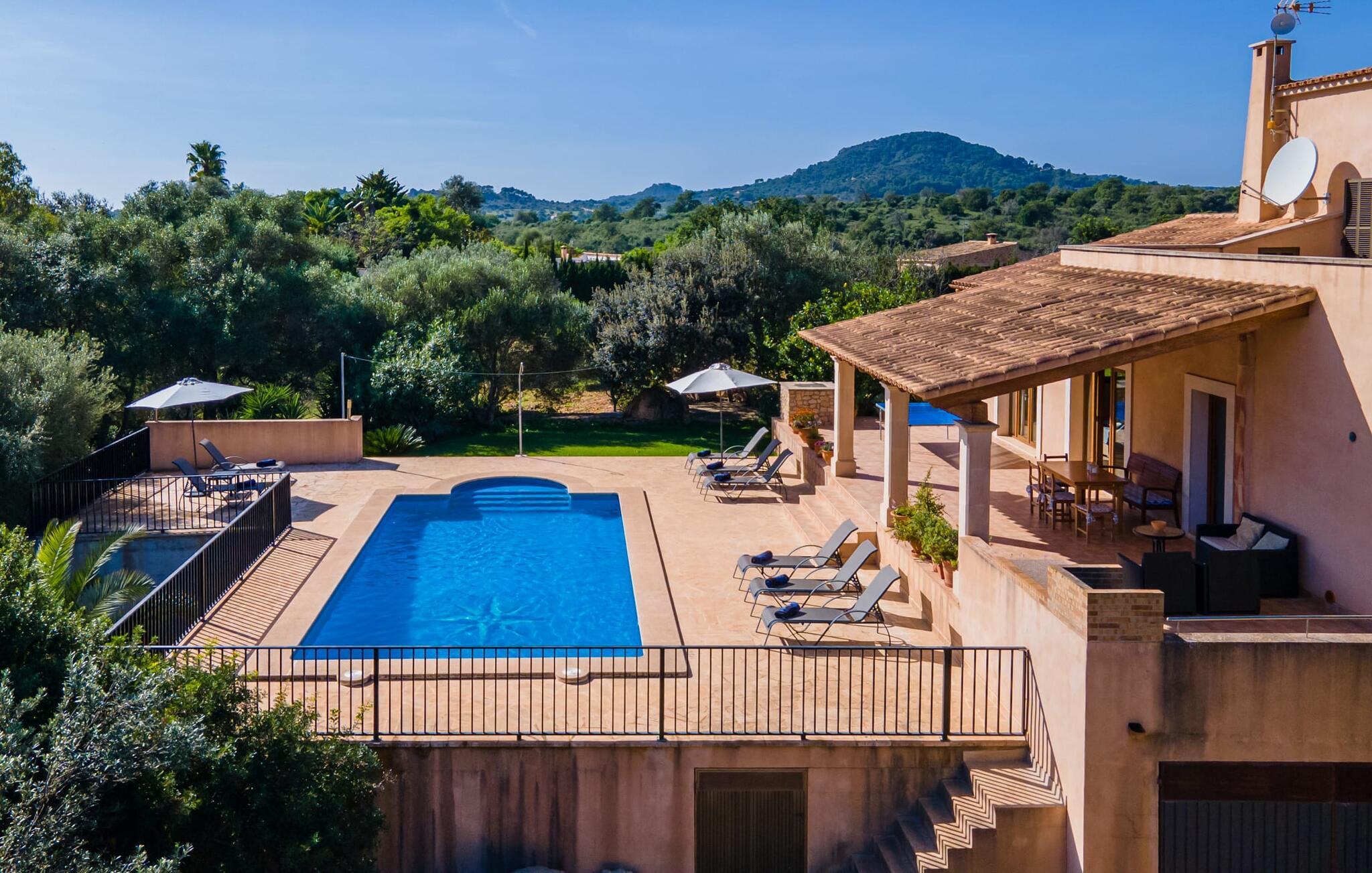 Når I når til fincaen "Can Rito Nou", genkender I straks den typiske mallorcanske stil i den nye bygning, som består af traditionelle stenbrud. Selv udefra får man et indtryk af hele anlæggets bemærkelsesværdige rummelighed. Nysgerrigheden efter mere er vakt. Mange mandeltræer og nogle oliventræer vokser på ejendommen, og der er endda et citrontræ. Bilen kan parkeres bagerst i huset. Stien fører den feriegæst rundt om huset og fører til den velholdte græsplæne. De små træer i kanten af plænen giver et roligt, skyggefuldt sted, hvis solen er for stærk. Derfra kan I nå det vidunderlige poolområde på få skridt. Poolen er fuldstændig omgivet af en brolagt terrasse. I finder også masser af liggestole her. En udendørs bruser fuldender komforten. Herfra har I udsigt til den store ejendom, der hører til fincaen. Til gengæld vandrer udsigten over bassinets vand mod fincaen. Rent privatliv og en absolut "ferie at slukke" er garanteret her. Fra det skønne poolområde kan man via få trin nå bygningens meget rummelige terrasse. Det er overdækket og inviterer jer til at blive hængende på ethvert tidspunkt af dagen. Da der er meget plads her, giver det mening at stille det eksisterende bordtennisbord op og starte en ferieturnering f.eks. En muret udendørs grill med opbevaringsplads inviterer til sjove grillaftener. Efter et længere ophold i solen eller i poolen finder I helt sikkert et skyggefuldt sted her - hvis I vil. Kommer man ind i fincaen forfra, når man det rummelige indgangsparti. Derfra kommer I ind i stuen med et stort spisebord. Dette værelse byder på masser af plads, er komfortabelt og funktionelt indrettet og er særligt populært om aftenen. Udover et moderne fladskærms-tv og anden moderne teknologi er der en hyggelig pejs, som udstråler en hyggelig varme som varmelegeme i overgangsperioden, men som også altid er velegnet til at nyde romantiske timer. I køkkenet, som er udstyret med teknologi, der ikke lader noget tilbage at ønske og afventer tilberedningen af typiske spanske retter, er der endnu et spisebord, måske til et "lille måltid imellem". Opholds- og spiseområdet har synlige bjælkelofter, hvilket giver en typisk mallorcansk atmosfære. Alle værelser i fincaen er meget lyse, da solen dækker hele området. I stueetagen er der to hyggelige soveværelser, hvis indretning garanterer en behagelig nattesøvn. To moderne badeværelser, som er omfattende udstyret og giver glæde både morgen og aften, fuldender værelserne i stueetagen. Den statelige trappe i indgangspartiet fører jer til øverste etage. Også her er der to indbydende soveværelser med hvert sit badeværelse. Fra begge soveværelser er der adgang til den store tagterrasse, som byder på en vidunderlig udsigt over det mallorcanske landskab. Efter dagens eventyr er dette også et ideelt tilflugtssted, hvis I leder efter lidt fred og ro. Nogle af de fortryllende strande på øen Mallorca ligger cirka 8 km væk. Den næste by, det nærmeste supermarked og en hæveautomat er ca. 4 km væk. Et par kilometer sydøst for den nærliggende by Felanitx ligger Santuari de Sant Salvador-klosteret, grundlagt i 1342, på Puig de Sant Salvador-bjerget. Ruinerne af Castell de Santueri er en kort køretur væk. Mellem Cala d'Or og Portocolom, også meget tæt på, ligger bugten Cala sa Nau, som er kendt som et dykkerområde, især for huledykkere. Hver søndag morgen er der et ugentligt marked i byen Felanitz. Den nærmeste golfbane ligger kun 8 km væk. Den meget rummelige og komfortable finca "Can Rito Nou" ligger på en stor grund med en absolut rolig beliggenhed i den sydøstlige del af øen. Det ligger afsides og giver betingelserne for en helt afslappende ferie. Aircondition i ejendommen er inkluderet i prisen, men dets brug er begrænset mellem kl. 20.00 og 8.00. Bagefter vil den valgfrie ekstra brug blive opkrævet kontant på stedet. Valgfri brug af varme er inkluderet i prisen fra 18:00 til 23:00 og fra 06:00 til 9:00.