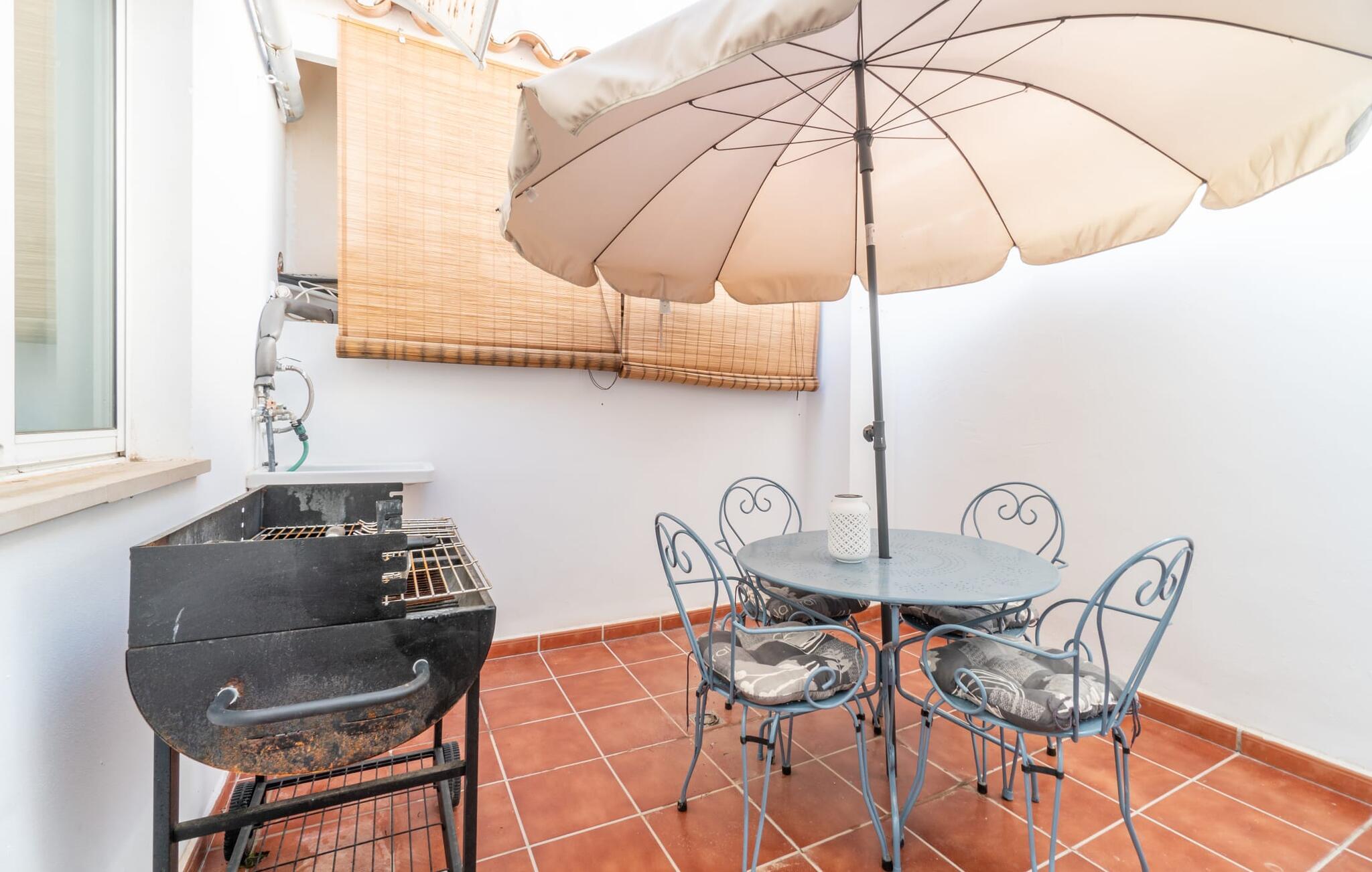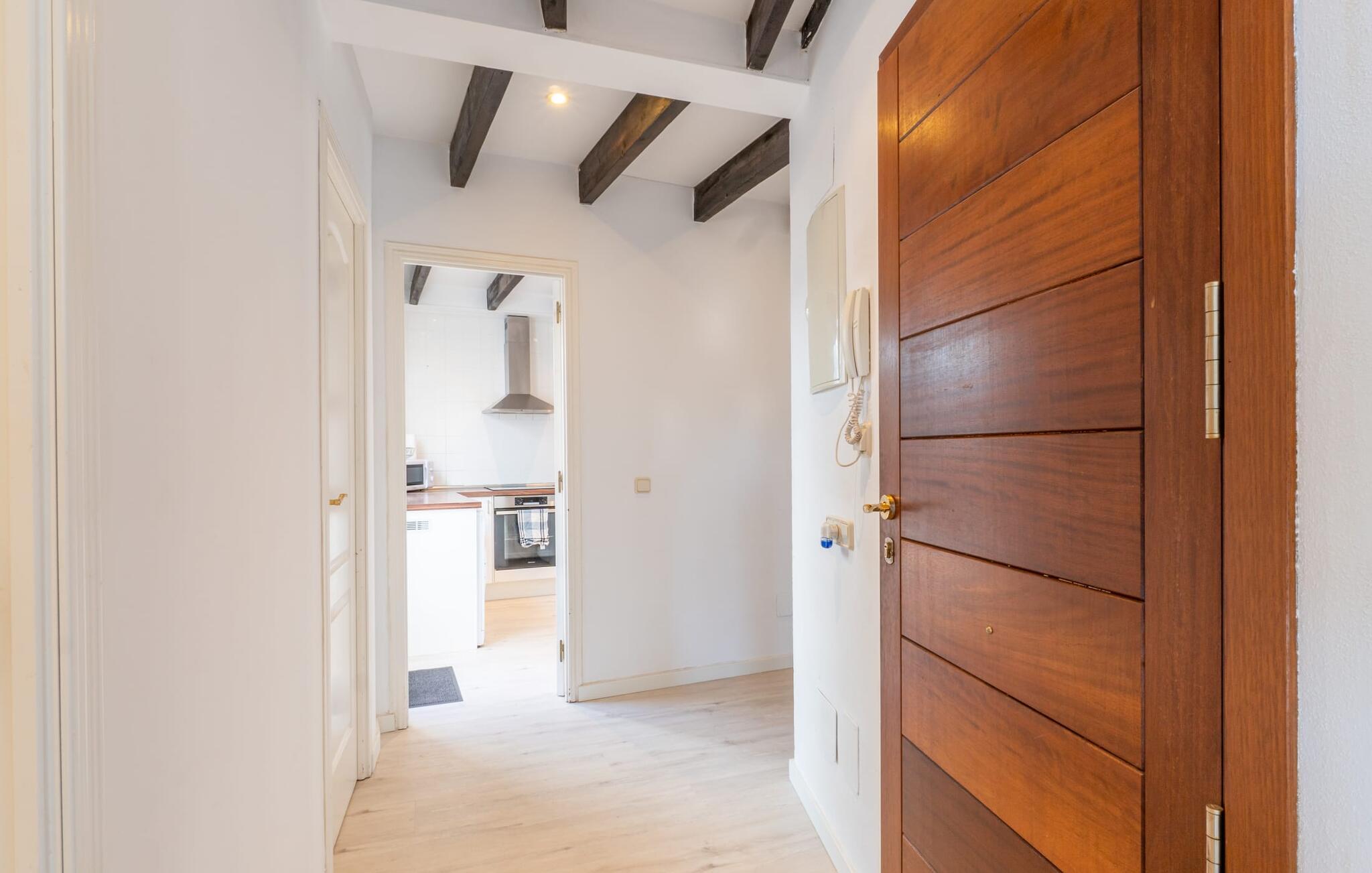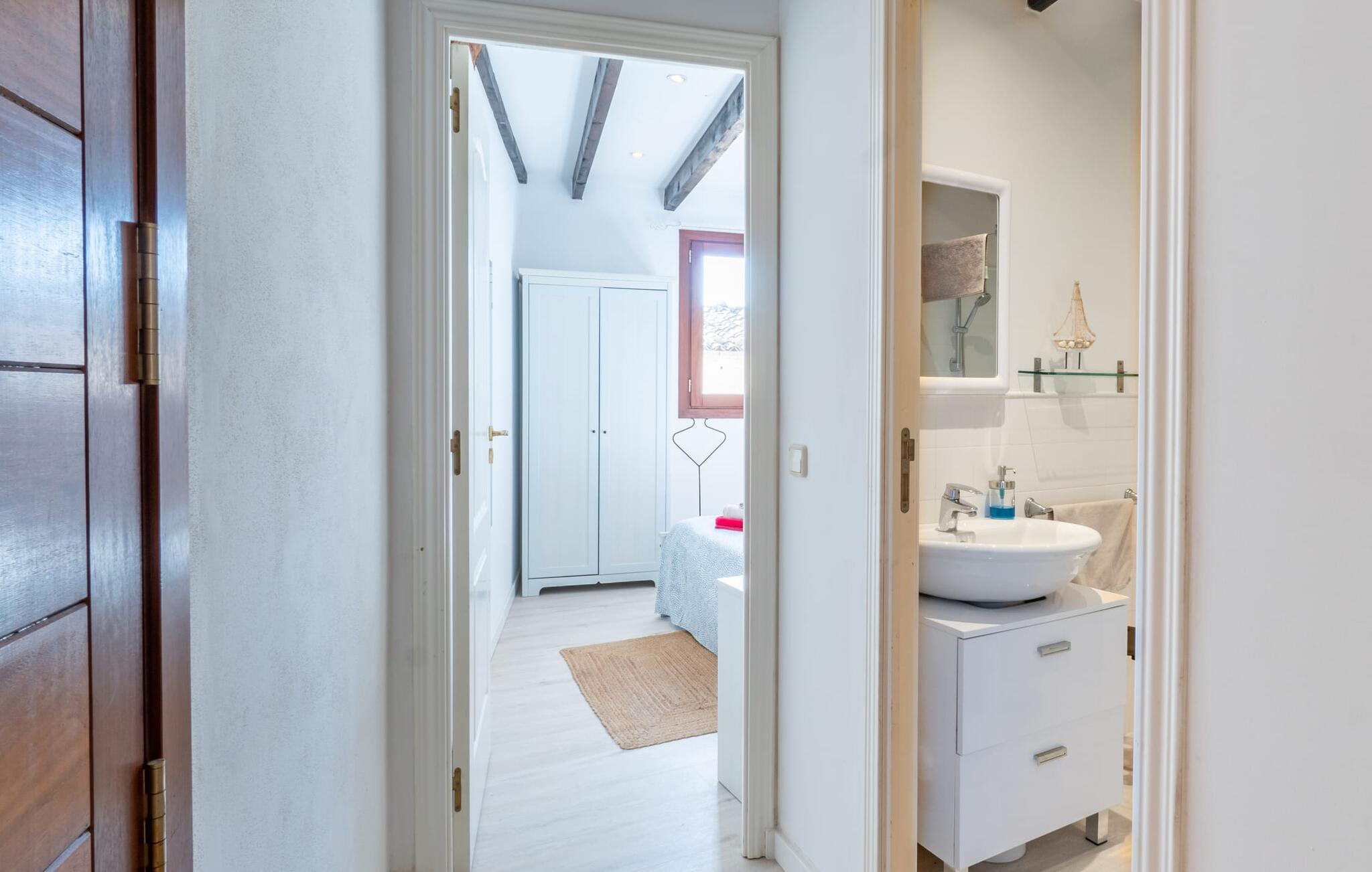 Huset, som denne lejlighed ligger i, ligger ved foden af Tramuntana-bjergene, overfor landsbykirken. Det kan tjene som en ideel base for at udforske området. Samtidig har I mulighed for at opleve autentisk ø-liv i denne typiske mallorcanske landsby. Dem, der kan lide at tilbringe tid udendørs, vil finde en spiseplads på terrassen. Der er ingen grænser for omfattende solbadning, en udendørs morgenmad eller en grillaften. Lejligheden på første sal byder på en behagelig atmosfære til indendørs ophold. Lyse vægge, synlige bjælkelofter og naturstenselementer præger den hyggelige atmosfære. Stuen og spisestuen med sofa, spisebord og TV er et hyggeligt område at slappe af. Køkkenet er fuldt udstyret og derfor ideelt til selvstændig forplejning på ferien. Dobbeltværelset byder også på en masse komfort. Et moderne brusebad fuldender boligkomforten. Tilstedeværelsen af et varmt-koldt klimaanlæg muliggør behagelige ophold i denne ferielejlighed på Mallorca hele året rundt. Den hyggelige ferielejlighed "Can Roses" imponerer med sin smukke bjergkulisse og centrale beliggenhed i landsbyen. Beliggende på et højt plateau byder byen på enkle indkøbsmuligheder og restauranter. Større indkøb kan foretages i Selva (4 km) eller Campanet (3 km). Populære nordlige strande, herunder Platja del Muro, ligger ca. 21 km væk.