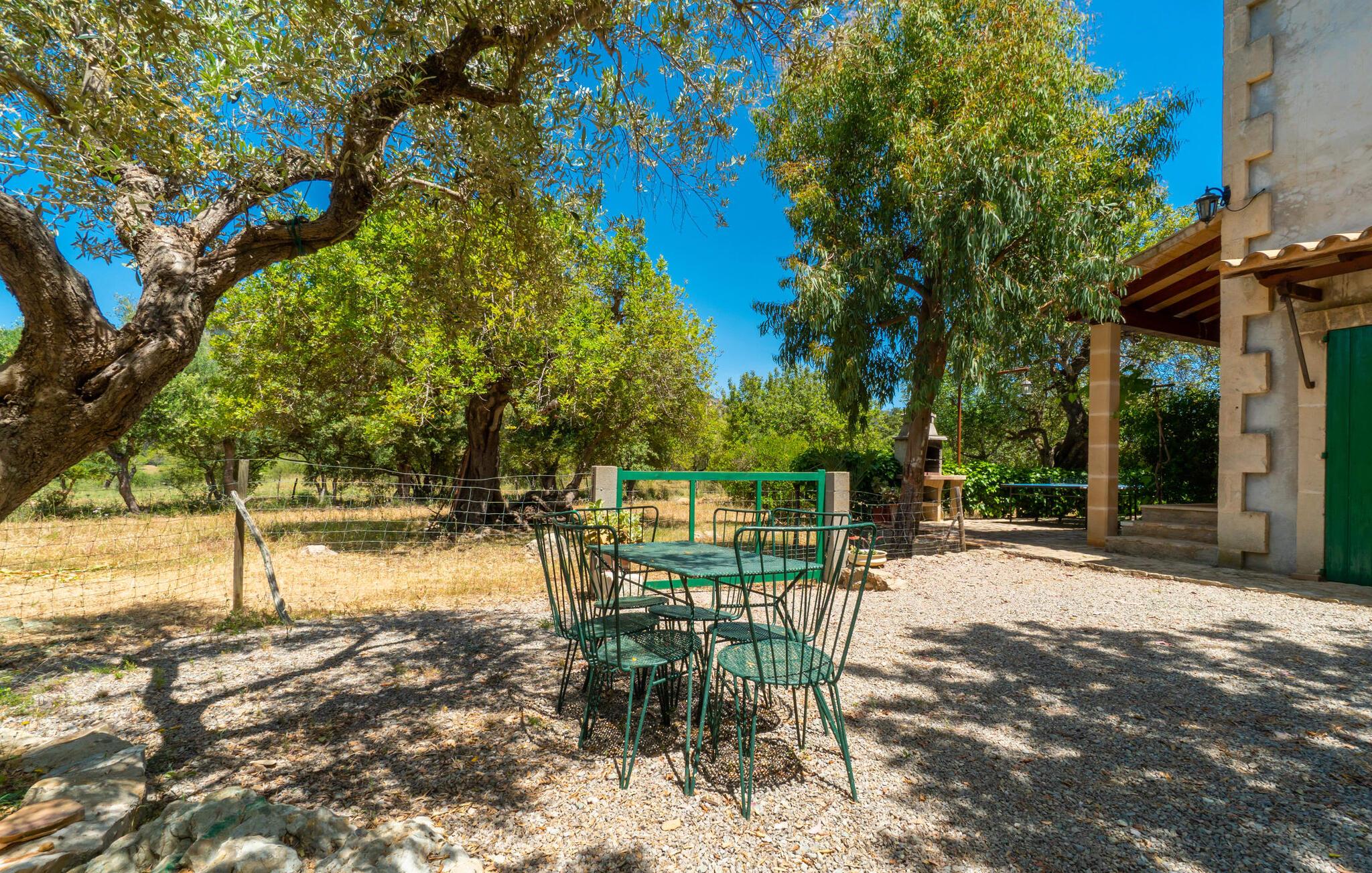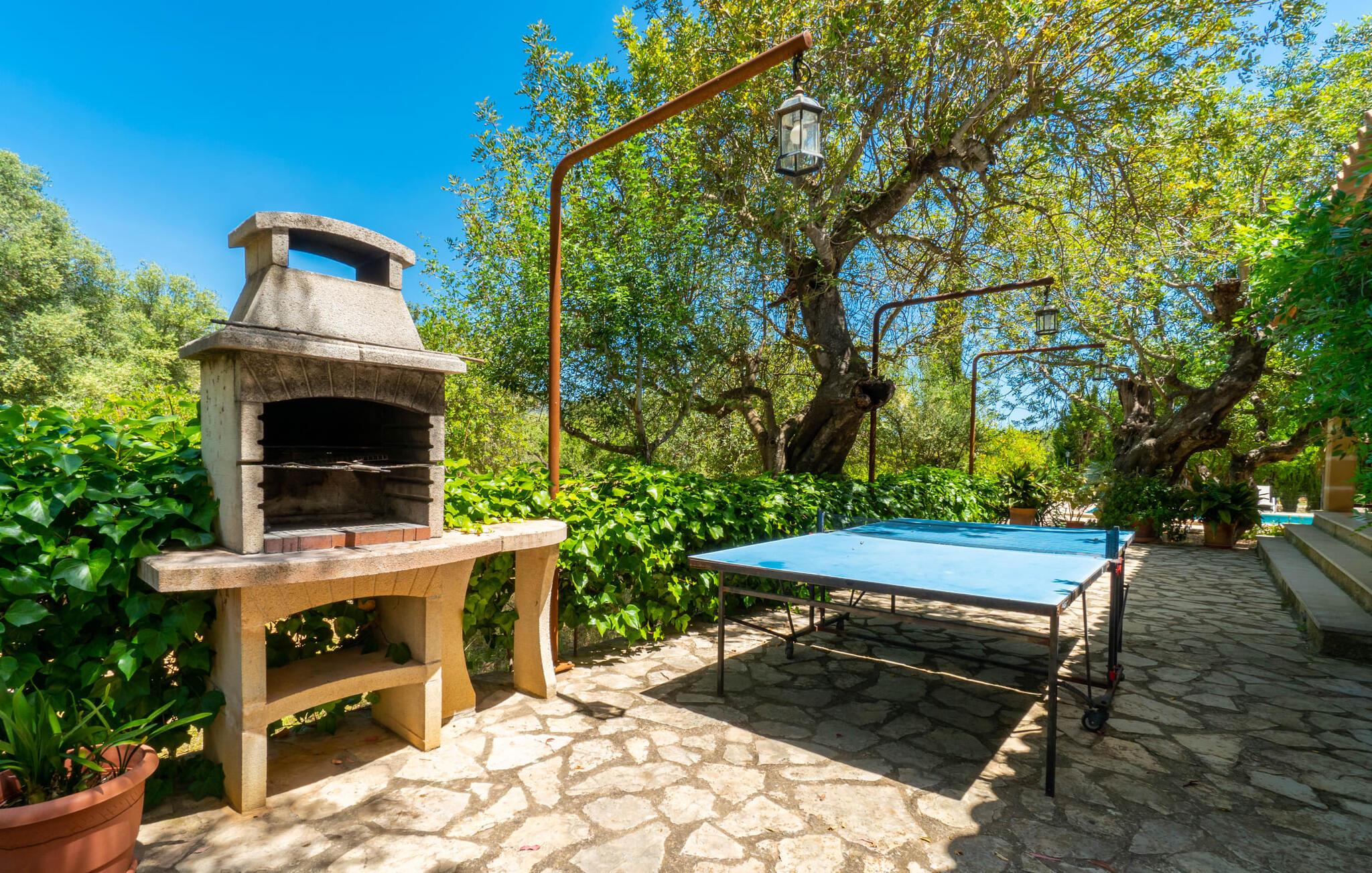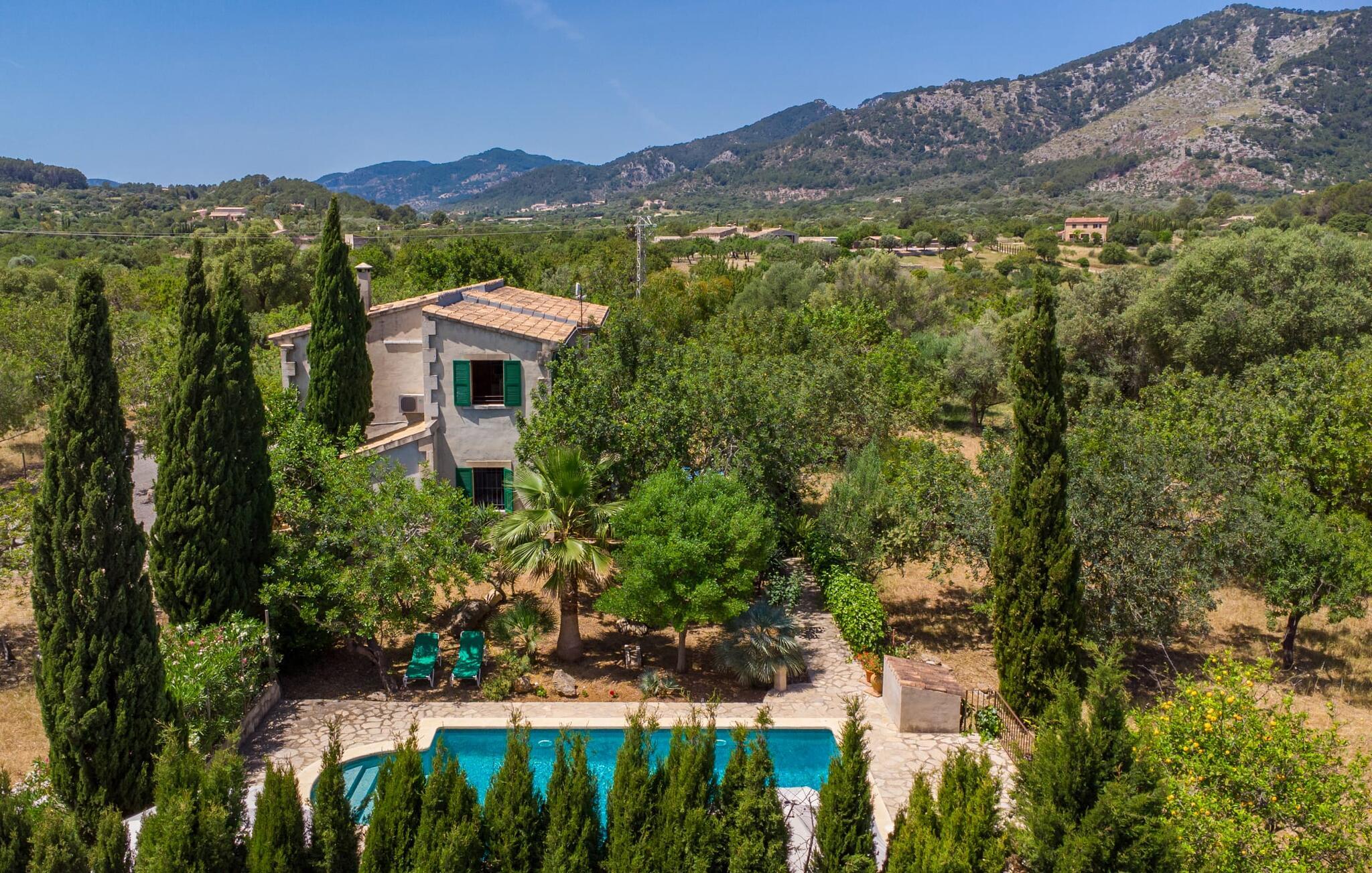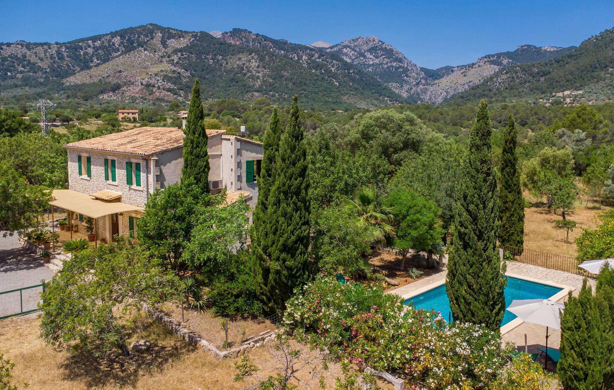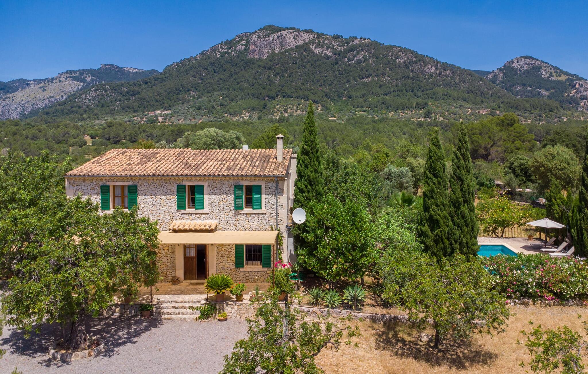 Ren natur og et klassisk landsted at have det godt i, vi er glade for at præsentere fincaen "Can Tabou" for jer. Omgivet af Mallorcas grønne frodighed året rundt, vil I opleve et to-etagers feriehus, der er ideelt for familier og venner. Hvor end I kigger hen, ser I mandel-, citron- og johannesbrødtræer på den mægtige baggrund af Tramuntana-bjergene. Denne finca glæder ikke kun natur- og sportsentusiaster, der nyder at vandre og spille golf. I kan også nyde det unikke privatliv i den forfriskende pool - til afkøling ind imellem eller til en nattesvømning. Mellem duftende oleander og palmer kan I spille et spil bordtennis eller nyde middelhavssolen på de medfølgende liggestole. Hvis I ønsker det, kan I også hvile i skyggen af træerne eller under paraplyerne omkring poolen. Der er yderligere udendørs siddepladser omkring huset, hvoraf nogle er overdækket. I kan afslutte dagen afslappet med en hyggelig grillaften, inden I vender tilbage til det velholdte sommerhus. Der vil I opleve det afslappede, landlige Mallorca, som vi kender og elsker det. De generelle værelser venter på jer i stueetagen. Dette inkluderer også det lyse, fabelagtigt fuldt udstyrede køkken - ideelt til bevidst valgt selvforplejning i dette charmerende feriehus i rustik stil. Køkkenet er forbundet med stue og spisestue med pejs via en rund, stenbeklædt buegang. En separat tv-stue fuldender hyggen. Der er et badeværelse på hver etage (brusebadeværelse i stueetagen og hyggeligt badekar mellem de tre airconditionerede soveværelser på øverste etage). Værelserne er generelt meget rummelige og har dobbeltsenge eller enkeltsenge. For alle, der af og til flytter deres hjemmekontor til deres feriehus, mens de er på ferie, er der et særligt højdepunkt i form af et studie med en fænomenal udsigt over Tramuntana-bjergene. "Can Tabou" formidler en behagelig følelse af fred og frihed. Simpelthen uimodståelig, eller hvad synes du? Stuehuset "Can Tabou" afspejler perfekt fordelene ved et traditionelt mallorcansk feriehus. Det statelige stenbrudshus er omgivet af masser af natur og fred - lige hvad I ønsker. For shopping, besøg den nærliggende bjerglandsby Campanet, et romantisk, men arkitektonisk tiltalende sted på den nordlige del af øen. For en dag på stranden kan I tage til de varierede bugter i Pollença eller Alcúdia, cirka 30 minutter væk i bil.