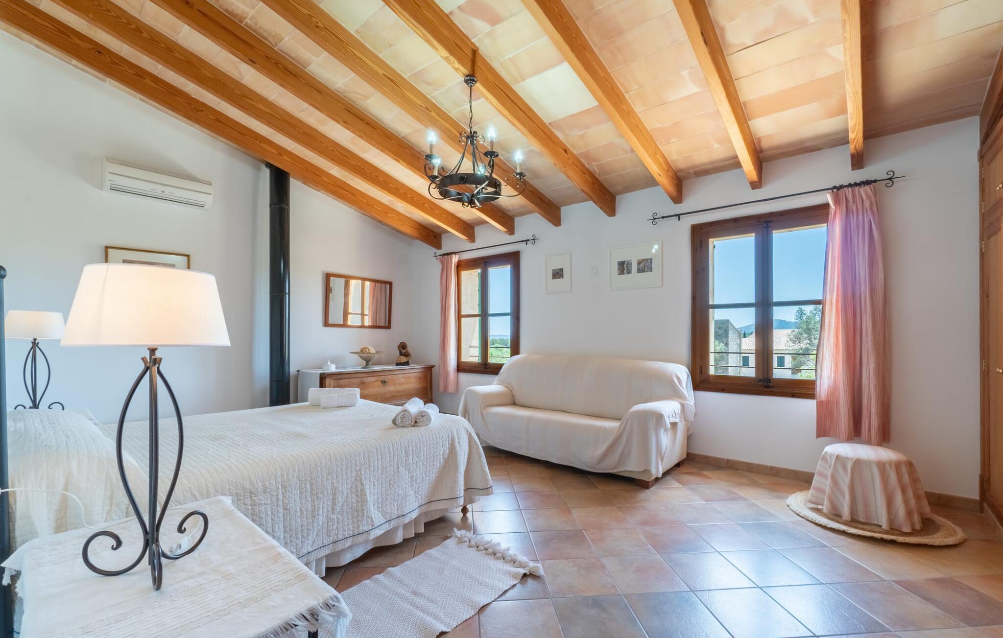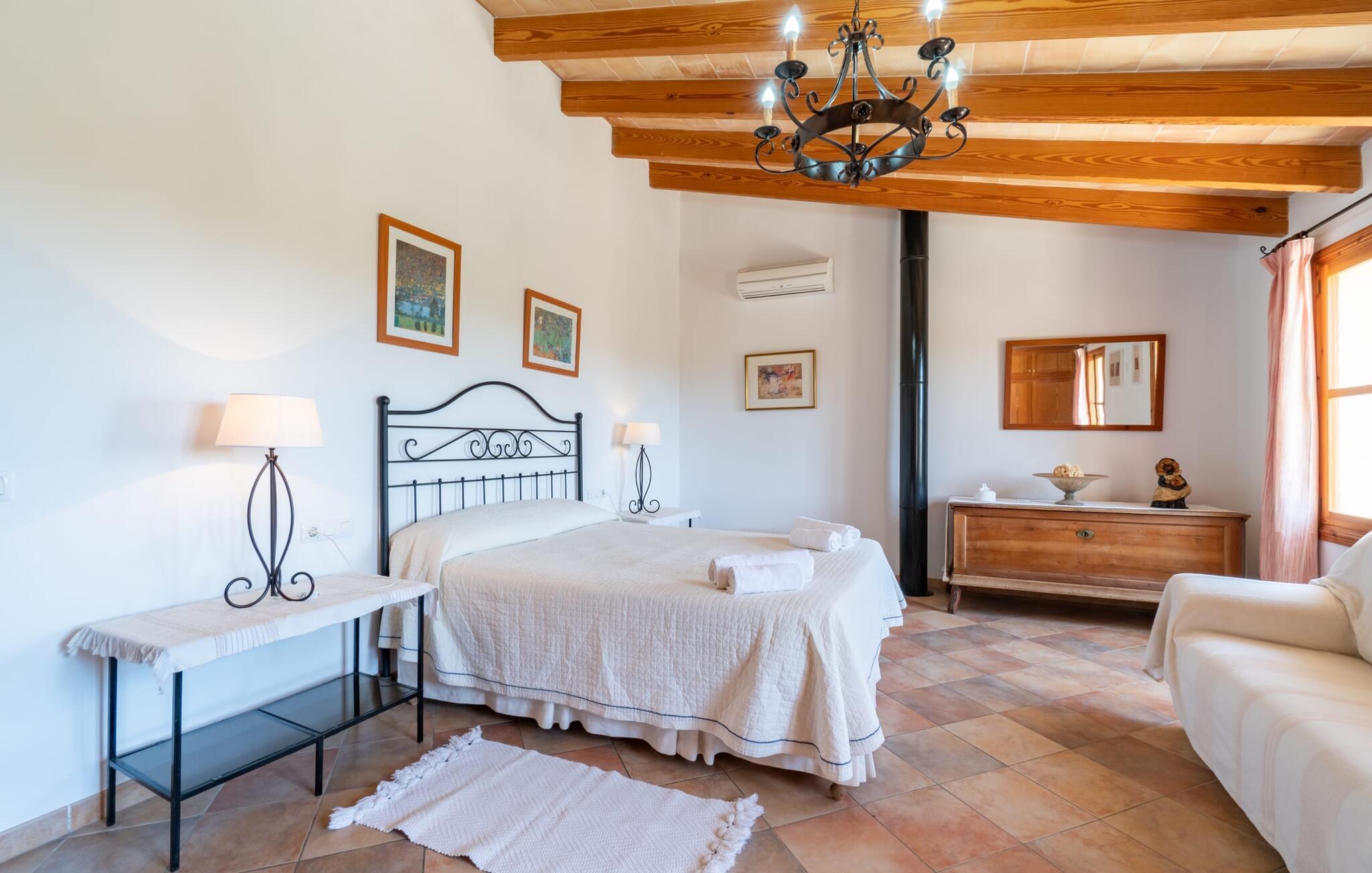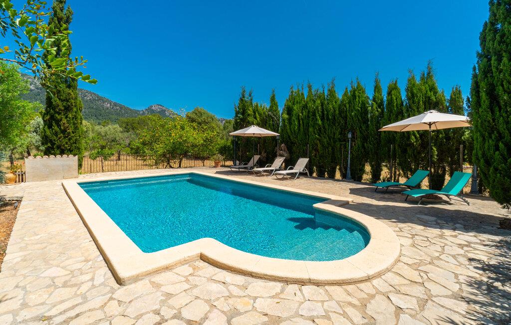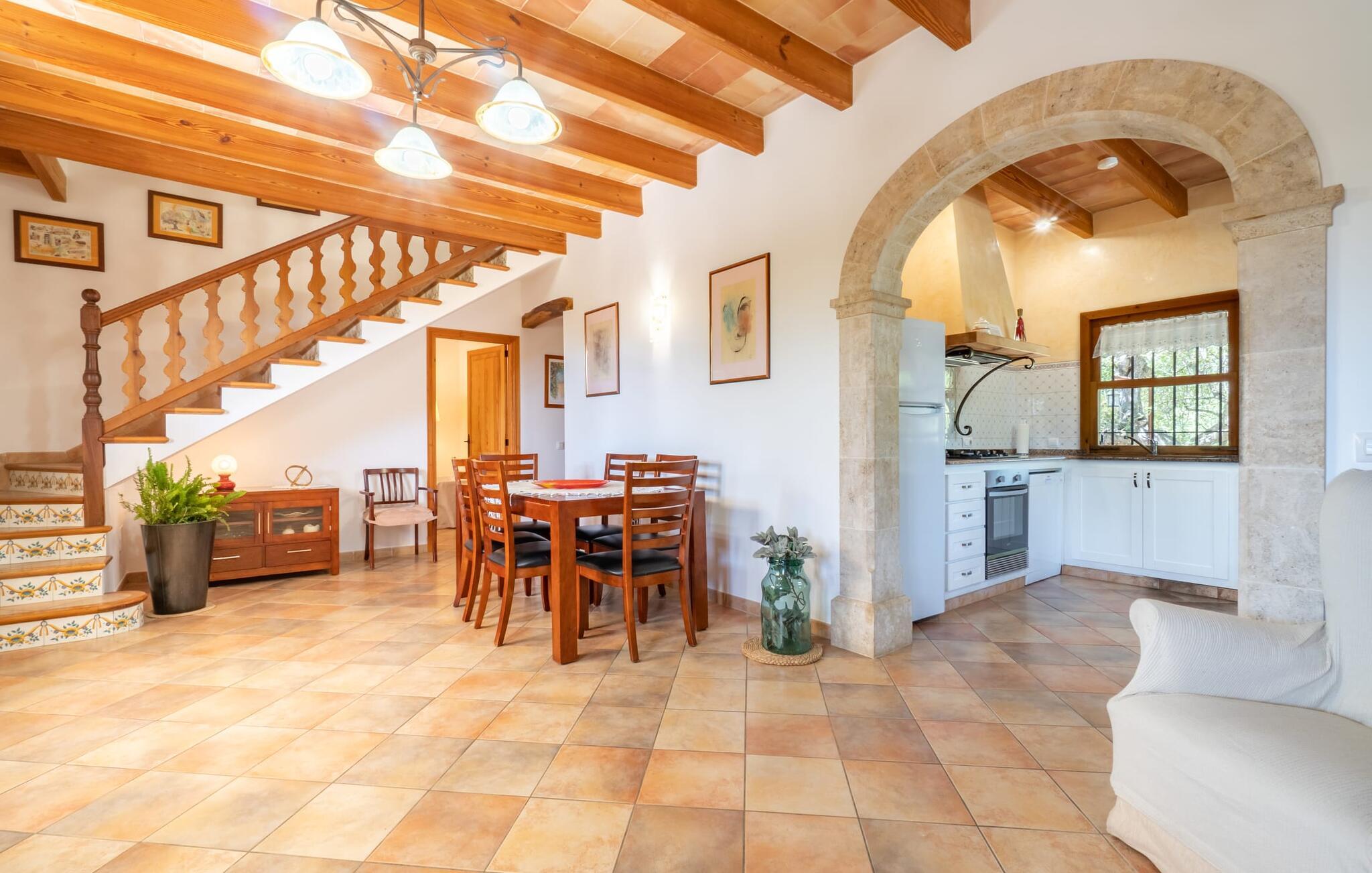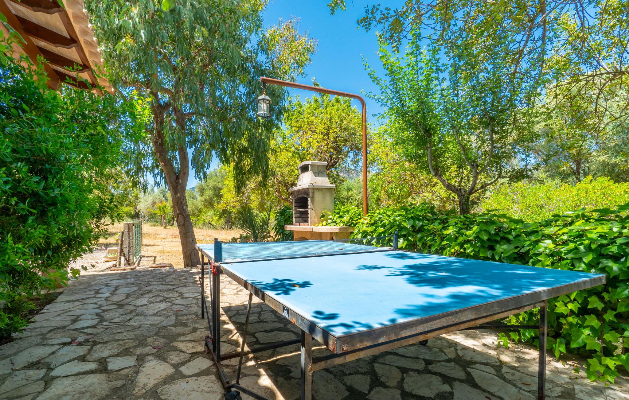 Ren natur og et klassisk landsted at have det godt i, vi er glade for at præsentere fincaen "Can Tabou" for jer. Omgivet af Mallorcas grønne frodighed året rundt, vil I opleve et to-etagers feriehus, der er ideelt for familier og venner. Hvor end I kigger hen, ser I mandel-, citron- og johannesbrødtræer på den mægtige baggrund af Tramuntana-bjergene. Denne finca glæder ikke kun natur- og sportsentusiaster, der nyder at vandre og spille golf. I kan også nyde det unikke privatliv i den forfriskende pool - til afkøling ind imellem eller til en nattesvømning. Mellem duftende oleander og palmer kan I spille et spil bordtennis eller nyde middelhavssolen på de medfølgende liggestole. Hvis I ønsker det, kan I også hvile i skyggen af træerne eller under paraplyerne omkring poolen. Der er yderligere udendørs siddepladser omkring huset, hvoraf nogle er overdækket. I kan afslutte dagen afslappet med en hyggelig grillaften, inden I vender tilbage til det velholdte sommerhus. Der vil I opleve det afslappede, landlige Mallorca, som vi kender og elsker det. De generelle værelser venter på jer i stueetagen. Dette inkluderer også det lyse, fabelagtigt fuldt udstyrede køkken - ideelt til bevidst valgt selvforplejning i dette charmerende feriehus i rustik stil. Køkkenet er forbundet med stue og spisestue med pejs via en rund, stenbeklædt buegang. En separat tv-stue fuldender hyggen. Der er et badeværelse på hver etage (brusebadeværelse i stueetagen og hyggeligt badekar mellem de tre airconditionerede soveværelser på øverste etage). Værelserne er generelt meget rummelige og har dobbeltsenge eller enkeltsenge. For alle, der af og til flytter deres hjemmekontor til deres feriehus, mens de er på ferie, er der et særligt højdepunkt i form af et studie med en fænomenal udsigt over Tramuntana-bjergene. "Can Tabou" formidler en behagelig følelse af fred og frihed. Simpelthen uimodståelig, eller hvad synes du? Stuehuset "Can Tabou" afspejler perfekt fordelene ved et traditionelt mallorcansk feriehus. Det statelige stenbrudshus er omgivet af masser af natur og fred - lige hvad I ønsker. For shopping, besøg den nærliggende bjerglandsby Campanet, et romantisk, men arkitektonisk tiltalende sted på den nordlige del af øen. For en dag på stranden kan I tage til de varierede bugter i Pollença eller Alcúdia, cirka 30 minutter væk i bil.
