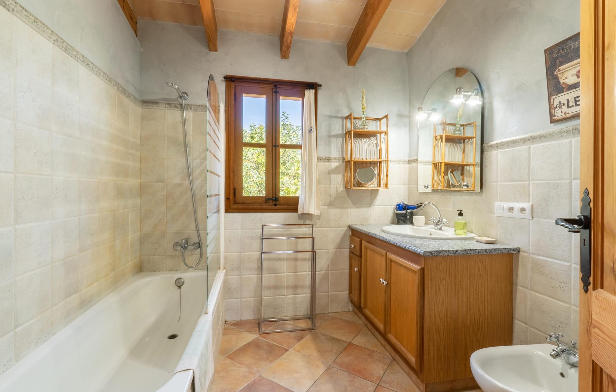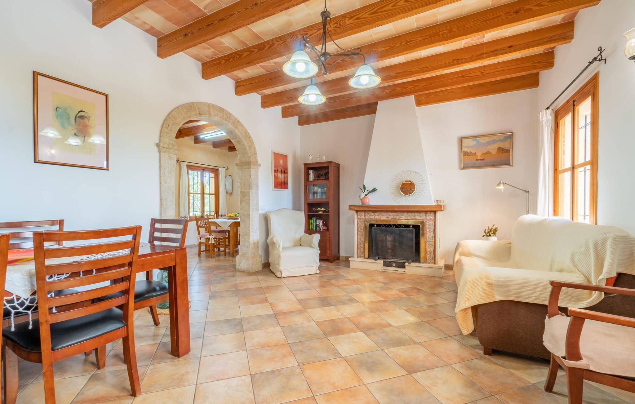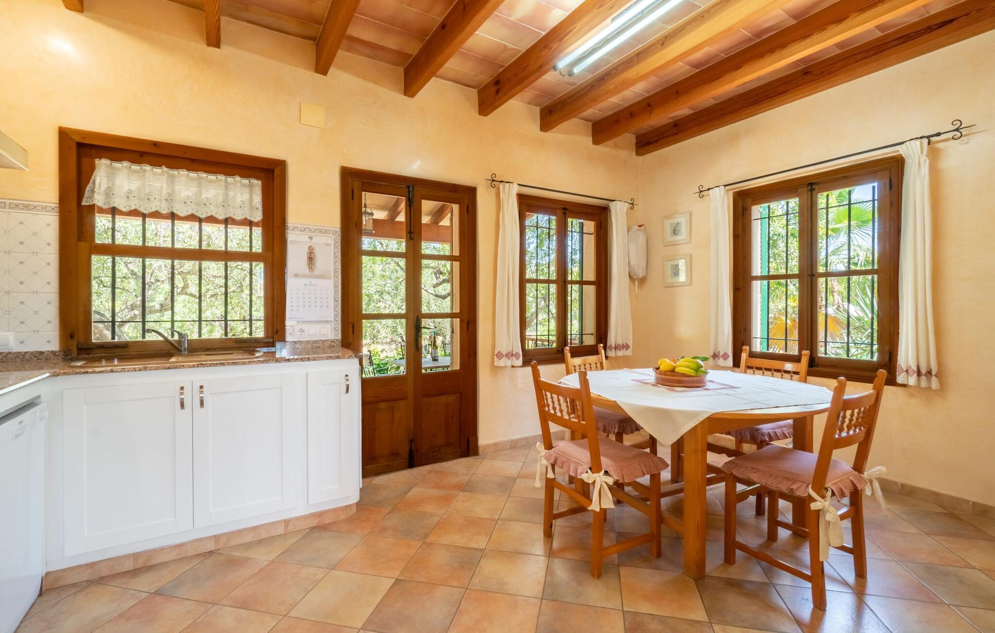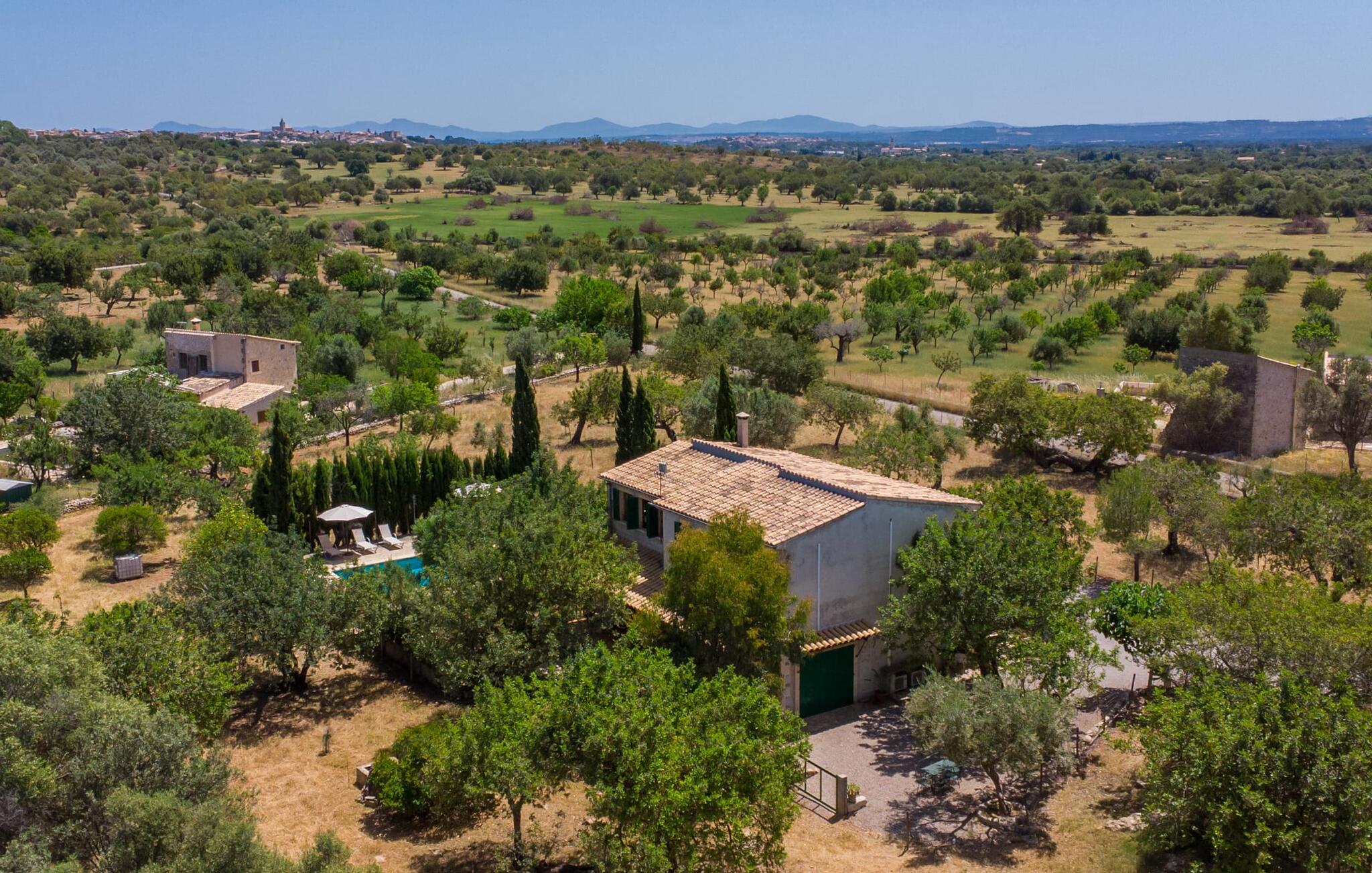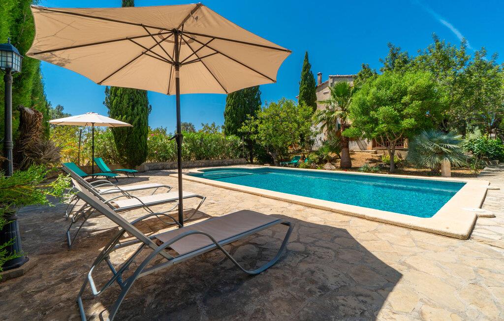 Ren natur og et klassisk landsted at have det godt i, vi er glade for at præsentere fincaen "Can Tabou" for jer. Omgivet af Mallorcas grønne frodighed året rundt, vil I opleve et to-etagers feriehus, der er ideelt for familier og venner. Hvor end I kigger hen, ser I mandel-, citron- og johannesbrødtræer på den mægtige baggrund af Tramuntana-bjergene. Denne finca glæder ikke kun natur- og sportsentusiaster, der nyder at vandre og spille golf. I kan også nyde det unikke privatliv i den forfriskende pool - til afkøling ind imellem eller til en nattesvømning. Mellem duftende oleander og palmer kan I spille et spil bordtennis eller nyde middelhavssolen på de medfølgende liggestole. Hvis I ønsker det, kan I også hvile i skyggen af træerne eller under paraplyerne omkring poolen. Der er yderligere udendørs siddepladser omkring huset, hvoraf nogle er overdækket. I kan afslutte dagen afslappet med en hyggelig grillaften, inden I vender tilbage til det velholdte sommerhus. Der vil I opleve det afslappede, landlige Mallorca, som vi kender og elsker det. De generelle værelser venter på jer i stueetagen. Dette inkluderer også det lyse, fabelagtigt fuldt udstyrede køkken - ideelt til bevidst valgt selvforplejning i dette charmerende feriehus i rustik stil. Køkkenet er forbundet med stue og spisestue med pejs via en rund, stenbeklædt buegang. En separat tv-stue fuldender hyggen. Der er et badeværelse på hver etage (brusebadeværelse i stueetagen og hyggeligt badekar mellem de tre airconditionerede soveværelser på øverste etage). Værelserne er generelt meget rummelige og har dobbeltsenge eller enkeltsenge. For alle, der af og til flytter deres hjemmekontor til deres feriehus, mens de er på ferie, er der et særligt højdepunkt i form af et studie med en fænomenal udsigt over Tramuntana-bjergene. "Can Tabou" formidler en behagelig følelse af fred og frihed. Simpelthen uimodståelig, eller hvad synes du? Stuehuset "Can Tabou" afspejler perfekt fordelene ved et traditionelt mallorcansk feriehus. Det statelige stenbrudshus er omgivet af masser af natur og fred - lige hvad I ønsker. For shopping, besøg den nærliggende bjerglandsby Campanet, et romantisk, men arkitektonisk tiltalende sted på den nordlige del af øen. For en dag på stranden kan I tage til de varierede bugter i Pollença eller Alcúdia, cirka 30 minutter væk i bil.