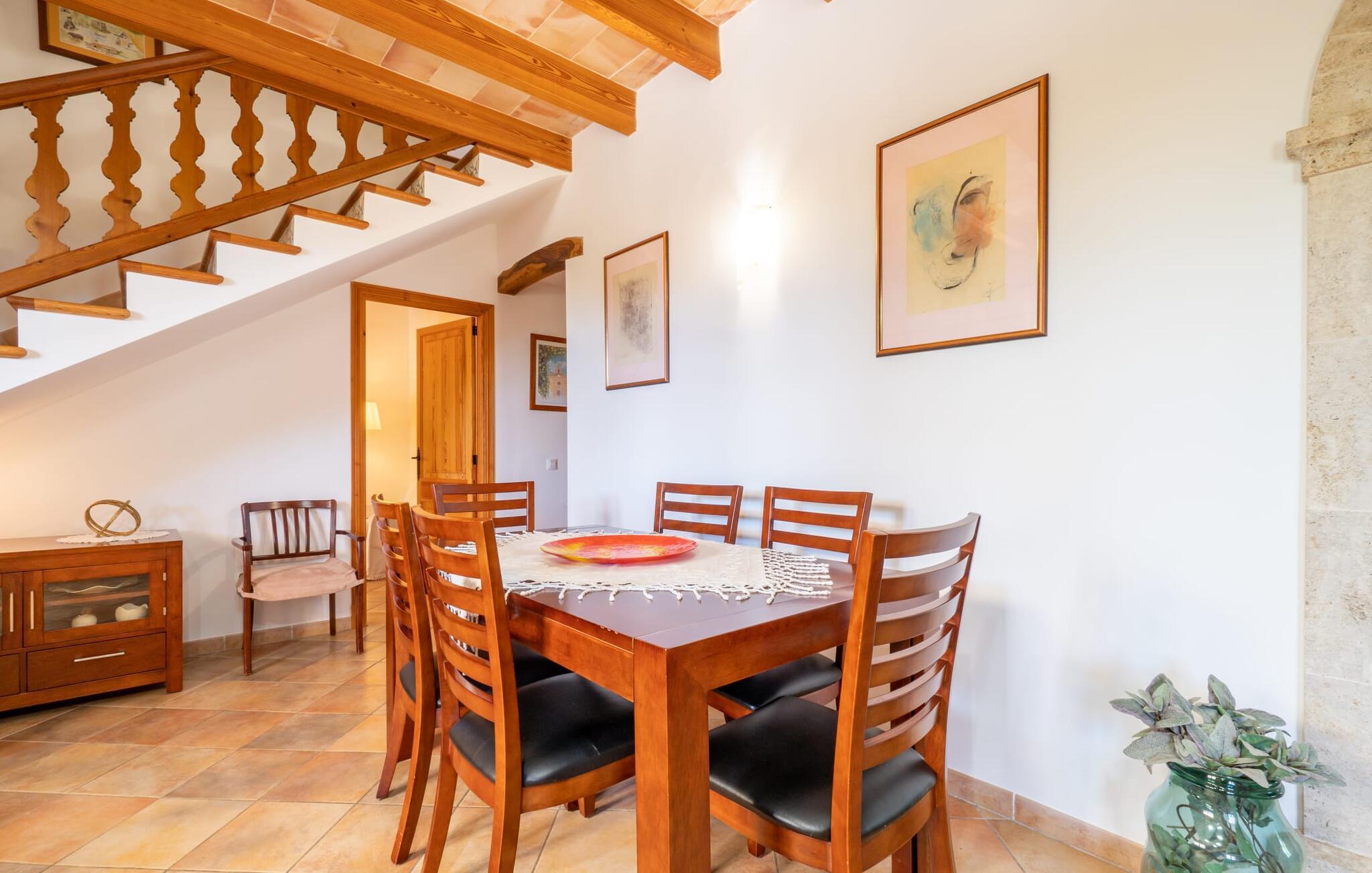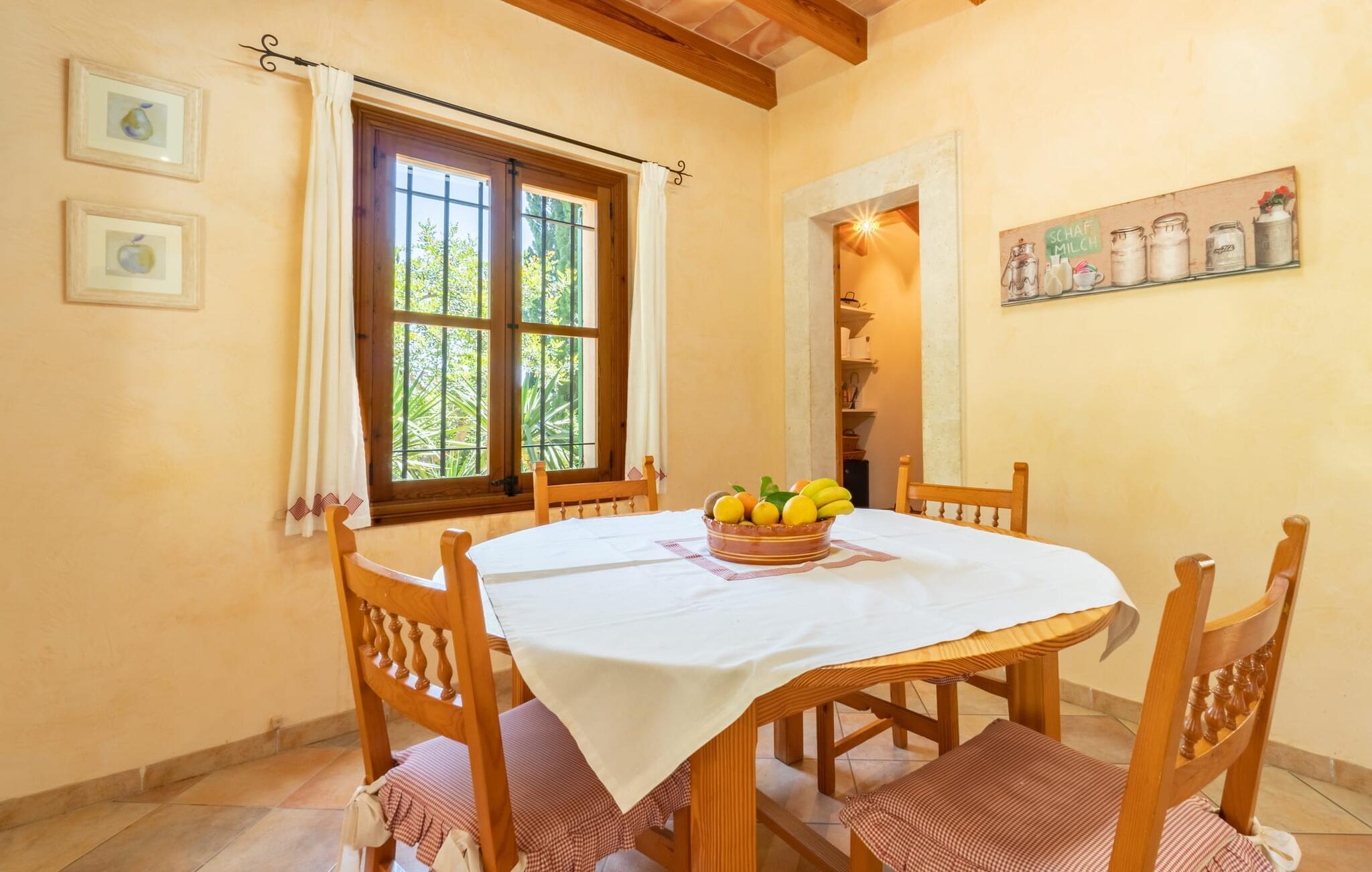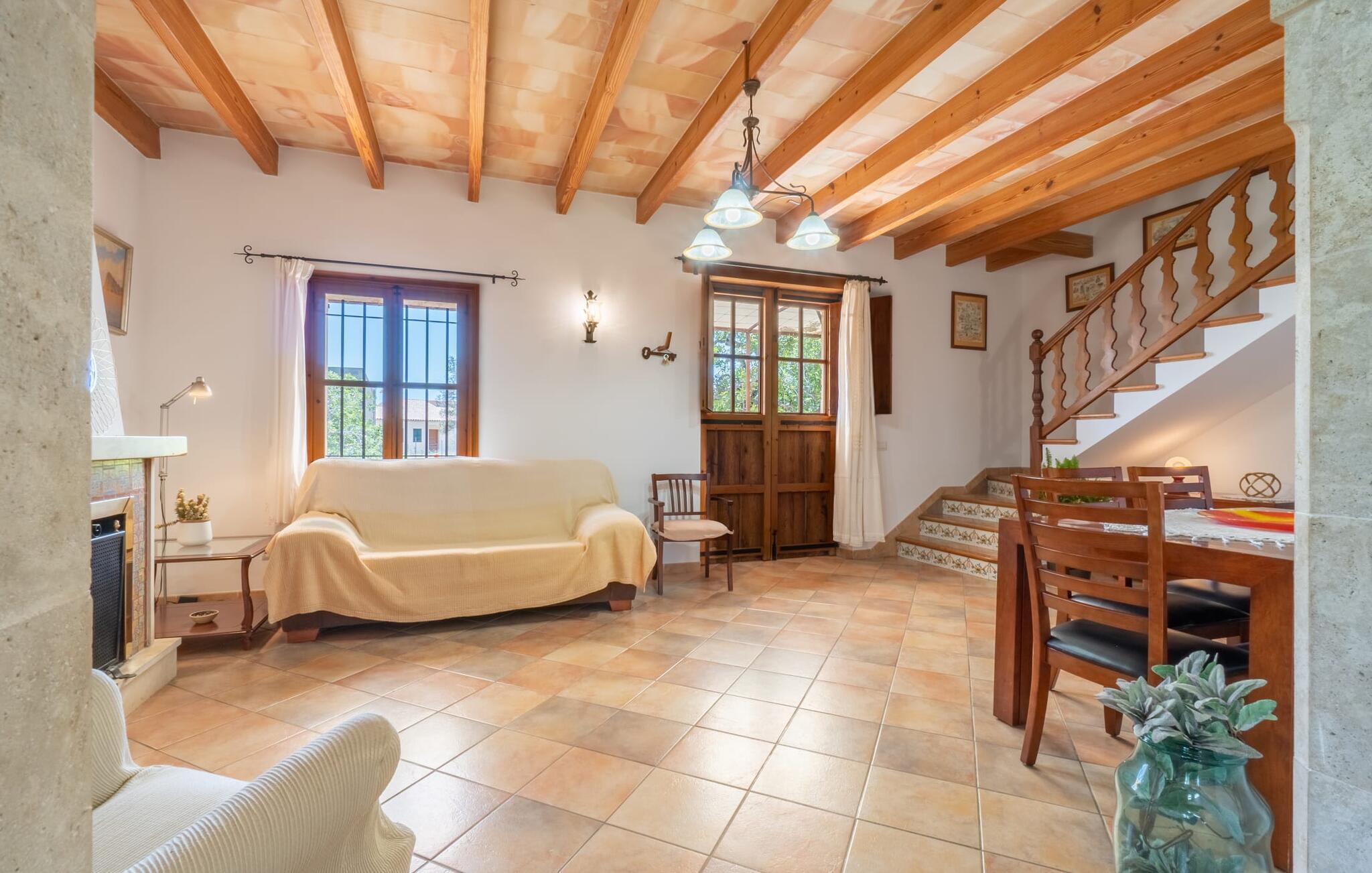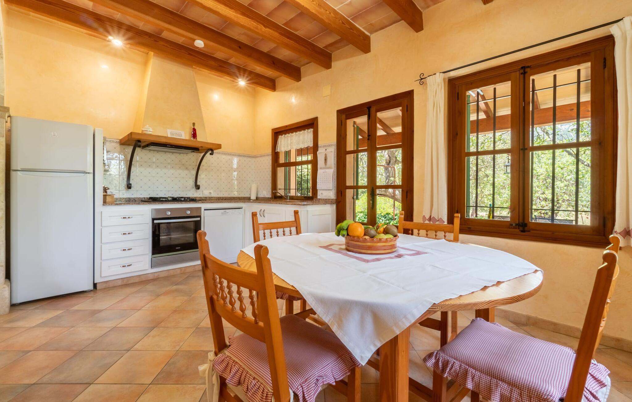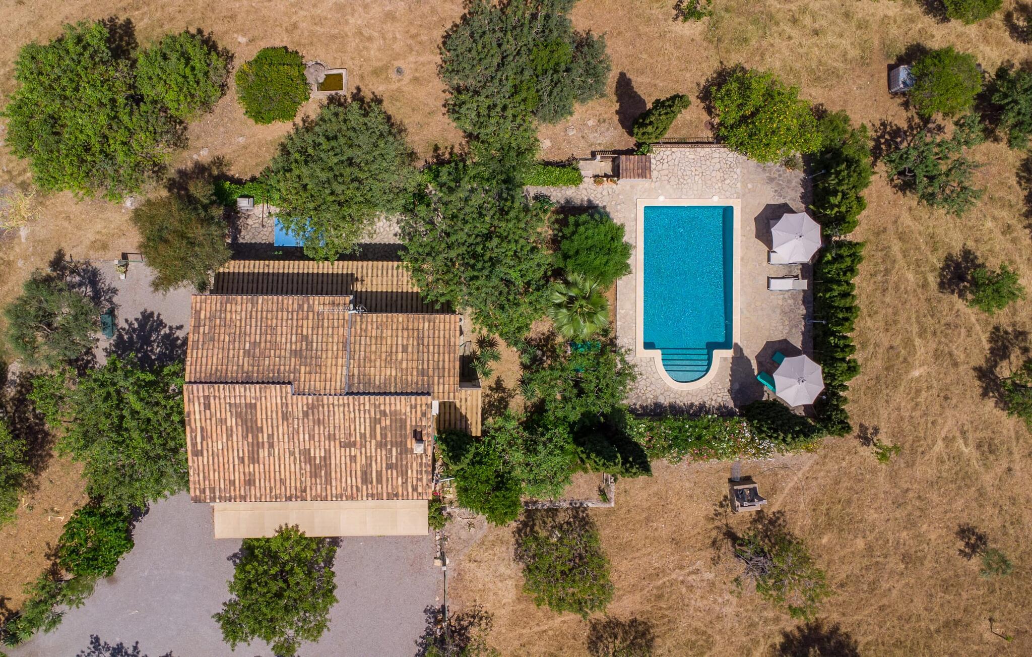 Ren natur og et klassisk landsted at have det godt i, vi er glade for at præsentere fincaen "Can Tabou" for jer. Omgivet af Mallorcas grønne frodighed året rundt, vil I opleve et to-etagers feriehus, der er ideelt for familier og venner. Hvor end I kigger hen, ser I mandel-, citron- og johannesbrødtræer på den mægtige baggrund af Tramuntana-bjergene. Denne finca glæder ikke kun natur- og sportsentusiaster, der nyder at vandre og spille golf. I kan også nyde det unikke privatliv i den forfriskende pool - til afkøling ind imellem eller til en nattesvømning. Mellem duftende oleander og palmer kan I spille et spil bordtennis eller nyde middelhavssolen på de medfølgende liggestole. Hvis I ønsker det, kan I også hvile i skyggen af træerne eller under paraplyerne omkring poolen. Der er yderligere udendørs siddepladser omkring huset, hvoraf nogle er overdækket. I kan afslutte dagen afslappet med en hyggelig grillaften, inden I vender tilbage til det velholdte sommerhus. Der vil I opleve det afslappede, landlige Mallorca, som vi kender og elsker det. De generelle værelser venter på jer i stueetagen. Dette inkluderer også det lyse, fabelagtigt fuldt udstyrede køkken - ideelt til bevidst valgt selvforplejning i dette charmerende feriehus i rustik stil. Køkkenet er forbundet med stue og spisestue med pejs via en rund, stenbeklædt buegang. En separat tv-stue fuldender hyggen. Der er et badeværelse på hver etage (brusebadeværelse i stueetagen og hyggeligt badekar mellem de tre airconditionerede soveværelser på øverste etage). Værelserne er generelt meget rummelige og har dobbeltsenge eller enkeltsenge. For alle, der af og til flytter deres hjemmekontor til deres feriehus, mens de er på ferie, er der et særligt højdepunkt i form af et studie med en fænomenal udsigt over Tramuntana-bjergene. "Can Tabou" formidler en behagelig følelse af fred og frihed. Simpelthen uimodståelig, eller hvad synes du? Stuehuset "Can Tabou" afspejler perfekt fordelene ved et traditionelt mallorcansk feriehus. Det statelige stenbrudshus er omgivet af masser af natur og fred - lige hvad I ønsker. For shopping, besøg den nærliggende bjerglandsby Campanet, et romantisk, men arkitektonisk tiltalende sted på den nordlige del af øen. For en dag på stranden kan I tage til de varierede bugter i Pollença eller Alcúdia, cirka 30 minutter væk i bil.