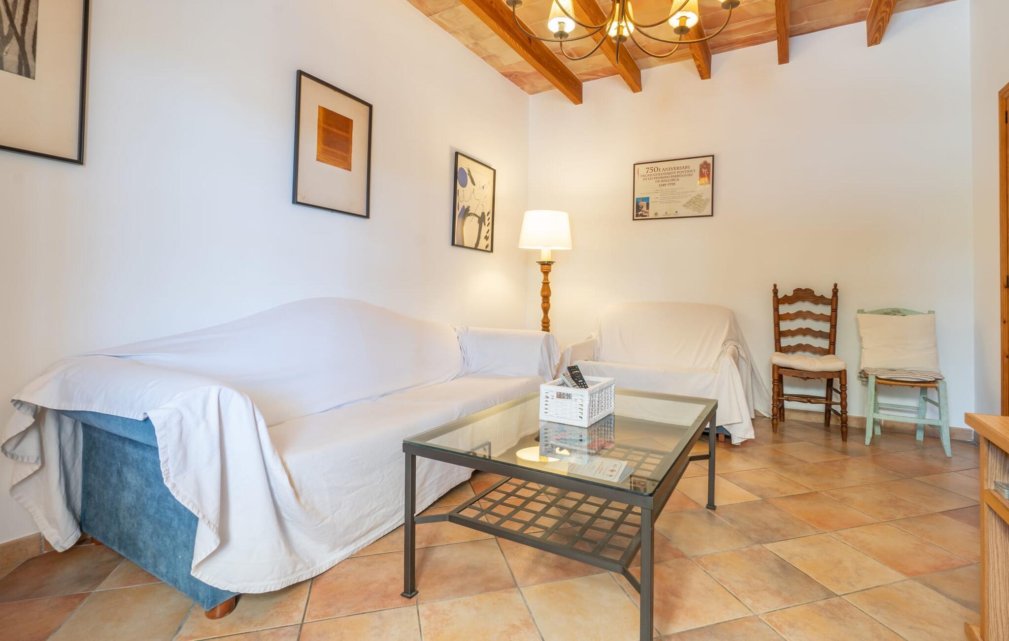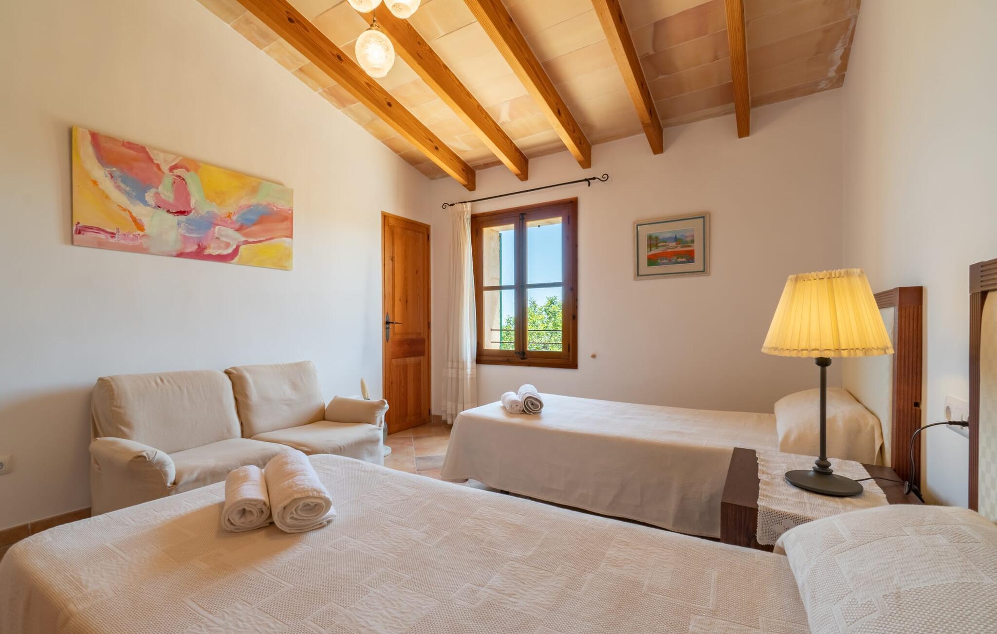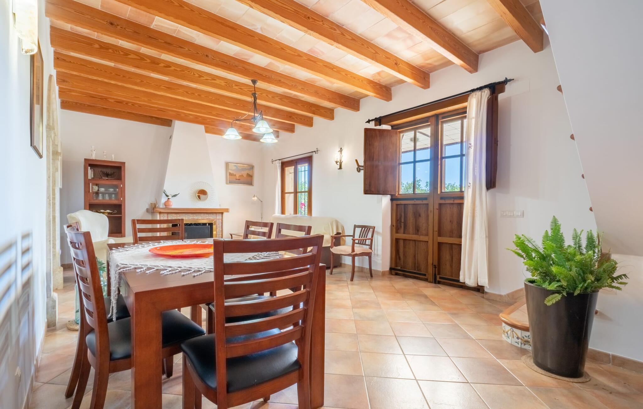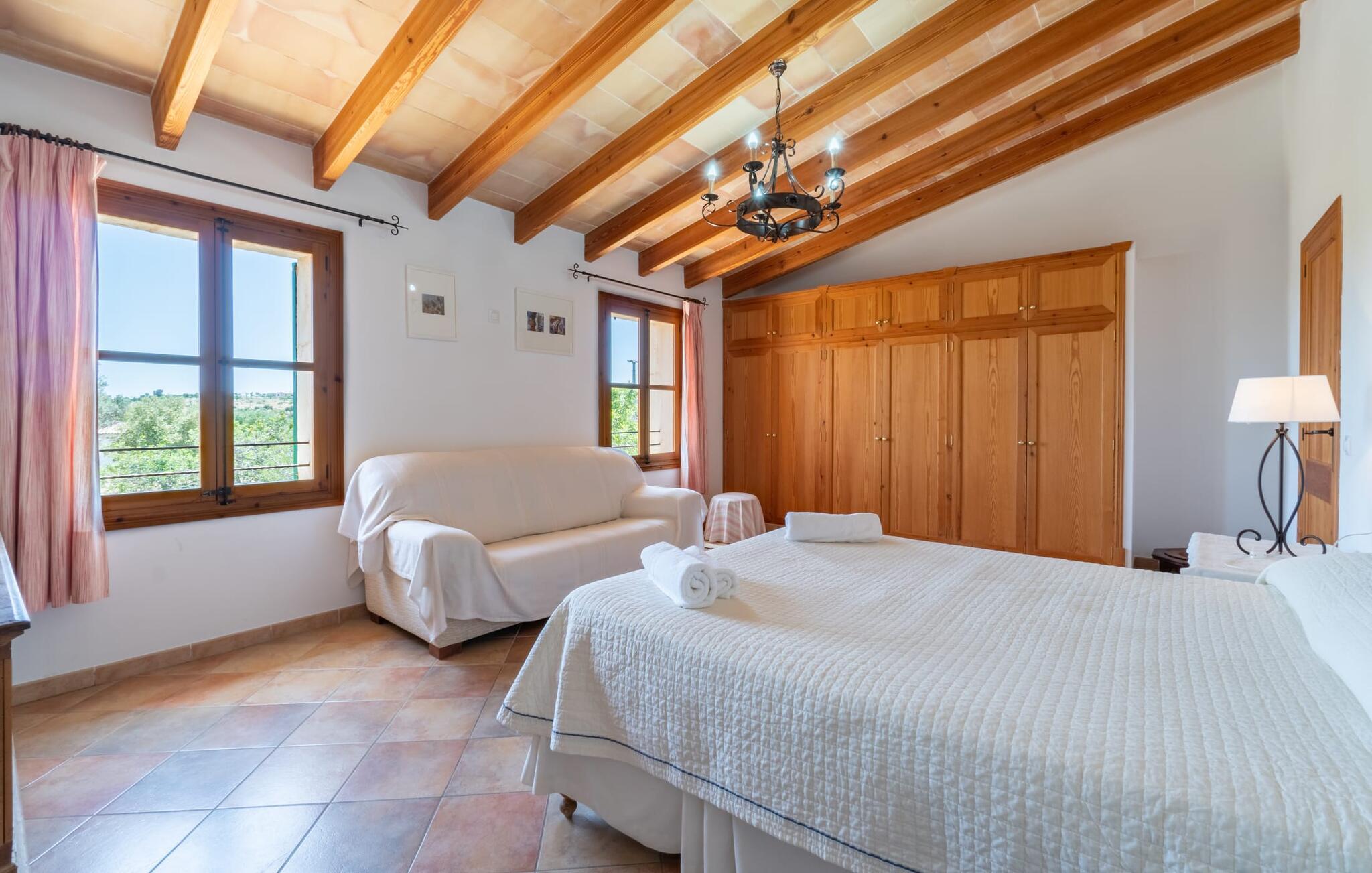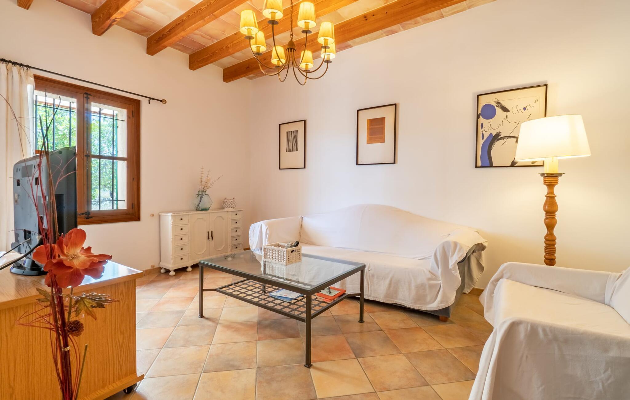 Ren natur og et klassisk landsted at have det godt i, vi er glade for at præsentere fincaen "Can Tabou" for jer. Omgivet af Mallorcas grønne frodighed året rundt, vil I opleve et to-etagers feriehus, der er ideelt for familier og venner. Hvor end I kigger hen, ser I mandel-, citron- og johannesbrødtræer på den mægtige baggrund af Tramuntana-bjergene. Denne finca glæder ikke kun natur- og sportsentusiaster, der nyder at vandre og spille golf. I kan også nyde det unikke privatliv i den forfriskende pool - til afkøling ind imellem eller til en nattesvømning. Mellem duftende oleander og palmer kan I spille et spil bordtennis eller nyde middelhavssolen på de medfølgende liggestole. Hvis I ønsker det, kan I også hvile i skyggen af træerne eller under paraplyerne omkring poolen. Der er yderligere udendørs siddepladser omkring huset, hvoraf nogle er overdækket. I kan afslutte dagen afslappet med en hyggelig grillaften, inden I vender tilbage til det velholdte sommerhus. Der vil I opleve det afslappede, landlige Mallorca, som vi kender og elsker det. De generelle værelser venter på jer i stueetagen. Dette inkluderer også det lyse, fabelagtigt fuldt udstyrede køkken - ideelt til bevidst valgt selvforplejning i dette charmerende feriehus i rustik stil. Køkkenet er forbundet med stue og spisestue med pejs via en rund, stenbeklædt buegang. En separat tv-stue fuldender hyggen. Der er et badeværelse på hver etage (brusebadeværelse i stueetagen og hyggeligt badekar mellem de tre airconditionerede soveværelser på øverste etage). Værelserne er generelt meget rummelige og har dobbeltsenge eller enkeltsenge. For alle, der af og til flytter deres hjemmekontor til deres feriehus, mens de er på ferie, er der et særligt højdepunkt i form af et studie med en fænomenal udsigt over Tramuntana-bjergene. "Can Tabou" formidler en behagelig følelse af fred og frihed. Simpelthen uimodståelig, eller hvad synes du? Stuehuset "Can Tabou" afspejler perfekt fordelene ved et traditionelt mallorcansk feriehus. Det statelige stenbrudshus er omgivet af masser af natur og fred - lige hvad I ønsker. For shopping, besøg den nærliggende bjerglandsby Campanet, et romantisk, men arkitektonisk tiltalende sted på den nordlige del af øen. For en dag på stranden kan I tage til de varierede bugter i Pollença eller Alcúdia, cirka 30 minutter væk i bil.