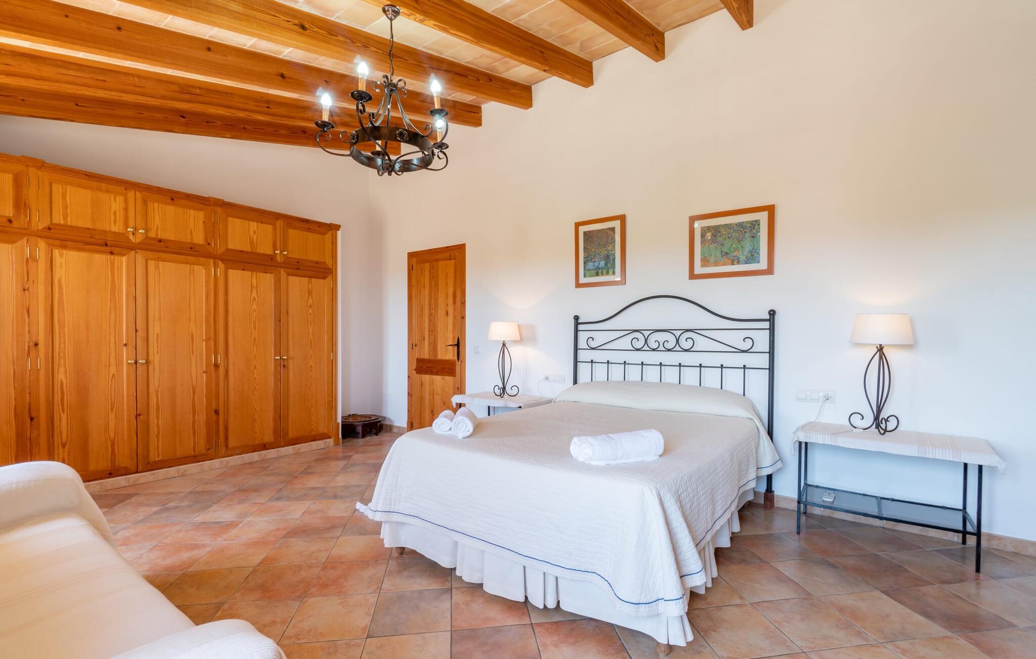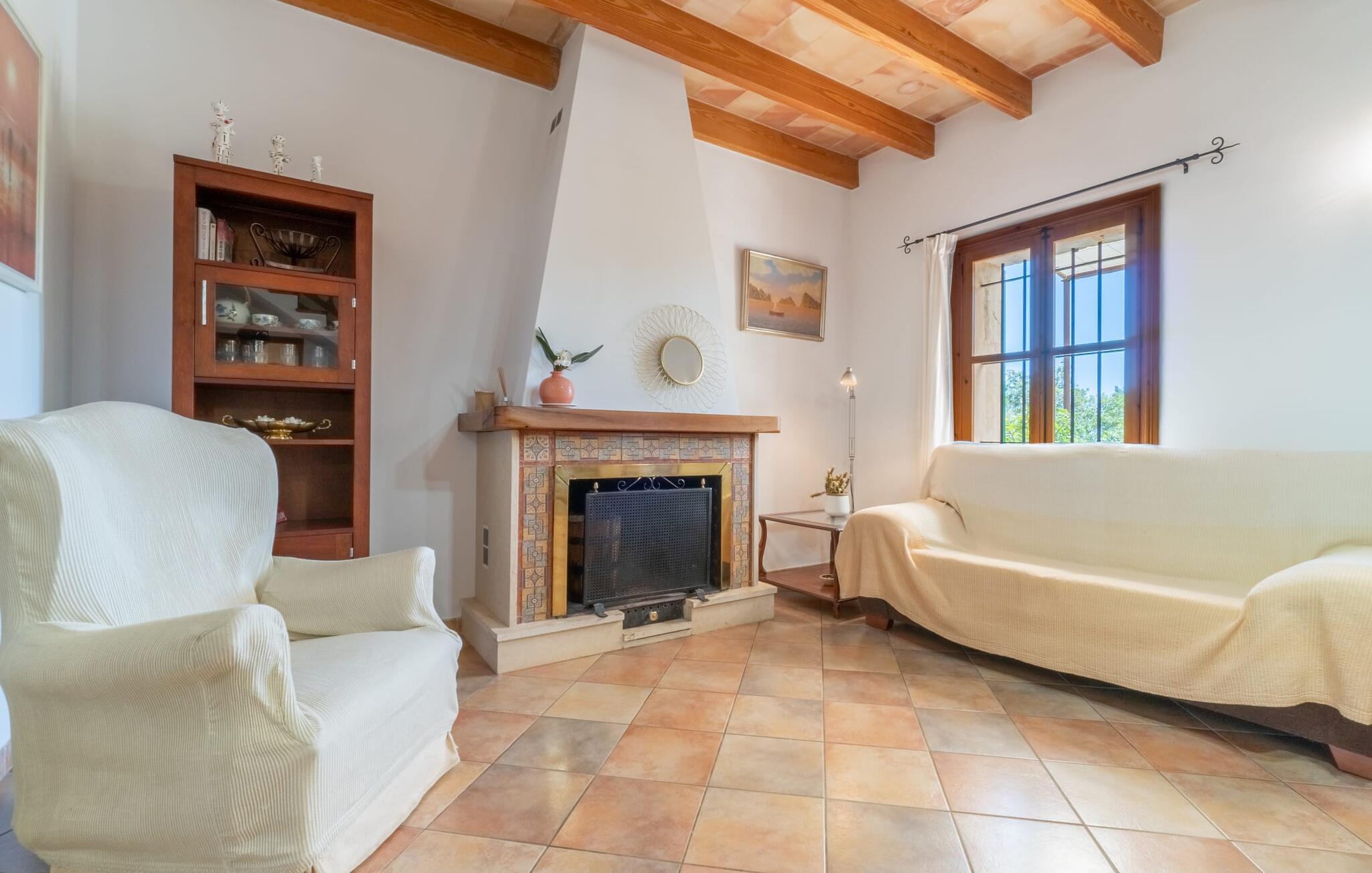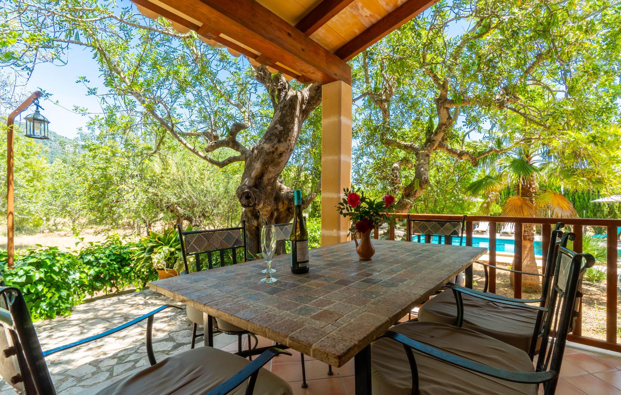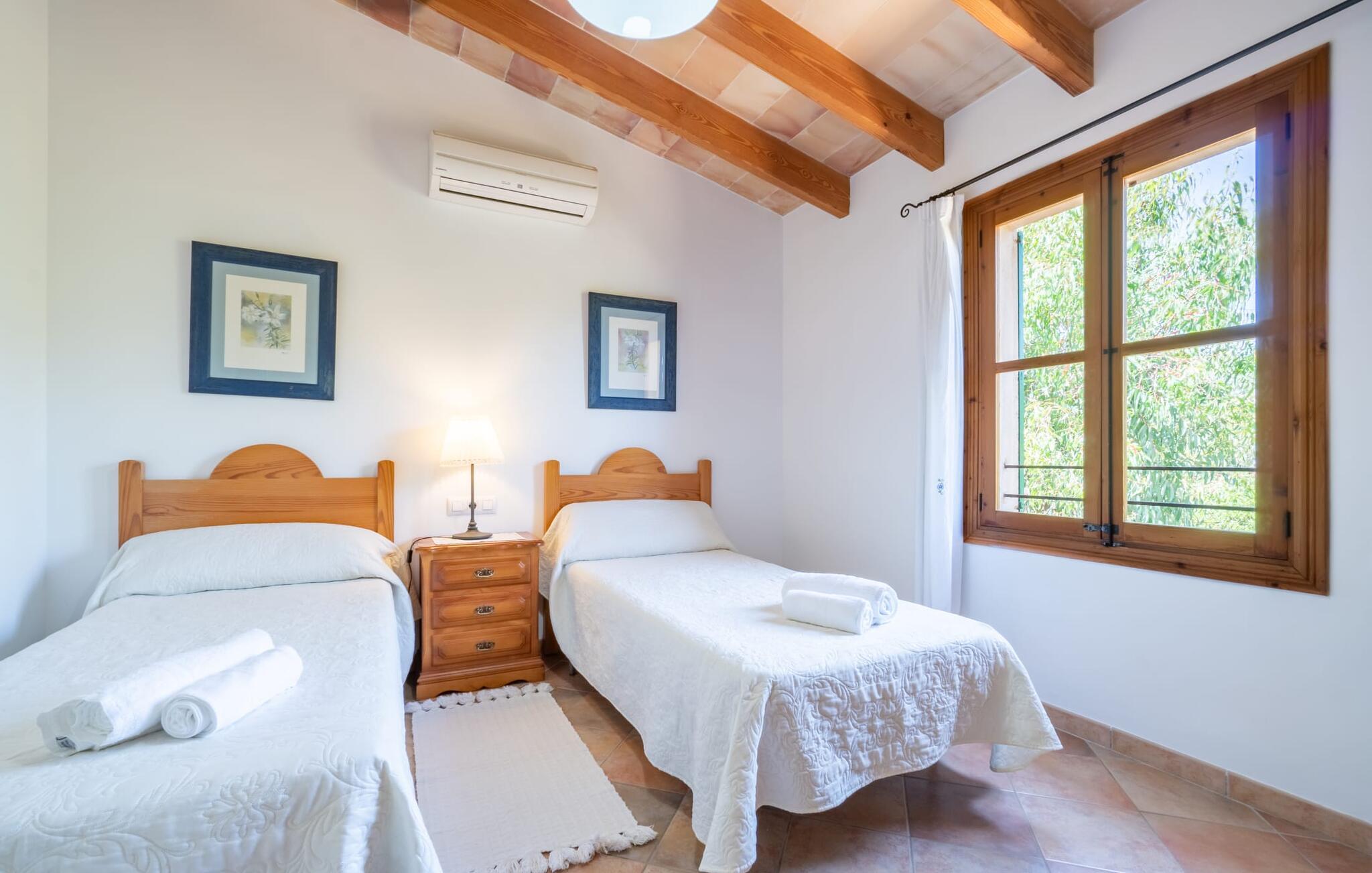 Ren natur og et klassisk landsted at have det godt i, vi er glade for at præsentere fincaen "Can Tabou" for jer. Omgivet af Mallorcas grønne frodighed året rundt, vil I opleve et to-etagers feriehus, der er ideelt for familier og venner. Hvor end I kigger hen, ser I mandel-, citron- og johannesbrødtræer på den mægtige baggrund af Tramuntana-bjergene. Denne finca glæder ikke kun natur- og sportsentusiaster, der nyder at vandre og spille golf. I kan også nyde det unikke privatliv i den forfriskende pool - til afkøling ind imellem eller til en nattesvømning. Mellem duftende oleander og palmer kan I spille et spil bordtennis eller nyde middelhavssolen på de medfølgende liggestole. Hvis I ønsker det, kan I også hvile i skyggen af træerne eller under paraplyerne omkring poolen. Der er yderligere udendørs siddepladser omkring huset, hvoraf nogle er overdækket. I kan afslutte dagen afslappet med en hyggelig grillaften, inden I vender tilbage til det velholdte sommerhus. Der vil I opleve det afslappede, landlige Mallorca, som vi kender og elsker det. De generelle værelser venter på jer i stueetagen. Dette inkluderer også det lyse, fabelagtigt fuldt udstyrede køkken - ideelt til bevidst valgt selvforplejning i dette charmerende feriehus i rustik stil. Køkkenet er forbundet med stue og spisestue med pejs via en rund, stenbeklædt buegang. En separat tv-stue fuldender hyggen. Der er et badeværelse på hver etage (brusebadeværelse i stueetagen og hyggeligt badekar mellem de tre airconditionerede soveværelser på øverste etage). Værelserne er generelt meget rummelige og har dobbeltsenge eller enkeltsenge. For alle, der af og til flytter deres hjemmekontor til deres feriehus, mens de er på ferie, er der et særligt højdepunkt i form af et studie med en fænomenal udsigt over Tramuntana-bjergene. "Can Tabou" formidler en behagelig følelse af fred og frihed. Simpelthen uimodståelig, eller hvad synes du? Stuehuset "Can Tabou" afspejler perfekt fordelene ved et traditionelt mallorcansk feriehus. Det statelige stenbrudshus er omgivet af masser af natur og fred - lige hvad I ønsker. For shopping, besøg den nærliggende bjerglandsby Campanet, et romantisk, men arkitektonisk tiltalende sted på den nordlige del af øen. For en dag på stranden kan I tage til de varierede bugter i Pollença eller Alcúdia, cirka 30 minutter væk i bil.