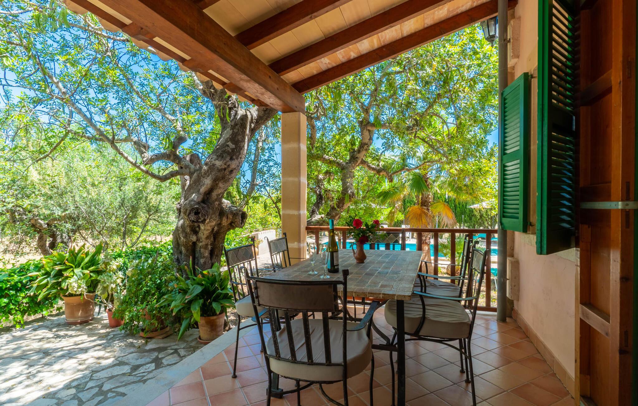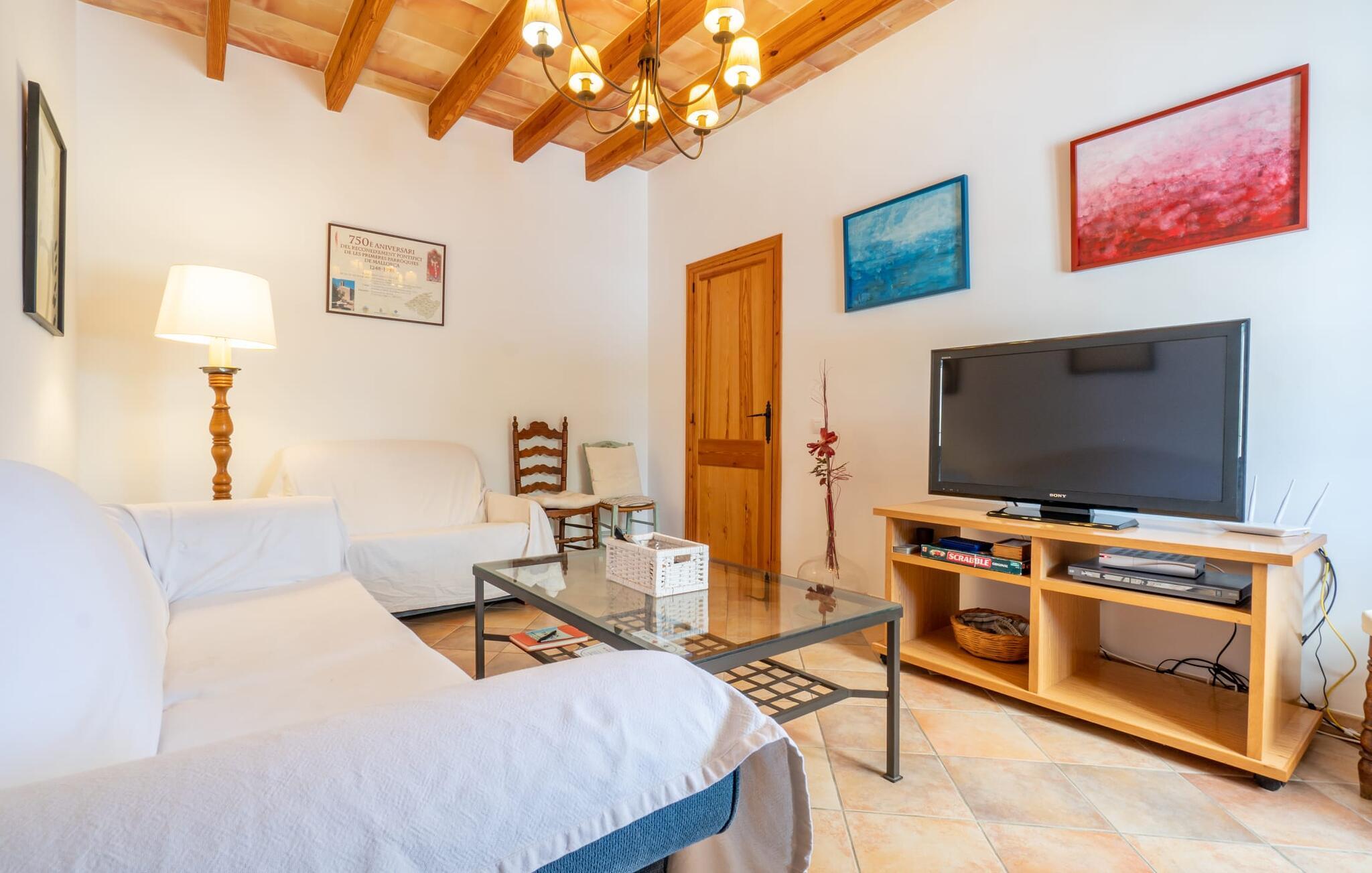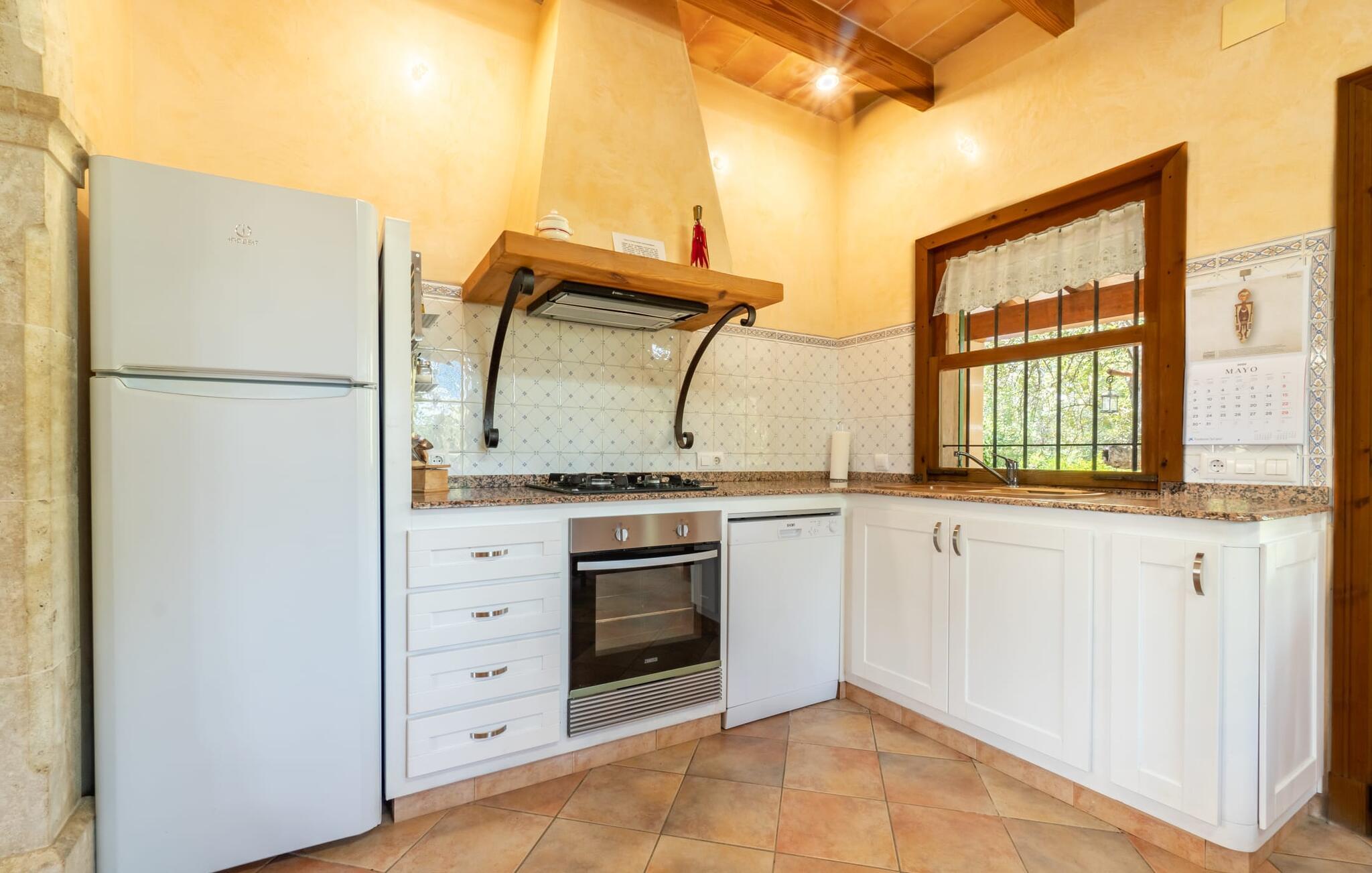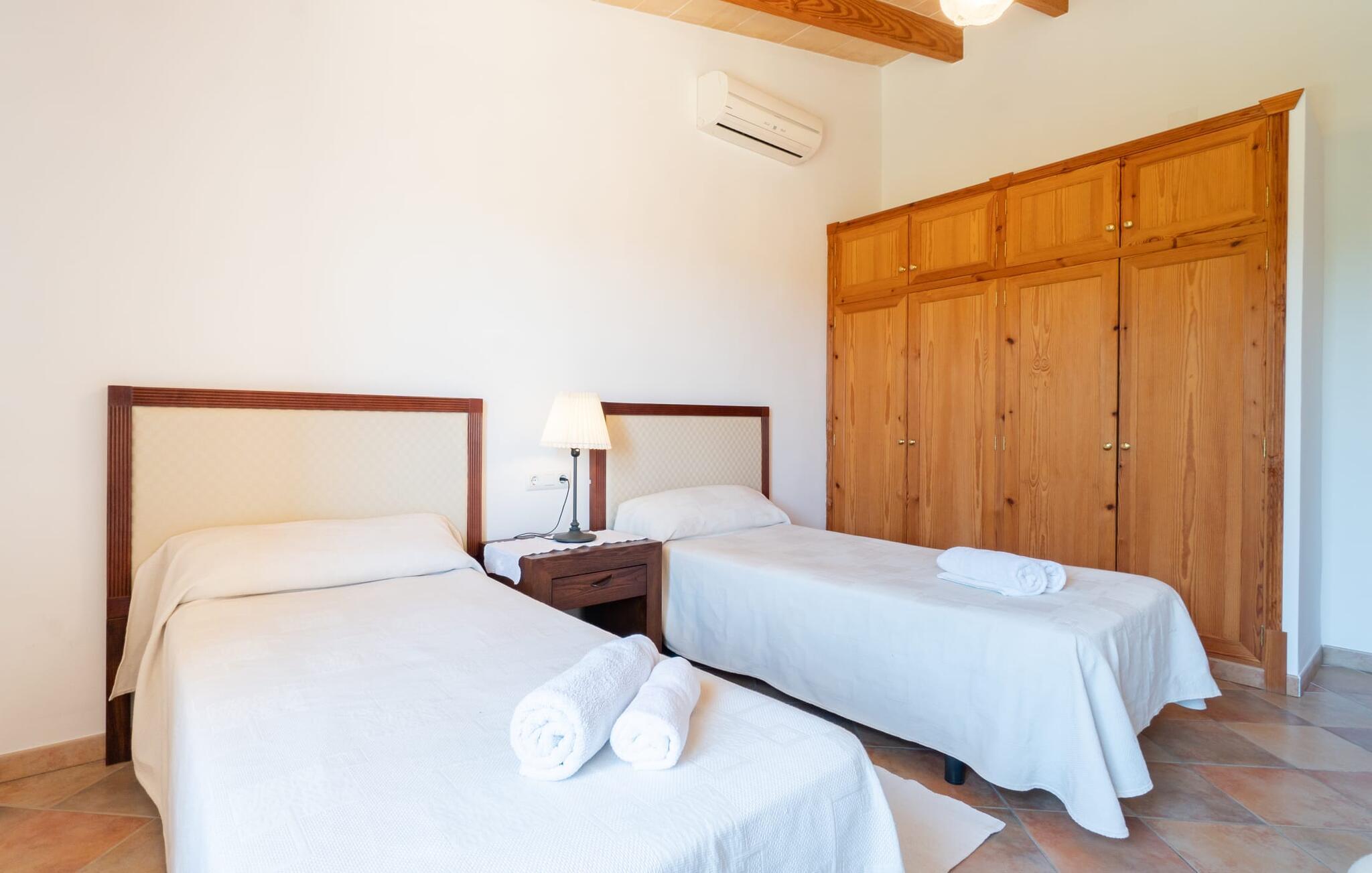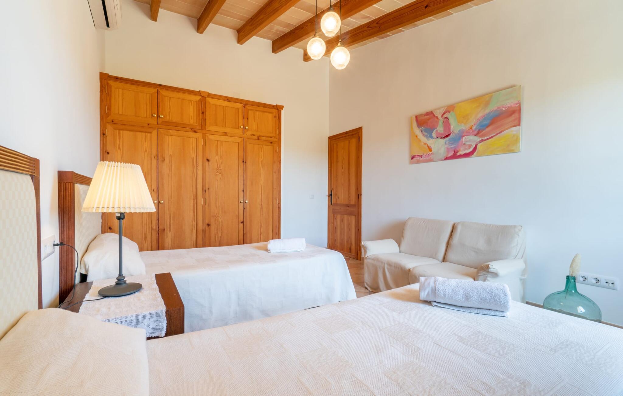 Ren natur og et klassisk landsted at have det godt i, vi er glade for at præsentere fincaen "Can Tabou" for jer. Omgivet af Mallorcas grønne frodighed året rundt, vil I opleve et to-etagers feriehus, der er ideelt for familier og venner. Hvor end I kigger hen, ser I mandel-, citron- og johannesbrødtræer på den mægtige baggrund af Tramuntana-bjergene. Denne finca glæder ikke kun natur- og sportsentusiaster, der nyder at vandre og spille golf. I kan også nyde det unikke privatliv i den forfriskende pool - til afkøling ind imellem eller til en nattesvømning. Mellem duftende oleander og palmer kan I spille et spil bordtennis eller nyde middelhavssolen på de medfølgende liggestole. Hvis I ønsker det, kan I også hvile i skyggen af træerne eller under paraplyerne omkring poolen. Der er yderligere udendørs siddepladser omkring huset, hvoraf nogle er overdækket. I kan afslutte dagen afslappet med en hyggelig grillaften, inden I vender tilbage til det velholdte sommerhus. Der vil I opleve det afslappede, landlige Mallorca, som vi kender og elsker det. De generelle værelser venter på jer i stueetagen. Dette inkluderer også det lyse, fabelagtigt fuldt udstyrede køkken - ideelt til bevidst valgt selvforplejning i dette charmerende feriehus i rustik stil. Køkkenet er forbundet med stue og spisestue med pejs via en rund, stenbeklædt buegang. En separat tv-stue fuldender hyggen. Der er et badeværelse på hver etage (brusebadeværelse i stueetagen og hyggeligt badekar mellem de tre airconditionerede soveværelser på øverste etage). Værelserne er generelt meget rummelige og har dobbeltsenge eller enkeltsenge. For alle, der af og til flytter deres hjemmekontor til deres feriehus, mens de er på ferie, er der et særligt højdepunkt i form af et studie med en fænomenal udsigt over Tramuntana-bjergene. "Can Tabou" formidler en behagelig følelse af fred og frihed. Simpelthen uimodståelig, eller hvad synes du? Stuehuset "Can Tabou" afspejler perfekt fordelene ved et traditionelt mallorcansk feriehus. Det statelige stenbrudshus er omgivet af masser af natur og fred - lige hvad I ønsker. For shopping, besøg den nærliggende bjerglandsby Campanet, et romantisk, men arkitektonisk tiltalende sted på den nordlige del af øen. For en dag på stranden kan I tage til de varierede bugter i Pollença eller Alcúdia, cirka 30 minutter væk i bil.