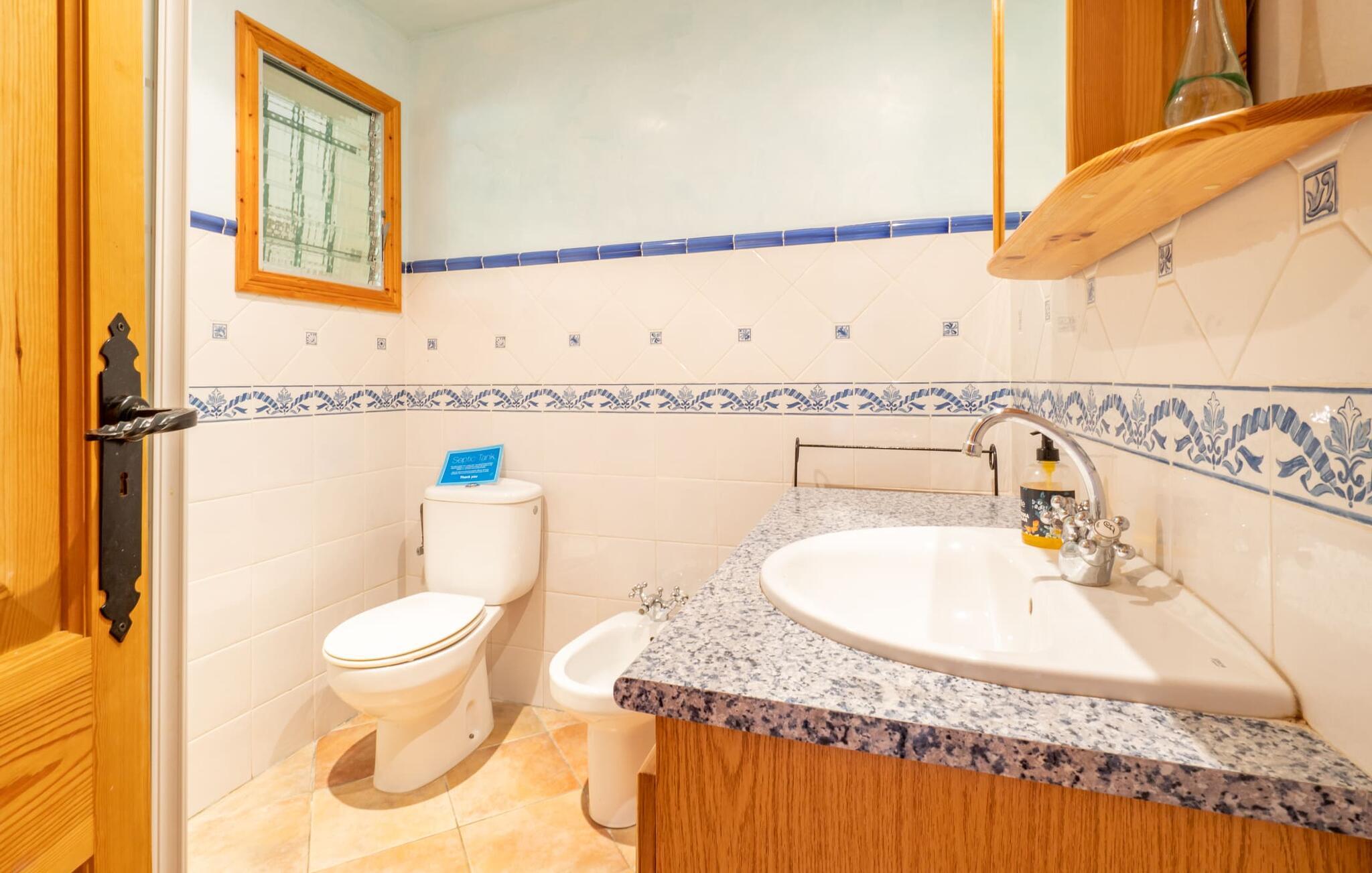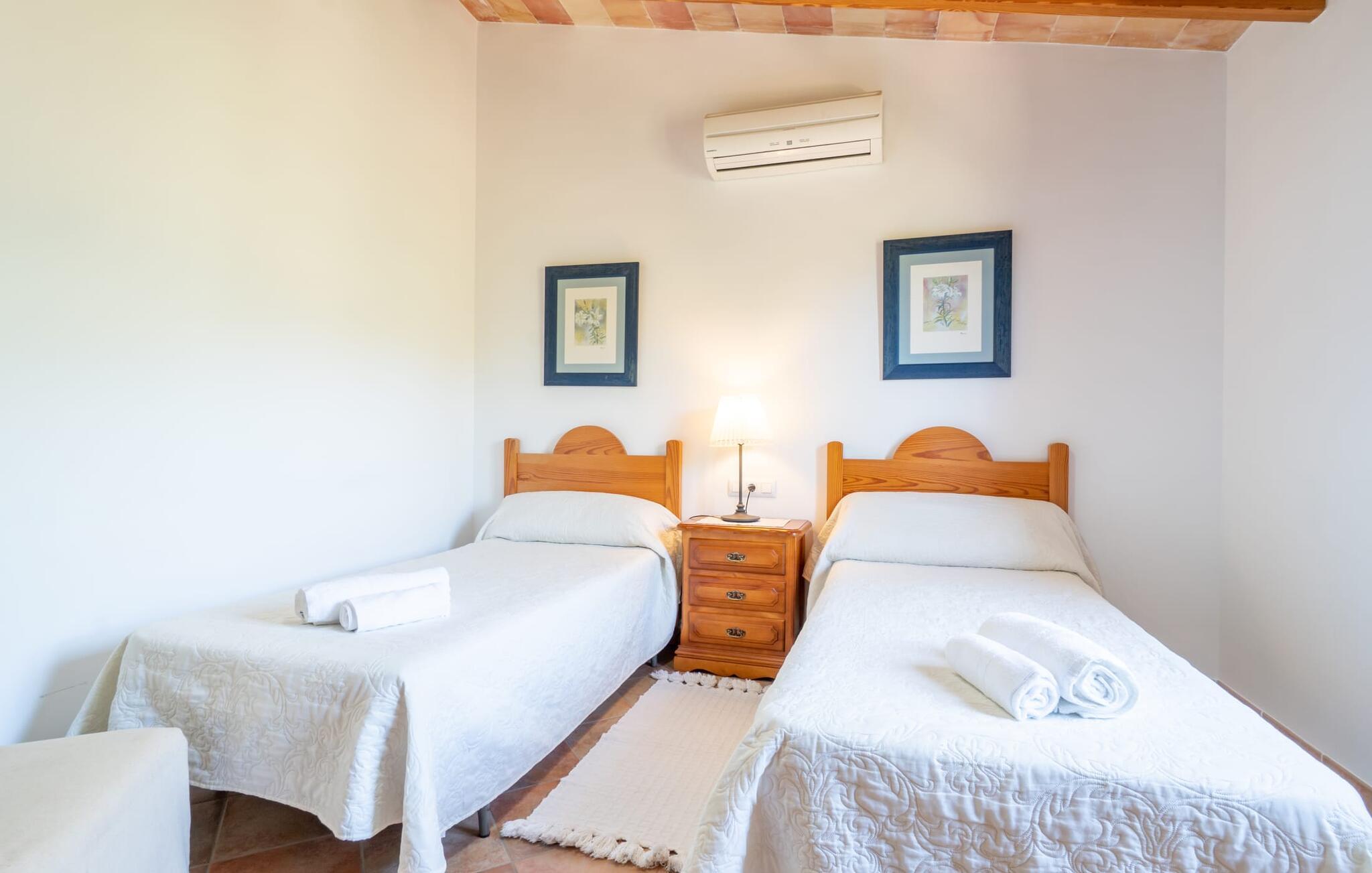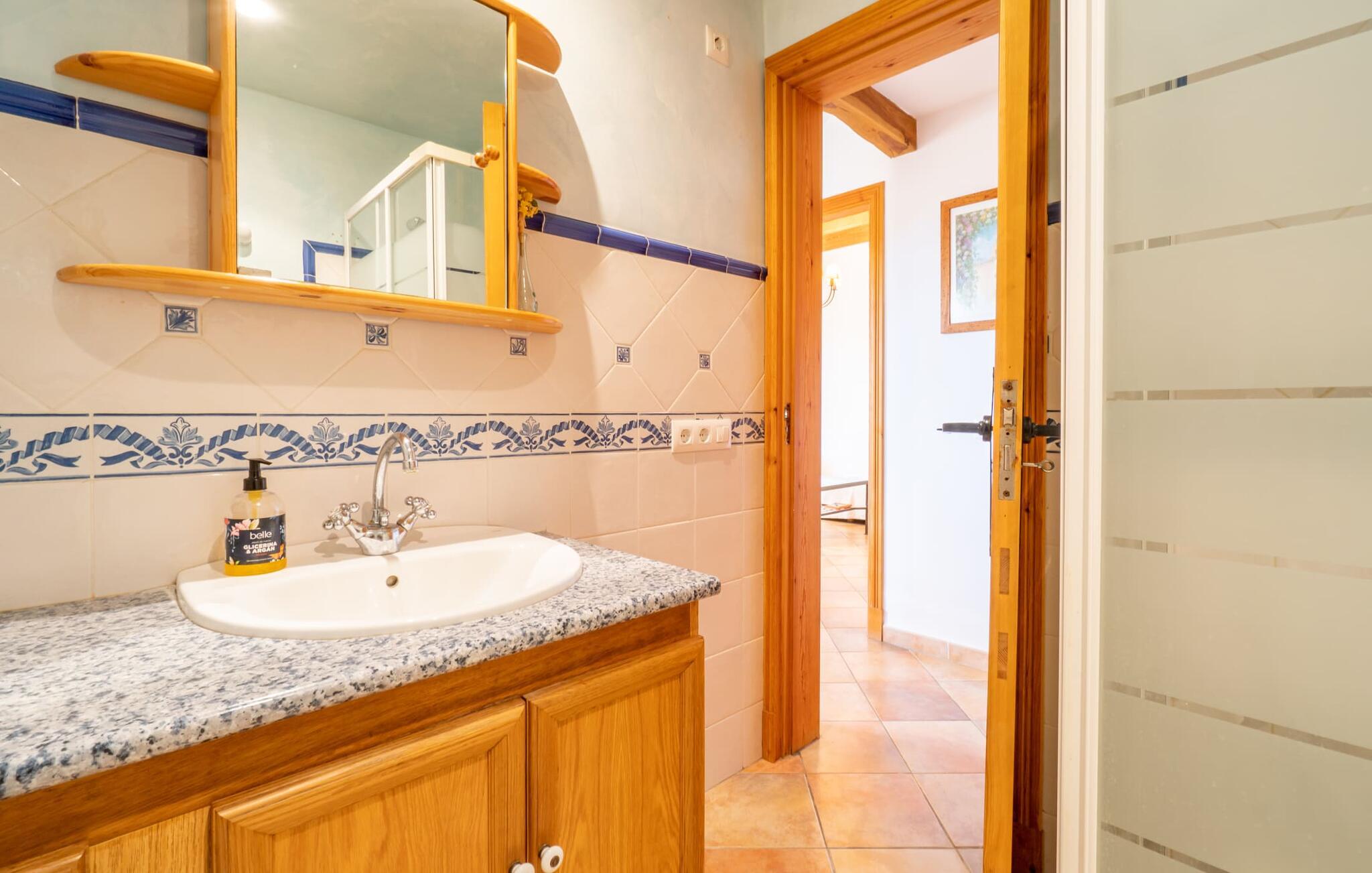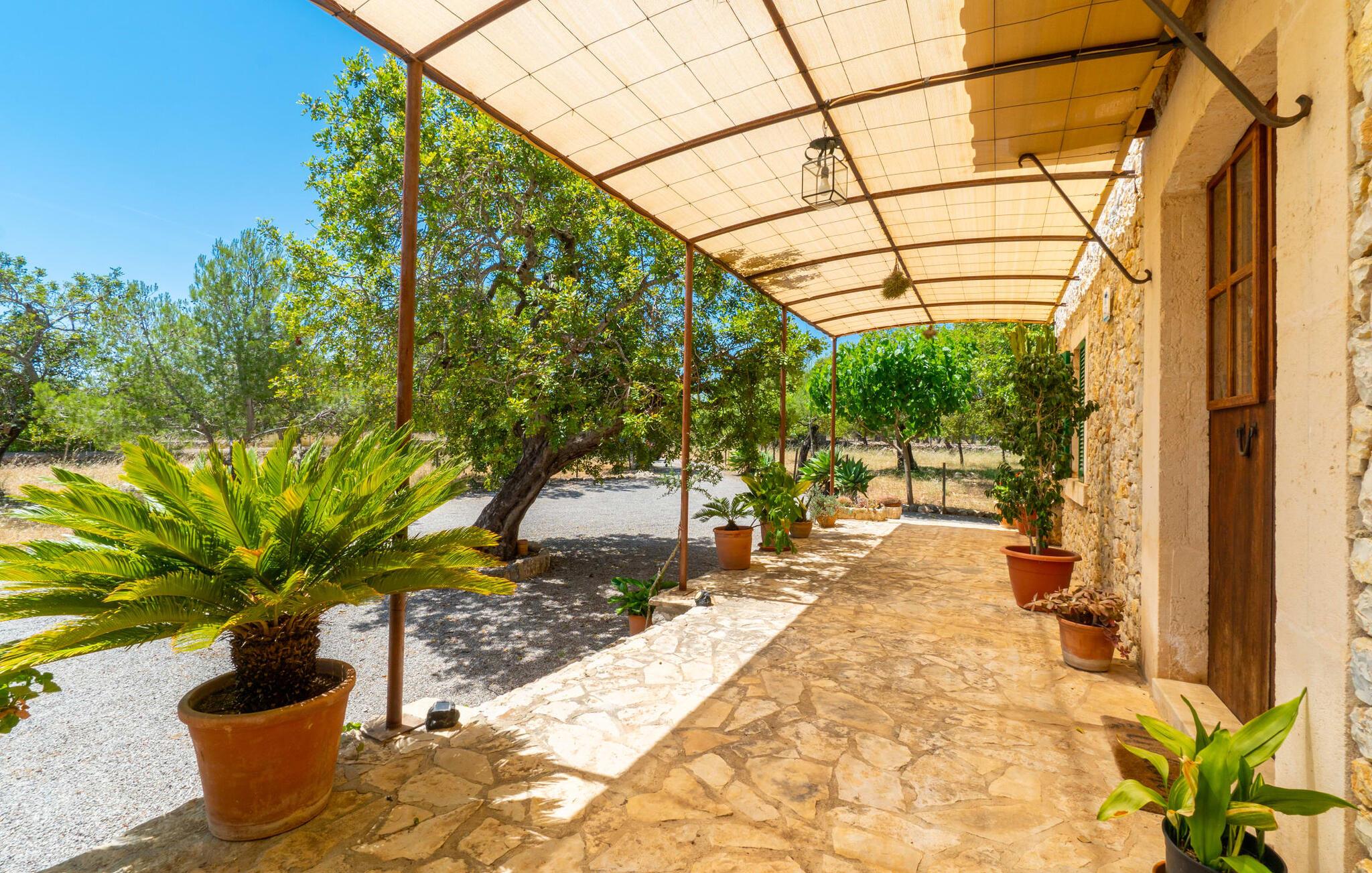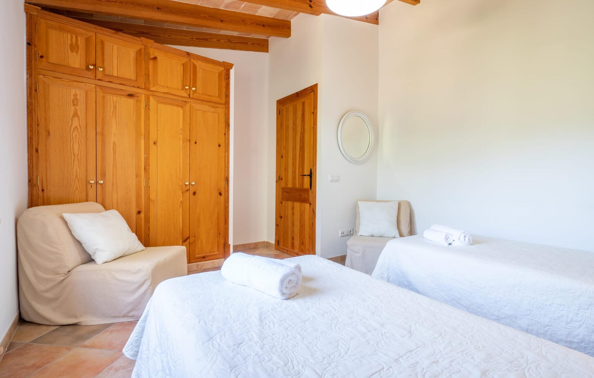 Ren natur og et klassisk landsted at have det godt i, vi er glade for at præsentere fincaen "Can Tabou" for jer. Omgivet af Mallorcas grønne frodighed året rundt, vil I opleve et to-etagers feriehus, der er ideelt for familier og venner. Hvor end I kigger hen, ser I mandel-, citron- og johannesbrødtræer på den mægtige baggrund af Tramuntana-bjergene. Denne finca glæder ikke kun natur- og sportsentusiaster, der nyder at vandre og spille golf. I kan også nyde det unikke privatliv i den forfriskende pool - til afkøling ind imellem eller til en nattesvømning. Mellem duftende oleander og palmer kan I spille et spil bordtennis eller nyde middelhavssolen på de medfølgende liggestole. Hvis I ønsker det, kan I også hvile i skyggen af træerne eller under paraplyerne omkring poolen. Der er yderligere udendørs siddepladser omkring huset, hvoraf nogle er overdækket. I kan afslutte dagen afslappet med en hyggelig grillaften, inden I vender tilbage til det velholdte sommerhus. Der vil I opleve det afslappede, landlige Mallorca, som vi kender og elsker det. De generelle værelser venter på jer i stueetagen. Dette inkluderer også det lyse, fabelagtigt fuldt udstyrede køkken - ideelt til bevidst valgt selvforplejning i dette charmerende feriehus i rustik stil. Køkkenet er forbundet med stue og spisestue med pejs via en rund, stenbeklædt buegang. En separat tv-stue fuldender hyggen. Der er et badeværelse på hver etage (brusebadeværelse i stueetagen og hyggeligt badekar mellem de tre airconditionerede soveværelser på øverste etage). Værelserne er generelt meget rummelige og har dobbeltsenge eller enkeltsenge. For alle, der af og til flytter deres hjemmekontor til deres feriehus, mens de er på ferie, er der et særligt højdepunkt i form af et studie med en fænomenal udsigt over Tramuntana-bjergene. "Can Tabou" formidler en behagelig følelse af fred og frihed. Simpelthen uimodståelig, eller hvad synes du? Stuehuset "Can Tabou" afspejler perfekt fordelene ved et traditionelt mallorcansk feriehus. Det statelige stenbrudshus er omgivet af masser af natur og fred - lige hvad I ønsker. For shopping, besøg den nærliggende bjerglandsby Campanet, et romantisk, men arkitektonisk tiltalende sted på den nordlige del af øen. For en dag på stranden kan I tage til de varierede bugter i Pollença eller Alcúdia, cirka 30 minutter væk i bil.