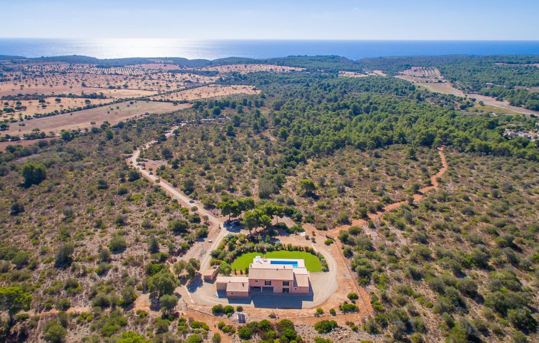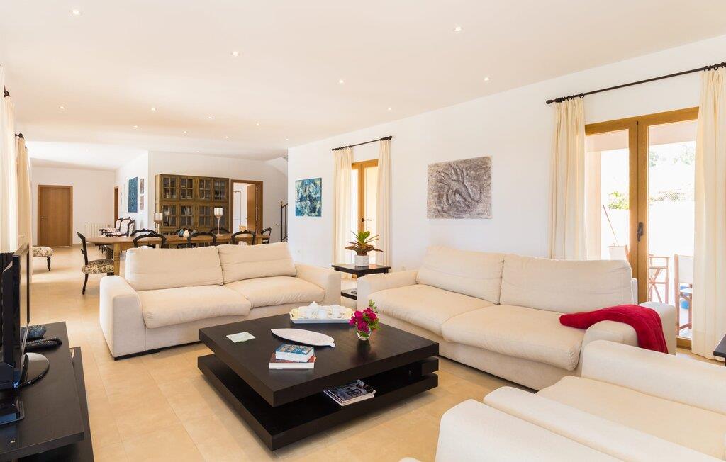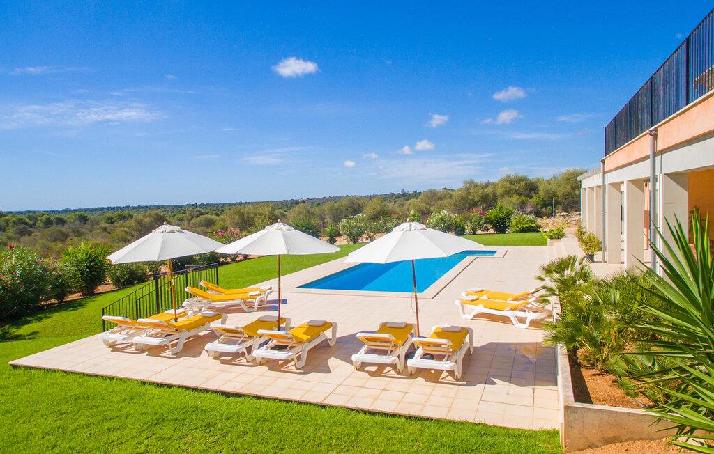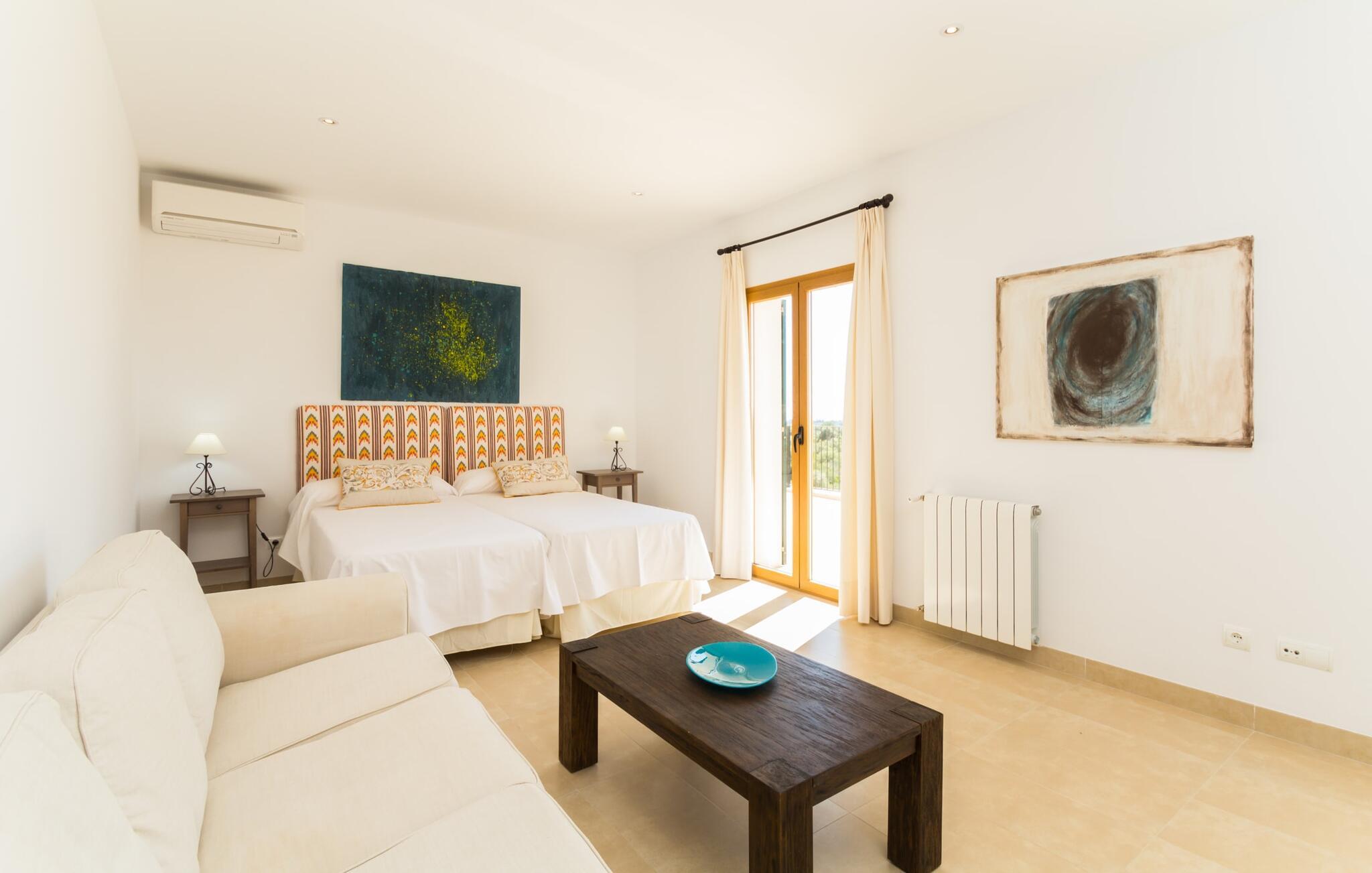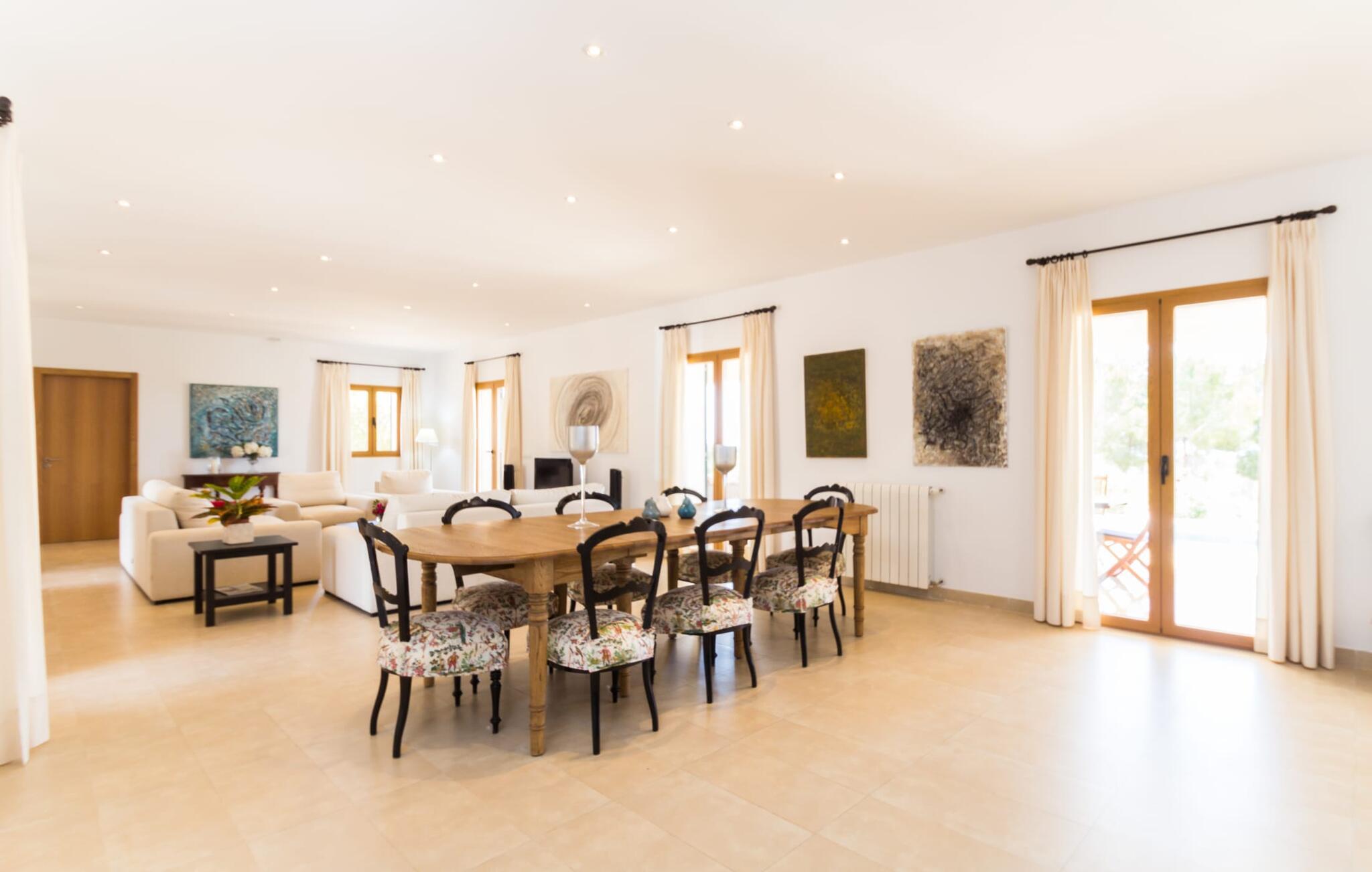 Feriegæster bør være opmærksomme på denne ejendom, hvis de værdsætter et moderne, velholdt feriehus og elsker uhindret havudsigt. Villa "Can Tem" dækker utrolige 355.500 kvadratmeter og skiller sig ud fra landskabet som en lille, storslået ejendom. Grunden i nærheden af huset har græsplæner og terrasseområder og er foret med ung middelhavsvegetation, hvilket giver uhindret udsigt over det omkringliggende landskab og udsigt ud over havet i lang tid. I midten af haven ligger den elegante pool, som har en meget komfortabel trinadgang og en rummelig solterrasse ved siden af. I kan slappe af i solen på de komfortable liggestole og nyde den fantastiske natur i denne ferievilla. Hvis solen er for stærk, er der tre parasoller til beskyttelse. I kan også drage fordel af den luftige skygge på den store veranda, som ligger tre trin over poolen: Med sin gulmalede facade ser den særdeles munter og indbydende ud. Her kan I nyde en hyggelig middag ved det store spisebord, mens I nyder den vidunderlige udsigt eller slappe af med stil i den ultramoderne lounge. Et godt lokale til en elegant start og afslutning på dagen: om aftenen kan I for eksempel arrangere en kulinarisk grill. Udvidelsen af verandaen byder på yderligere delvist skyggefulde steder, hvor I kan samles i små grupper eller bo alene, hvis I ønsker det. I kan også sidde under oliventræerne i nærheden af de to udhuse og måske læse en god bog. Der er mange måder at finde jeres helt eget yndlingssted på. Inde i huset finder I en rummelig stue indrettet med lyse farver og usædvanlige, unikke elementer. På væggene finder I alle mulige bemærkelsesværdige kunsttryk og opdager mange andre detaljer. Den kombinerede stue/spisestue byder på et kæmpe sofahjørne, hvor I kan sidde komfortabelt på de komfortable siddepladser på ethvert tidspunkt af dagen. Fladskærms-tv'et er også bekvemt placeret her. Midt i lokalet er der et stort spisebord med stole i original stil, der kan rumme otte personer. Det rummelige køkken fremstår stilrent og er udstyret med stort køleskab, ovn, keramisk kogeplade, mikroovn, opvaskemaskine, elkedel, Nespresso kaffemaskine og meget mere. Der er også plads nok til et ekstra spisebord, der kan bruges af seks personer. Soveværelset med aircondition inviterer jer til at slappe af. Uden unødvendige dikkedarer overrasker disse værelser med deres lysstyrke og mange nuancer af hvid, kombineret med kontrasterende kunstneriske accenter. For en behagelig hvile har gæsterne i alt en seng, der måler 1,80 x 2,00 m og ti senge, der måler 0,90 x 2,00 m til deres rådighed. I stueetagen er der et soveværelse med en-suite badeværelse og et gæstetoilet, mens der på første sal er fem soveværelser, hvoraf det ene har en-suite badeværelse, og yderligere to separate badeværelser. Soveværelsets smagfulde design kommer også til sin ret på badeværelserne. Disse er kendetegnet ved deres meget komfortable, rummelige og ultramoderne stil. Hvis det kræves, er to babysenge og høje stole til rådighed. Porto Cristo byder på en smuk strand med lavvandet adgang til havet og en smuk promenade. Der finder I også adskillige store supermarkeder, hvoraf nogle også har åbent på søn- og helligdage. Her kan I få alt, hvad I skal bruge til jeres daglige behov. De mange strande omkring havnebyen kan også varmt anbefales. Den ultramoderne og venlige villa "Can Tem" ligger kun få kilometer fra havet på østsiden af øen, ikke langt fra Porto Cristo. Den bekvemme beliggenhed gør den daglige indkøb nemmere. Der er et ugentligt marked i Manacor hver mandag. De smukke strande på østkysten kan nås hurtigt i bil.