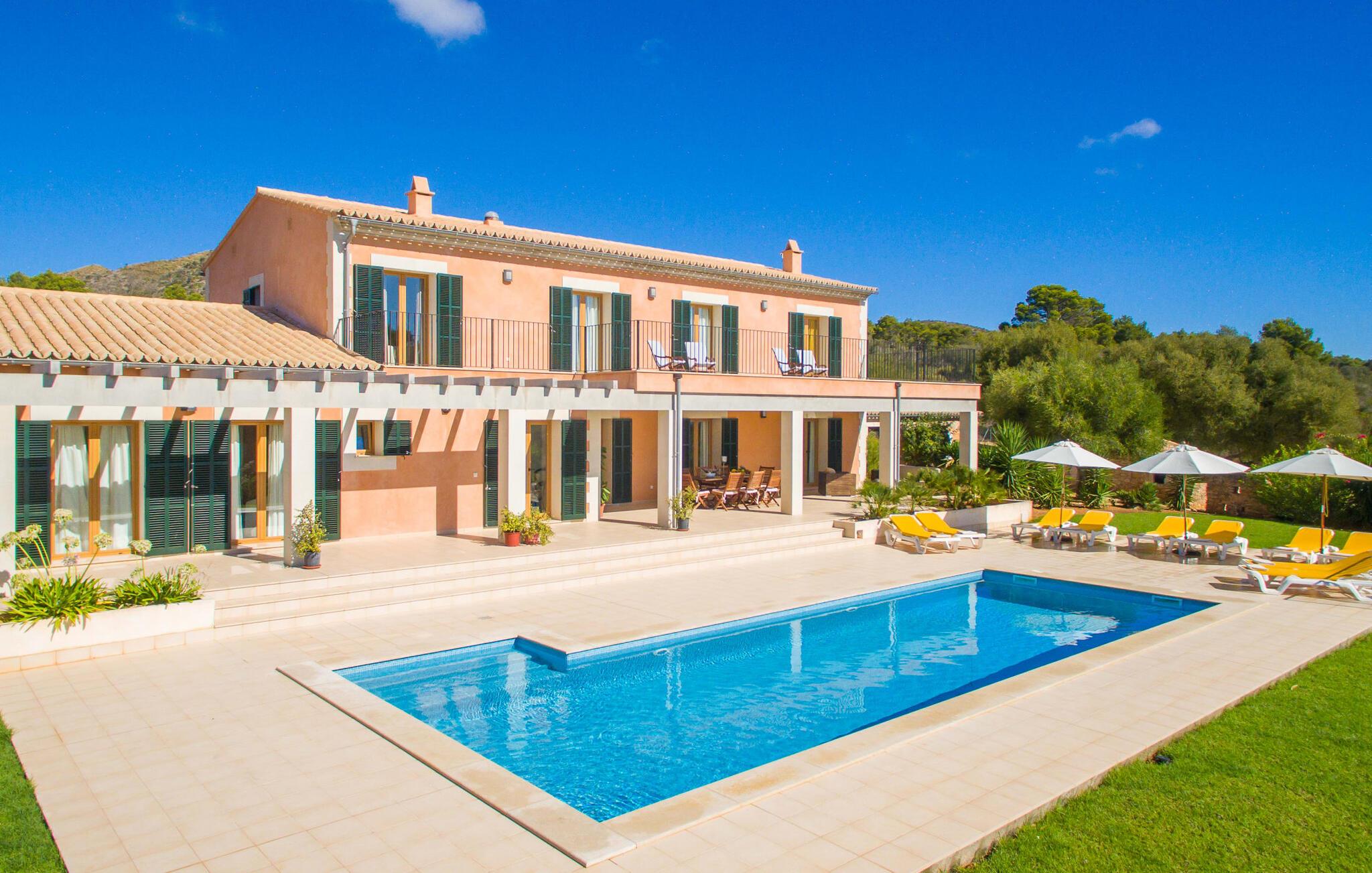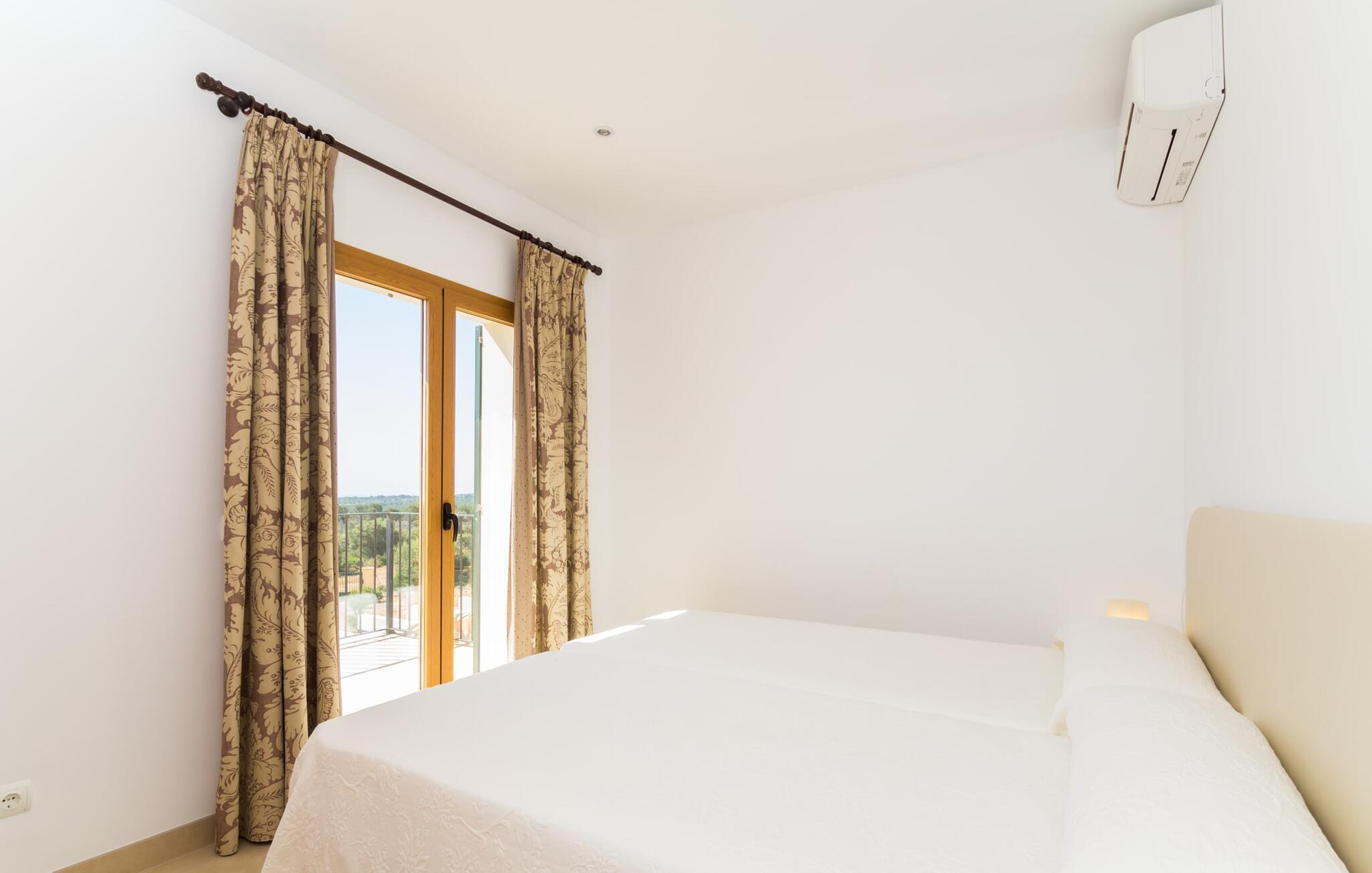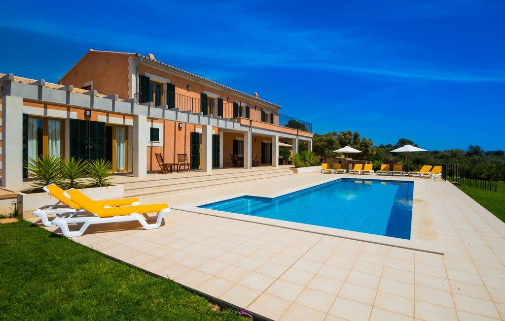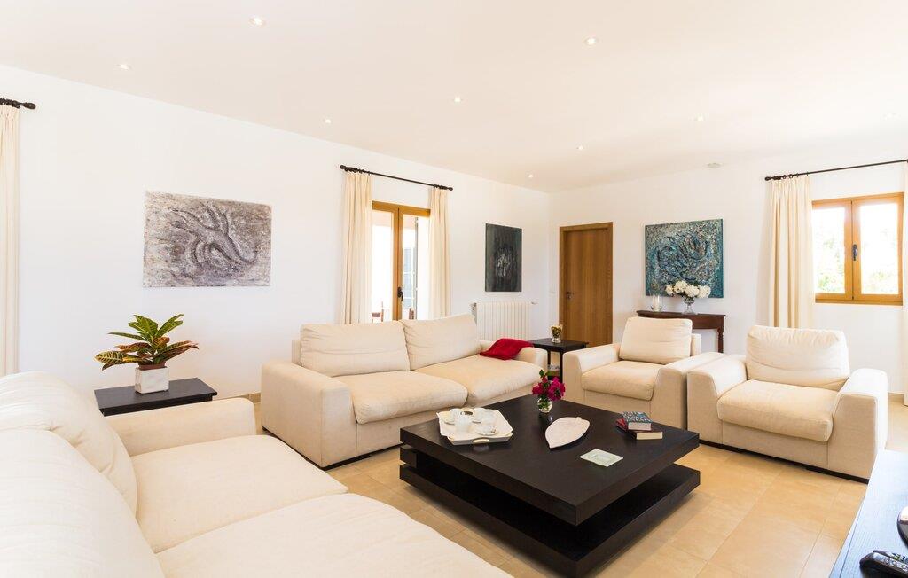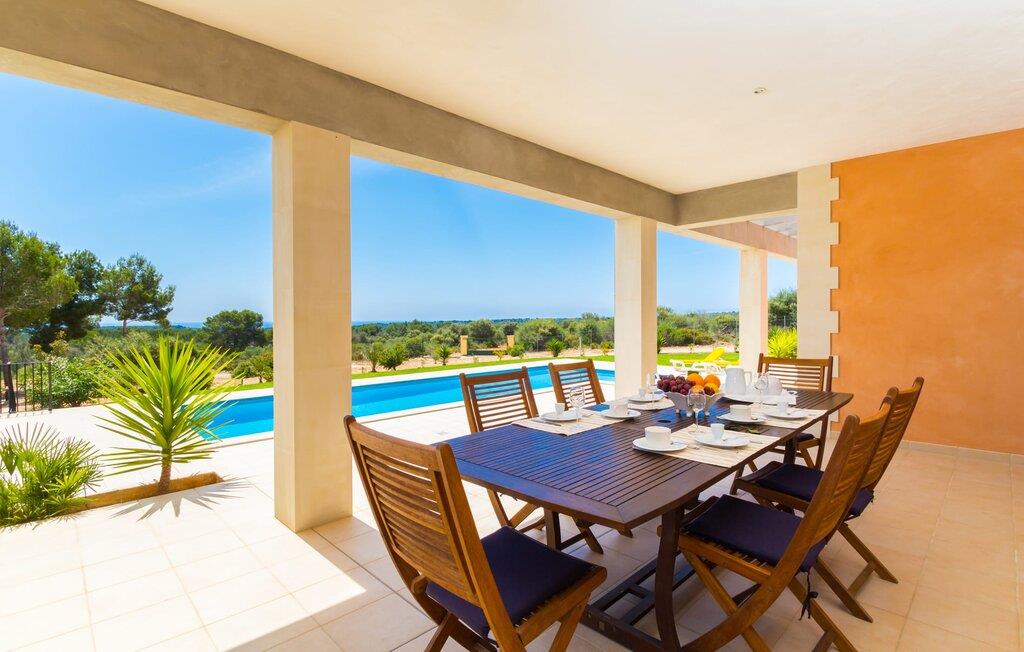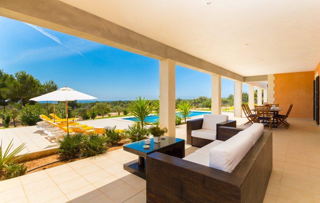 Feriegæster bør være opmærksomme på denne ejendom, hvis de værdsætter et moderne, velholdt feriehus og elsker uhindret havudsigt. Villa "Can Tem" dækker utrolige 355.500 kvadratmeter og skiller sig ud fra landskabet som en lille, storslået ejendom. Grunden i nærheden af huset har græsplæner og terrasseområder og er foret med ung middelhavsvegetation, hvilket giver uhindret udsigt over det omkringliggende landskab og udsigt ud over havet i lang tid. I midten af haven ligger den elegante pool, som har en meget komfortabel trinadgang og en rummelig solterrasse ved siden af. I kan slappe af i solen på de komfortable liggestole og nyde den fantastiske natur i denne ferievilla. Hvis solen er for stærk, er der tre parasoller til beskyttelse. I kan også drage fordel af den luftige skygge på den store veranda, som ligger tre trin over poolen: Med sin gulmalede facade ser den særdeles munter og indbydende ud. Her kan I nyde en hyggelig middag ved det store spisebord, mens I nyder den vidunderlige udsigt eller slappe af med stil i den ultramoderne lounge. Et godt lokale til en elegant start og afslutning på dagen: om aftenen kan I for eksempel arrangere en kulinarisk grill. Udvidelsen af verandaen byder på yderligere delvist skyggefulde steder, hvor I kan samles i små grupper eller bo alene, hvis I ønsker det. I kan også sidde under oliventræerne i nærheden af de to udhuse og måske læse en god bog. Der er mange måder at finde jeres helt eget yndlingssted på. Inde i huset finder I en rummelig stue indrettet med lyse farver og usædvanlige, unikke elementer. På væggene finder I alle mulige bemærkelsesværdige kunsttryk og opdager mange andre detaljer. Den kombinerede stue/spisestue byder på et kæmpe sofahjørne, hvor I kan sidde komfortabelt på de komfortable siddepladser på ethvert tidspunkt af dagen. Fladskærms-tv'et er også bekvemt placeret her. Midt i lokalet er der et stort spisebord med stole i original stil, der kan rumme otte personer. Det rummelige køkken fremstår stilrent og er udstyret med stort køleskab, ovn, keramisk kogeplade, mikroovn, opvaskemaskine, elkedel, Nespresso kaffemaskine og meget mere. Der er også plads nok til et ekstra spisebord, der kan bruges af seks personer. Soveværelset med aircondition inviterer jer til at slappe af. Uden unødvendige dikkedarer overrasker disse værelser med deres lysstyrke og mange nuancer af hvid, kombineret med kontrasterende kunstneriske accenter. For en behagelig hvile har gæsterne i alt en seng, der måler 1,80 x 2,00 m og ti senge, der måler 0,90 x 2,00 m til deres rådighed. I stueetagen er der et soveværelse med en-suite badeværelse og et gæstetoilet, mens der på første sal er fem soveværelser, hvoraf det ene har en-suite badeværelse, og yderligere to separate badeværelser. Soveværelsets smagfulde design kommer også til sin ret på badeværelserne. Disse er kendetegnet ved deres meget komfortable, rummelige og ultramoderne stil. Hvis det kræves, er to babysenge og høje stole til rådighed. Porto Cristo byder på en smuk strand med lavvandet adgang til havet og en smuk promenade. Der finder I også adskillige store supermarkeder, hvoraf nogle også har åbent på søn- og helligdage. Her kan I få alt, hvad I skal bruge til jeres daglige behov. De mange strande omkring havnebyen kan også varmt anbefales. Den ultramoderne og venlige villa "Can Tem" ligger kun få kilometer fra havet på østsiden af øen, ikke langt fra Porto Cristo. Den bekvemme beliggenhed gør den daglige indkøb nemmere. Der er et ugentligt marked i Manacor hver mandag. De smukke strande på østkysten kan nås hurtigt i bil.