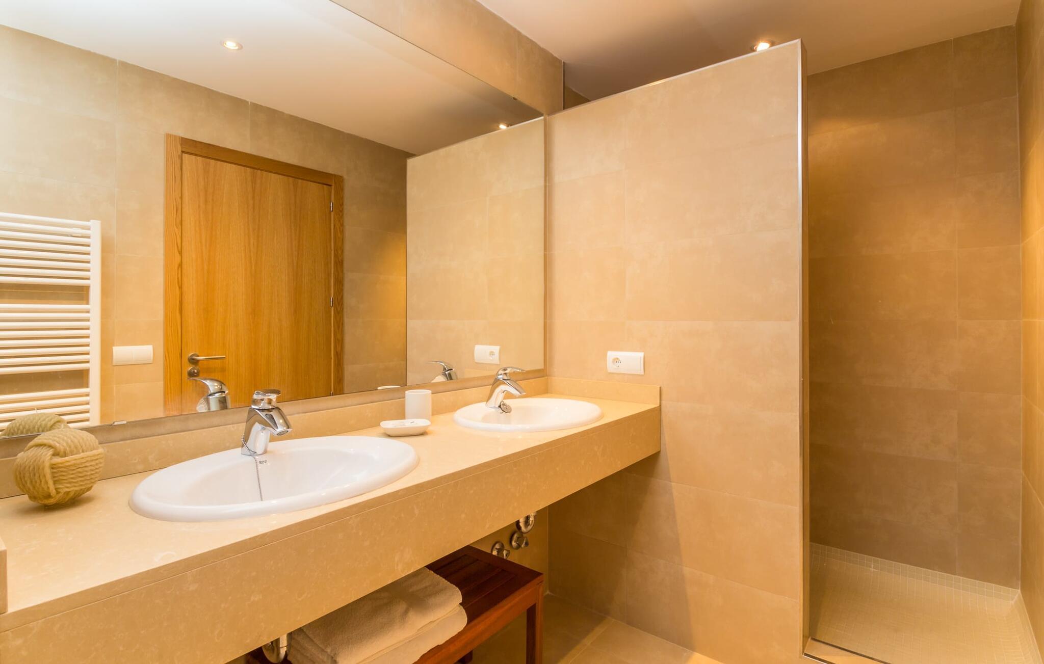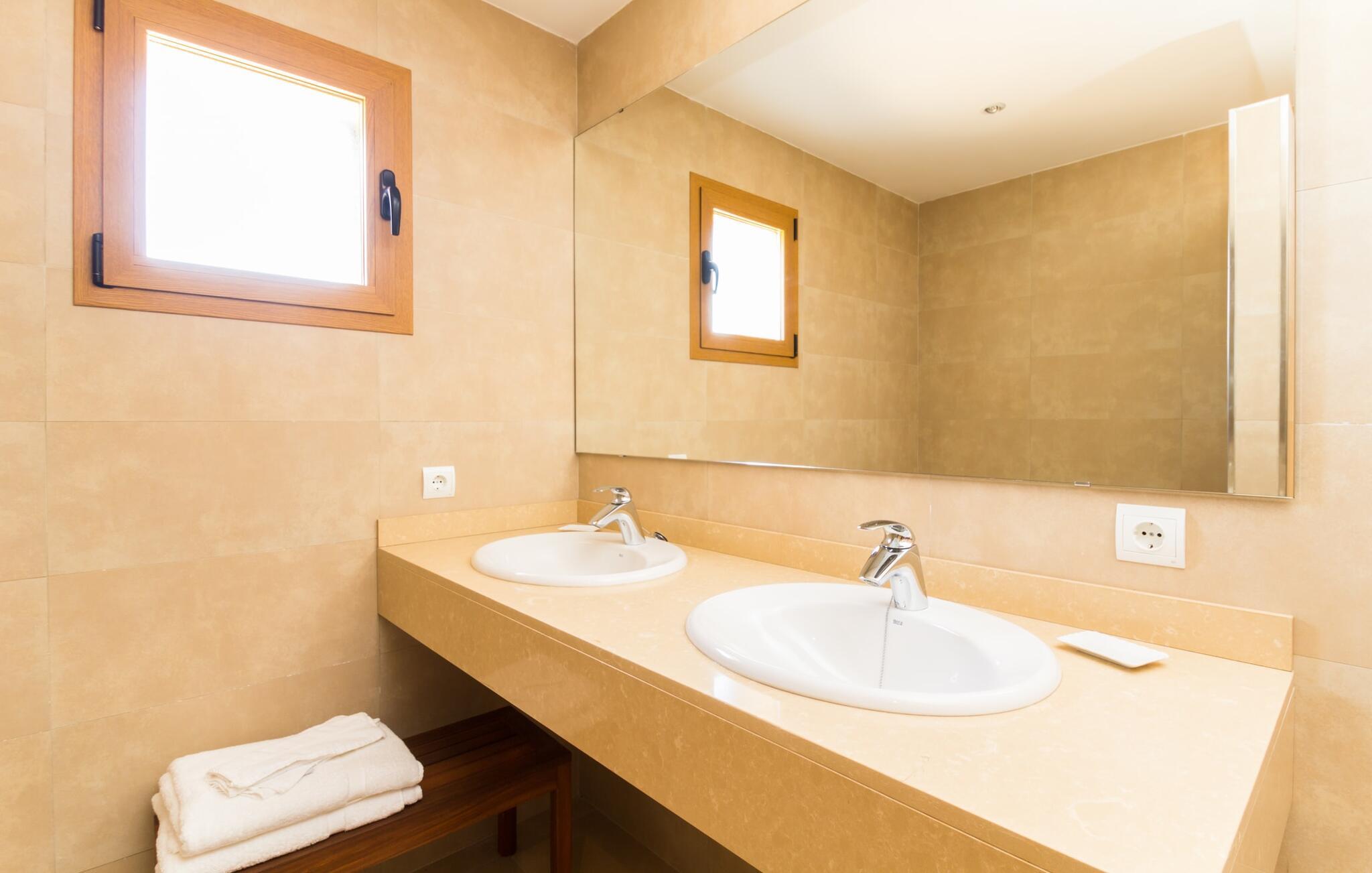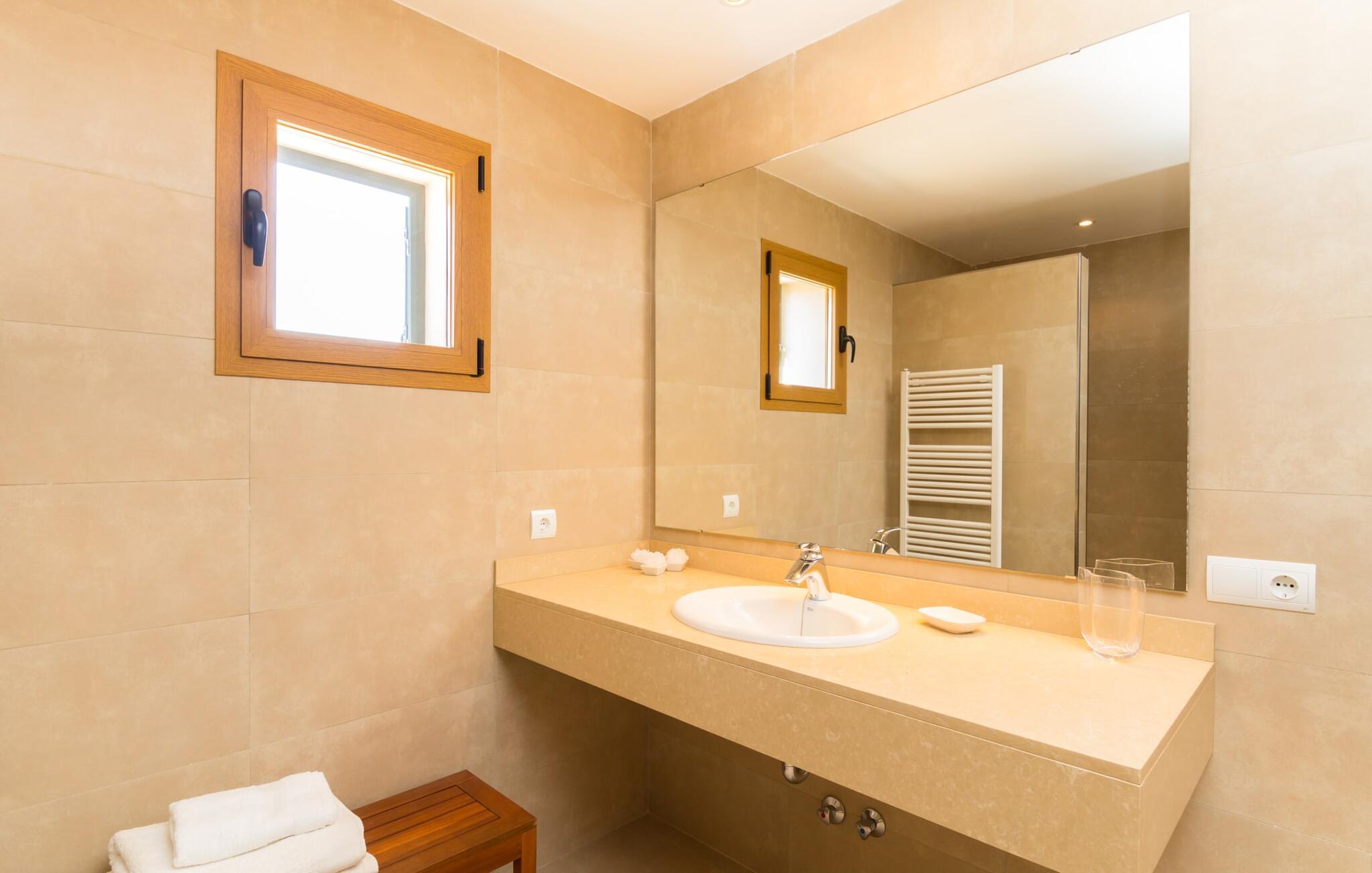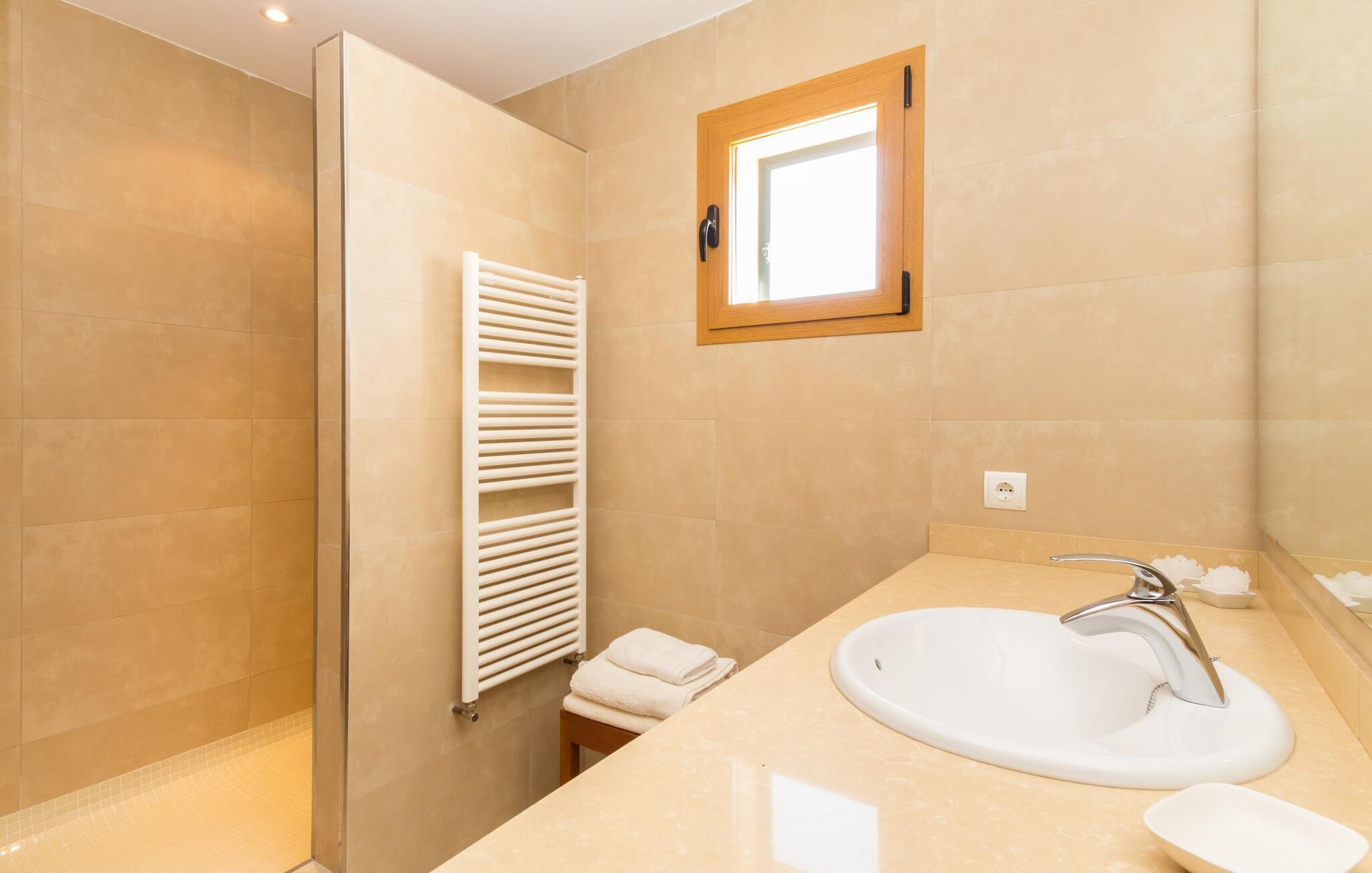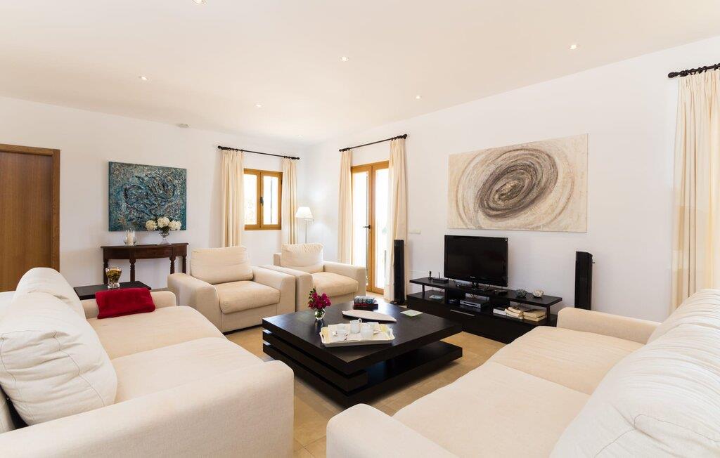 Feriegæster bør være opmærksomme på denne ejendom, hvis de værdsætter et moderne, velholdt feriehus og elsker uhindret havudsigt. Villa "Can Tem" dækker utrolige 355.500 kvadratmeter og skiller sig ud fra landskabet som en lille, storslået ejendom. Grunden i nærheden af huset har græsplæner og terrasseområder og er foret med ung middelhavsvegetation, hvilket giver uhindret udsigt over det omkringliggende landskab og udsigt ud over havet i lang tid. I midten af haven ligger den elegante pool, som har en meget komfortabel trinadgang og en rummelig solterrasse ved siden af. I kan slappe af i solen på de komfortable liggestole og nyde den fantastiske natur i denne ferievilla. Hvis solen er for stærk, er der tre parasoller til beskyttelse. I kan også drage fordel af den luftige skygge på den store veranda, som ligger tre trin over poolen: Med sin gulmalede facade ser den særdeles munter og indbydende ud. Her kan I nyde en hyggelig middag ved det store spisebord, mens I nyder den vidunderlige udsigt eller slappe af med stil i den ultramoderne lounge. Et godt lokale til en elegant start og afslutning på dagen: om aftenen kan I for eksempel arrangere en kulinarisk grill. Udvidelsen af verandaen byder på yderligere delvist skyggefulde steder, hvor I kan samles i små grupper eller bo alene, hvis I ønsker det. I kan også sidde under oliventræerne i nærheden af de to udhuse og måske læse en god bog. Der er mange måder at finde jeres helt eget yndlingssted på. Inde i huset finder I en rummelig stue indrettet med lyse farver og usædvanlige, unikke elementer. På væggene finder I alle mulige bemærkelsesværdige kunsttryk og opdager mange andre detaljer. Den kombinerede stue/spisestue byder på et kæmpe sofahjørne, hvor I kan sidde komfortabelt på de komfortable siddepladser på ethvert tidspunkt af dagen. Fladskærms-tv'et er også bekvemt placeret her. Midt i lokalet er der et stort spisebord med stole i original stil, der kan rumme otte personer. Det rummelige køkken fremstår stilrent og er udstyret med stort køleskab, ovn, keramisk kogeplade, mikroovn, opvaskemaskine, elkedel, Nespresso kaffemaskine og meget mere. Der er også plads nok til et ekstra spisebord, der kan bruges af seks personer. Soveværelset med aircondition inviterer jer til at slappe af. Uden unødvendige dikkedarer overrasker disse værelser med deres lysstyrke og mange nuancer af hvid, kombineret med kontrasterende kunstneriske accenter. For en behagelig hvile har gæsterne i alt en seng, der måler 1,80 x 2,00 m og ti senge, der måler 0,90 x 2,00 m til deres rådighed. I stueetagen er der et soveværelse med en-suite badeværelse og et gæstetoilet, mens der på første sal er fem soveværelser, hvoraf det ene har en-suite badeværelse, og yderligere to separate badeværelser. Soveværelsets smagfulde design kommer også til sin ret på badeværelserne. Disse er kendetegnet ved deres meget komfortable, rummelige og ultramoderne stil. Hvis det kræves, er to babysenge og høje stole til rådighed. Porto Cristo byder på en smuk strand med lavvandet adgang til havet og en smuk promenade. Der finder I også adskillige store supermarkeder, hvoraf nogle også har åbent på søn- og helligdage. Her kan I få alt, hvad I skal bruge til jeres daglige behov. De mange strande omkring havnebyen kan også varmt anbefales. Den ultramoderne og venlige villa "Can Tem" ligger kun få kilometer fra havet på østsiden af øen, ikke langt fra Porto Cristo. Den bekvemme beliggenhed gør den daglige indkøb nemmere. Der er et ugentligt marked i Manacor hver mandag. De smukke strande på østkysten kan nås hurtigt i bil.