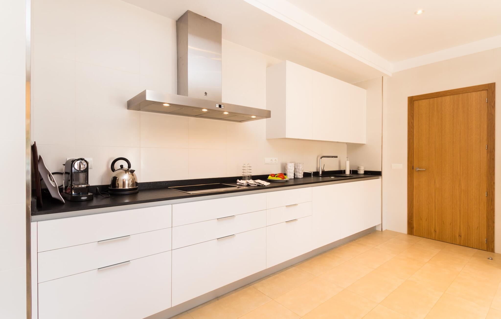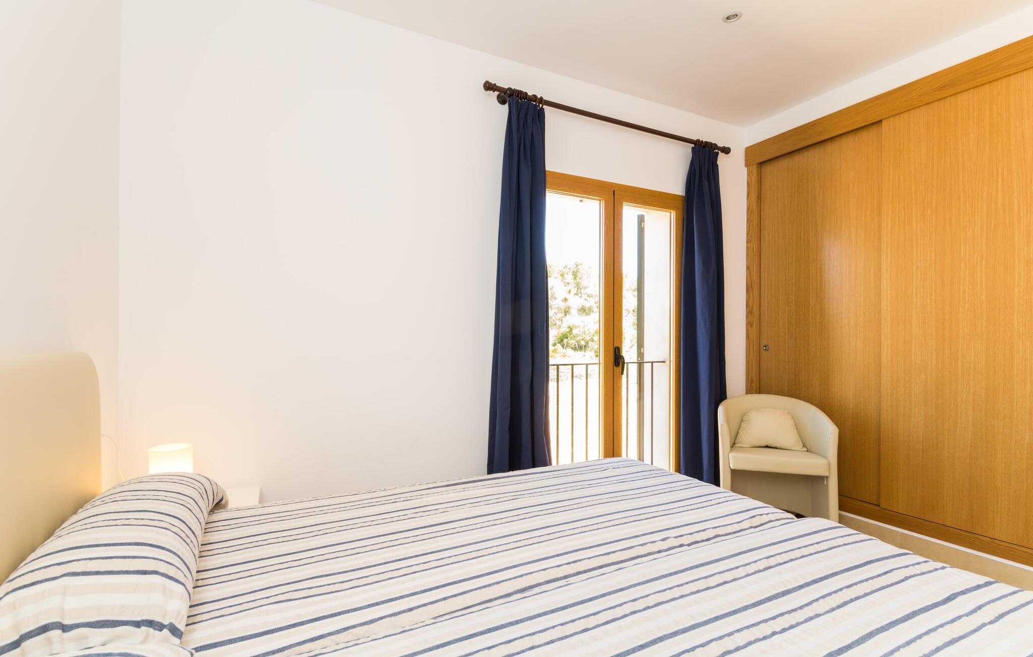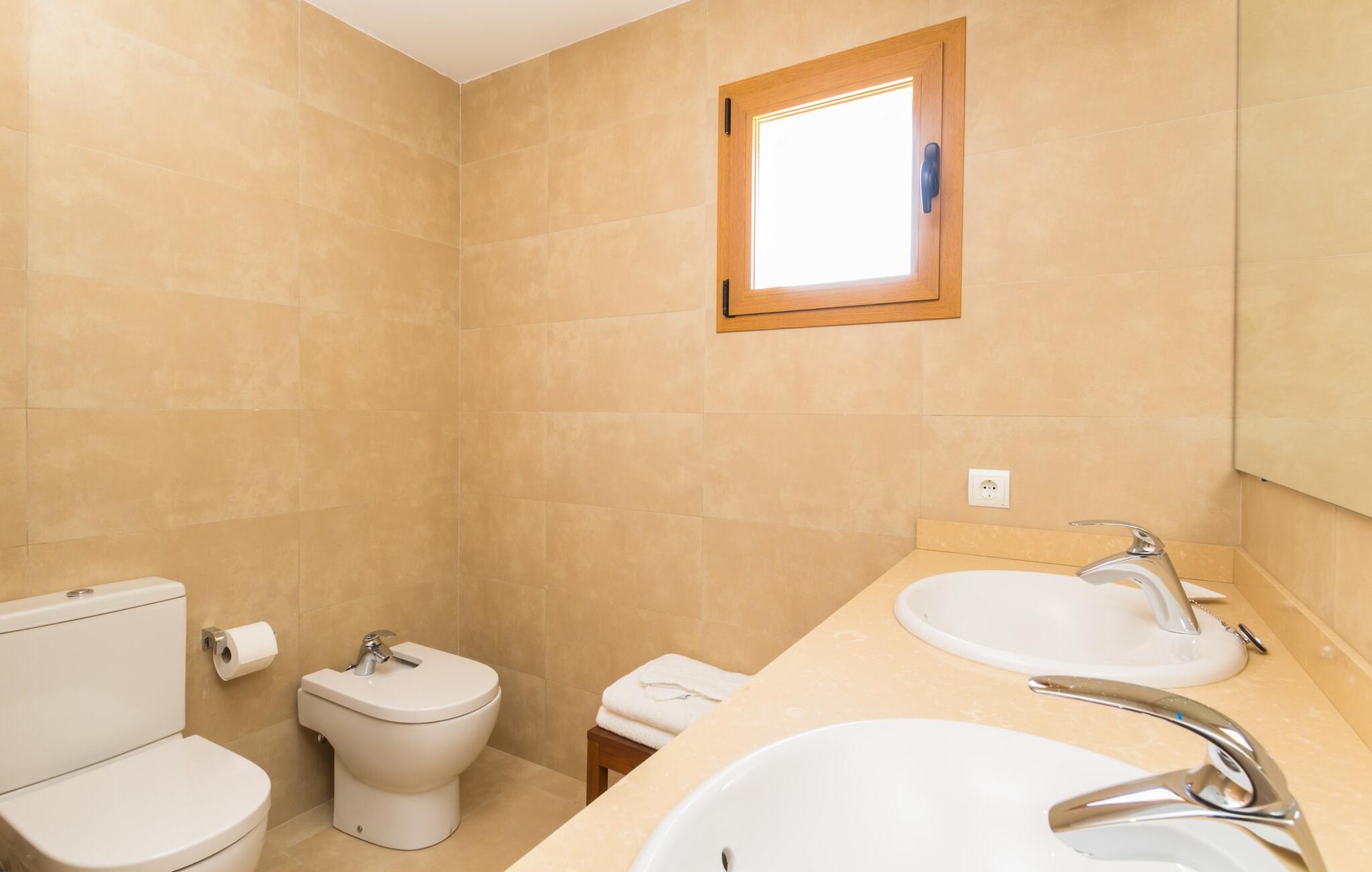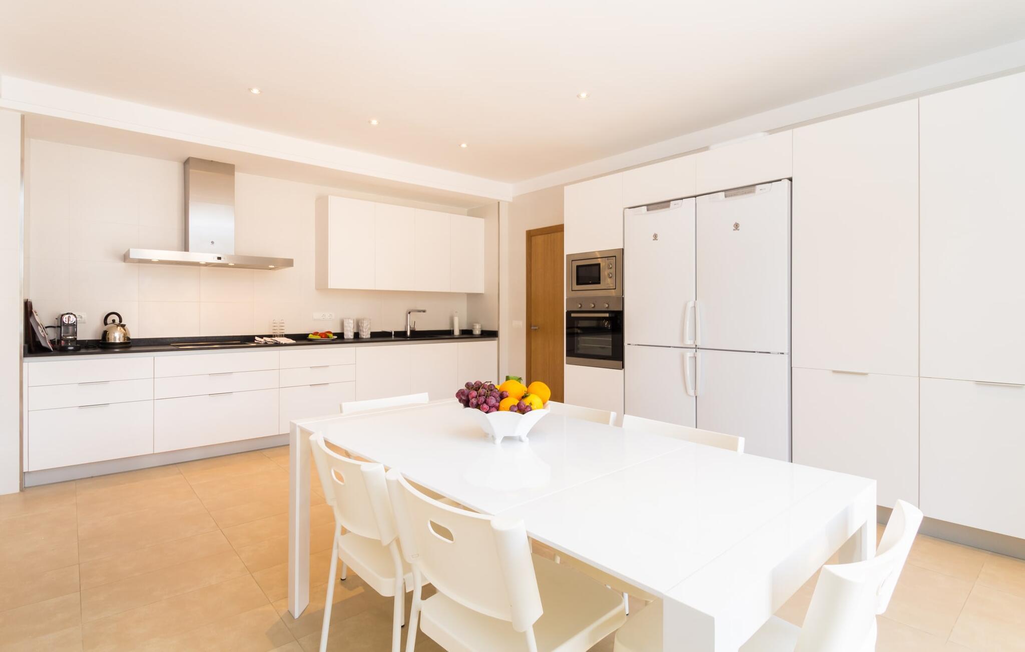 Feriegæster bør være opmærksomme på denne ejendom, hvis de værdsætter et moderne, velholdt feriehus og elsker uhindret havudsigt. Villa "Can Tem" dækker utrolige 355.500 kvadratmeter og skiller sig ud fra landskabet som en lille, storslået ejendom. Grunden i nærheden af huset har græsplæner og terrasseområder og er foret med ung middelhavsvegetation, hvilket giver uhindret udsigt over det omkringliggende landskab og udsigt ud over havet i lang tid. I midten af haven ligger den elegante pool, som har en meget komfortabel trinadgang og en rummelig solterrasse ved siden af. I kan slappe af i solen på de komfortable liggestole og nyde den fantastiske natur i denne ferievilla. Hvis solen er for stærk, er der tre parasoller til beskyttelse. I kan også drage fordel af den luftige skygge på den store veranda, som ligger tre trin over poolen: Med sin gulmalede facade ser den særdeles munter og indbydende ud. Her kan I nyde en hyggelig middag ved det store spisebord, mens I nyder den vidunderlige udsigt eller slappe af med stil i den ultramoderne lounge. Et godt lokale til en elegant start og afslutning på dagen: om aftenen kan I for eksempel arrangere en kulinarisk grill. Udvidelsen af verandaen byder på yderligere delvist skyggefulde steder, hvor I kan samles i små grupper eller bo alene, hvis I ønsker det. I kan også sidde under oliventræerne i nærheden af de to udhuse og måske læse en god bog. Der er mange måder at finde jeres helt eget yndlingssted på. Inde i huset finder I en rummelig stue indrettet med lyse farver og usædvanlige, unikke elementer. På væggene finder I alle mulige bemærkelsesværdige kunsttryk og opdager mange andre detaljer. Den kombinerede stue/spisestue byder på et kæmpe sofahjørne, hvor I kan sidde komfortabelt på de komfortable siddepladser på ethvert tidspunkt af dagen. Fladskærms-tv'et er også bekvemt placeret her. Midt i lokalet er der et stort spisebord med stole i original stil, der kan rumme otte personer. Det rummelige køkken fremstår stilrent og er udstyret med stort køleskab, ovn, keramisk kogeplade, mikroovn, opvaskemaskine, elkedel, Nespresso kaffemaskine og meget mere. Der er også plads nok til et ekstra spisebord, der kan bruges af seks personer. Soveværelset med aircondition inviterer jer til at slappe af. Uden unødvendige dikkedarer overrasker disse værelser med deres lysstyrke og mange nuancer af hvid, kombineret med kontrasterende kunstneriske accenter. For en behagelig hvile har gæsterne i alt en seng, der måler 1,80 x 2,00 m og ti senge, der måler 0,90 x 2,00 m til deres rådighed. I stueetagen er der et soveværelse med en-suite badeværelse og et gæstetoilet, mens der på første sal er fem soveværelser, hvoraf det ene har en-suite badeværelse, og yderligere to separate badeværelser. Soveværelsets smagfulde design kommer også til sin ret på badeværelserne. Disse er kendetegnet ved deres meget komfortable, rummelige og ultramoderne stil. Hvis det kræves, er to babysenge og høje stole til rådighed. Porto Cristo byder på en smuk strand med lavvandet adgang til havet og en smuk promenade. Der finder I også adskillige store supermarkeder, hvoraf nogle også har åbent på søn- og helligdage. Her kan I få alt, hvad I skal bruge til jeres daglige behov. De mange strande omkring havnebyen kan også varmt anbefales. Den ultramoderne og venlige villa "Can Tem" ligger kun få kilometer fra havet på østsiden af øen, ikke langt fra Porto Cristo. Den bekvemme beliggenhed gør den daglige indkøb nemmere. Der er et ugentligt marked i Manacor hver mandag. De smukke strande på østkysten kan nås hurtigt i bil.