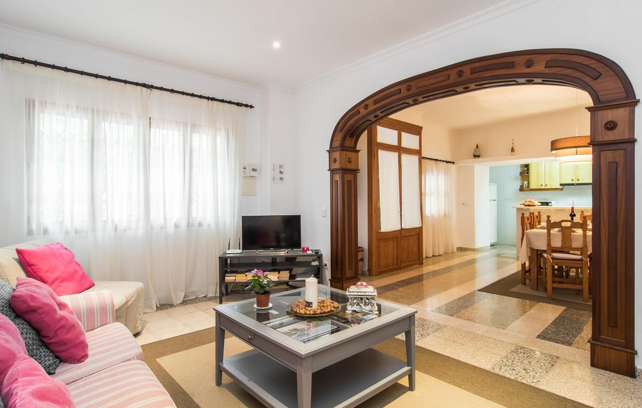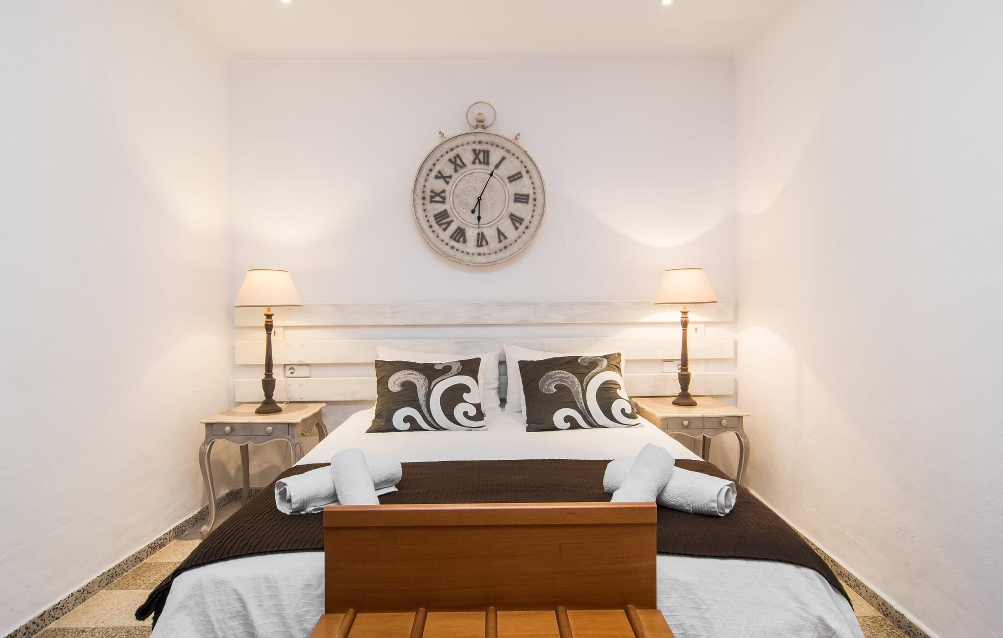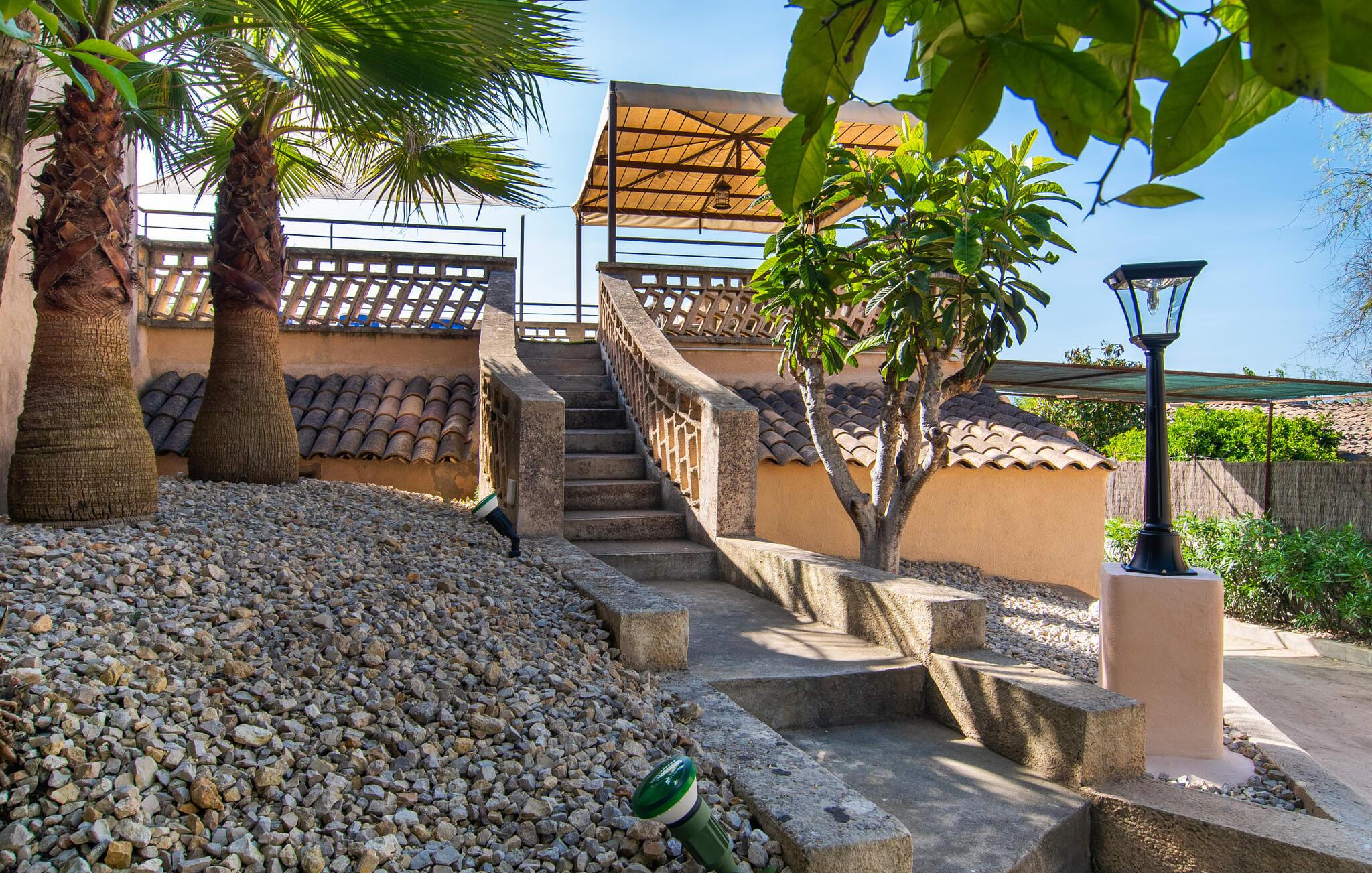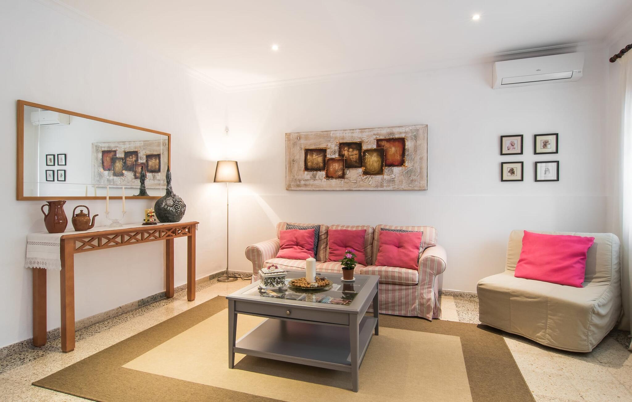 Den charmerende stenfinca "Can Tiró" ligger på en stor grund med frodige grønne områder og sin egen appelsinlund, hvor I kan høste friske, lækre tropiske frugter efter årstiden. Huset er omgivet af terrasser og en pool og tilbyder et afsondret, men ikke-isoleret tilflugtssted i hjertet af det mallorcanske landskab. Poolen, som ligger på et af terrasseniveauerne, er forsvarligt lukket med en låge, hvilket gør den ideel til familier med små børn. Fra poolen kan I nyde en betagende udsigt over den omkringliggende natur og de fjerne bjerge. Med liggestole og forskellige siddepladser er der altid et perfekt sted at slappe af i solen eller skyggen. I kan parkere jeres lejebil direkte ved indgangen. Indenfor er "Can Tiró" lige så indbydende med en nøje sammensat blanding af traditionelle og moderne elementer. Mørkt træ komplementerer lyse hvide vægge, og klinkegulve er kombineret med charmerende boligtilbehør. Alle værelser er på ét plan. Den åbne planløsning og spiseplads giver jer mulighed for at slappe af på den komfortable sofa, mens I nyder fjernsynet, med en smukt udskåret træbue, der fører til spisepladsen. Det lille, men fuldt udstyrede køkken byder på ekstra siddepladser ved den smarte disk, perfekt til en hurtig morgenmad eller et glas vin, mens I laver mad. To soveværelser og et badeværelse en suite fuldender boligarealet. Denne ejendom ligger i en smuk landlig beliggenhed i centrum af Mallorca. Byen Costitx ligger kun omkring 1,4 km væk via den akustisk mærkbare vej, og Alcúdia-bugten med dens forskellige strande er godt 26 km væk.