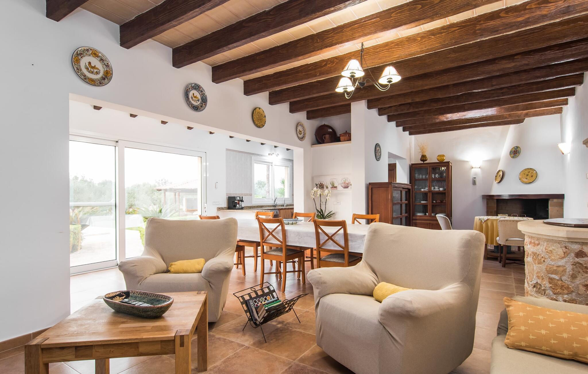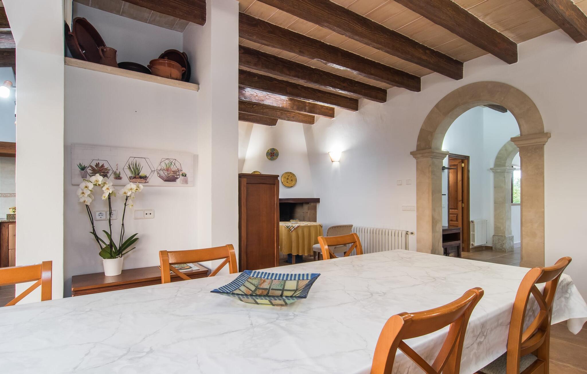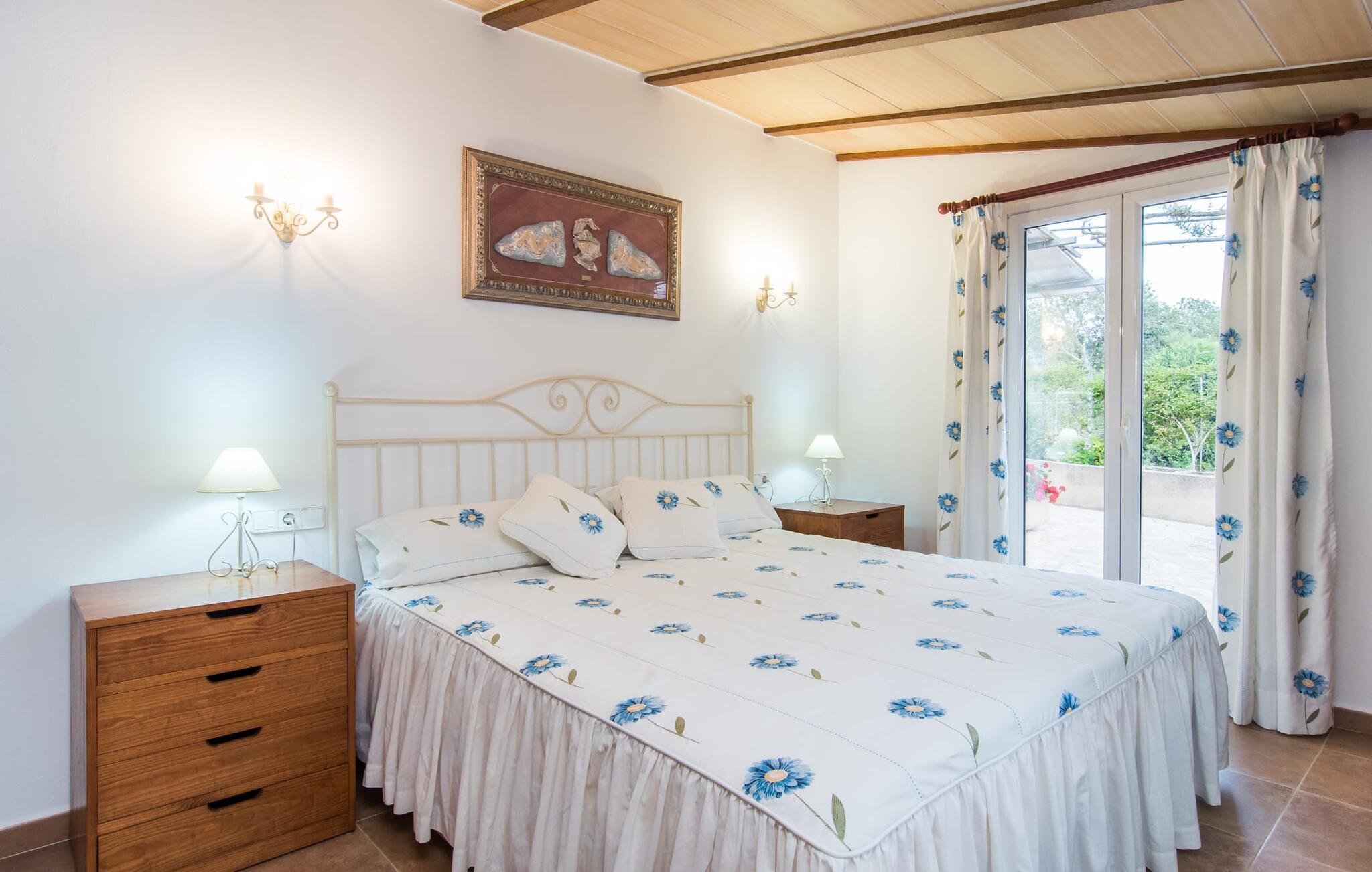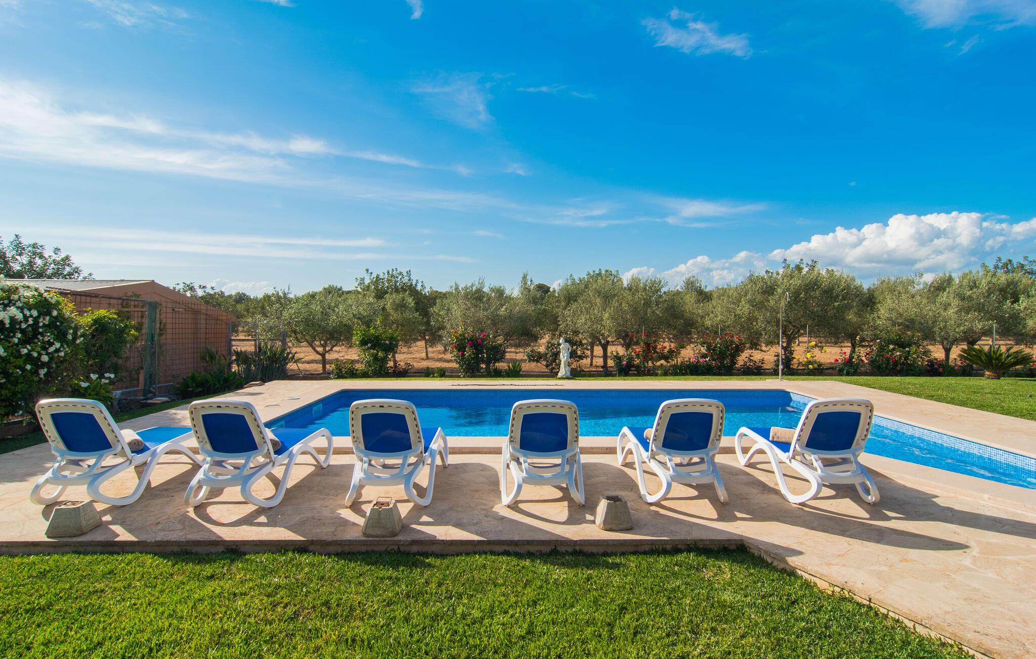 Det rustikke landsted "Can Tomeu de Son Negre" er tæt forbundet med omgivelserne - for den sydlige del af Mallorca byder på en betagende naturskønhed, azurblå bugter med sandstrande og overraskende små byer med talrige seværdigheder. Det autentiske bondehus lover ikke kun en afvekslende ferietid, men tilbyder jer også alt, hvad I ønsker jer af jeres ferie: fred, afslapning og skøn tid sammen. Det rige design af middelhavshaven med høje palmer, oliventræer og græsplæner alene bidrager til værdifuld afslapning. Beliggende i frodige grønne områder tilbyder den mosaik-dækkede pool jer en hudvenlig måde at køle af om morgenen eller sent om aftenen. På den tilstødende naturstensolterrasse kan I nyde den rene blå himmel eller læse en god bog, mens børnene kan bruge deres energi i poolen. Skift jeres yndlings udendørssteder under en afslappende dag på jeres gård. Vi er glade for både havekøkkenet under den sekskantede pavillon med spiseplads og det andet udekøkken under den overdækkede terrasse, som støder direkte op til huset. Indretningen i det hyggelige sommerhus er også alsidig og har naturligvis hyggelig og praktisk indretning, der har fokus på komfort og velvære. Dette opnås gennem en rustik indretning med komfortable møbler i en kombineret opholds- og spisestue med pejs. I tilknytning hertil ligger det halvåbne køkken og spisekammer, som er tilgængeligt fra to sider. Det fuldt udstyrede køkken gør det nemt for jer at vælge bevidst selvforsyning. Naturligheden i det autentiske sommerhus garanterer en behagelig nattesøvn i tre dobbeltværelser. Alle værelser er på samme niveau. Komforten for seks personer – ideel til to familier – rundes af af tre forskelligt designede badeværelser. Særligt praktisk: Det "blå" brusebad har udgang til haven og fungerer derfor også som et yderst behageligt udendørs badeværelse. Oplev det afslappede mallorcanske landliv og fordyb jer i besøg på de omkringliggende vingårde. Tidlig søndag morgen på markedet i Felanitx, ture til smukke Santanyí eller længerevarende strandbesøg til Cales på Mallorca – I er garanteret en varieret ferie. "Can Tomeu de Son Negre" gør det muligt! Det klassiske bondehus "Can Tomeu de Son Negre" præsenterer sig selv som et fritliggende landsted med en middelhavshave og en smuk pool. Feriehuset ligger i den sydlige del af øen mellem Felanitx og Cas Concos de Cavaller. Begge steder kan nås på en behagelig kort køretur på grund af nærheden til landevejen, som kun kan høres lejlighedsvis i visse vinde. Hvis I kan lide en badeferie, vil I opdage smukke sandstrande omkring 15 km væk. Fantastisk landlig beliggenhed nær Felanitx i syd.