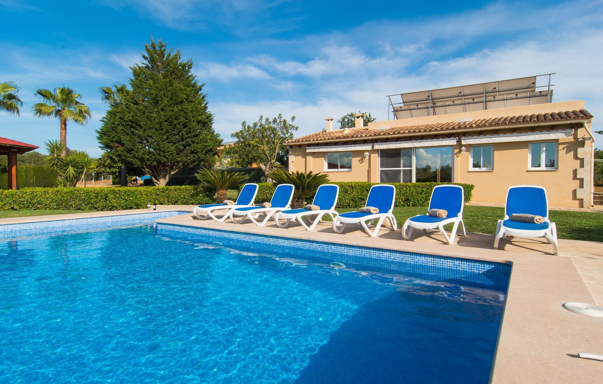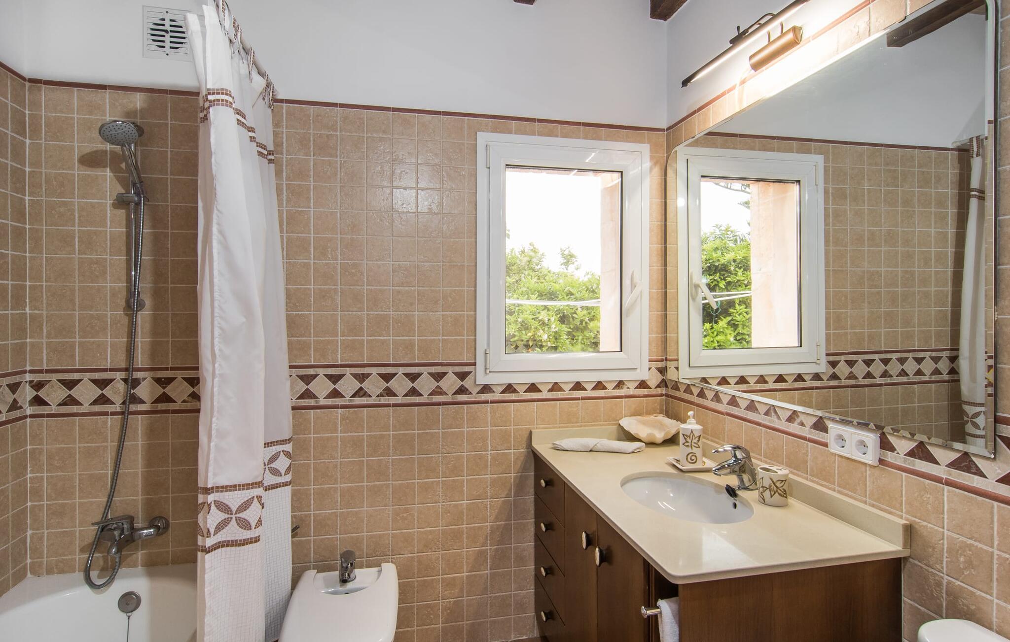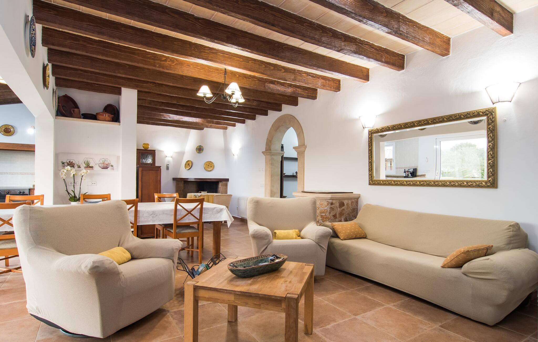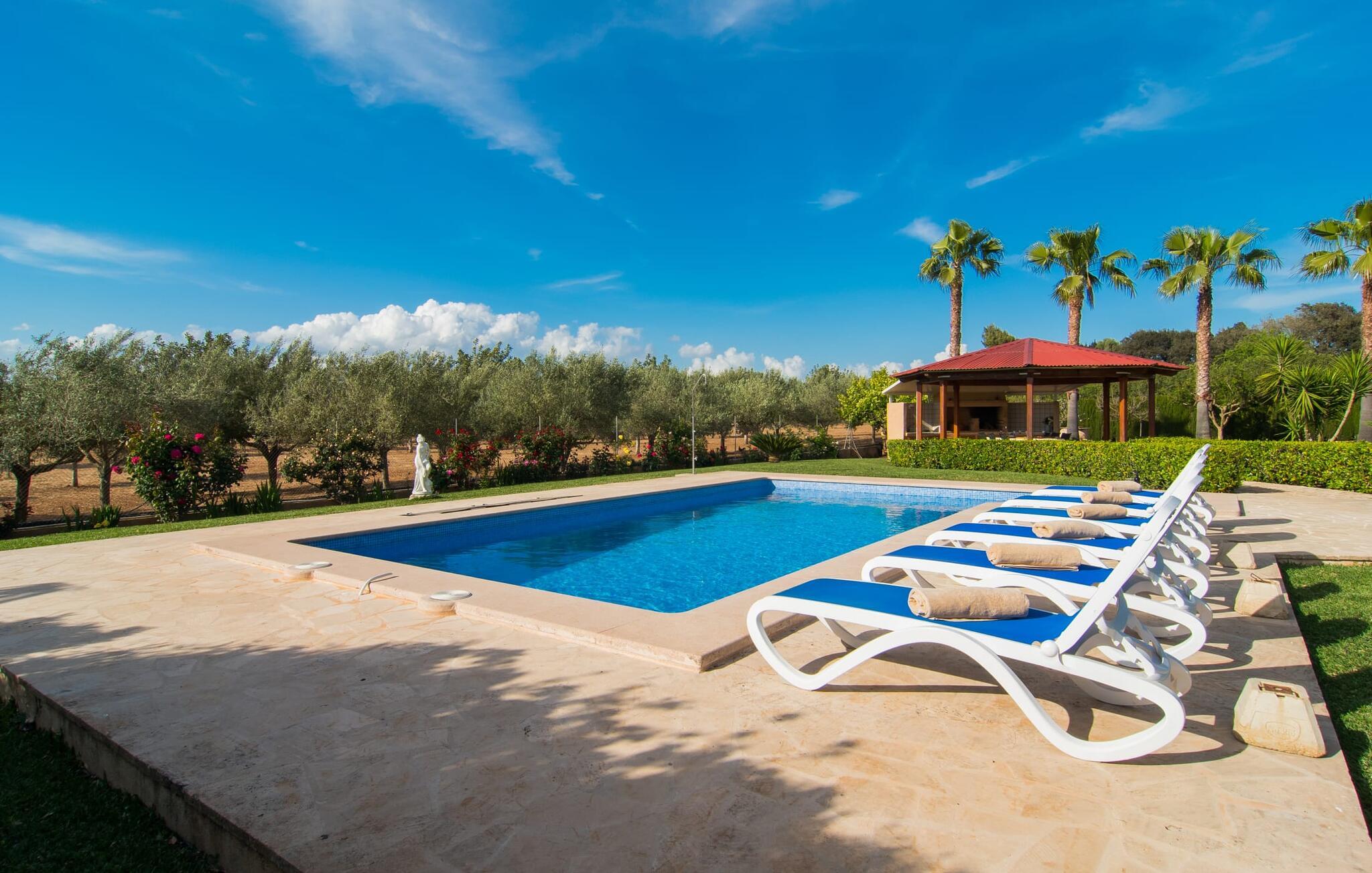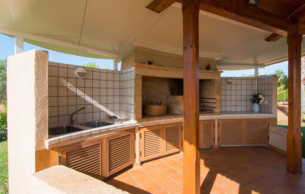 Det rustikke landsted "Can Tomeu de Son Negre" er tæt forbundet med omgivelserne - for den sydlige del af Mallorca byder på en betagende naturskønhed, azurblå bugter med sandstrande og overraskende små byer med talrige seværdigheder. Det autentiske bondehus lover ikke kun en afvekslende ferietid, men tilbyder jer også alt, hvad I ønsker jer af jeres ferie: fred, afslapning og skøn tid sammen. Det rige design af middelhavshaven med høje palmer, oliventræer og græsplæner alene bidrager til værdifuld afslapning. Beliggende i frodige grønne områder tilbyder den mosaik-dækkede pool jer en hudvenlig måde at køle af om morgenen eller sent om aftenen. På den tilstødende naturstensolterrasse kan I nyde den rene blå himmel eller læse en god bog, mens børnene kan bruge deres energi i poolen. Skift jeres yndlings udendørssteder under en afslappende dag på jeres gård. Vi er glade for både havekøkkenet under den sekskantede pavillon med spiseplads og det andet udekøkken under den overdækkede terrasse, som støder direkte op til huset. Indretningen i det hyggelige sommerhus er også alsidig og har naturligvis hyggelig og praktisk indretning, der har fokus på komfort og velvære. Dette opnås gennem en rustik indretning med komfortable møbler i en kombineret opholds- og spisestue med pejs. I tilknytning hertil ligger det halvåbne køkken og spisekammer, som er tilgængeligt fra to sider. Det fuldt udstyrede køkken gør det nemt for jer at vælge bevidst selvforsyning. Naturligheden i det autentiske sommerhus garanterer en behagelig nattesøvn i tre dobbeltværelser. Alle værelser er på samme niveau. Komforten for seks personer – ideel til to familier – rundes af af tre forskelligt designede badeværelser. Særligt praktisk: Det "blå" brusebad har udgang til haven og fungerer derfor også som et yderst behageligt udendørs badeværelse. Oplev det afslappede mallorcanske landliv og fordyb jer i besøg på de omkringliggende vingårde. Tidlig søndag morgen på markedet i Felanitx, ture til smukke Santanyí eller længerevarende strandbesøg til Cales på Mallorca – I er garanteret en varieret ferie. "Can Tomeu de Son Negre" gør det muligt! Det klassiske bondehus "Can Tomeu de Son Negre" præsenterer sig selv som et fritliggende landsted med en middelhavshave og en smuk pool. Feriehuset ligger i den sydlige del af øen mellem Felanitx og Cas Concos de Cavaller. Begge steder kan nås på en behagelig kort køretur på grund af nærheden til landevejen, som kun kan høres lejlighedsvis i visse vinde. Hvis I kan lide en badeferie, vil I opdage smukke sandstrande omkring 15 km væk. Fantastisk landlig beliggenhed nær Felanitx i syd.