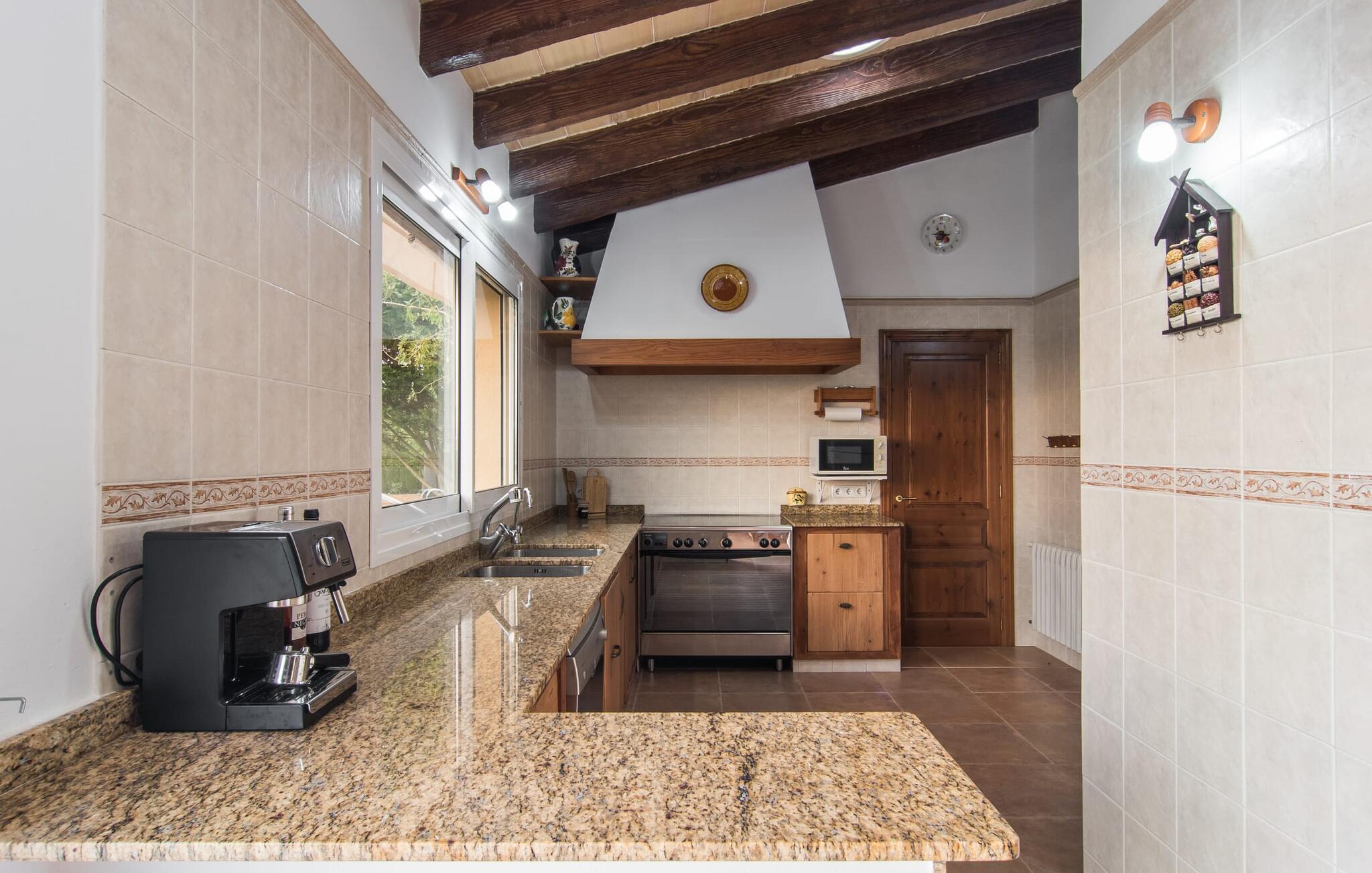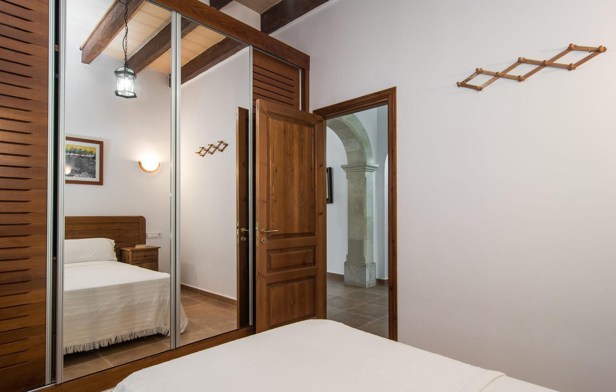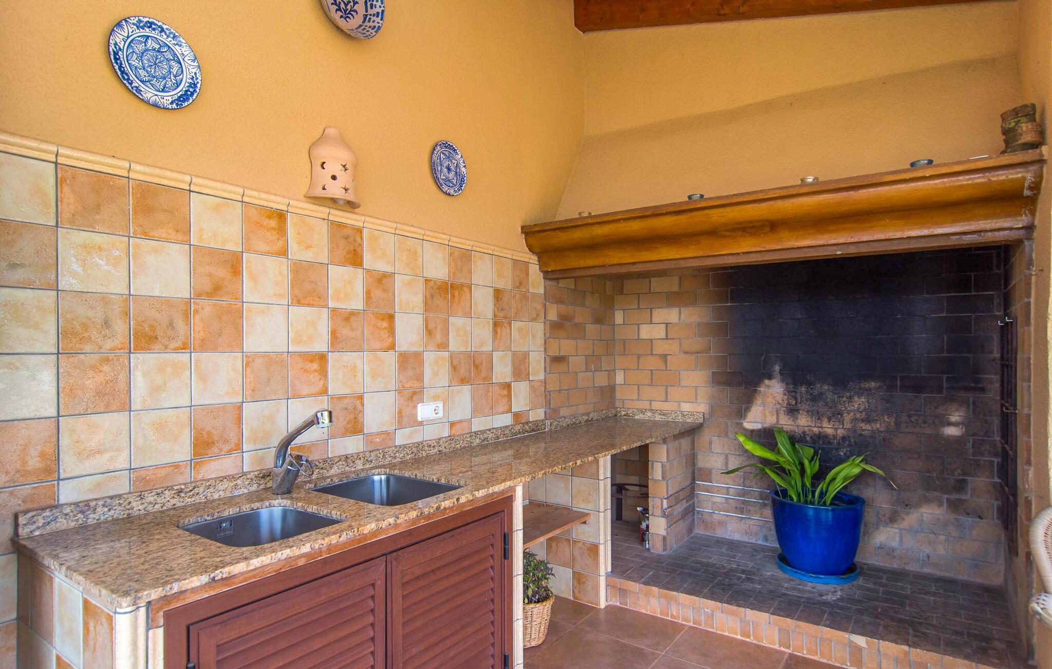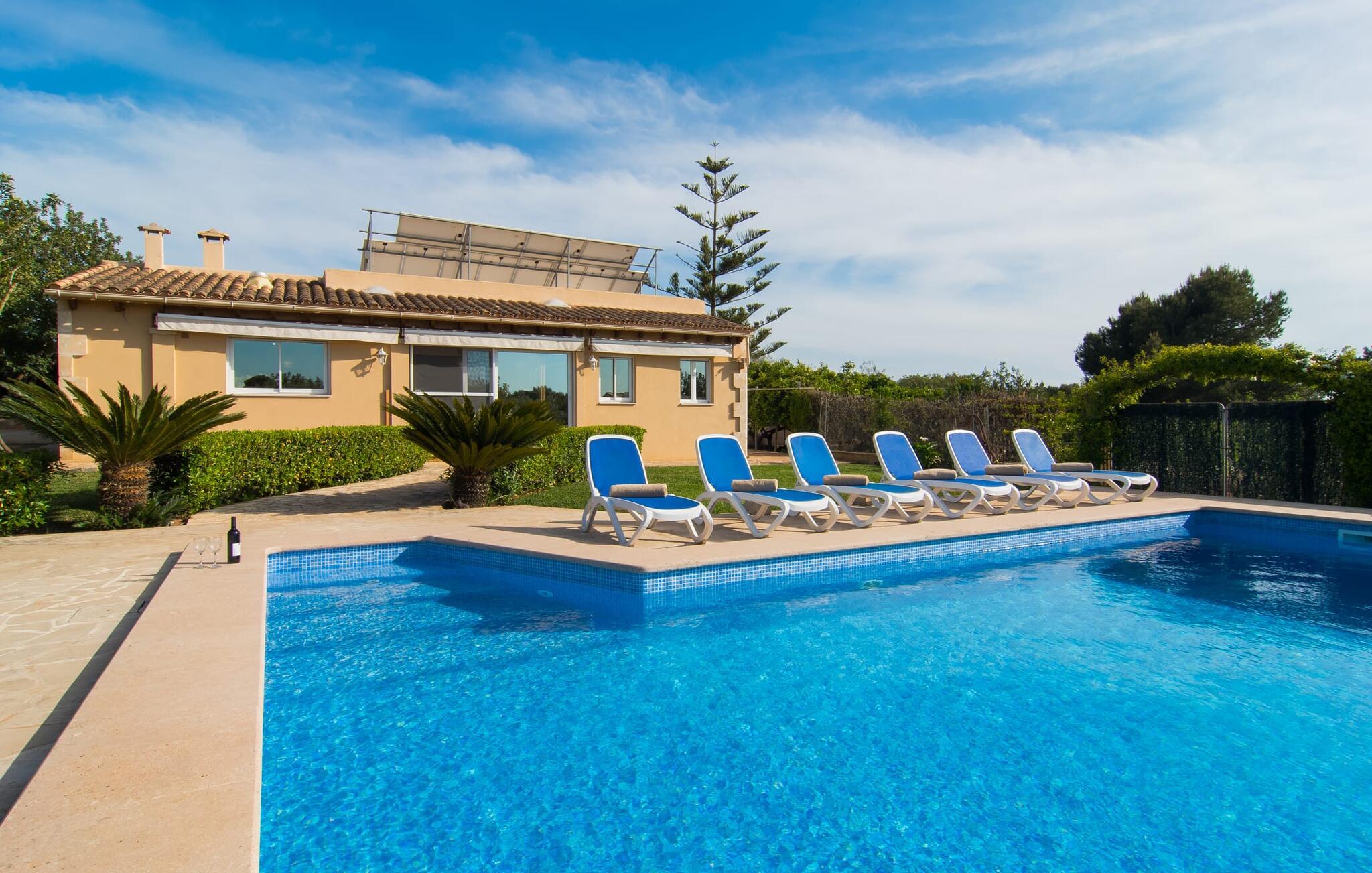 Det rustikke landsted "Can Tomeu de Son Negre" er tæt forbundet med omgivelserne - for den sydlige del af Mallorca byder på en betagende naturskønhed, azurblå bugter med sandstrande og overraskende små byer med talrige seværdigheder. Det autentiske bondehus lover ikke kun en afvekslende ferietid, men tilbyder jer også alt, hvad I ønsker jer af jeres ferie: fred, afslapning og skøn tid sammen. Det rige design af middelhavshaven med høje palmer, oliventræer og græsplæner alene bidrager til værdifuld afslapning. Beliggende i frodige grønne områder tilbyder den mosaik-dækkede pool jer en hudvenlig måde at køle af om morgenen eller sent om aftenen. På den tilstødende naturstensolterrasse kan I nyde den rene blå himmel eller læse en god bog, mens børnene kan bruge deres energi i poolen. Skift jeres yndlings udendørssteder under en afslappende dag på jeres gård. Vi er glade for både havekøkkenet under den sekskantede pavillon med spiseplads og det andet udekøkken under den overdækkede terrasse, som støder direkte op til huset. Indretningen i det hyggelige sommerhus er også alsidig og har naturligvis hyggelig og praktisk indretning, der har fokus på komfort og velvære. Dette opnås gennem en rustik indretning med komfortable møbler i en kombineret opholds- og spisestue med pejs. I tilknytning hertil ligger det halvåbne køkken og spisekammer, som er tilgængeligt fra to sider. Det fuldt udstyrede køkken gør det nemt for jer at vælge bevidst selvforsyning. Naturligheden i det autentiske sommerhus garanterer en behagelig nattesøvn i tre dobbeltværelser. Alle værelser er på samme niveau. Komforten for seks personer – ideel til to familier – rundes af af tre forskelligt designede badeværelser. Særligt praktisk: Det "blå" brusebad har udgang til haven og fungerer derfor også som et yderst behageligt udendørs badeværelse. Oplev det afslappede mallorcanske landliv og fordyb jer i besøg på de omkringliggende vingårde. Tidlig søndag morgen på markedet i Felanitx, ture til smukke Santanyí eller længerevarende strandbesøg til Cales på Mallorca – I er garanteret en varieret ferie. "Can Tomeu de Son Negre" gør det muligt! Det klassiske bondehus "Can Tomeu de Son Negre" præsenterer sig selv som et fritliggende landsted med en middelhavshave og en smuk pool. Feriehuset ligger i den sydlige del af øen mellem Felanitx og Cas Concos de Cavaller. Begge steder kan nås på en behagelig kort køretur på grund af nærheden til landevejen, som kun kan høres lejlighedsvis i visse vinde. Hvis I kan lide en badeferie, vil I opdage smukke sandstrande omkring 15 km væk. Fantastisk landlig beliggenhed nær Felanitx i syd.