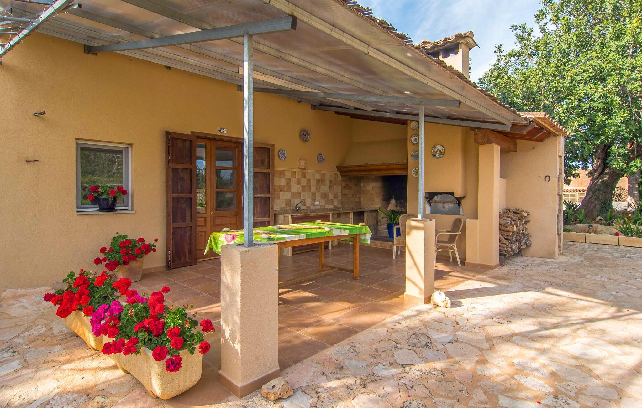 Det rustikke landsted "Can Tomeu de Son Negre" er tæt forbundet med omgivelserne - for den sydlige del af Mallorca byder på en betagende naturskønhed, azurblå bugter med sandstrande og overraskende små byer med talrige seværdigheder. Det autentiske bondehus lover ikke kun en afvekslende ferietid, men tilbyder dig også alt, hvad du ønsker dig af din ferie: fred, afslapning og skøn tid sammen. Det rige design af middelhavshaven med høje palmer, oliventræer og græsplæner alene bidrager til værdifuld afslapning. Beliggende i frodige grønne områder tilbyder den mosaik-dækkede pool dig en hudvenlig måde at køle af om morgenen eller sent om aftenen. På den tilstødende naturstensolterrasse kan du nyde den rene blå himmel eller læse en god bog, mens børnene kan bruge deres energi i poolen. Skift dine yndlings udendørssteder under en afslappende dag på din gård. Vi er glade for både havekøkkenet under den sekskantede pavillon med spiseplads og det andet udekøkken under den overdækkede terrasse, som støder direkte op til huset. Dette er et Fincallorca feriehus. Indretningen i det hyggelige sommerhus er også alsidig og har naturligvis hyggelig og praktisk indretning, der har fokus på komfort og velvære. Dette opnås gennem en rustik indretning med komfortable møbler i en kombineret opholds- og spisestue med pejs. I tilknytning hertil ligger det halvåbne køkken og spisekammer, som er tilgængeligt fra to sider. Det fuldt udstyrede køkken gør det nemt for dig at vælge bevidst selvforsyning. Naturligheden i det autentiske sommerhus garanterer en behagelig nattesøvn i tre dobbeltværelser. Alle værelser er på samme niveau. Komforten for seks personer – ideel til to familier – rundes af af tre forskelligt designede badeværelser. Særligt praktisk: Det "blå" brusebad har udgang til haven og fungerer derfor også som et yderst behageligt udendørs badeværelse. Oplev det afslappede mallorcanske landliv og fordyb dig i besøg på de omkringliggende vingårde. Tidlig søndag morgen på markedet i Felanitx, ture til smukke Santanyí eller længerevarende strandbesøg til Cales på Mallorca – du er garanteret en varieret ferie. "Can Tomeu de Son Negre" gør det muligt! Det klassiske bondehus "Can Tomeu de Son Negre" præsenterer sig selv som et fritliggende landsted med en middelhavshave og en smuk pool. Feriehuset ligger i den sydlige del af øen mellem Felanitx og Cas Concos de Cavaller. Begge steder kan nås på en behagelig kort køretur på grund af nærheden til landevejen, som kun kan høres lejlighedsvis i visse vinde. Hvis du kan lide en badeferie, vil du opdage smukke sandstrande omkring 15 km væk. Fantastisk landlig beliggenhed nær Felanitx i syd.