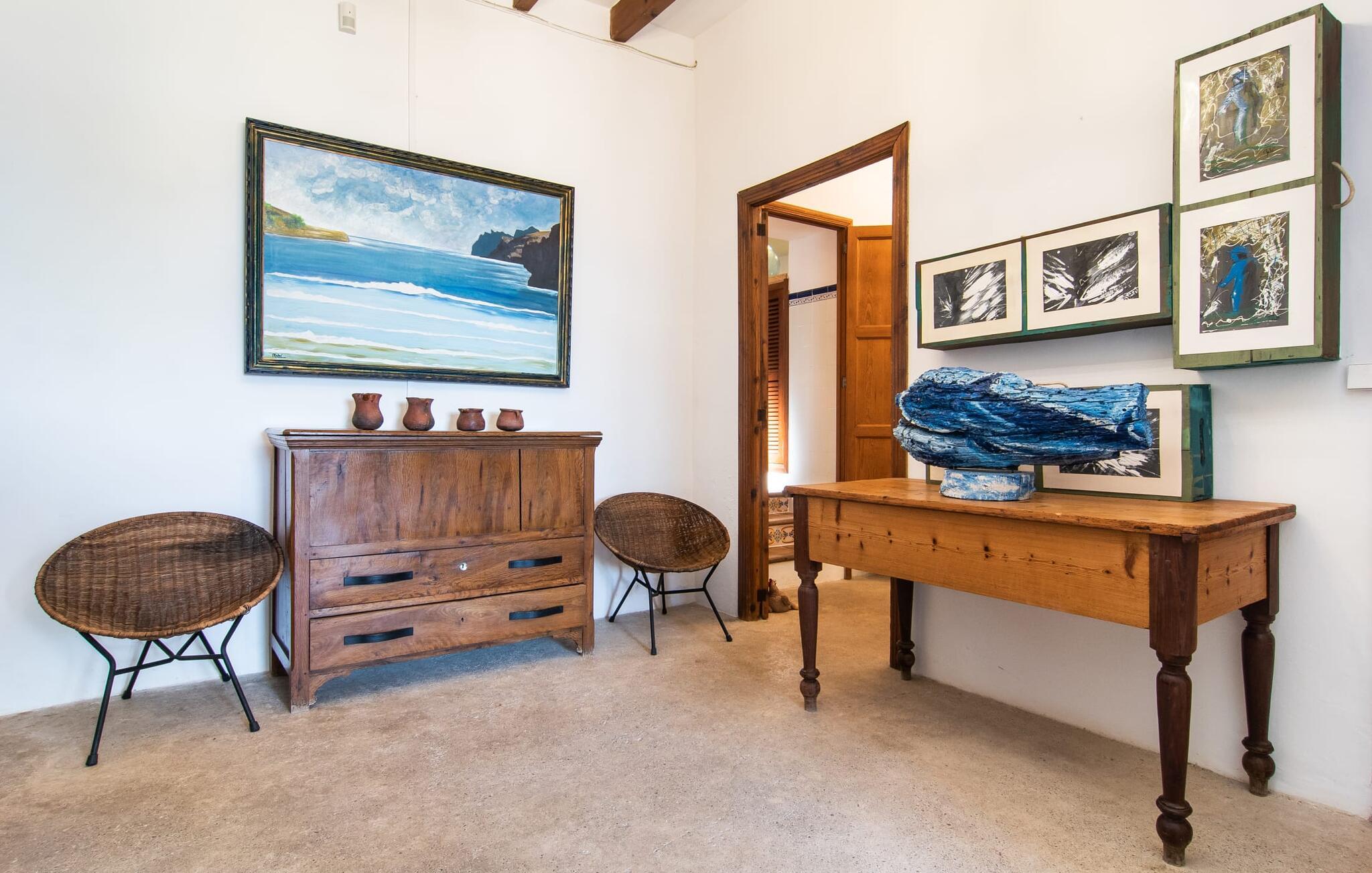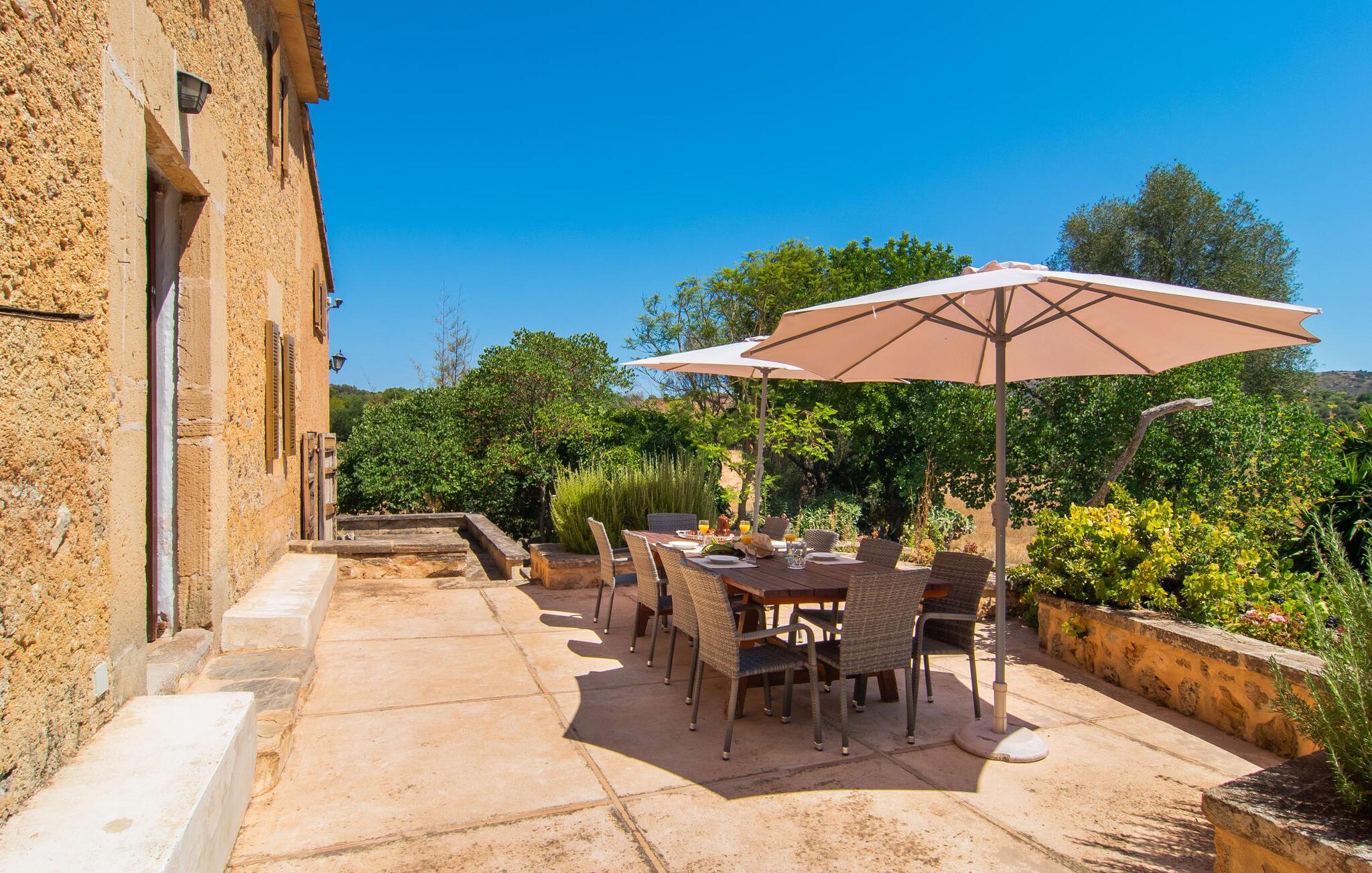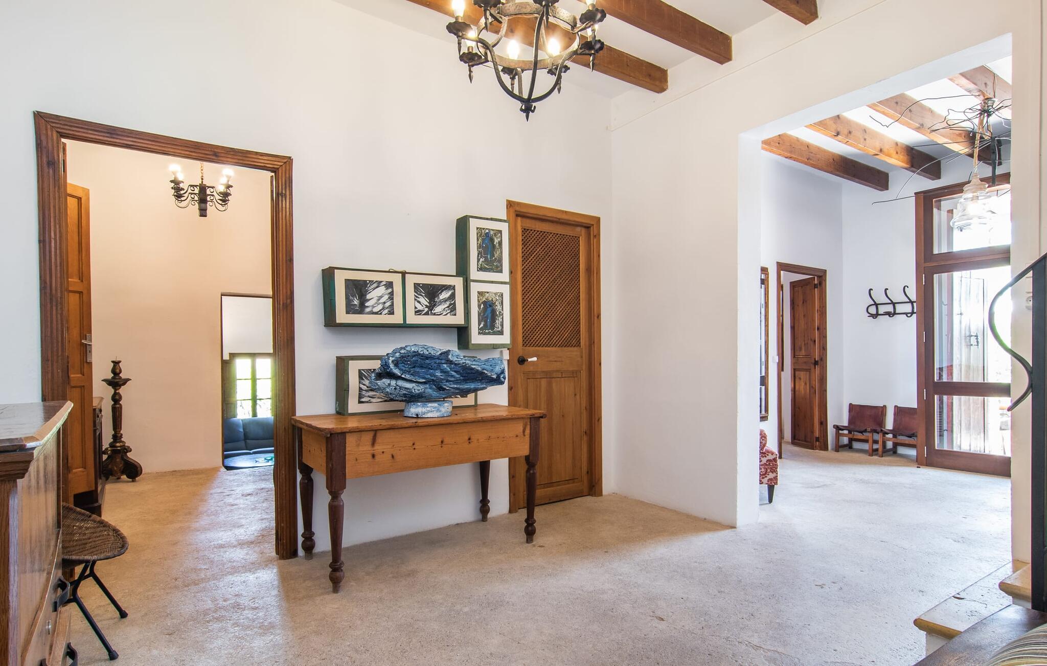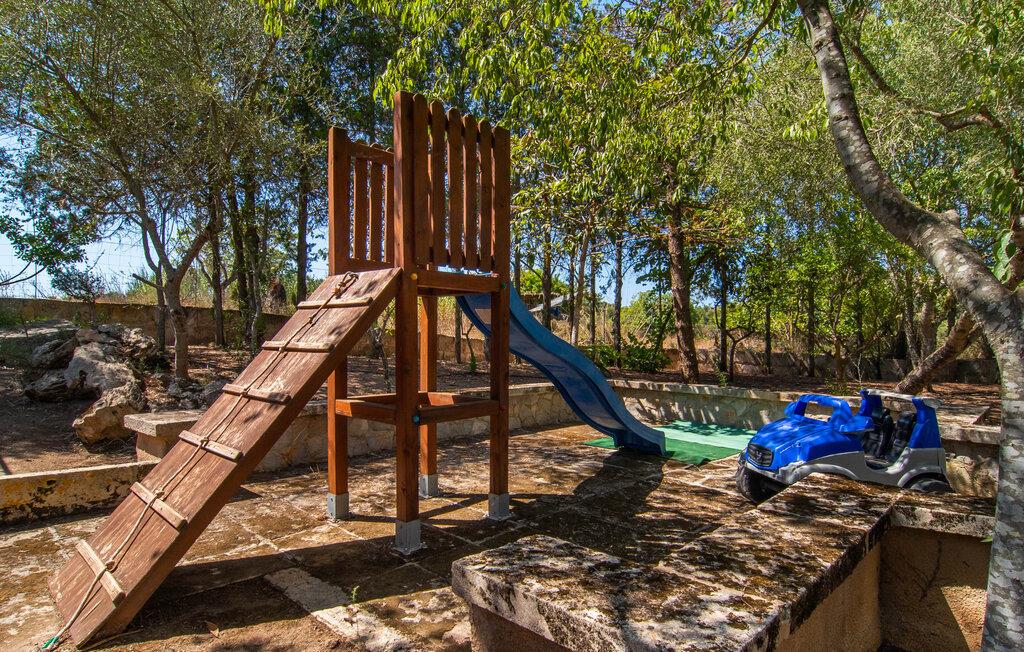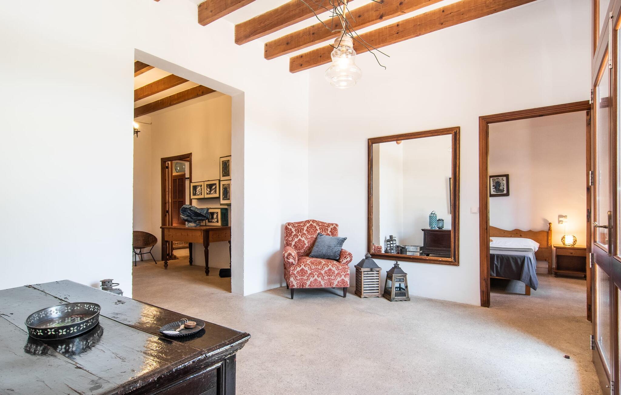 de rolige og afsondrede omgivelser i Villa "Sa Bogura" kan I nyde fortryllende omgivelser og trække jer tilbage i ordets sandeste betydning. En lille vej til villaen fører jer til denne rummelige ejendom, hvis rustikke stemning er særlig populær blandt vores gæster. Kort efter I ankommer, vil I indse, at dette er et sted, der tilbyder all-round afslapning. Her kan I nyde jeres ferie i en typisk mallorcansk atmosfære. Udearealet er præget af rummelige terrasser, rustikke trapper, nicher og vægge samt alskens middelhavsplanter. Der er endda en rutsjebane og en stor trægynge til børnene. Poolen, som er placeret lidt af vejen og tilgængelig via trapper, tilbyder et vidunderligt sted at bo. Poolen er mellem 1,20 m og 1,80 m dyb og kan nås via en stige. Liggestole og parasoller på træterrassen er perfekte til soldyrkere, der kan slappe af af hjertens lyst her ved Middelhavet og lægge hverdagen langt bag sig. Og det praktiske udendørs badeværelse gør det nemt at tilbringe hele dagen udendørs. På en af terrasserne nær huset med et stort spisebord kan I sidde afslappet og enten nyde en forfriskende drink eller fejre måltider i en hyggelig atmosfære. På varme aftener har I mulighed for at få en solid BBQ, hvor I kan lave mad og derefter prøve lækre mallorcanske råvarer. Den overdækkede grillplads på venstre side af huset er perfekt til dette, det ideelle lille sted at afslutte dagen komfortabelt. Andre indbydende siddepladser på ejendommen giver mulighed for altid at finde nye favoritpladser og trække sig tilbage et øjeblik, mens stemningen tager jer. De mange træer omkring huset byder på gode naturlige skyggeområder, hvor I kan sidde behageligt og luftigt. Det traditionelt indrettede hus har klassiske mallorcanske træbjælkelofter, lyse farver på væggene og naturstenselementer. I kombination med nogle rustikke møbler skabes en rustik stemning, der inviterer til at blive hængende. En smuk entré fører til et soveværelse fra begge sider. Længere nede i venstre side er trappen til overetagen. Ligesom badeværelserne på denne etage, har køkkenet alt hvad I behøver, inklusive en kedel og en filterkaffemaskine. Interessant nok er stuen spredt over to niveauer. Der er også en spiseplads på det nederste niveau til at nyde et måltid sammen indendørs. Her er også fladskærms-tv med satellitforbindelse installeret. I kan gøre jer godt tilpas og slappe af som I vil på de komfortable sofaer. Bøger, legetøj og en dvd-afspiller er til rådighed for jeres underholdning - selvom I næppe bliver efterladt alligevel - og det noget svage internetsignal er nok til at sende vigtige What'sapp-beskeder til jeres kære derhjemme. På øverste etage, der bruges som separat boligenhed, er der åben stue/spisestue med tilhørende lille køkken. En dør til terrassen giver jer mulighed for at gå direkte udenfor. Der er to soveværelser og et badeværelse på denne etage. Denne øverste del af huset med egen indgang er komplet indrettet i en mere moderne stil. Soveværelserne i huset er individuelt designet og formidler hver især en hjemlig atmosfære. Vi er sikre på, at alle vil finde deres eget personlige hvilested her. Badeværelserne er funktionelle og smagfuldt designet. For nemheds skyld er der et strygejern og en hårtørrer til rådighed. Da villaen er opdelt i to opholdsområder, er den ideel til flere familier, der gerne vil tilbringe deres ferie sammen og samtidig bevare et vist niveau af privatliv. Landsbyens butikker er ikke langt væk. Attraktive destinationer er Manacor (17 km) og Artà (7 km). I disse to små byer finder I alt, hvad I skal bruge til daglige indkøb; De tilbyder også et attraktivt udvalg af gode restauranter. I Sant Llorenc er der et lille ugentligt marked hver tirsdag. Strandene i Cala Millor, Sa Coma og Costa de los Pinos i den østlige del af øen er meget nemme at nå. Cala Rajada i den nordøstlige del er omkring 17 km væk. Den charmerende, store stenvilla "Sa Bogura" er en stemningsfuld ejendom på en stor, ugeneret grund på næsten 110.000 m². Villaen ligger i den smukke østlige del af øen. I Sant Llorenc (ca. 8 km væk) er der et bageri, et supermarked, et apotek og restauranter. De smukke sandstrande ved den lokale kyst er let tilgængelige.